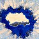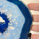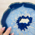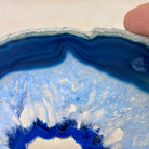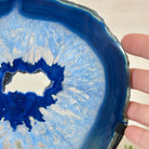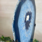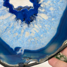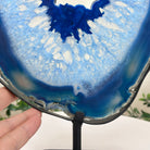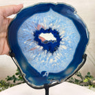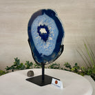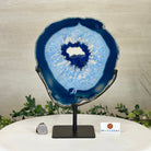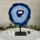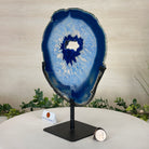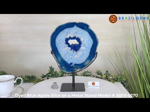 Enhance your decor with this bright slice of Brazilian Blue Agate (dyed blue) beautifully placed on a metal stand by Brazil Gems®. With its striking colors, well defined bands and drusy crystals, this is nature's work of millions of years now available to you.