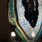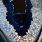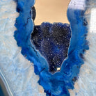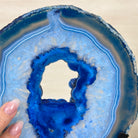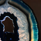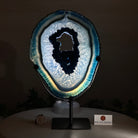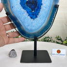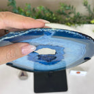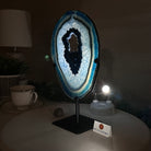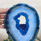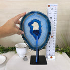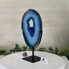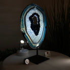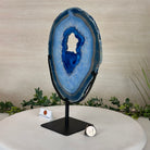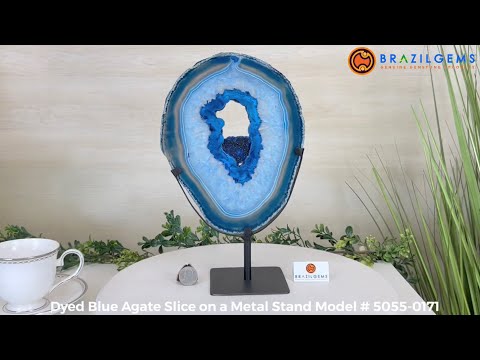 Enhance your decor with this bright slice of Brazilian Blue Agate (dyed blue) beautifully placed on a metal stand by Brazil Gems®. With its striking colors, well defined bands and drusy crystals, this is nature's work of millions of years now available to you.