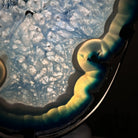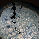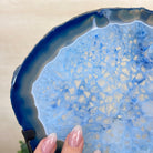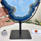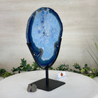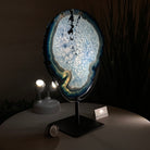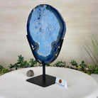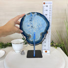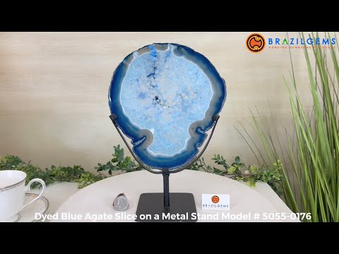 Enhance your decor with this bright slice of Brazilian Blue Agate (dyed blue) beautifully placed on a metal stand by Brazil Gems®. With its striking colors, well defined bands and drusy crystals, this is nature's work of millions of years now available to you.