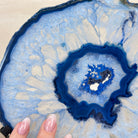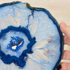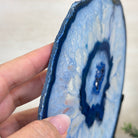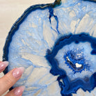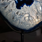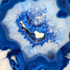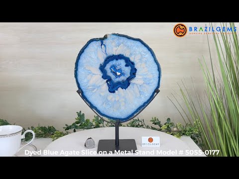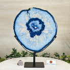 Enhance your decor with this bright slice of Brazilian Blue Agate (dyed blue) beautifully placed on a metal stand by Brazil Gems®. With its striking colors, well defined bands and drusy crystals, this is nature's work of millions of years now available to you.