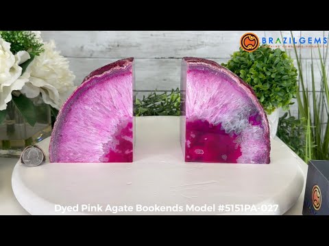 Crafted from a single piece of genuine Brazilian agate, these bookends are cut in half and polished to reveal mesmerizing bands of color. Each set is unique, with striking patterns enhanced by a rich Pink dye.