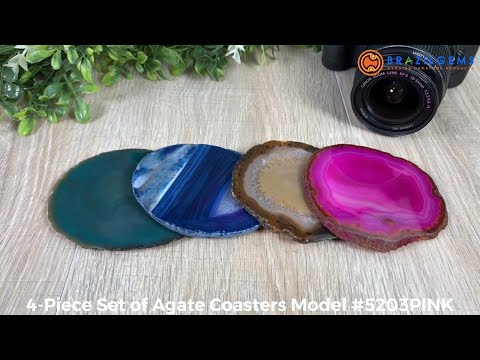 Disclaimer: **STOCK PHOTOS** The images you see are NOT the exact coaster set you will receive. The images are of actual sets we had in stock at one time and were selected to serve as the models to showcase differences in colors, natural designs, shapes and sizes so customers could see how the coasters' overall looks can vary. Due to the unique nature of the stone, each set will have an exclusive mix (1 Natural, 1 Dyed Pink, 1Dyed Green and 1 Blue each with unique natural designs and naturally occurring color variations. The set you receive might be more opaque or more translucent or more vibrant or less vibrant in any of the colors because of how each piece naturally varies. We encourage customers to look at all of the photos to see the variations that naturally occur between each coaster. The sets have already been wrapped, boxed and ready to be shipped therefore we can't accommodate specific requests. Your set will truly be unique to you. They are natural gemstones sold as is. They may contain natural imperfections and/or imperfections and scratches from the extraction, cutting and polishing processes. The Pink, Green and Blue coasters have been dyed to give them their beautiful colors. Please note that dye products can still be found on these coasters and they can stain when wet. Purple coaster seen in the video might still be available on a different listing.