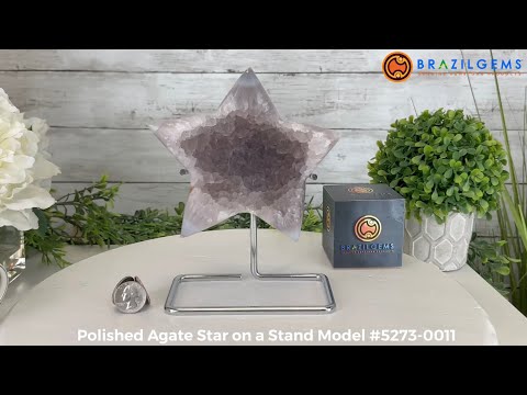 This is a polished Brazilian Agate Geode perfectly handcrafted into the shape of a Star then placed on a chrome metal stand. With its polished edges and natural crystals shining through you'll enjoy this piece for years to come.