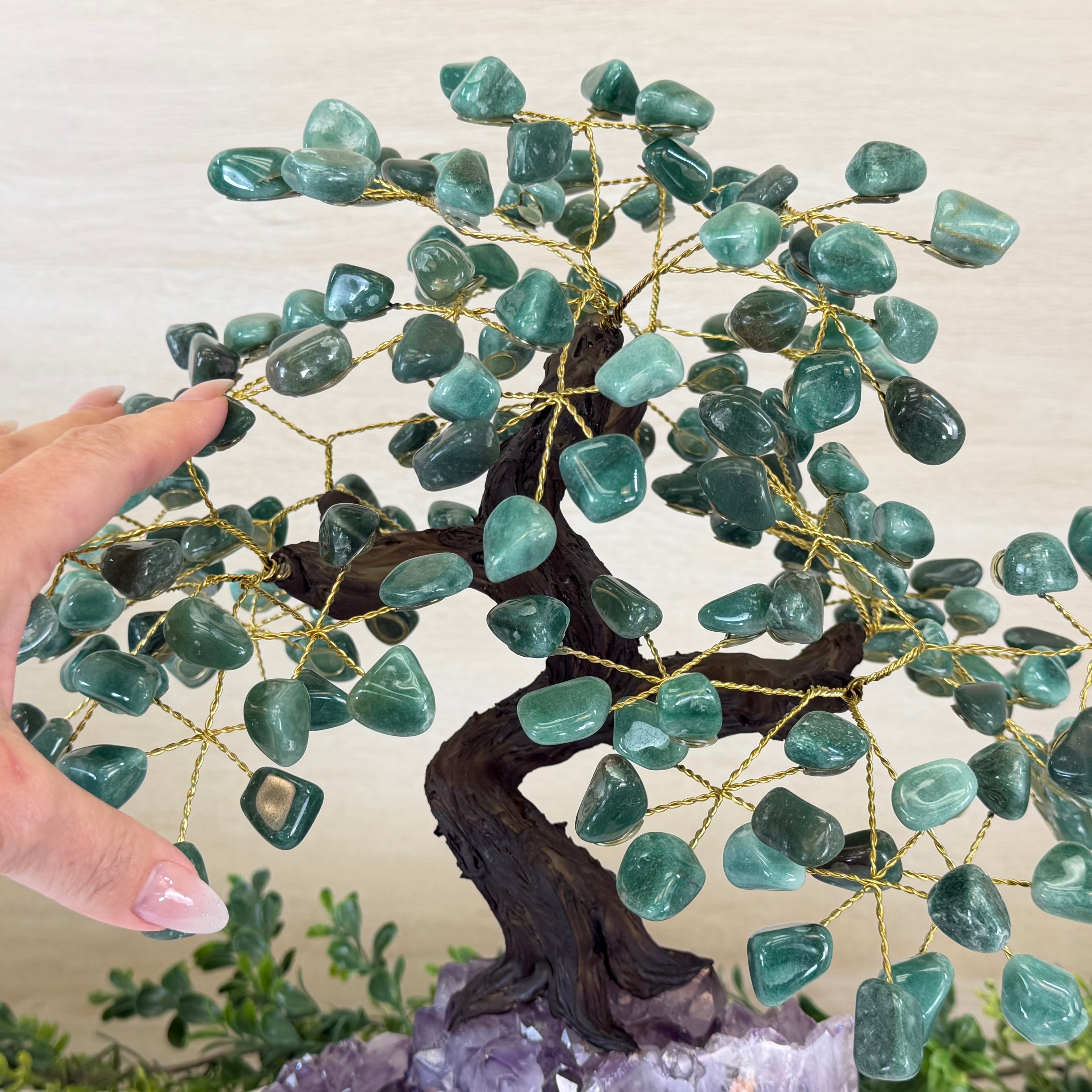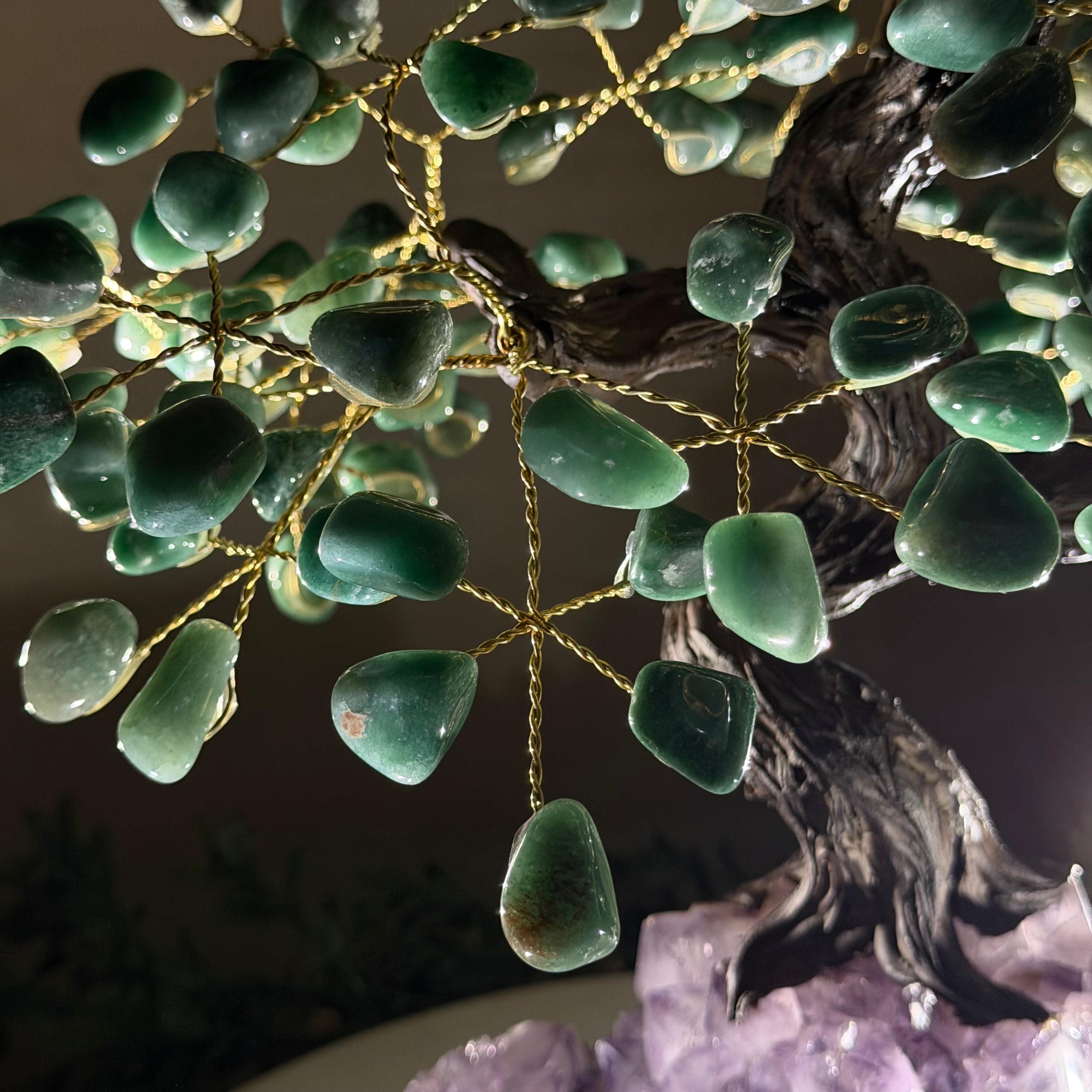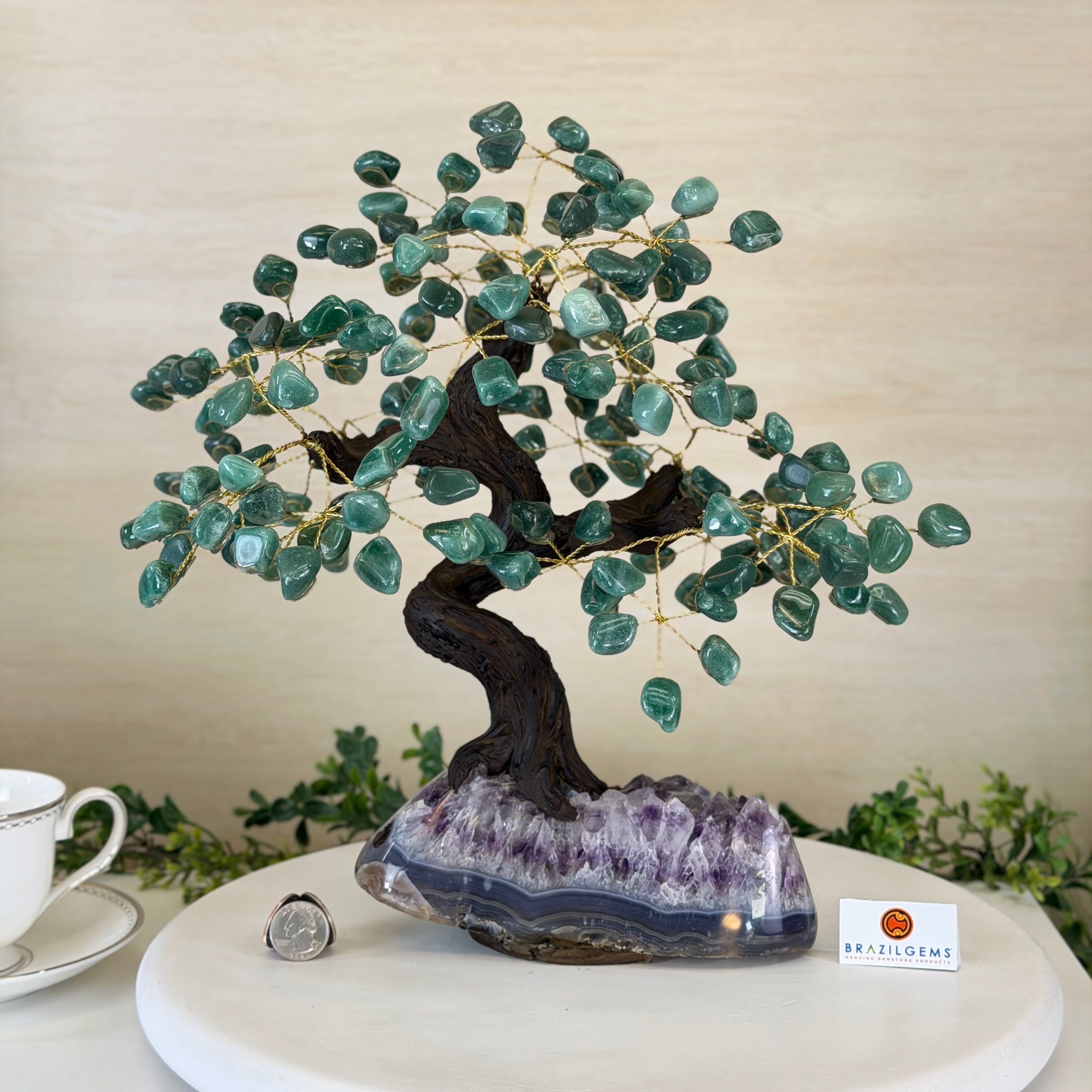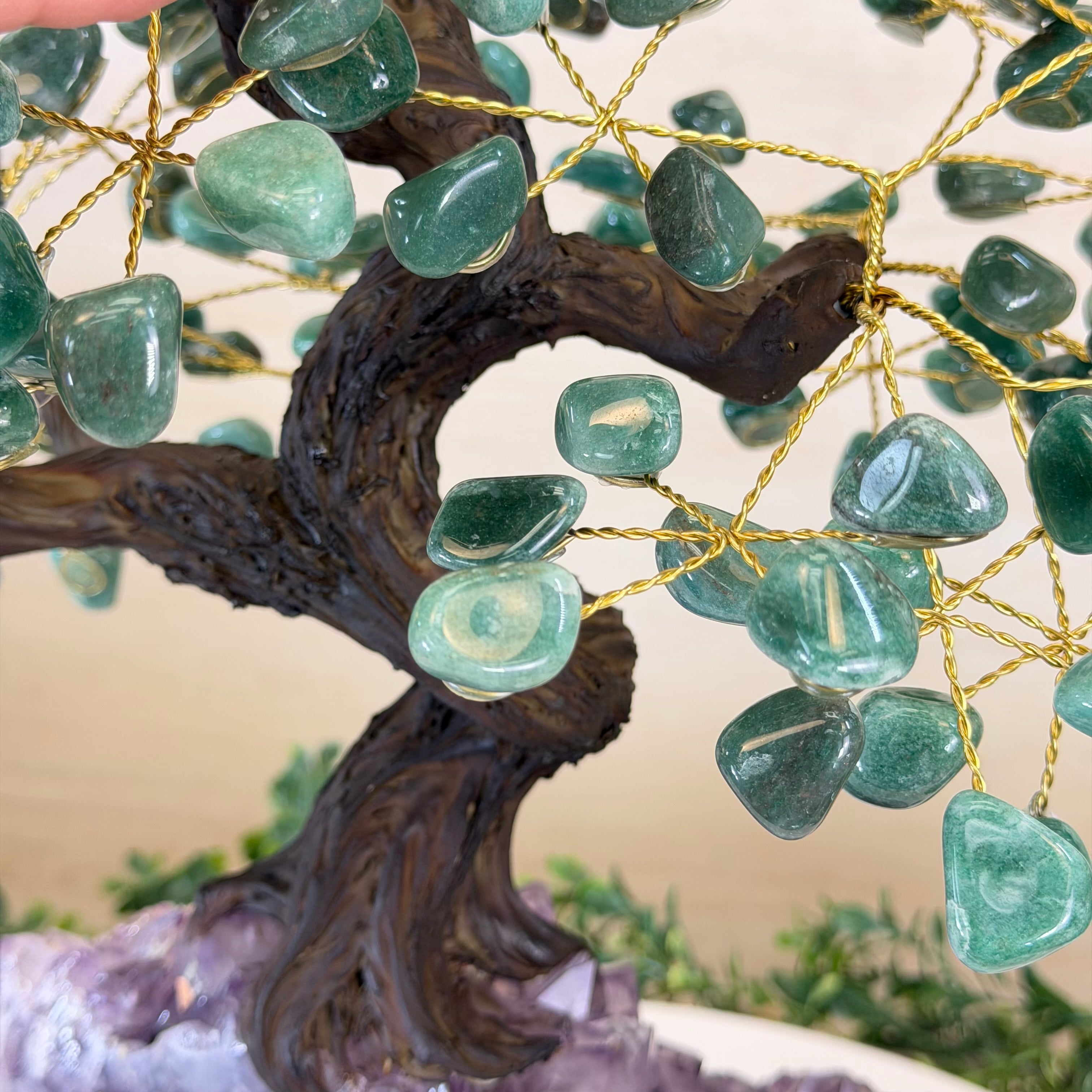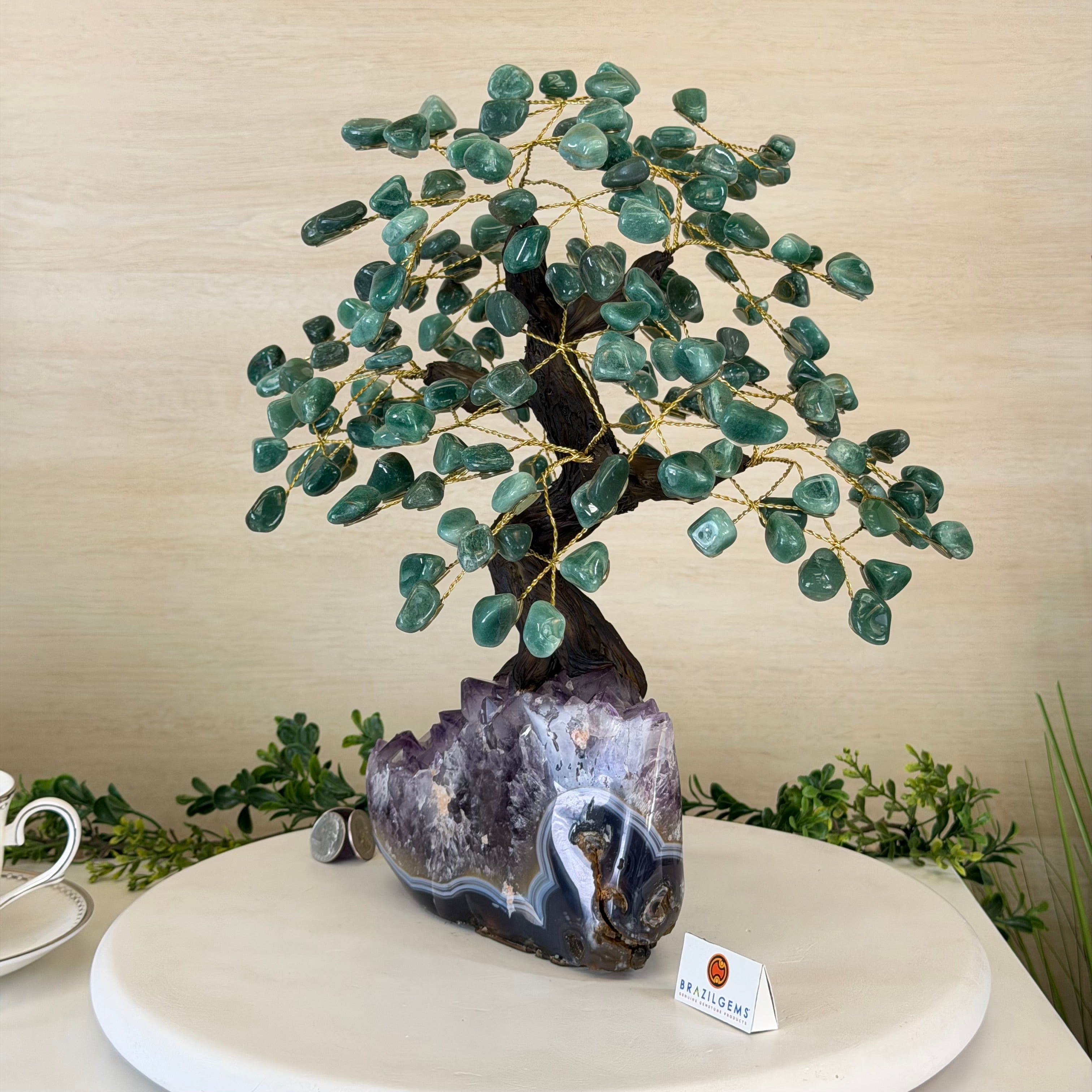 17" Tall Green Quartz Bonsai Gemstone Tree, Amethyst Base, 240 Gems #5405GRNQ-001