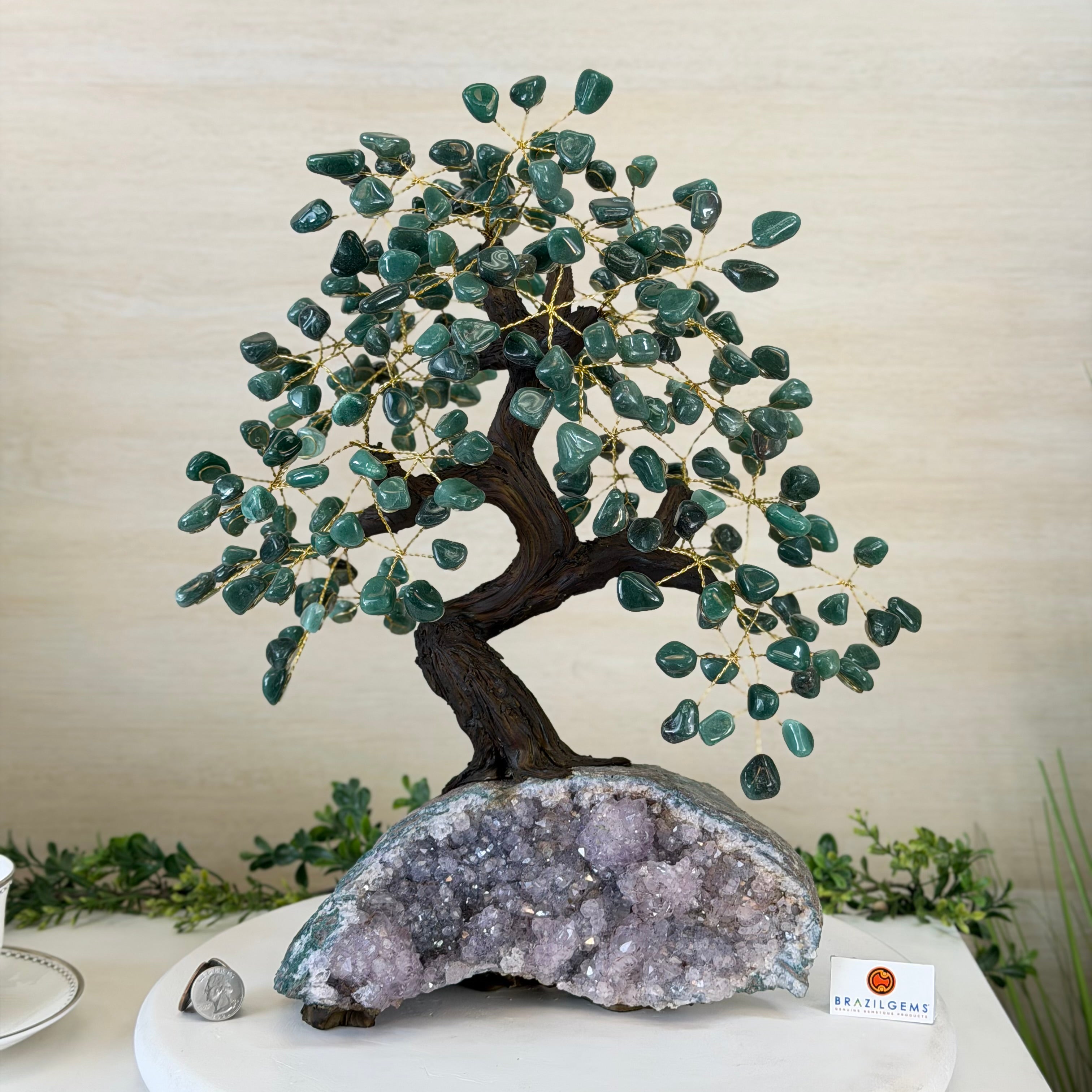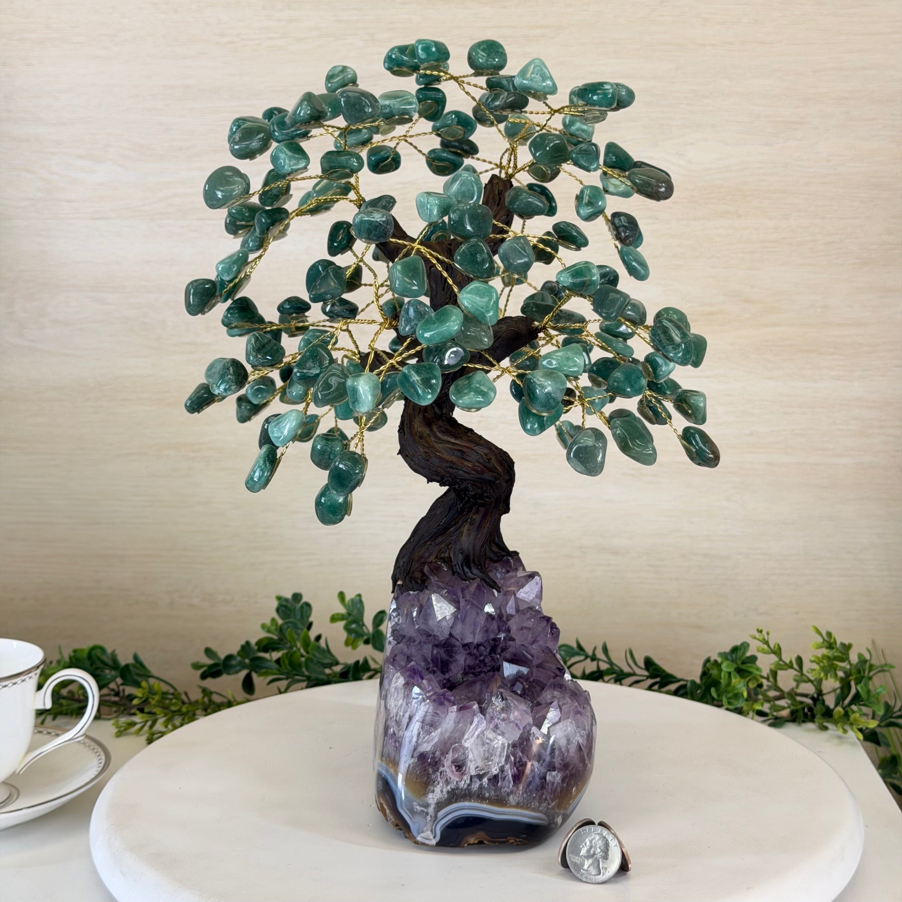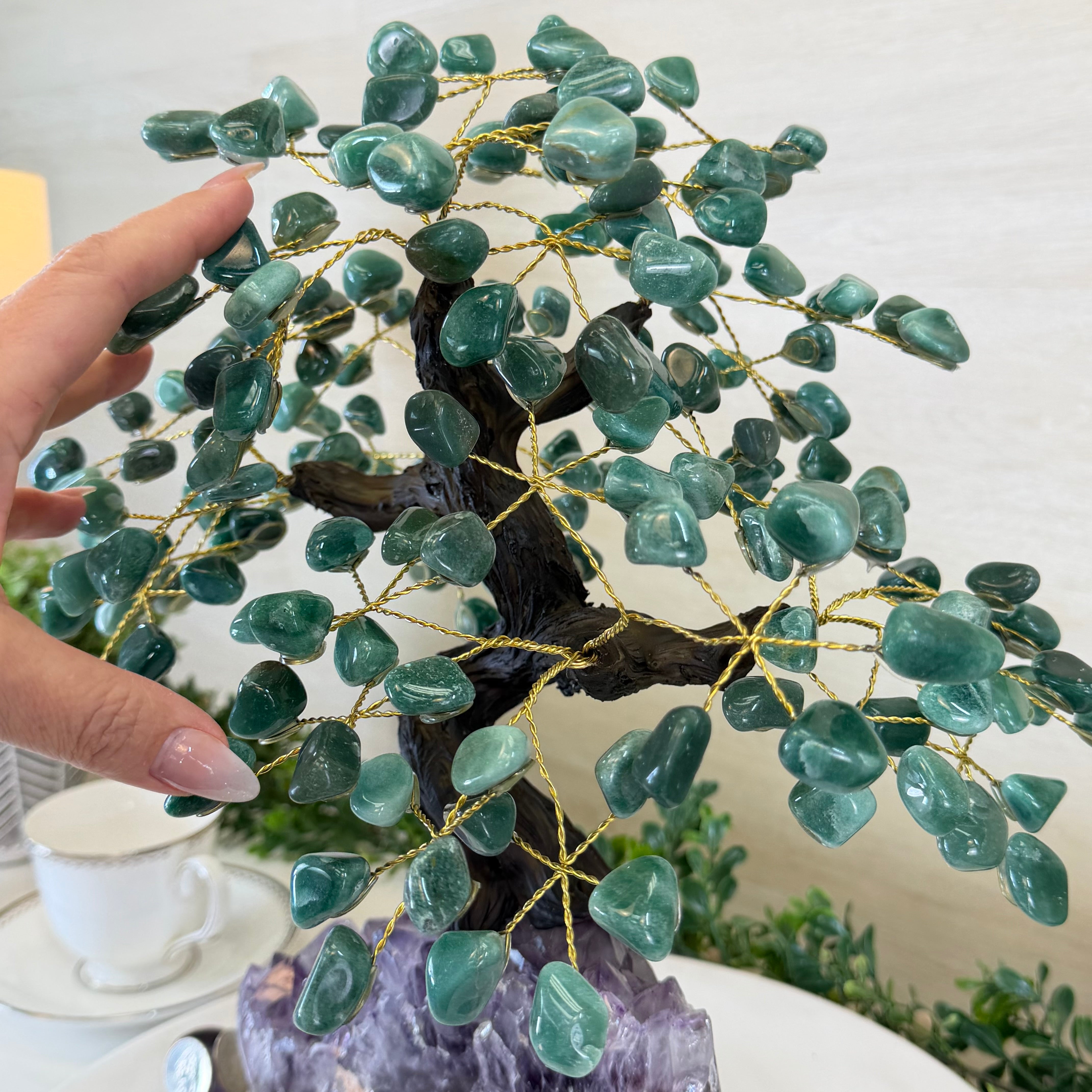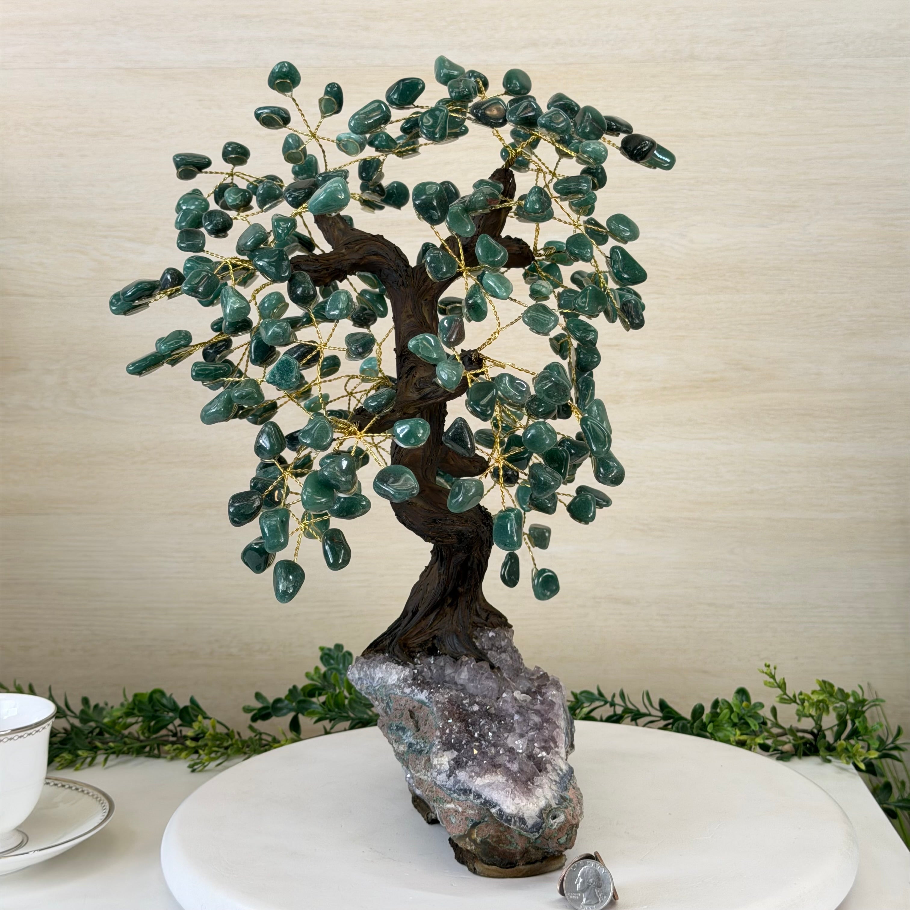 17" Tall Green Quartz Bonsai Gemstone Tree, Amethyst Base, 240 Gems #5405GRNQ-001