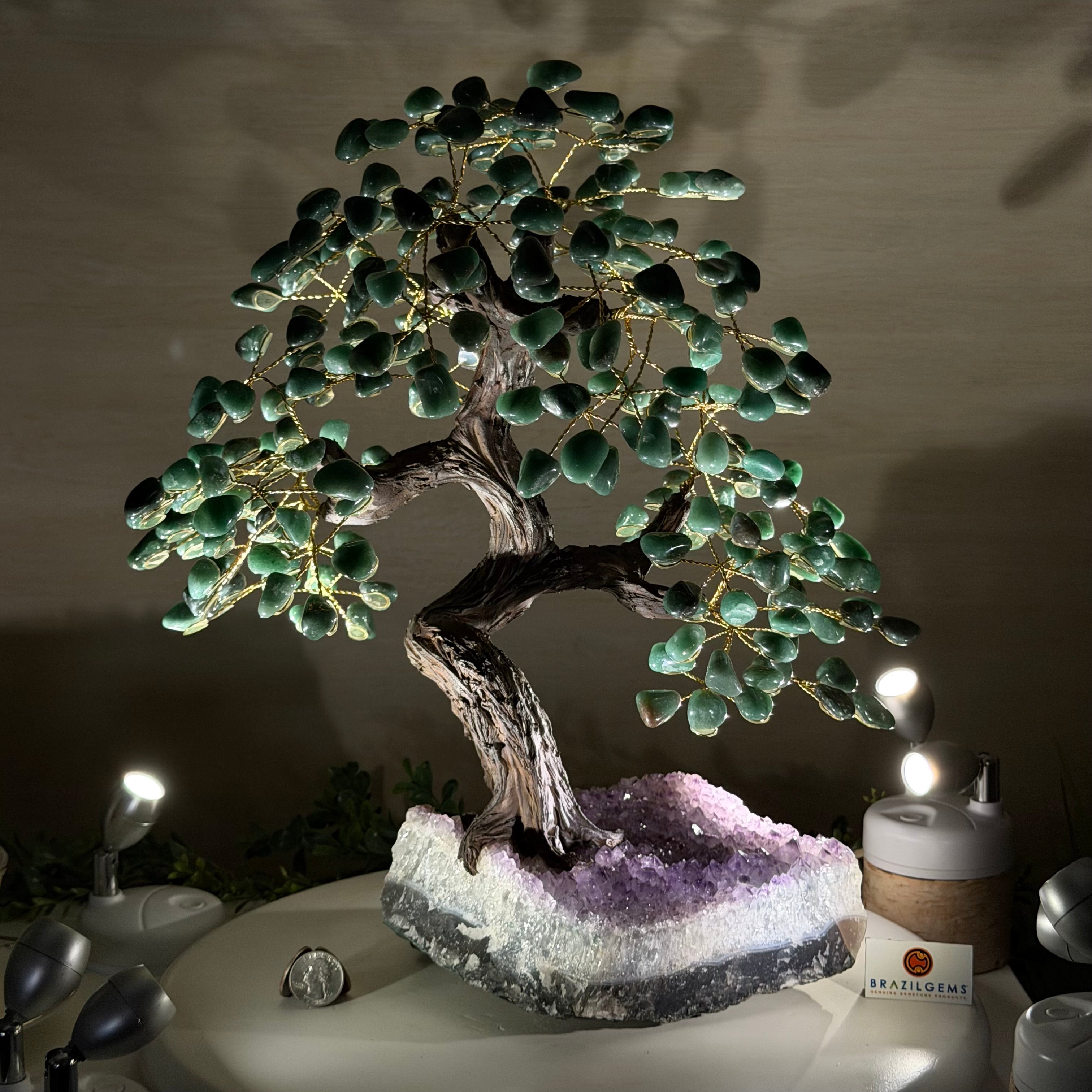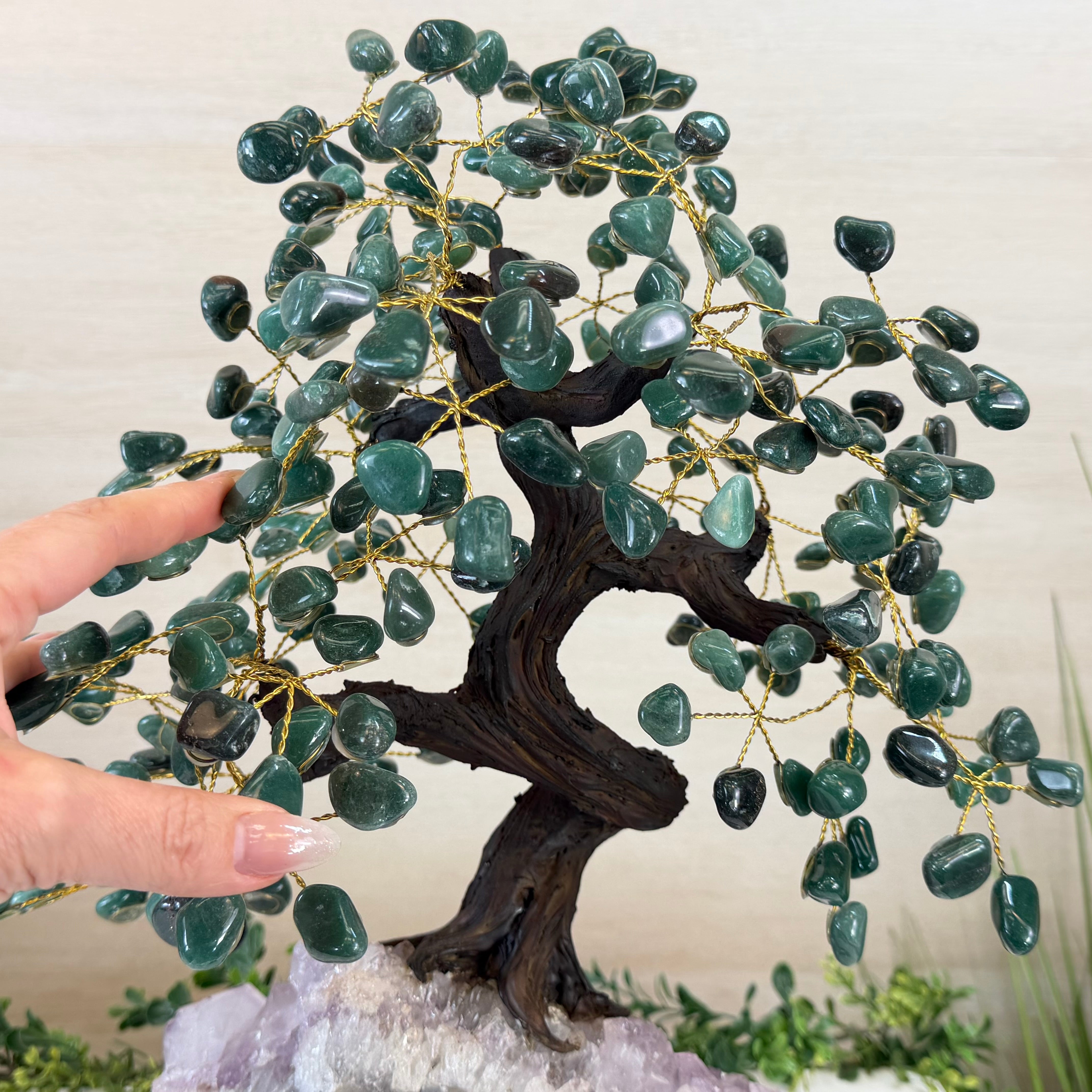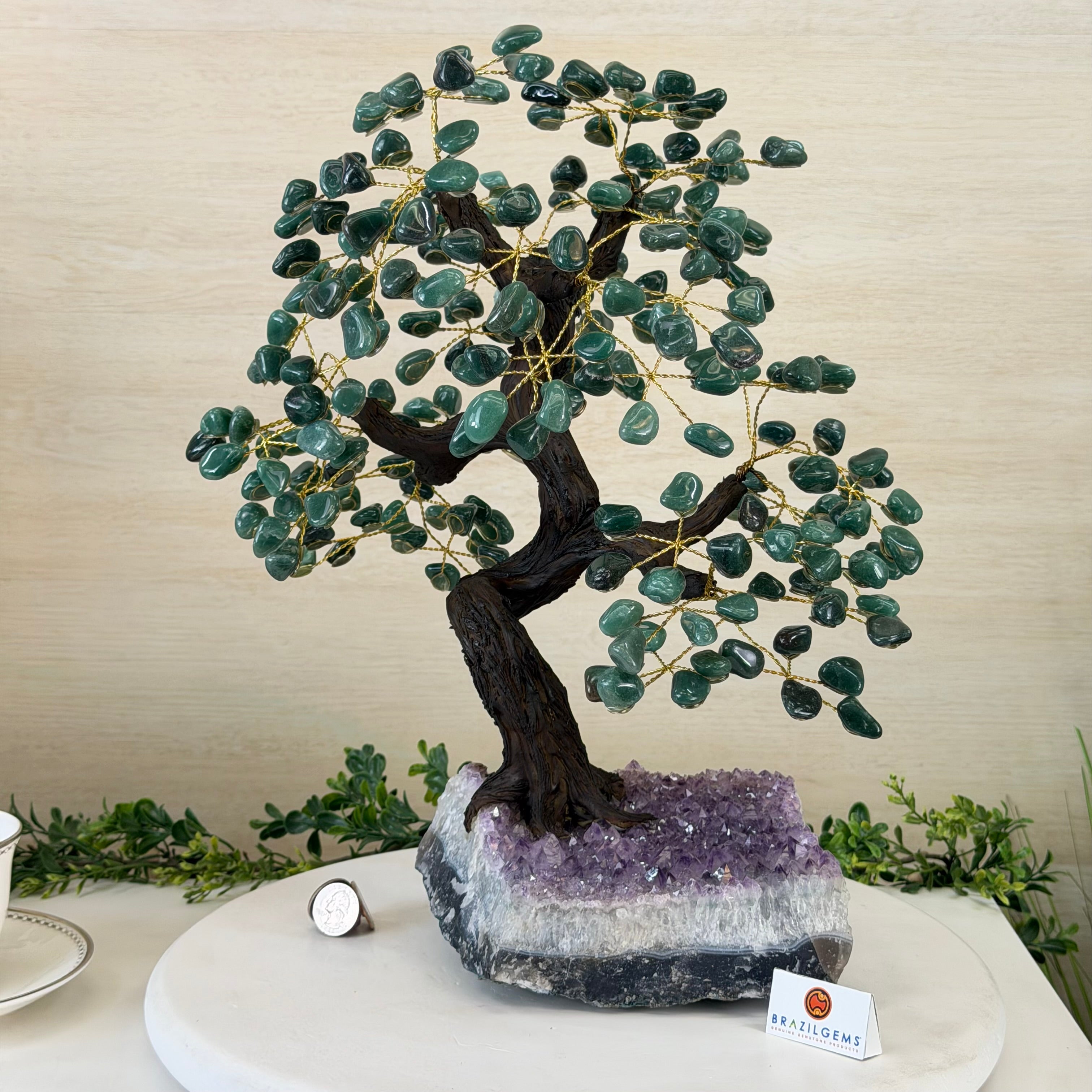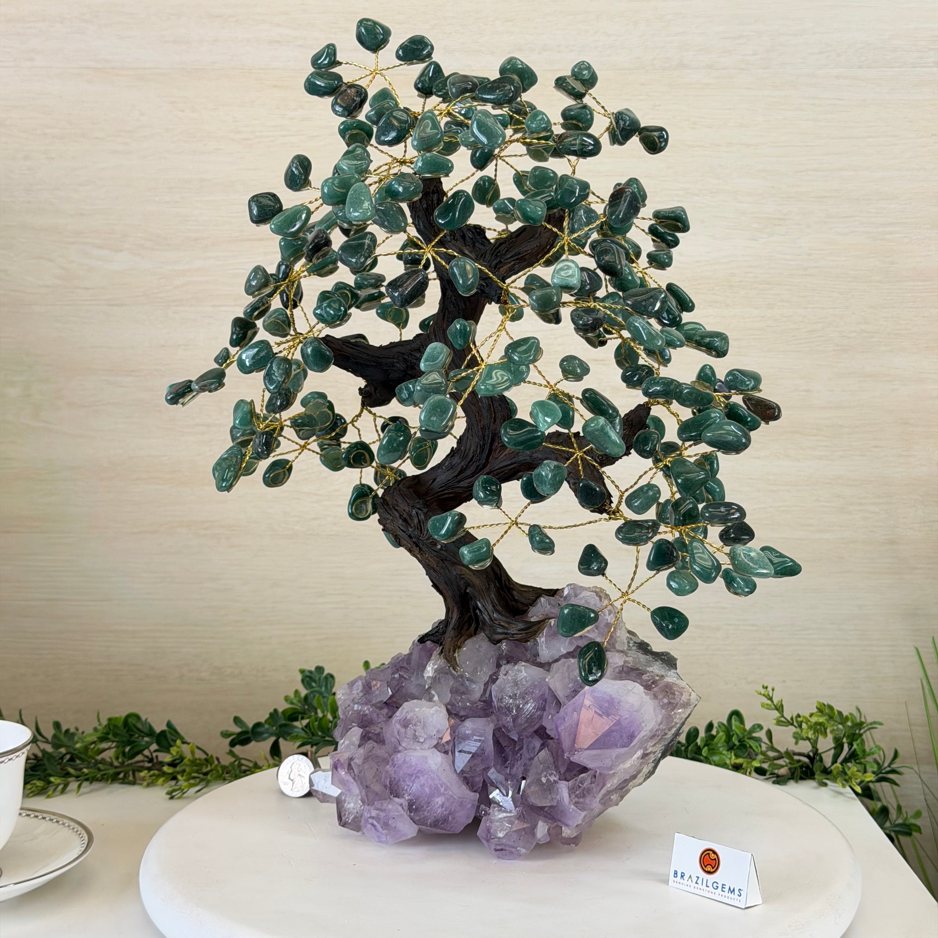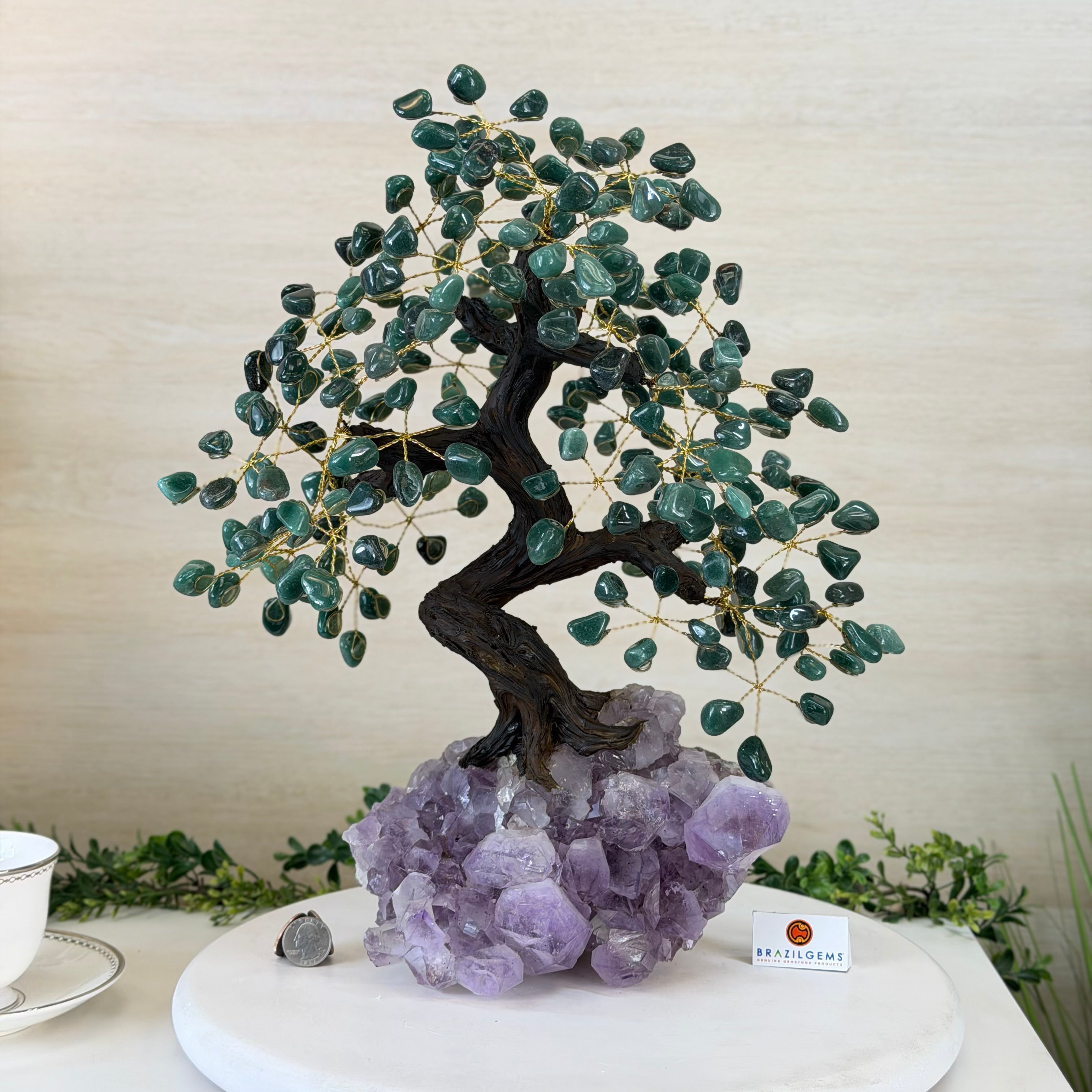 17" Tall Green Quartz Bonsai Gemstone Tree, Amethyst Base, 240 Gems #5405GRNQ-001