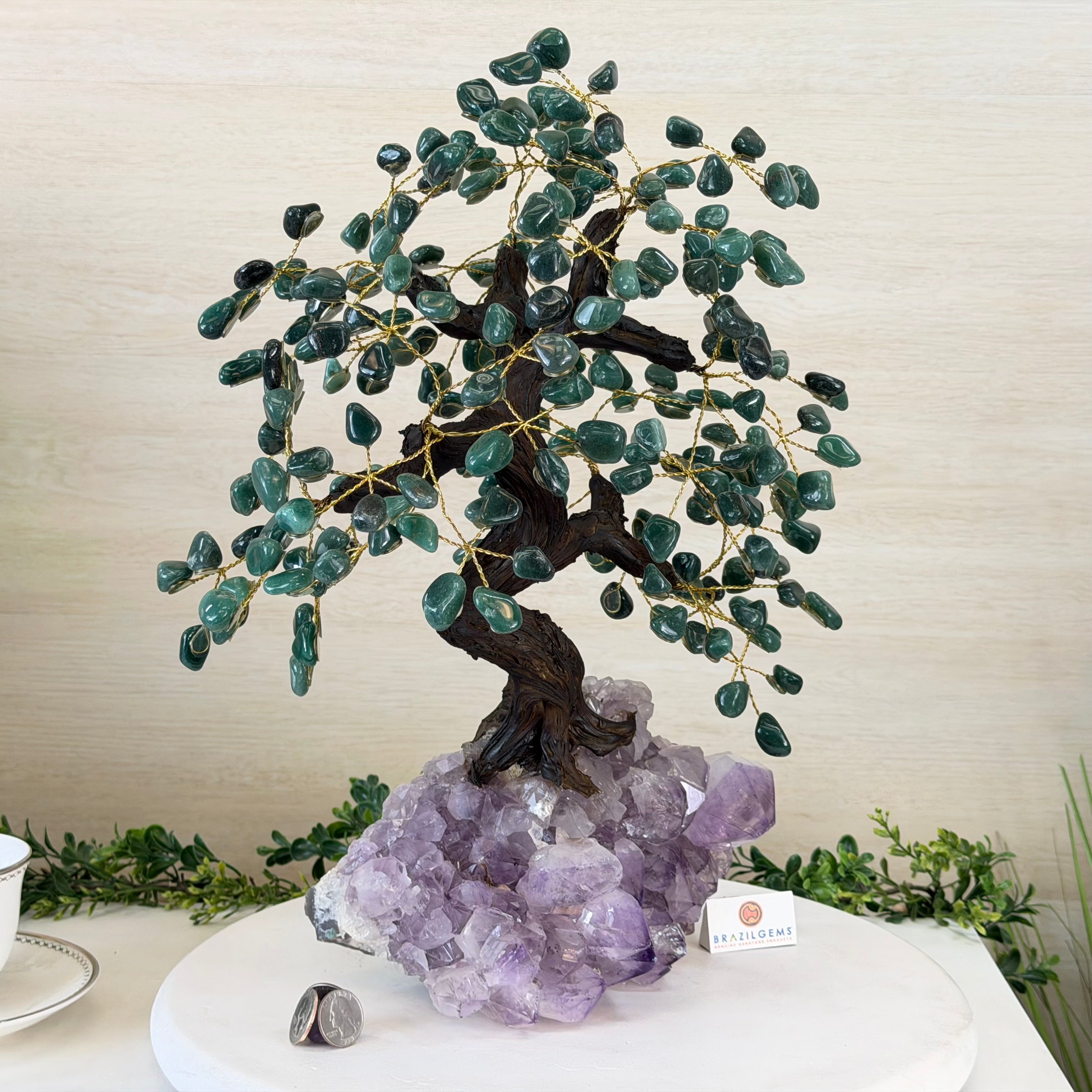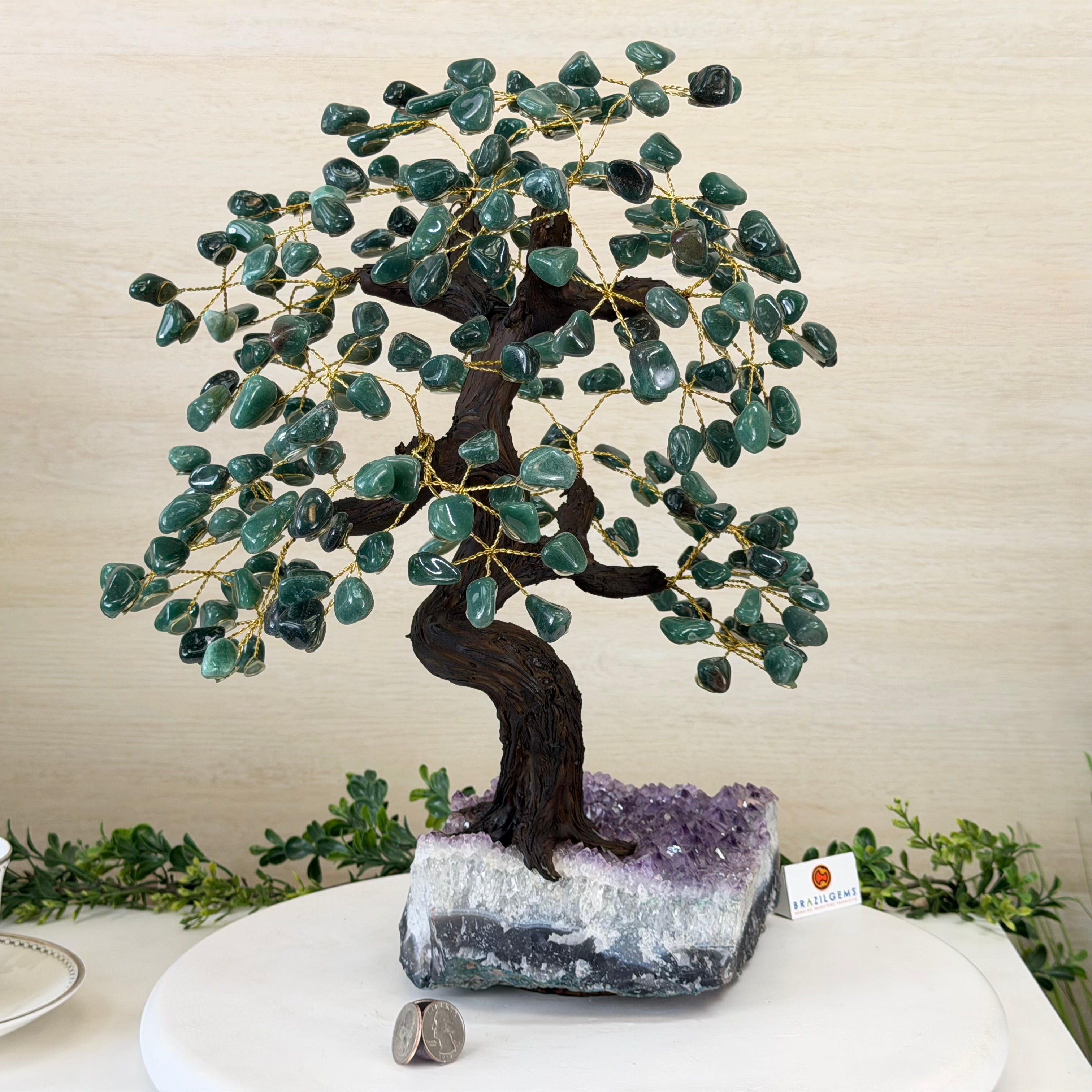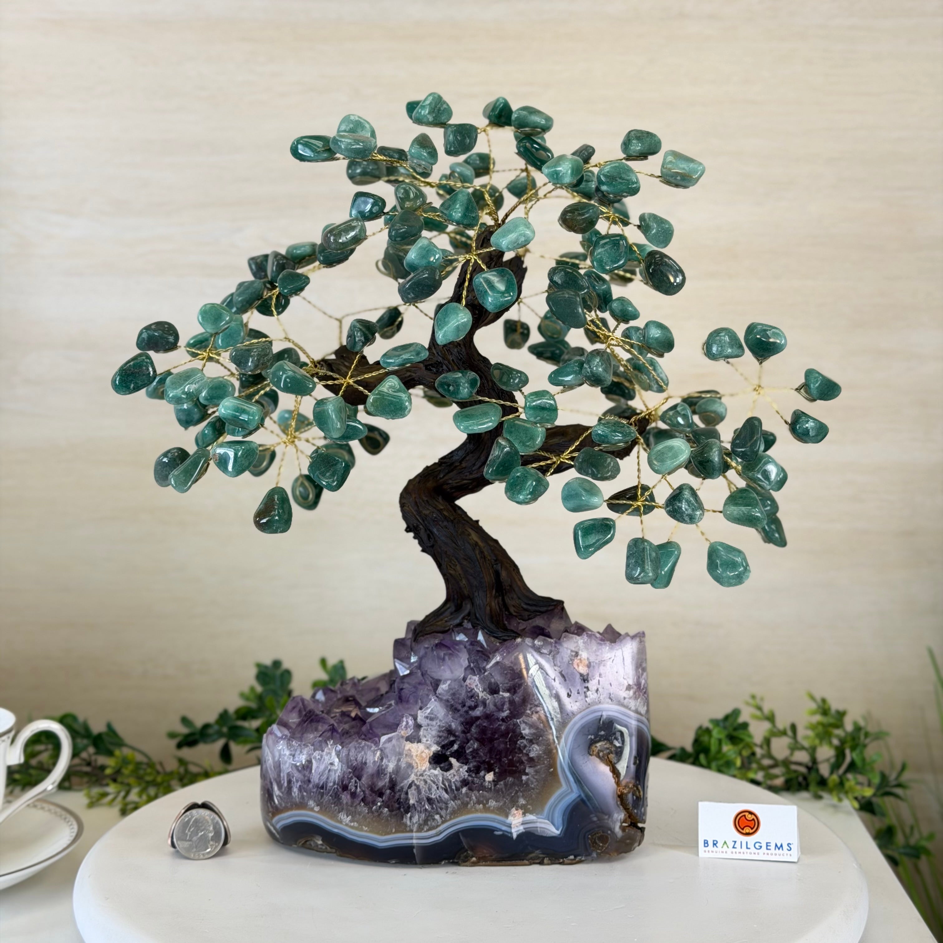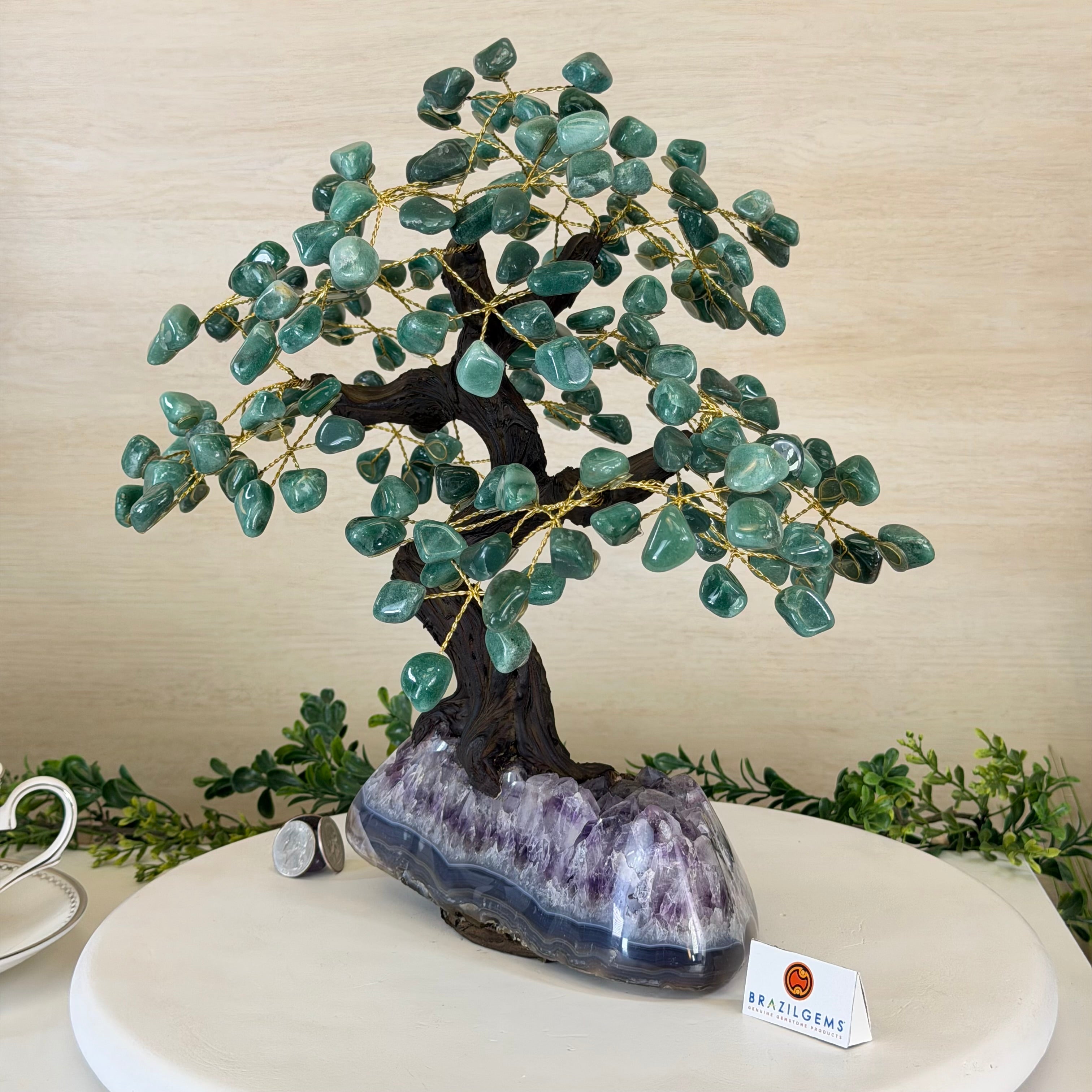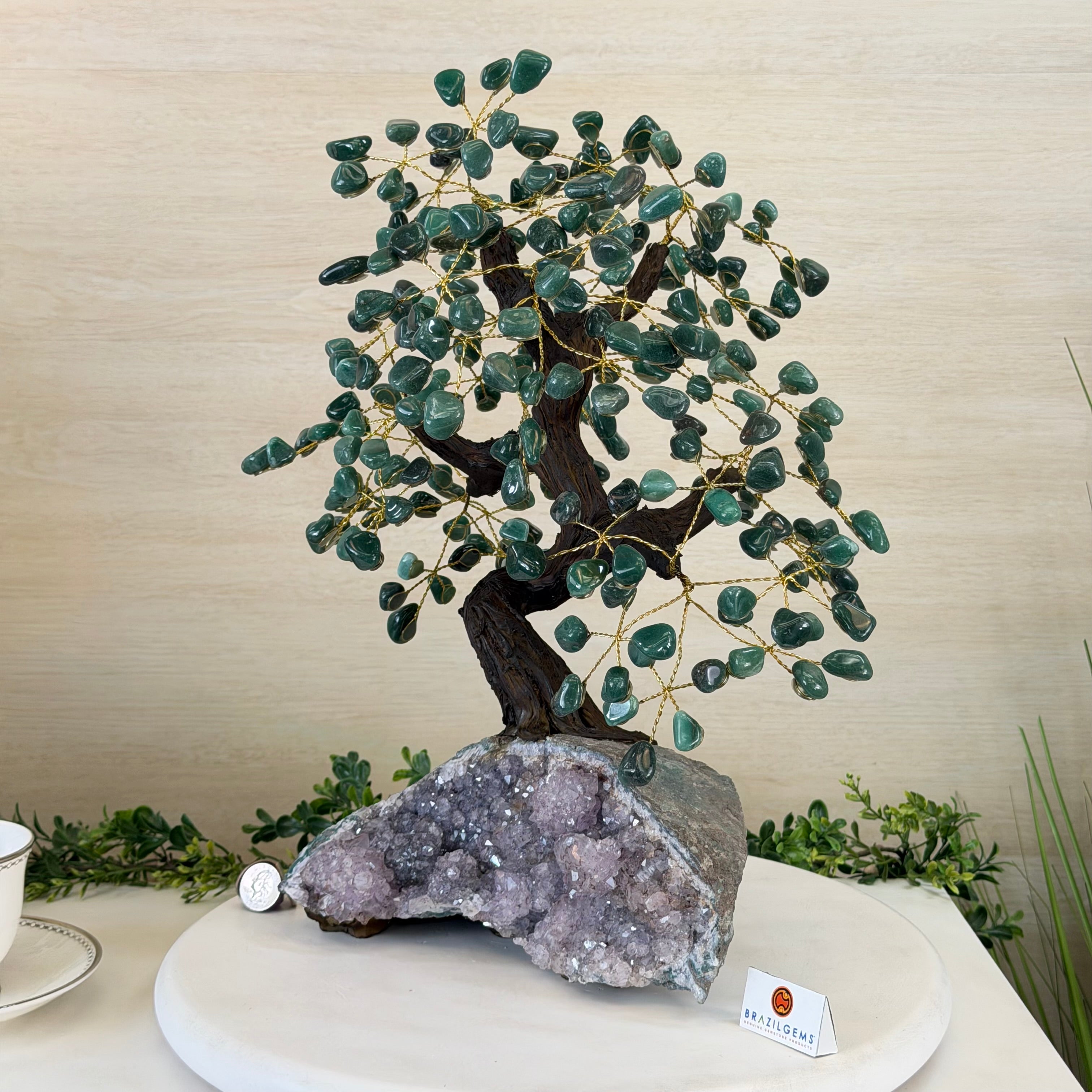17" Tall Green Quartz Bonsai Gemstone Tree, Amethyst Base, 240 Gems #5405GRNQ-001