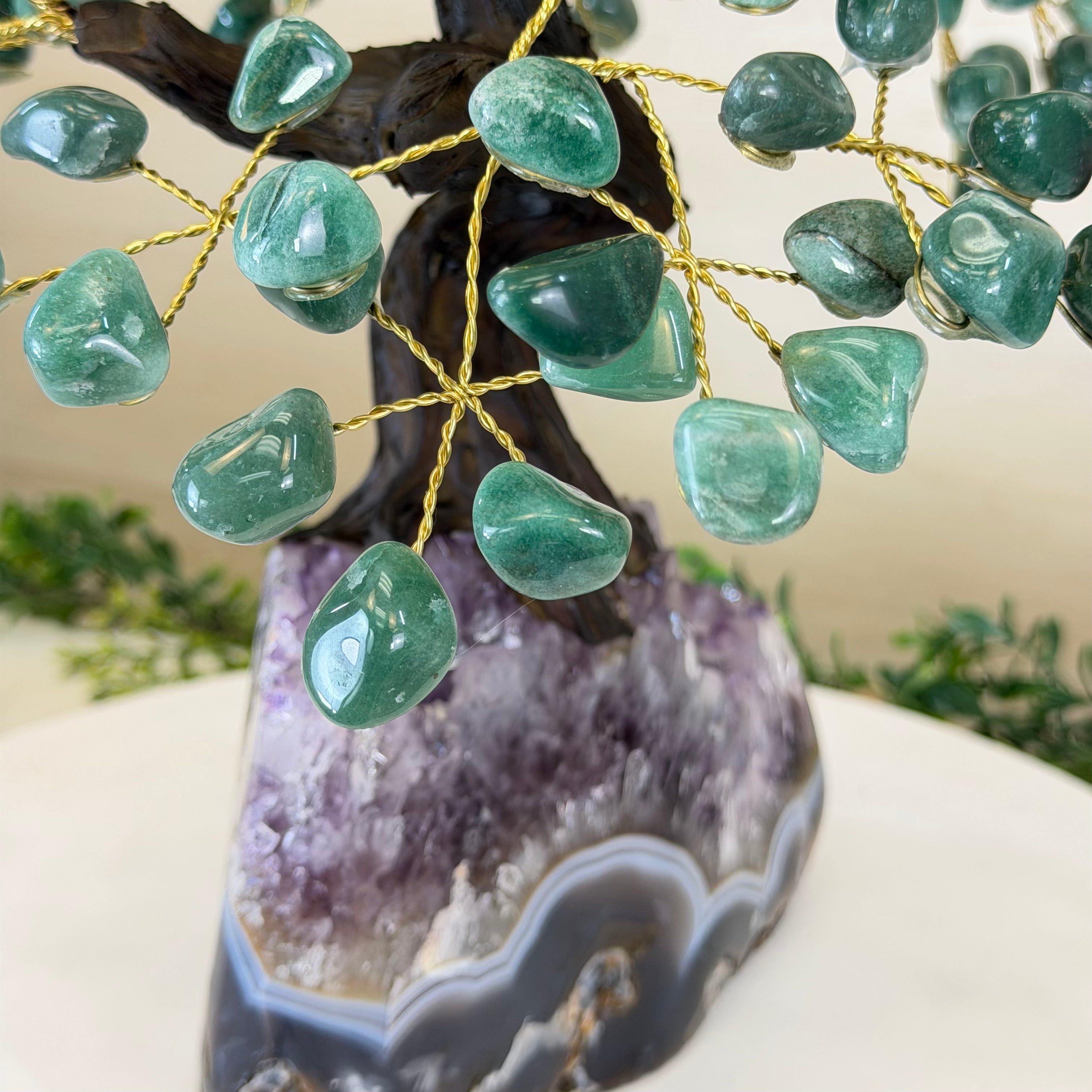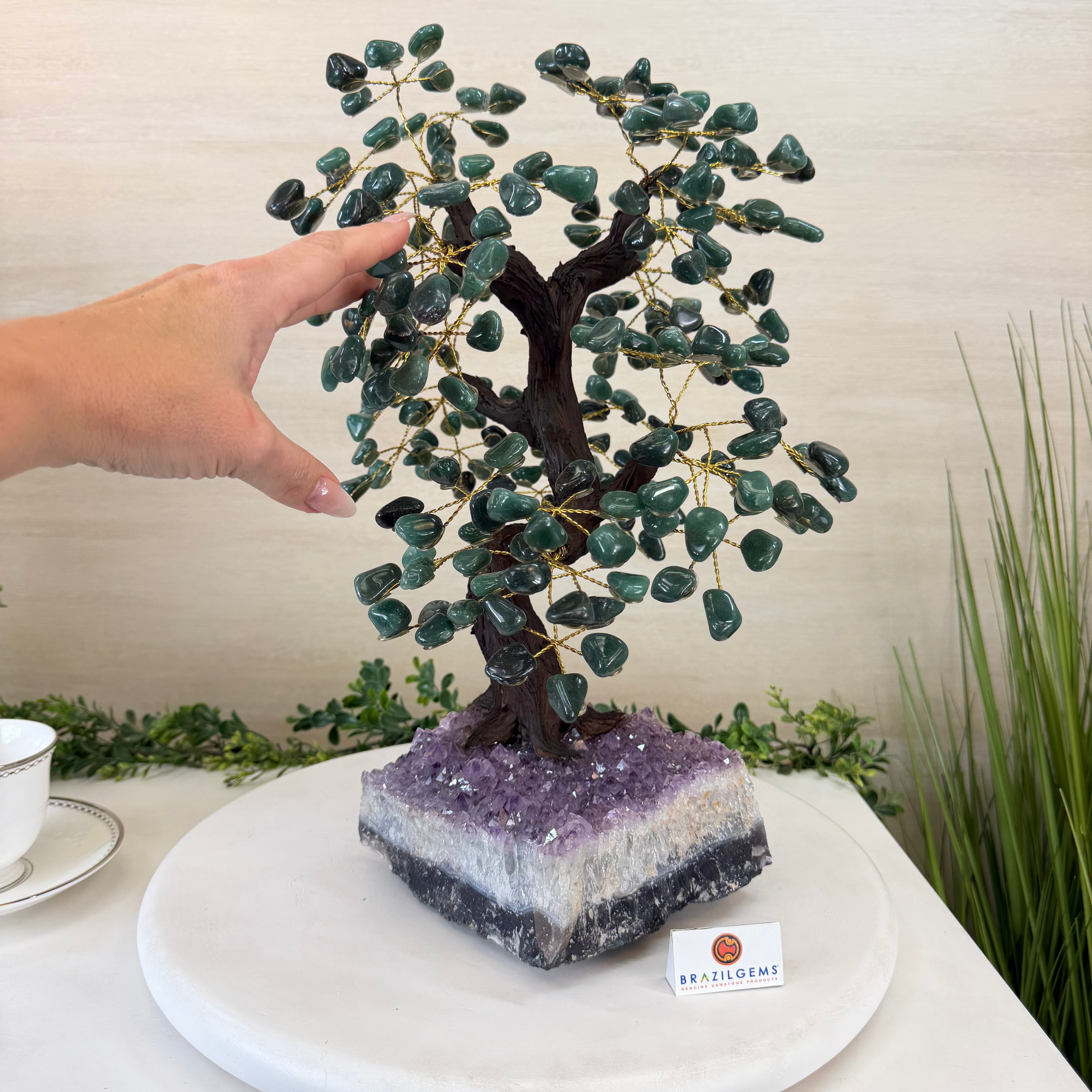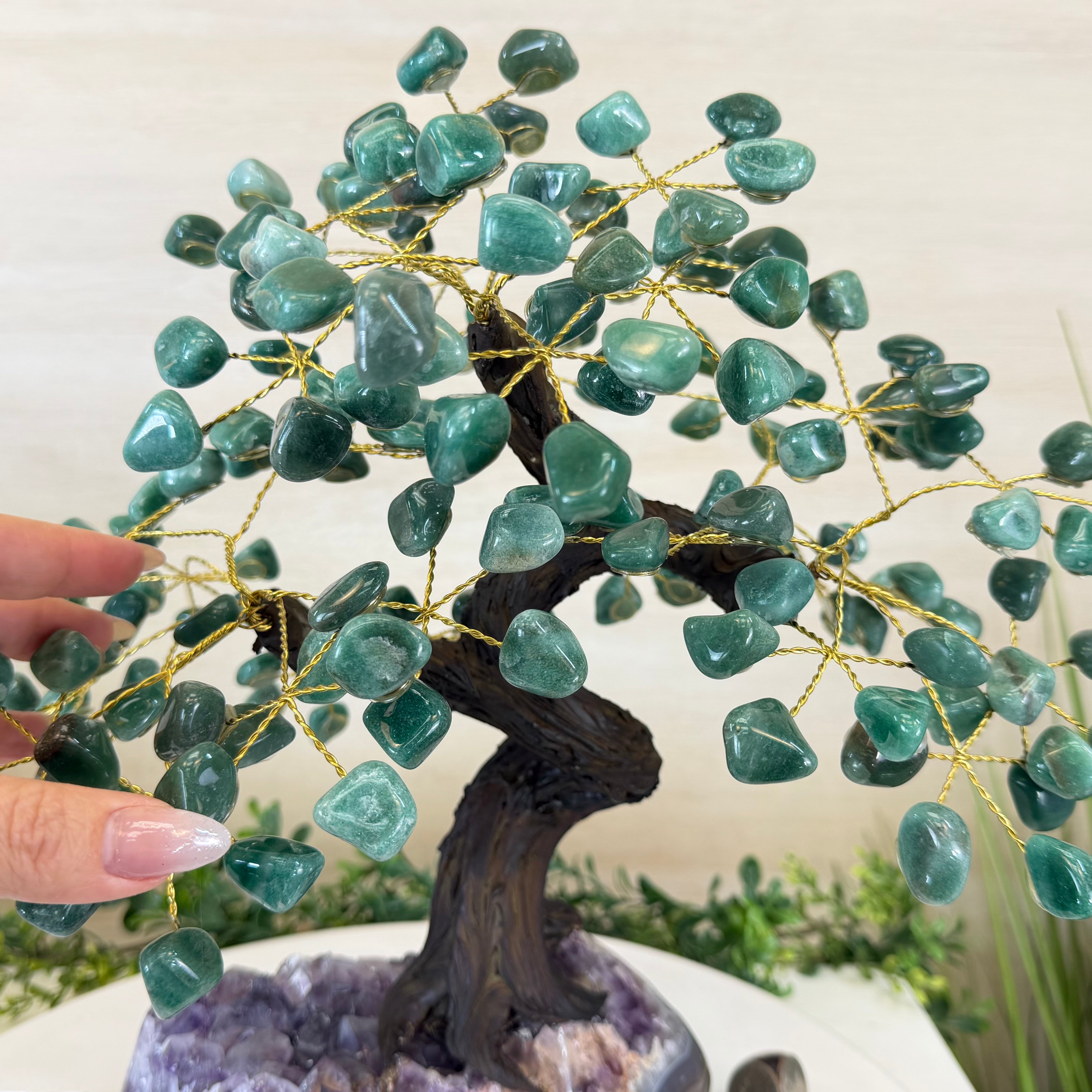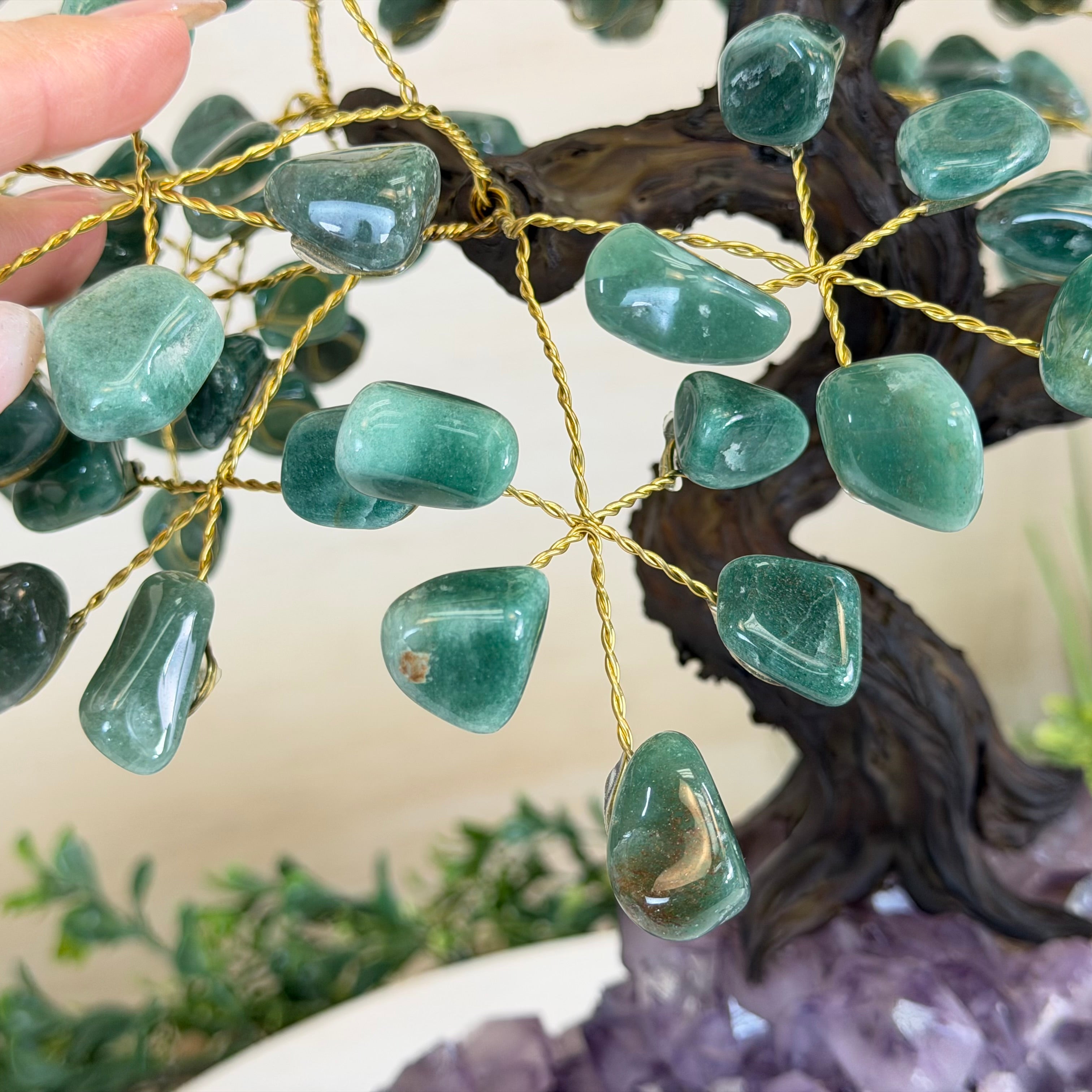 17" Tall Green Quartz Bonsai Gemstone Tree, Amethyst Base, 240 Gems #5405GRNQ-001