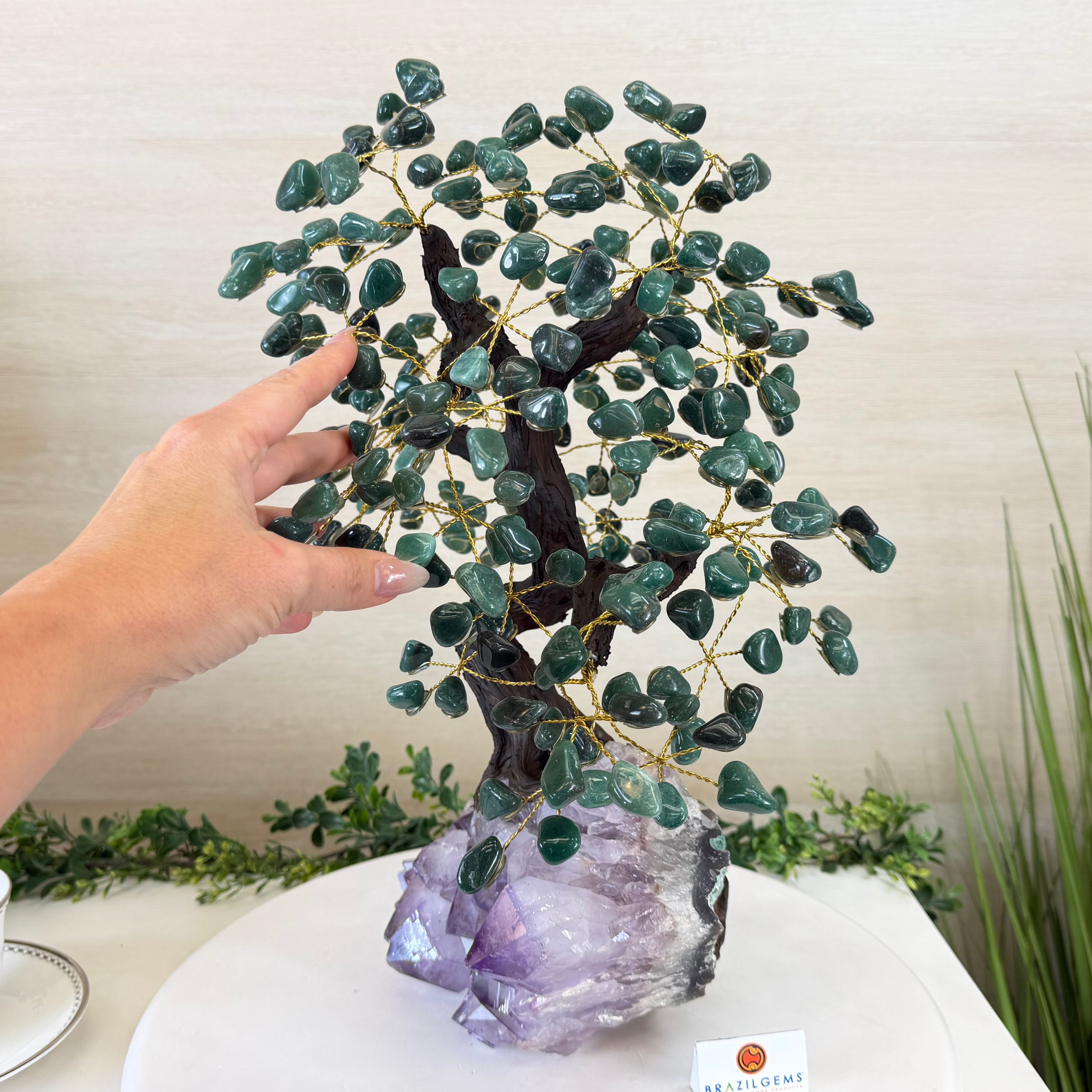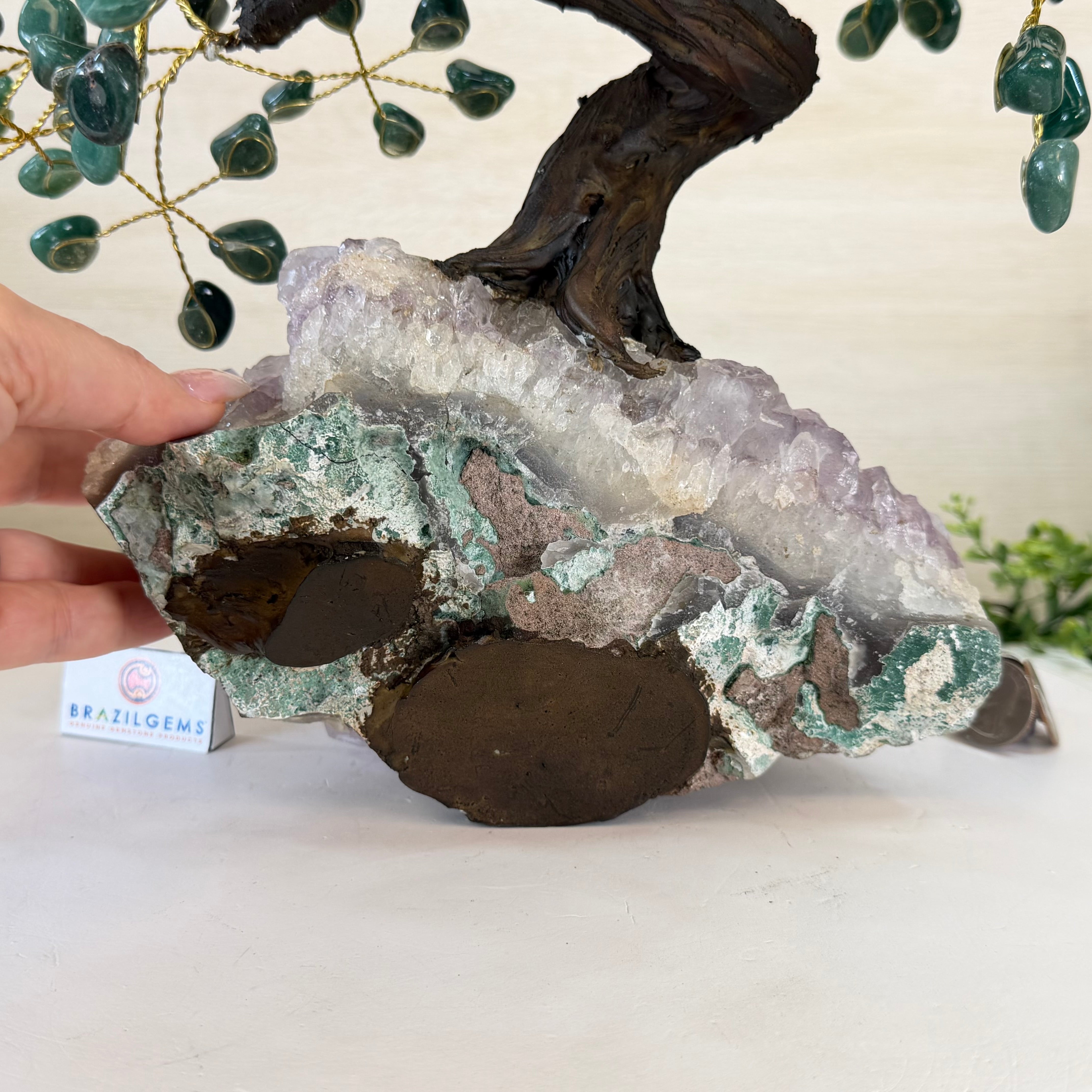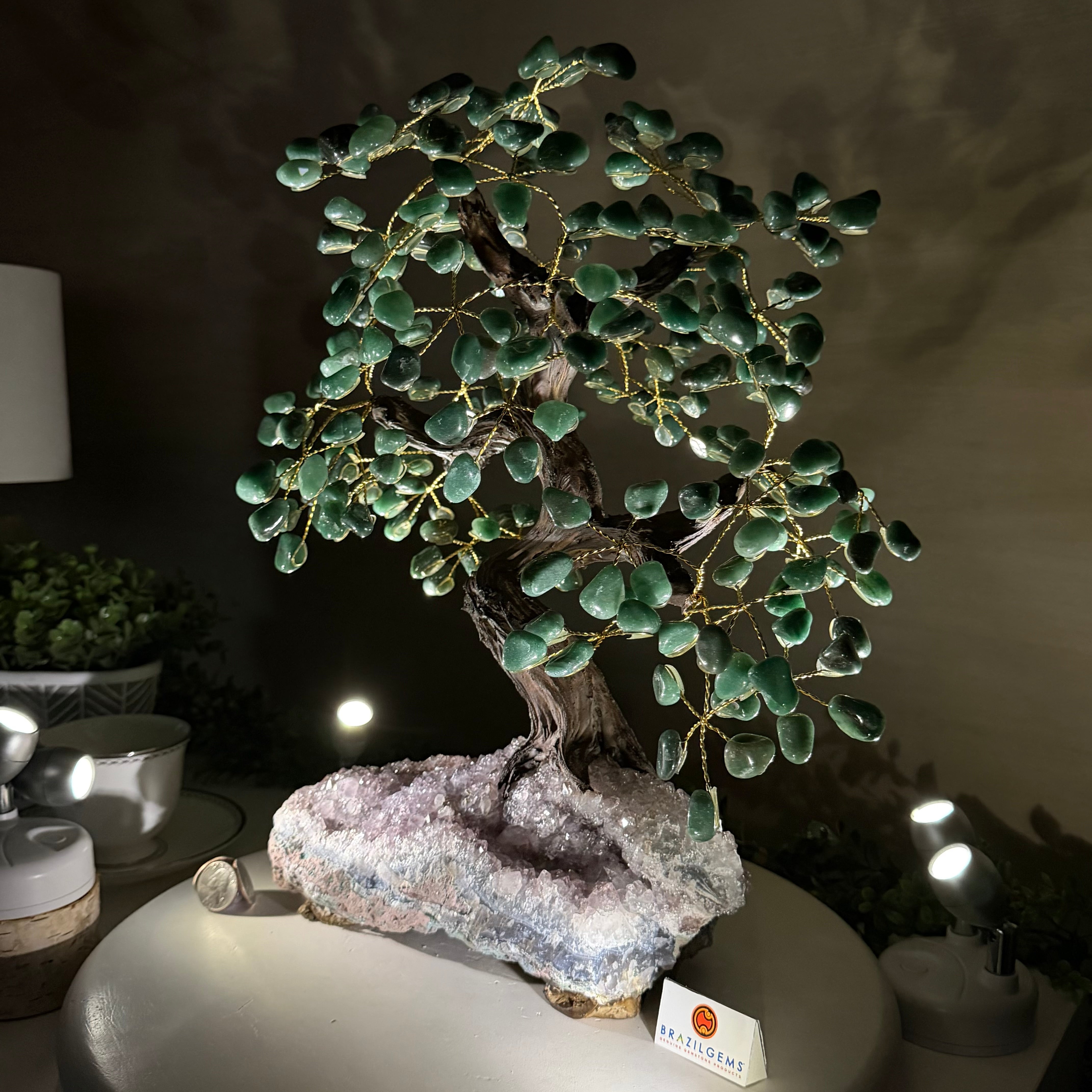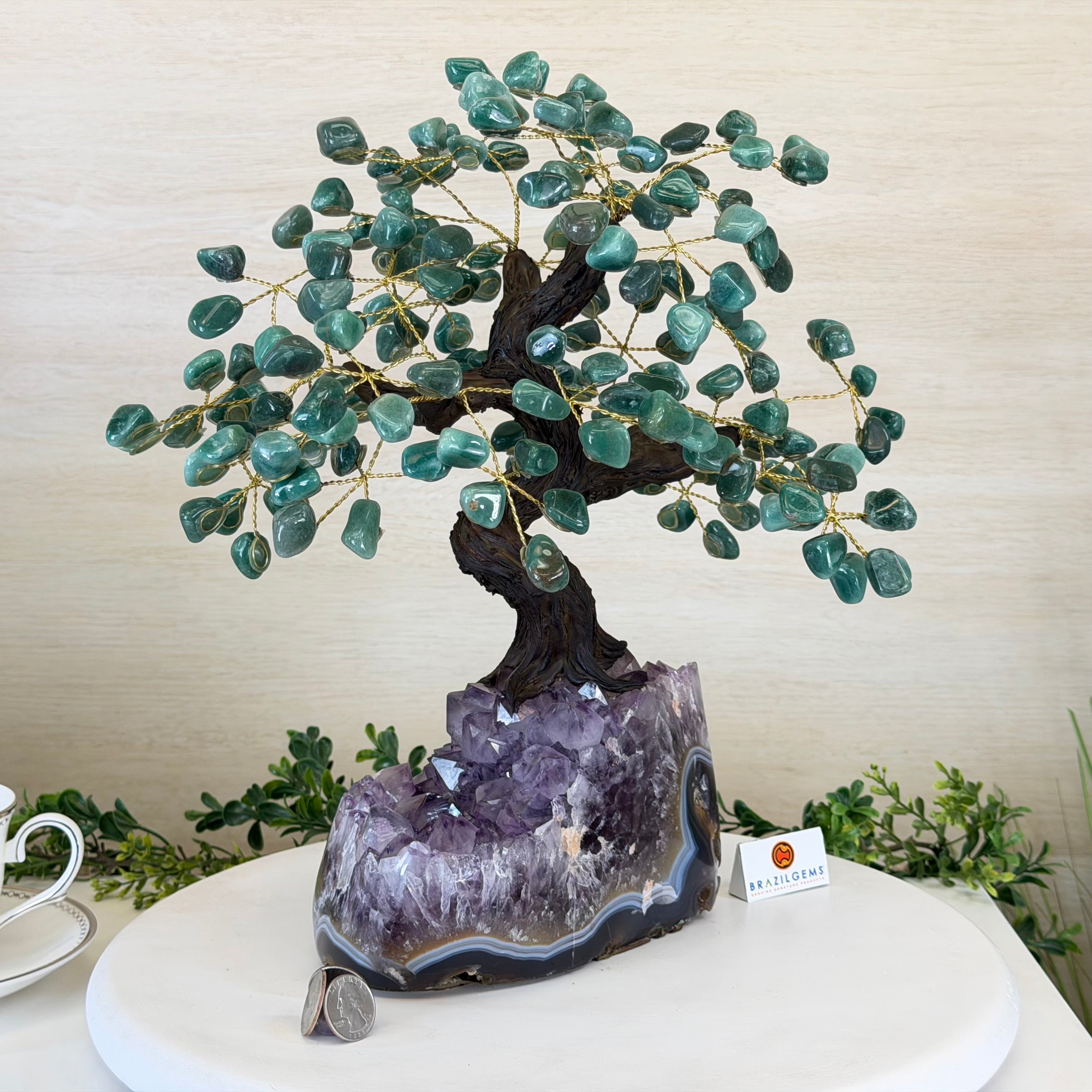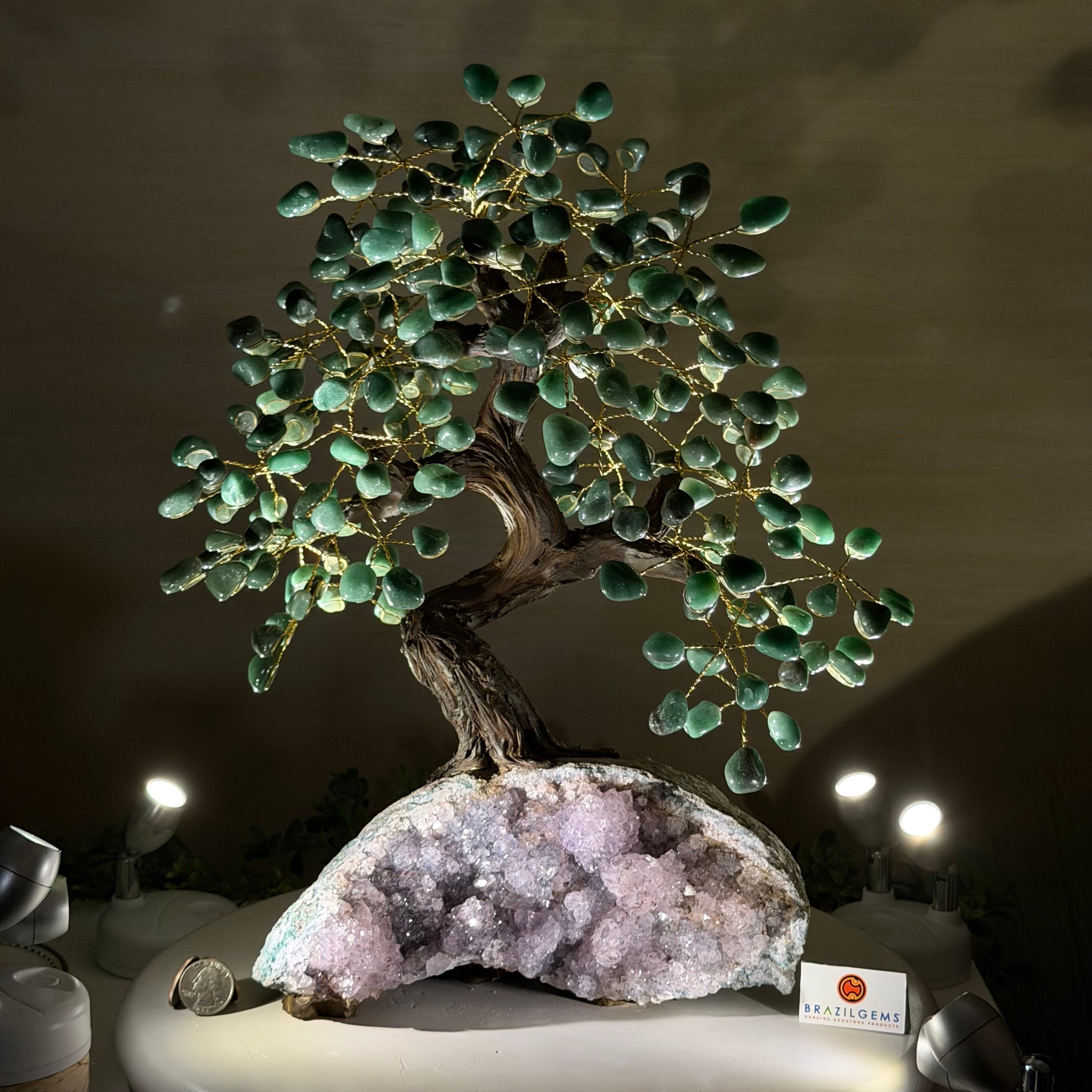 17" Tall Green Quartz Bonsai Gemstone Tree, Amethyst Base, 240 Gems #5405GRNQ-001