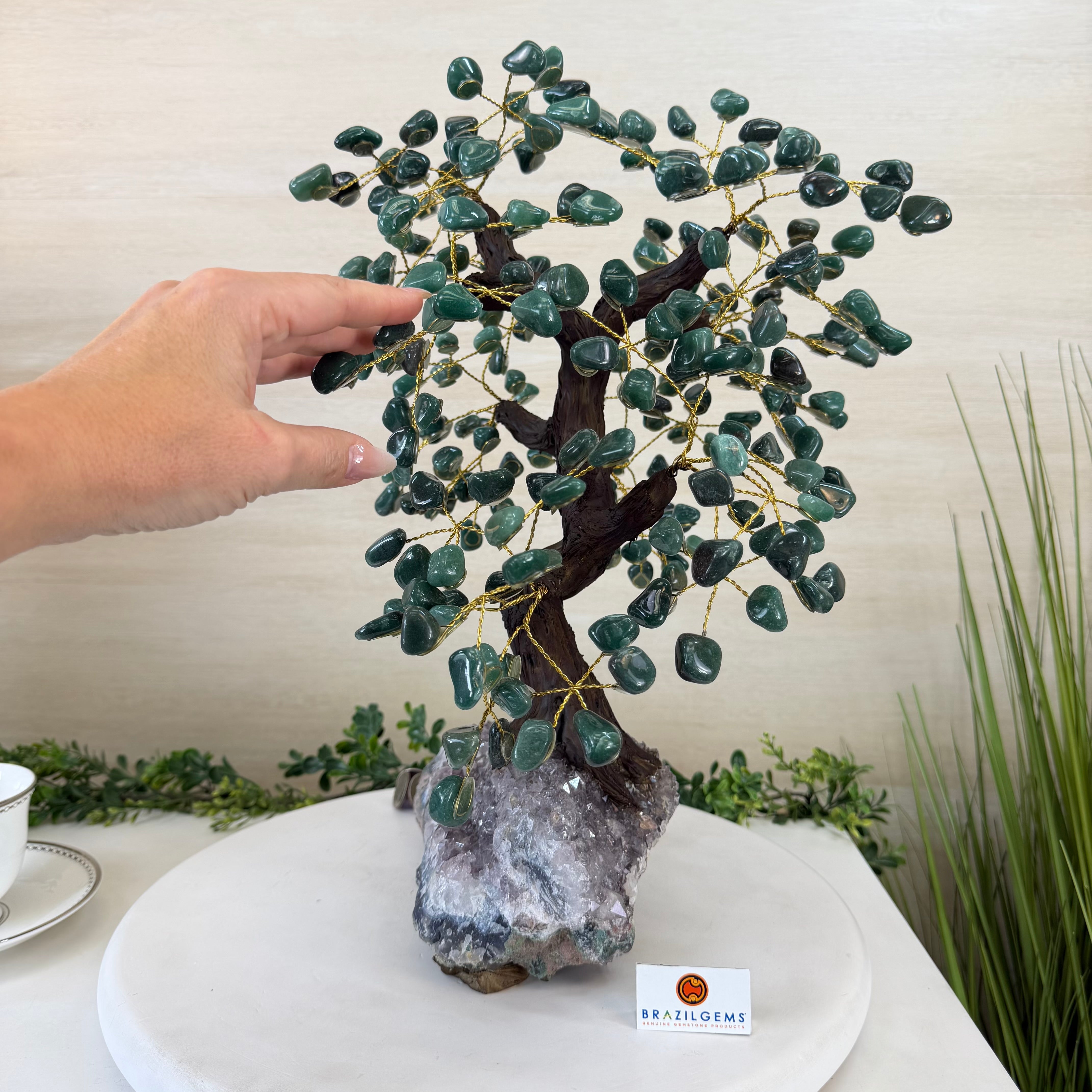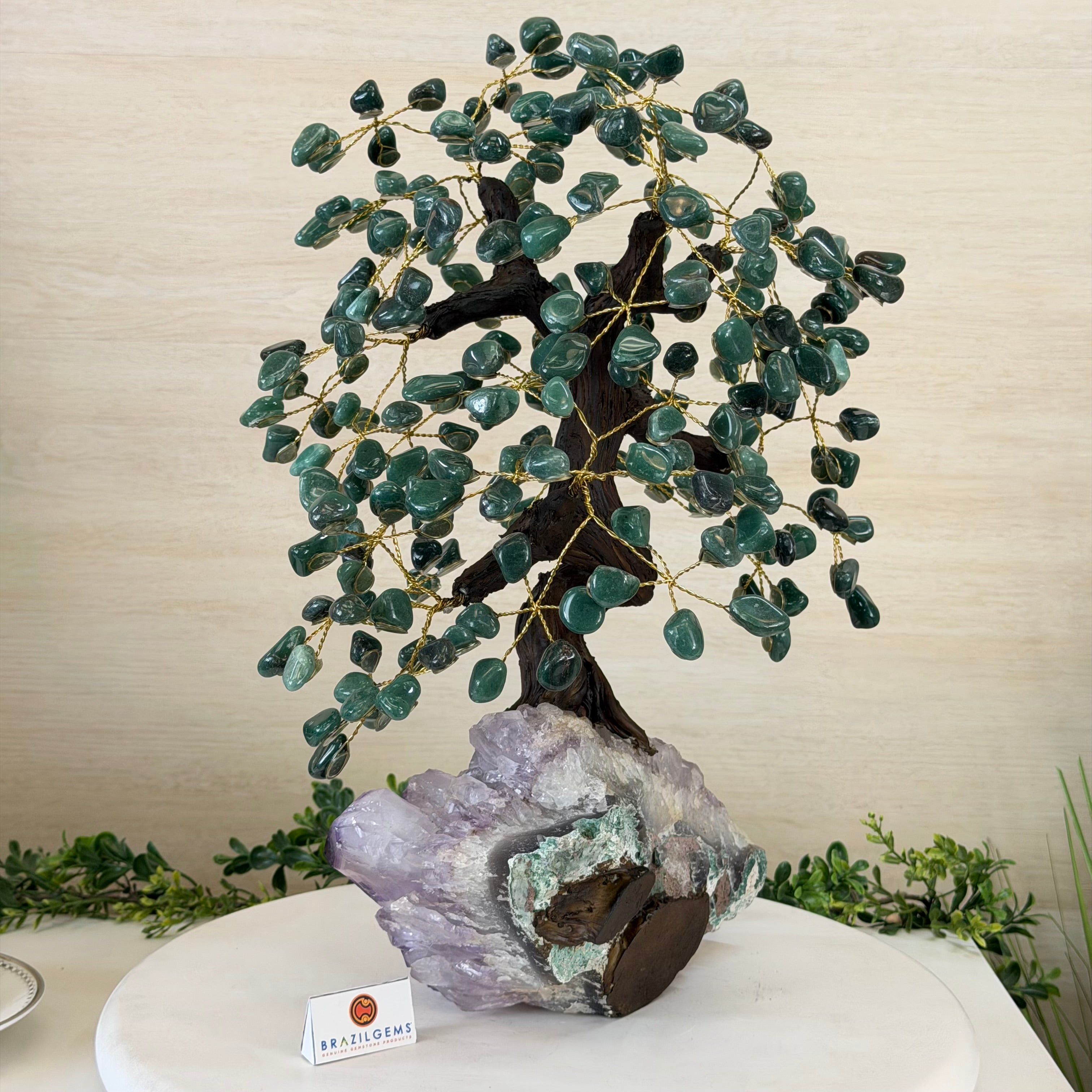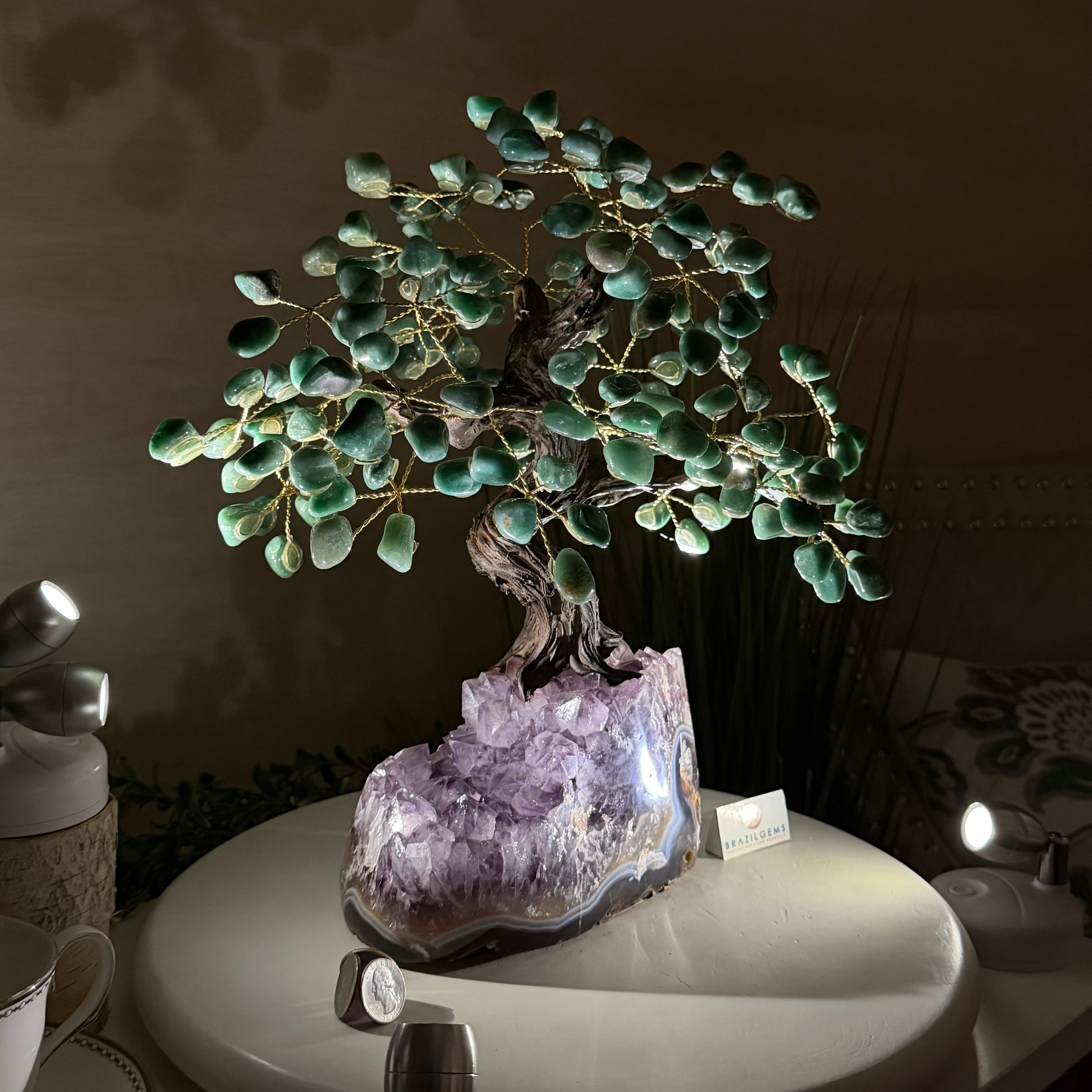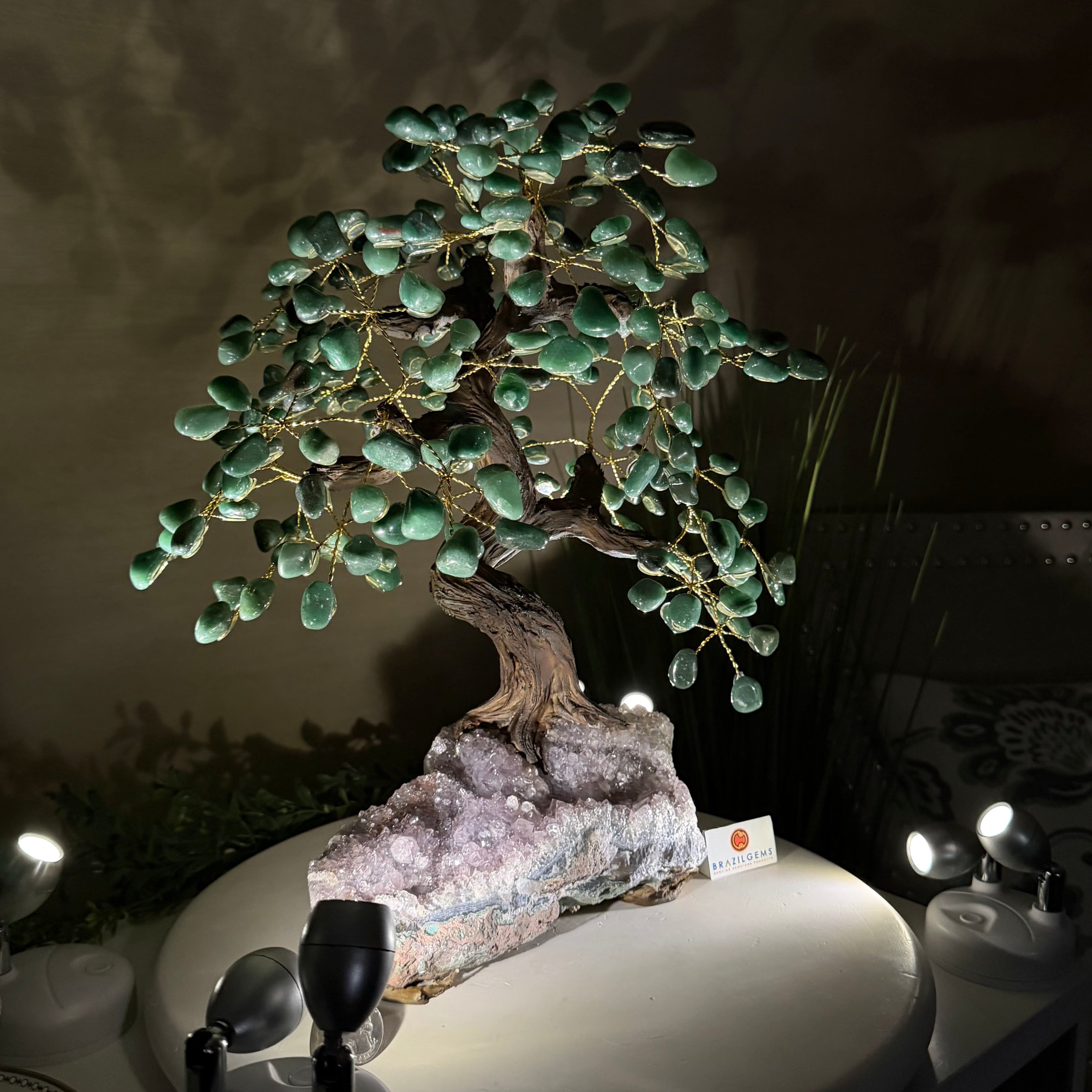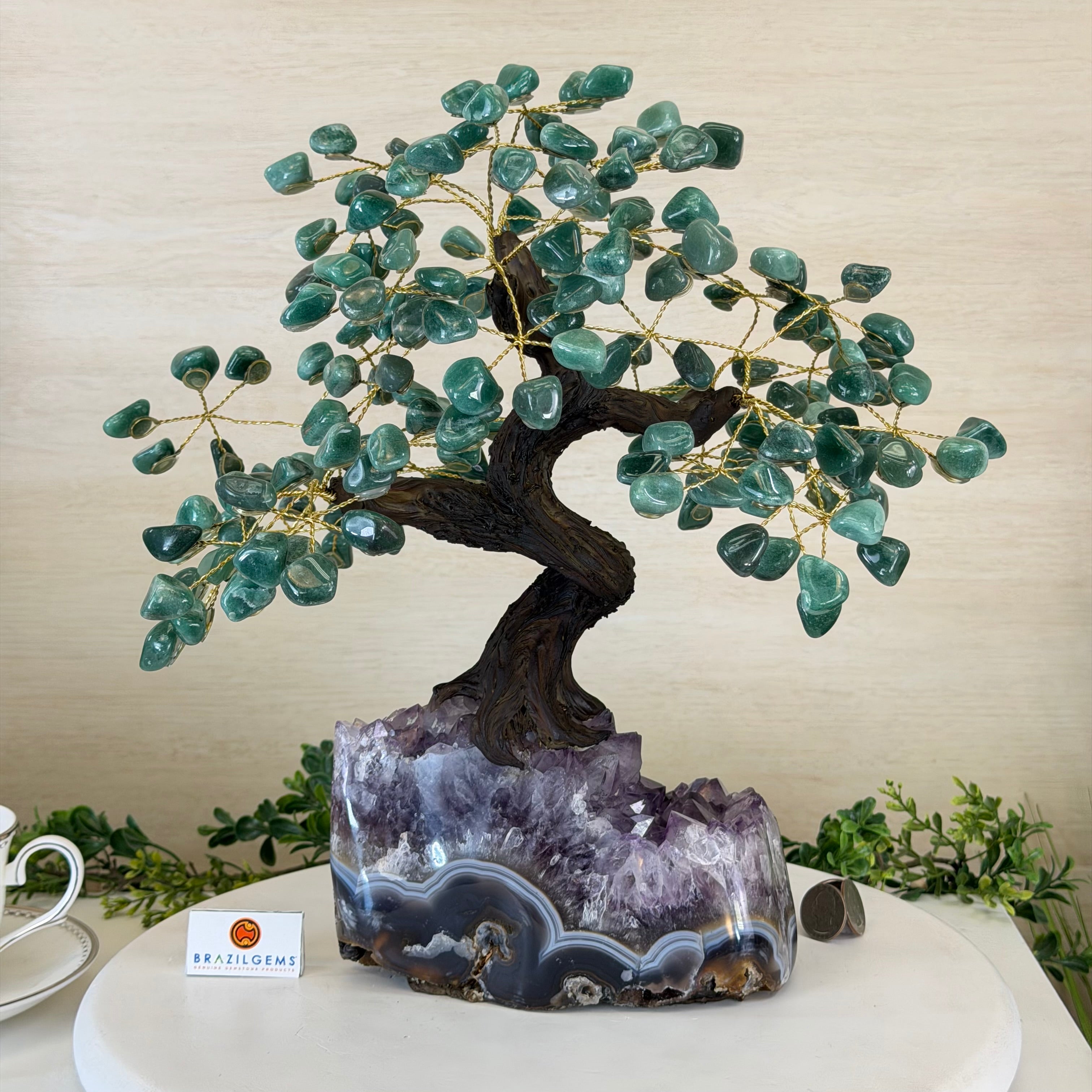 17" Tall Green Quartz Bonsai Gemstone Tree, Amethyst Base, 240 Gems #5405GRNQ-001
