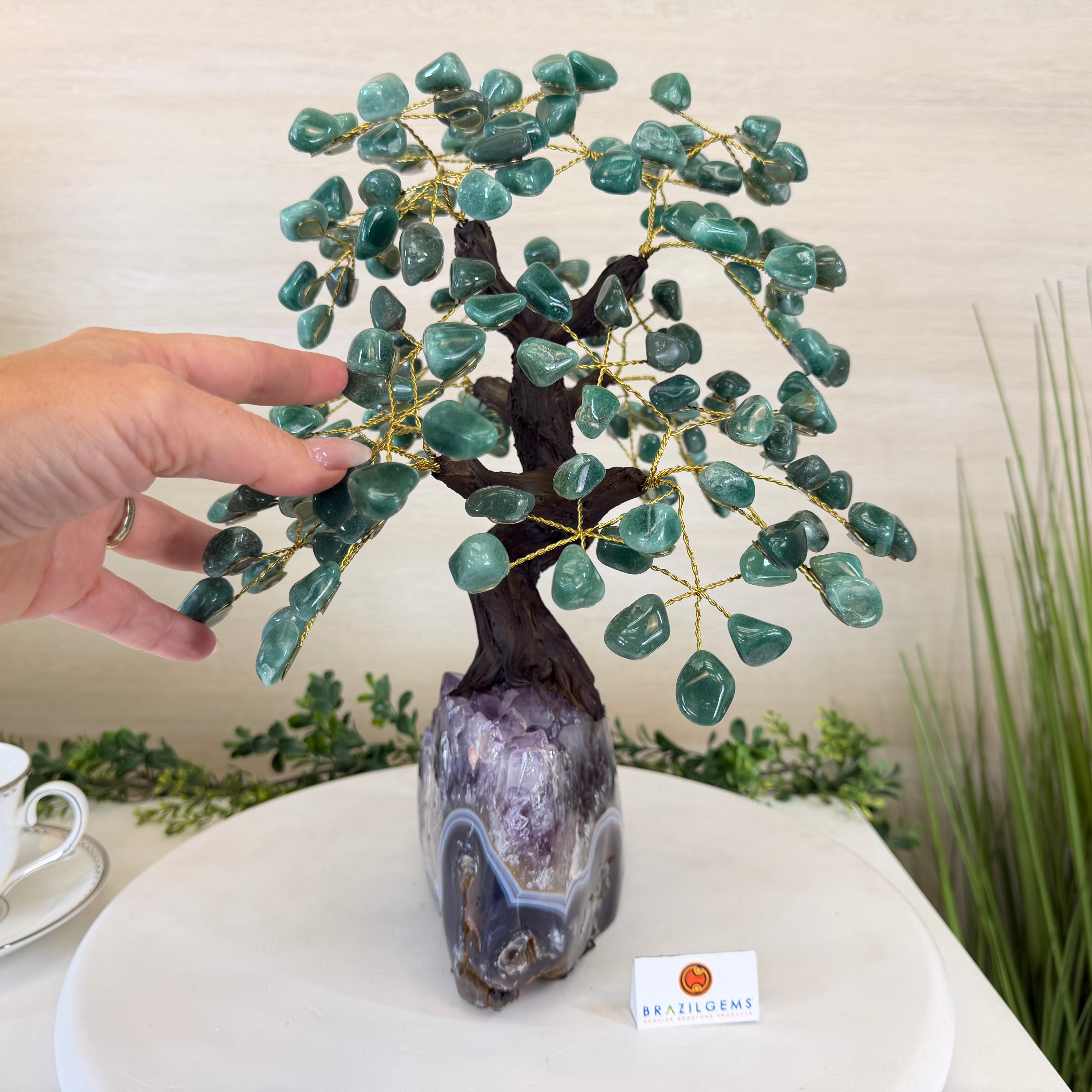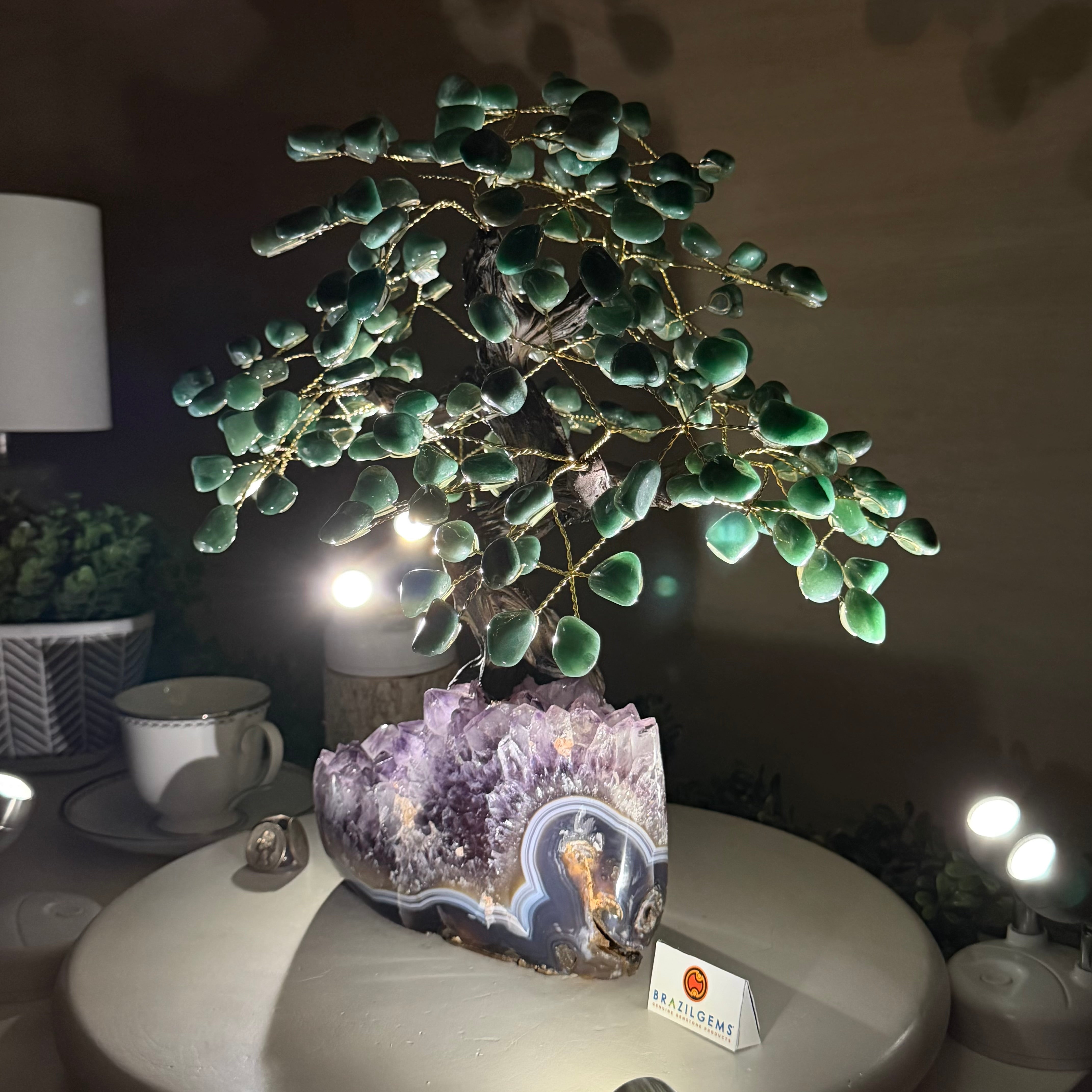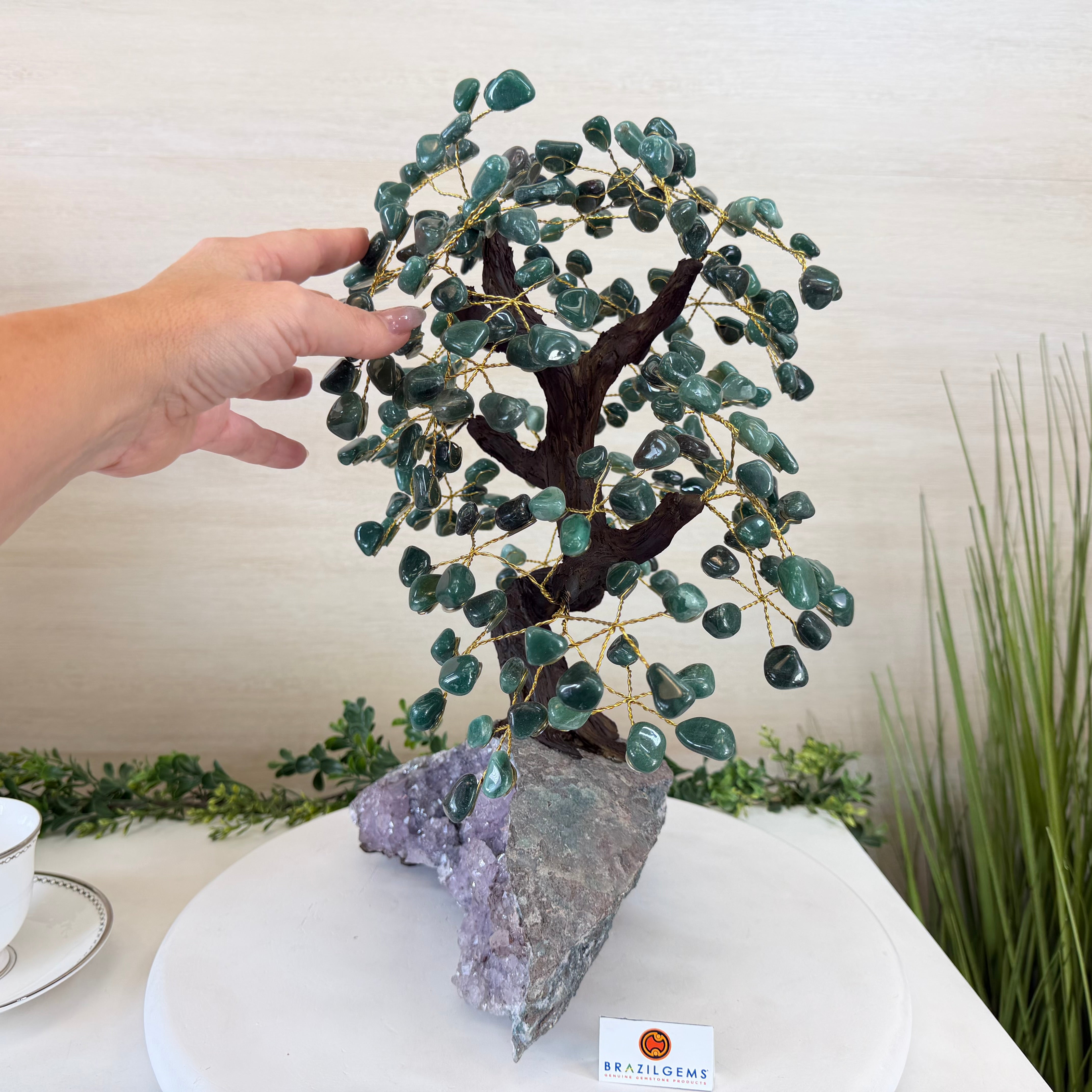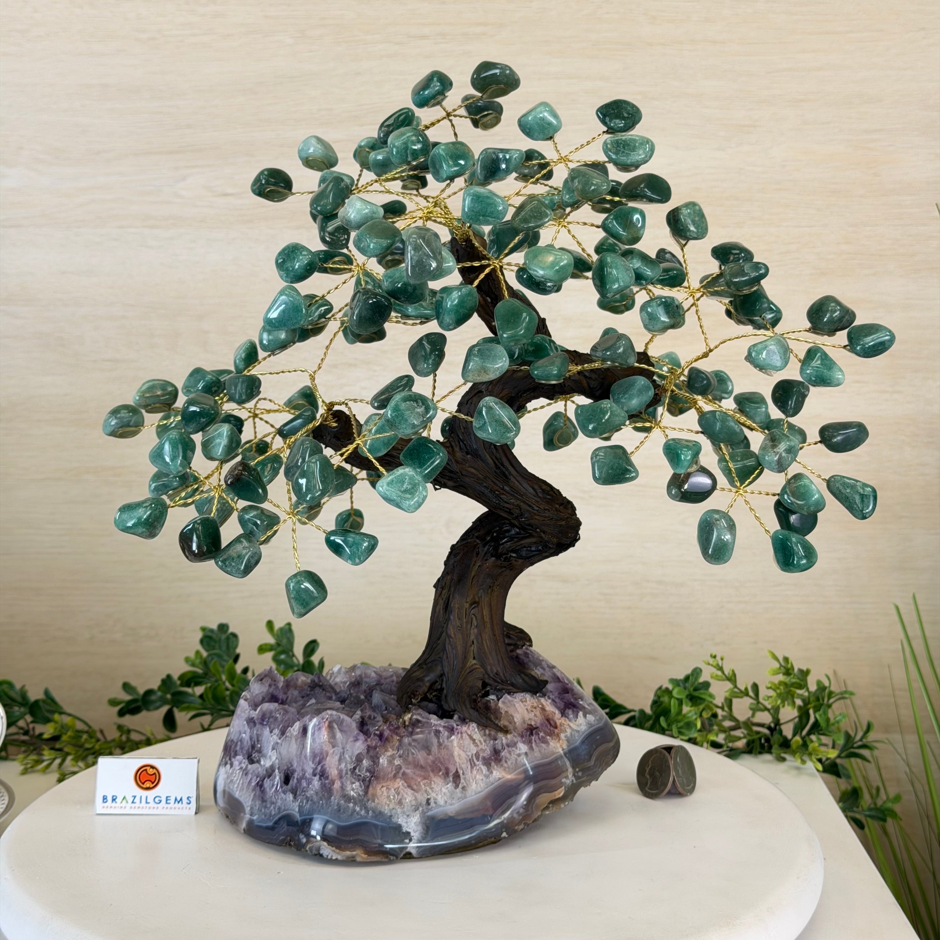 17" Tall Green Quartz Bonsai Gemstone Tree, Amethyst Base, 240 Gems #5405GRNQ-001