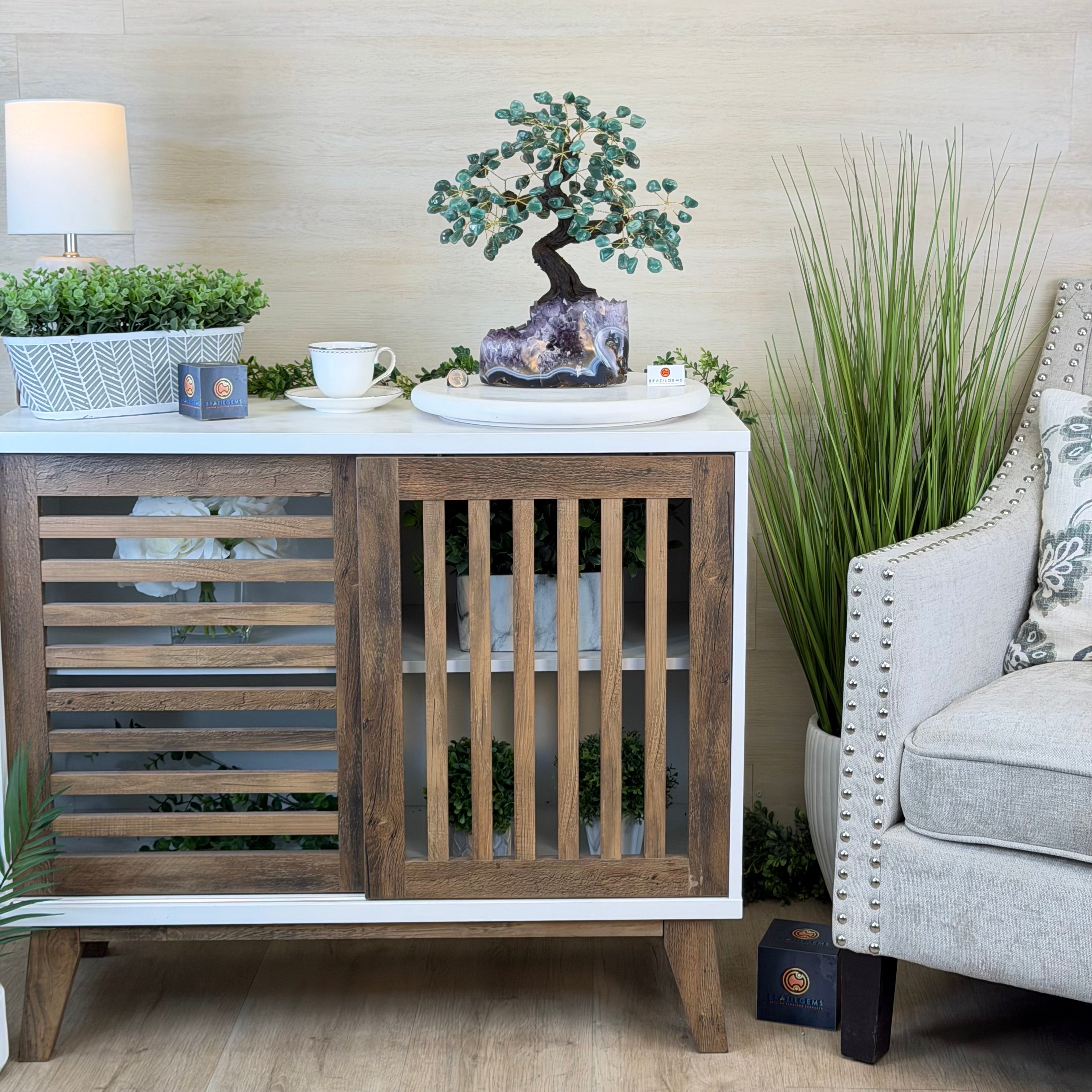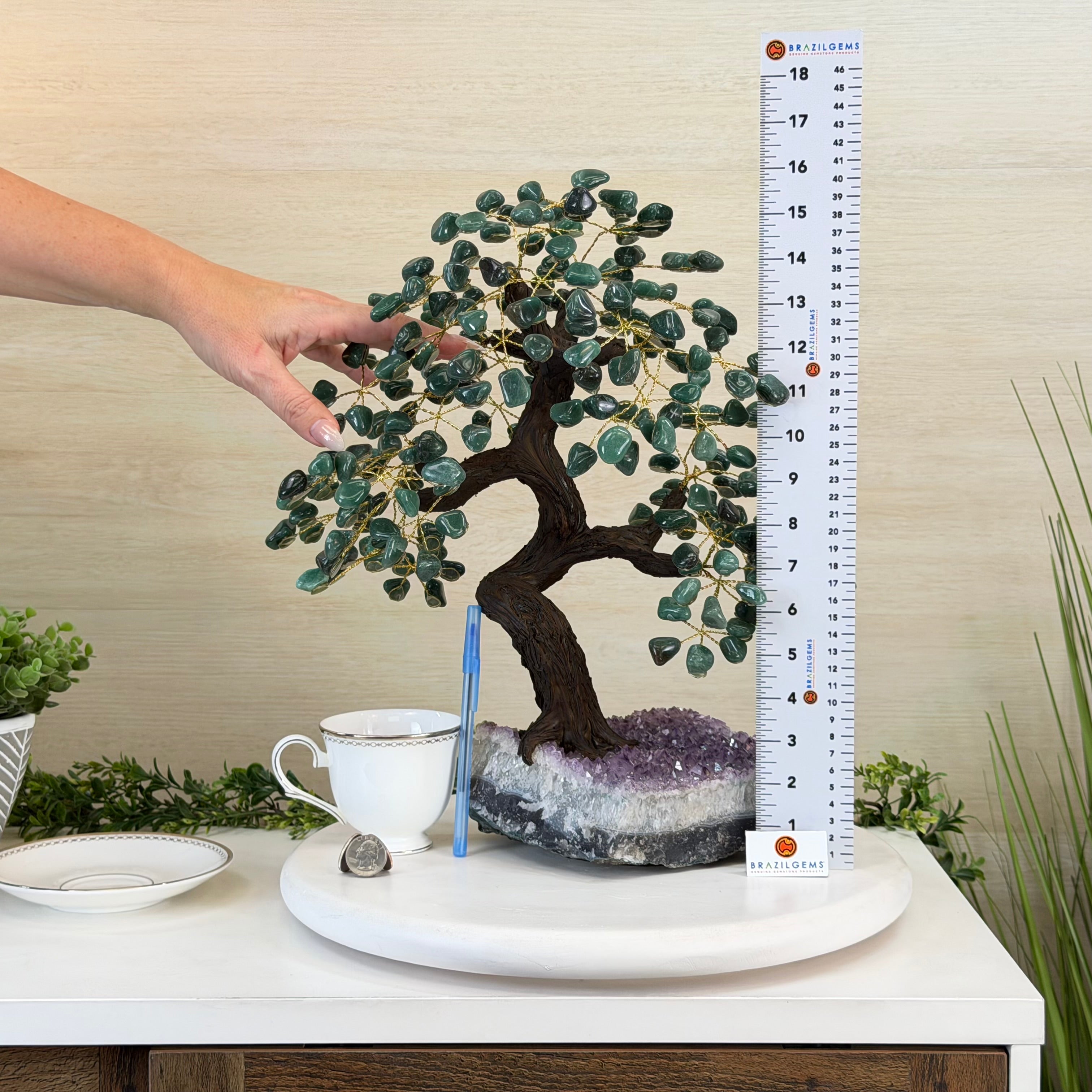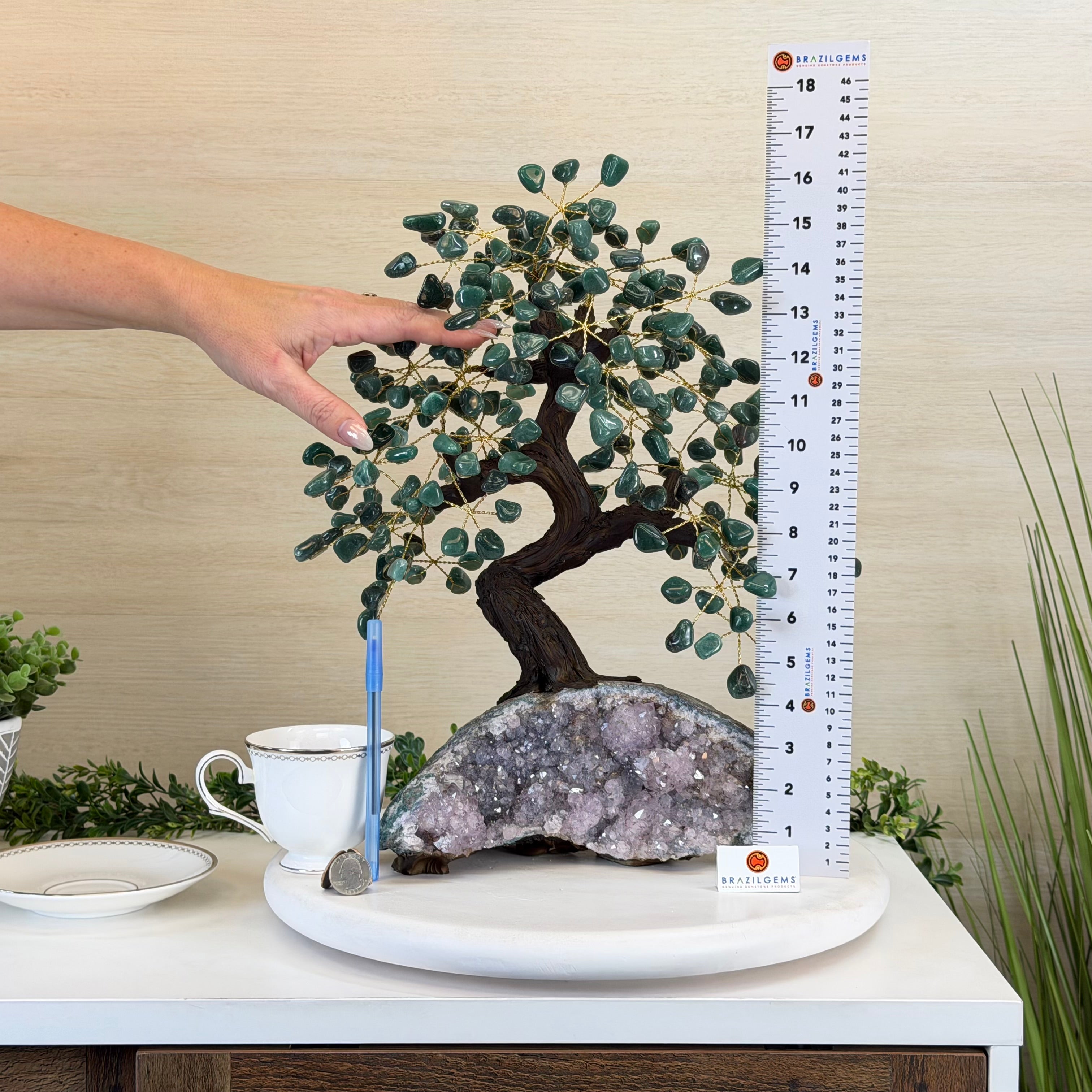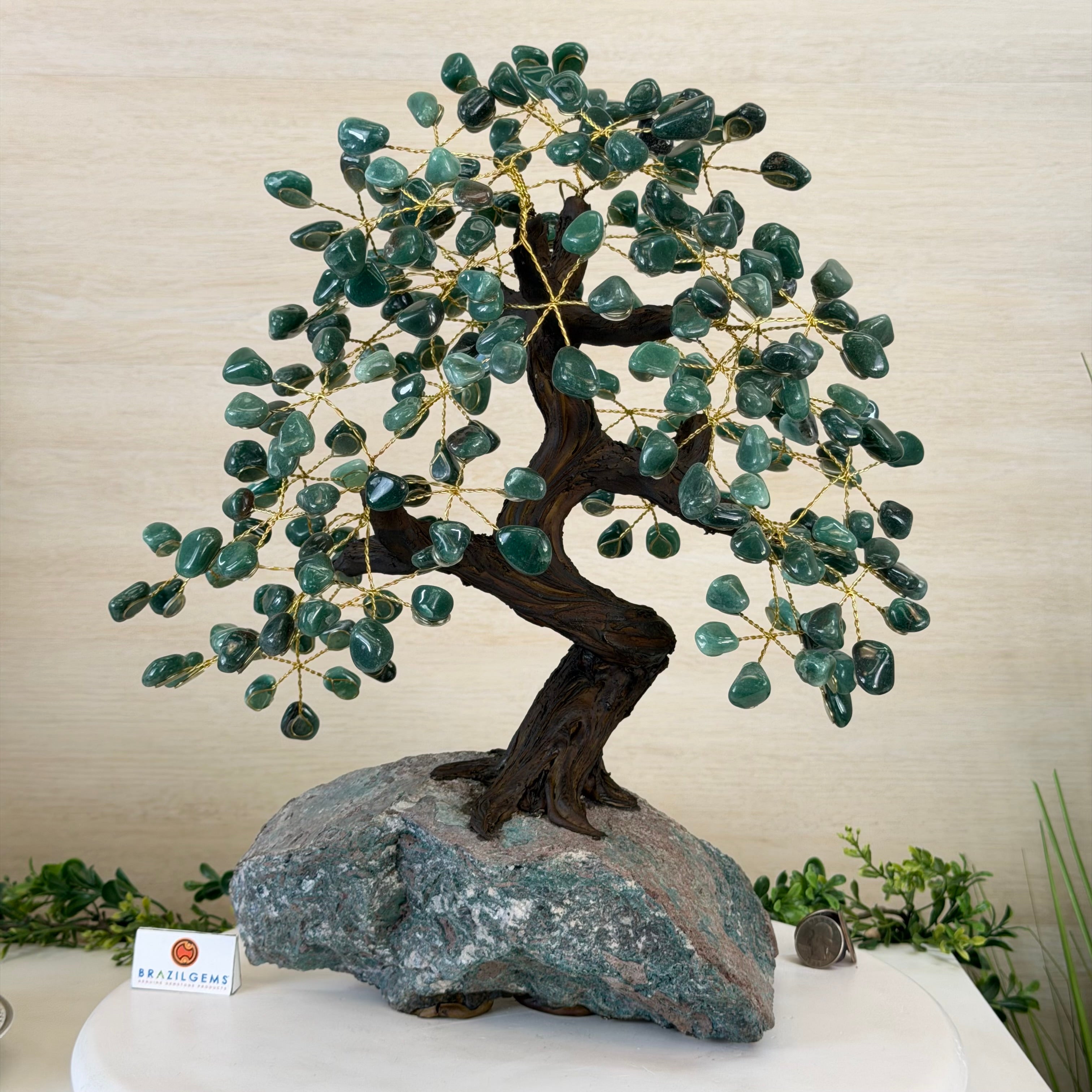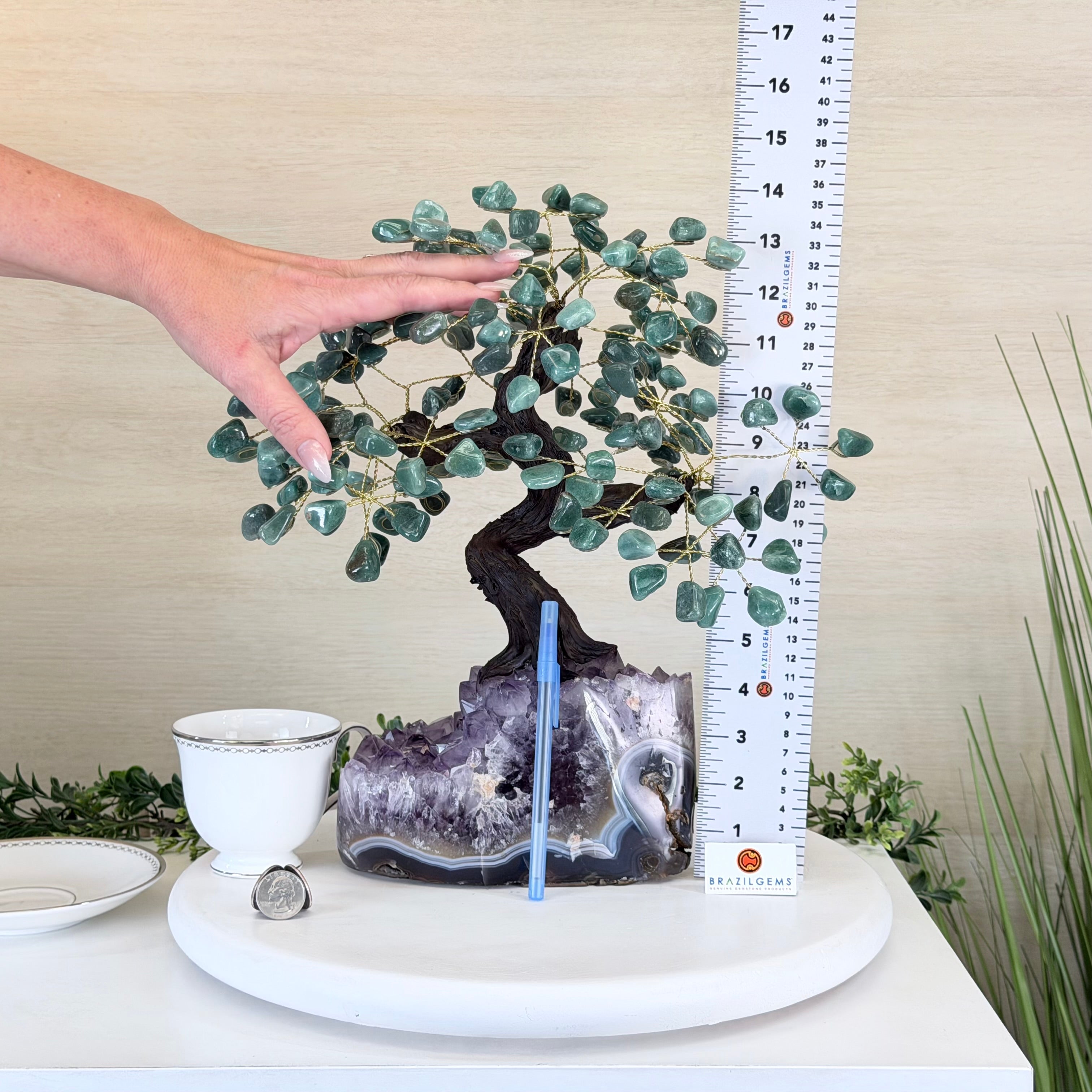 17" Tall Green Quartz Bonsai Gemstone Tree, Amethyst Base, 240 Gems #5405GRNQ-001
