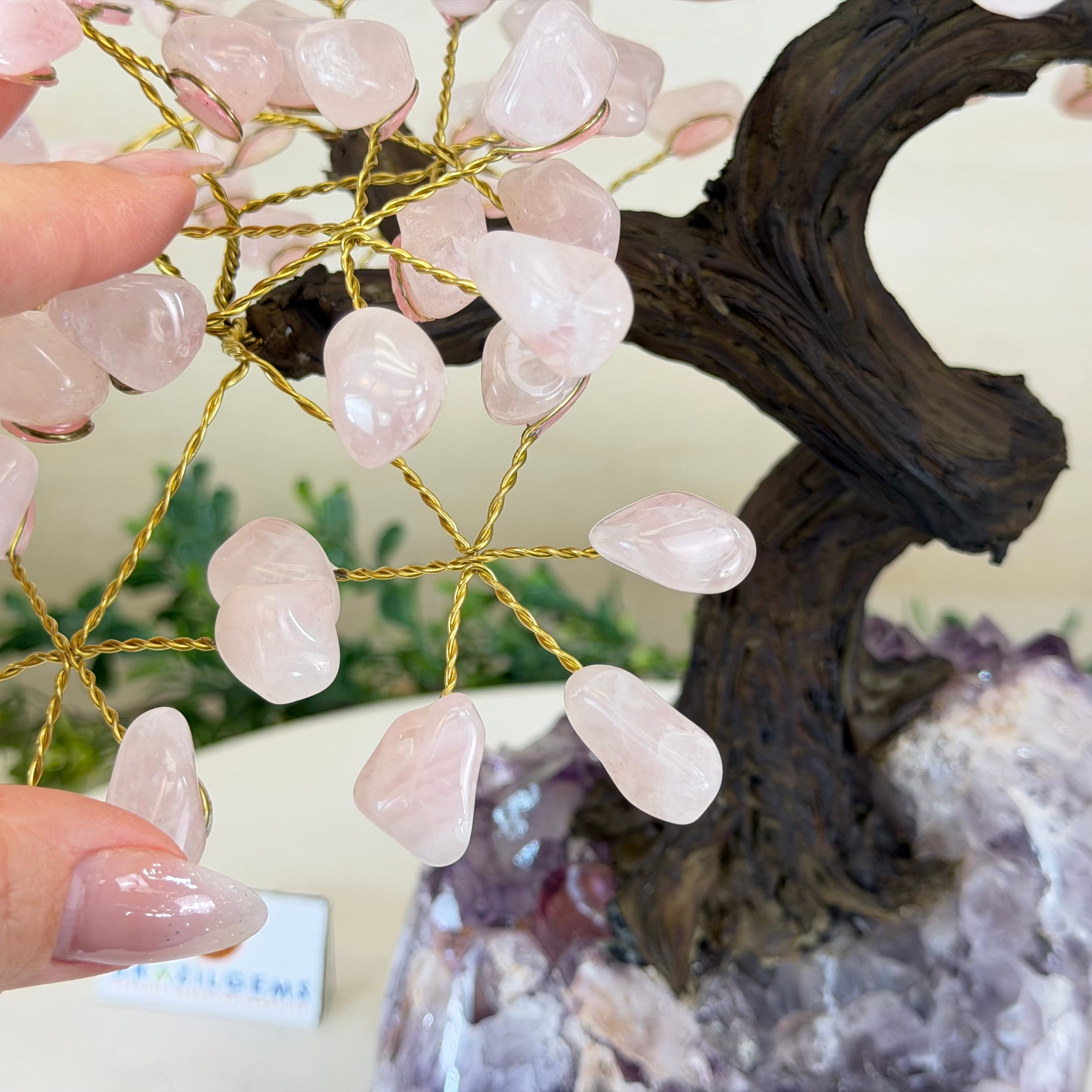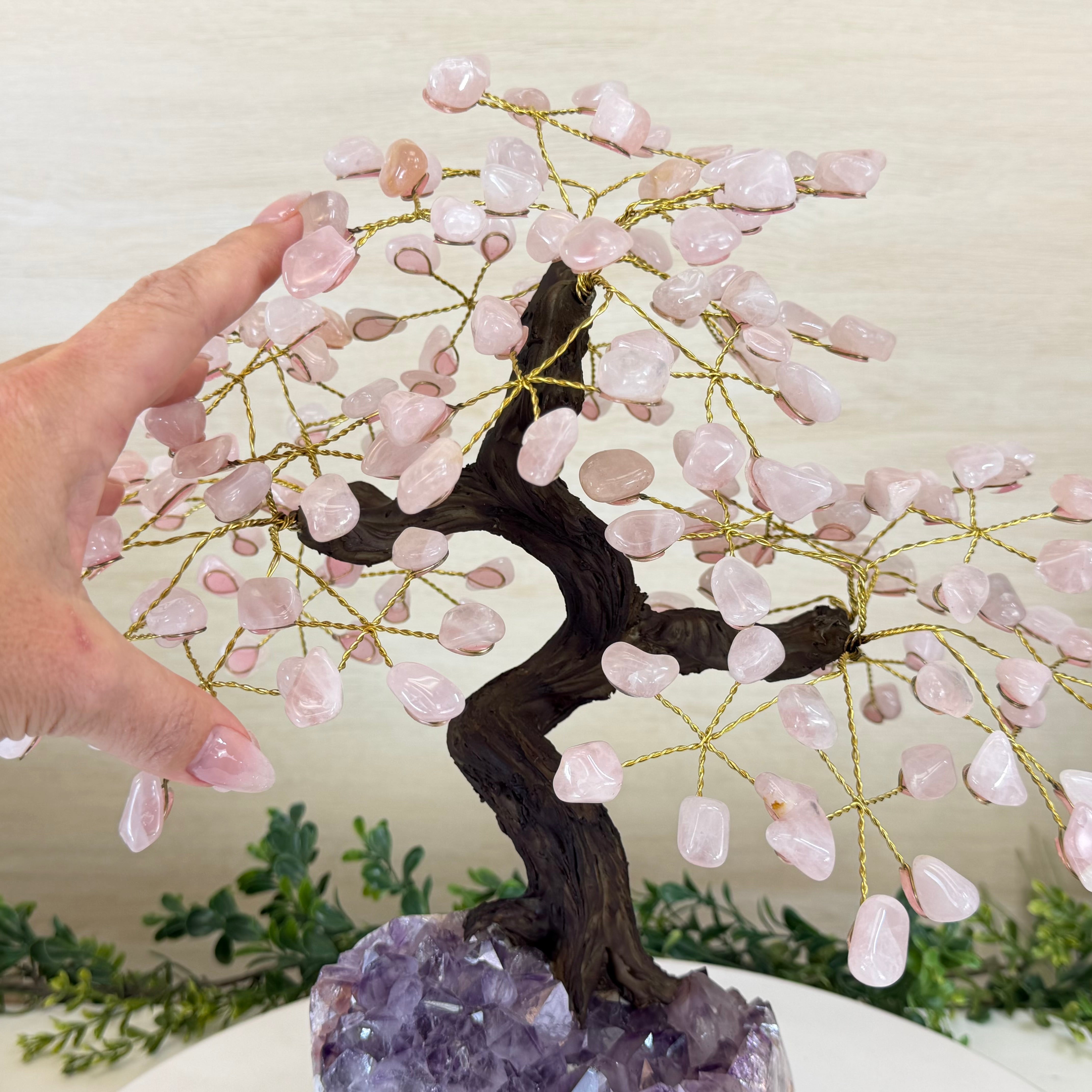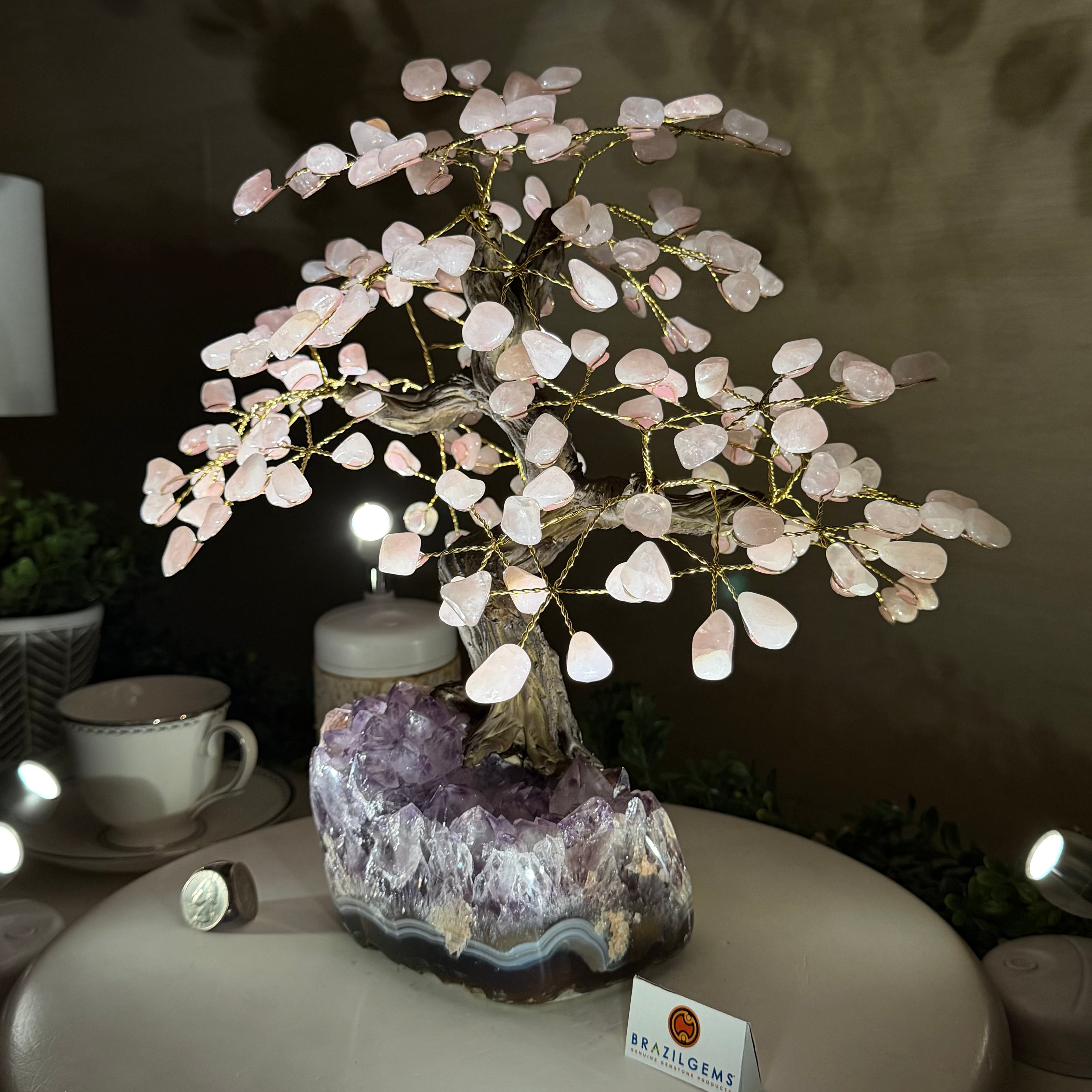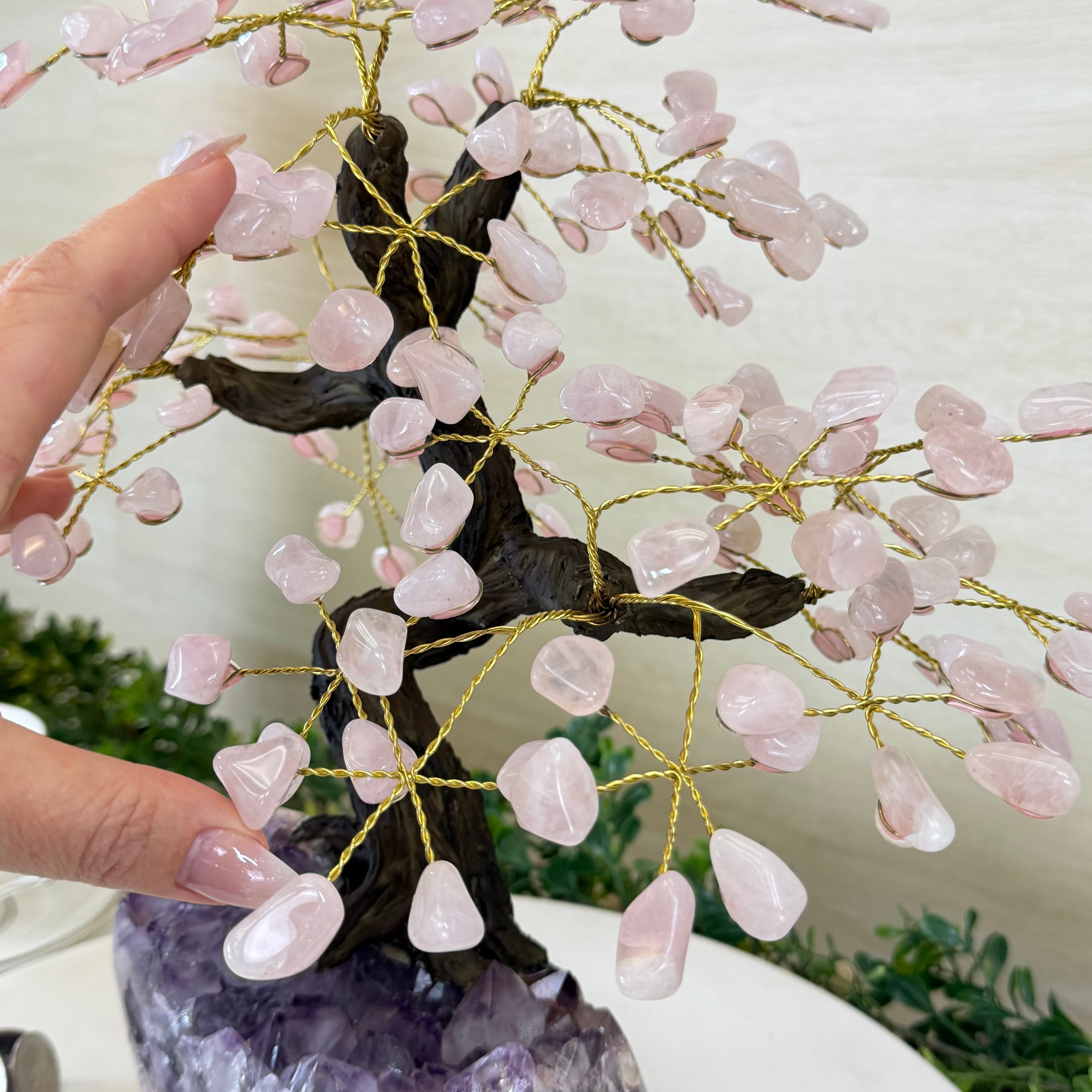 14" Tall Special Rose Quartz Gemstone Tree, Amethyst base, 180 Gems #5404XRQ-001