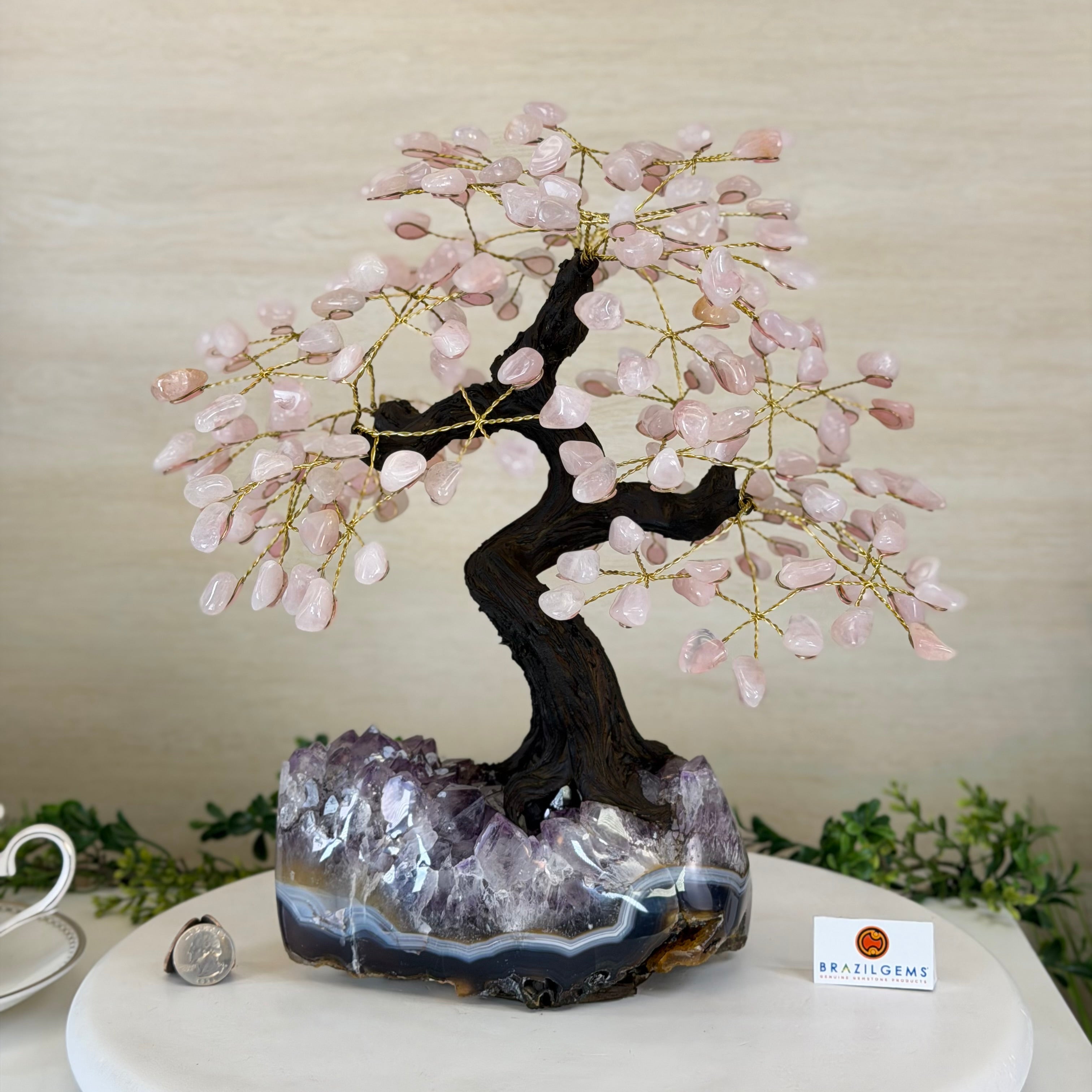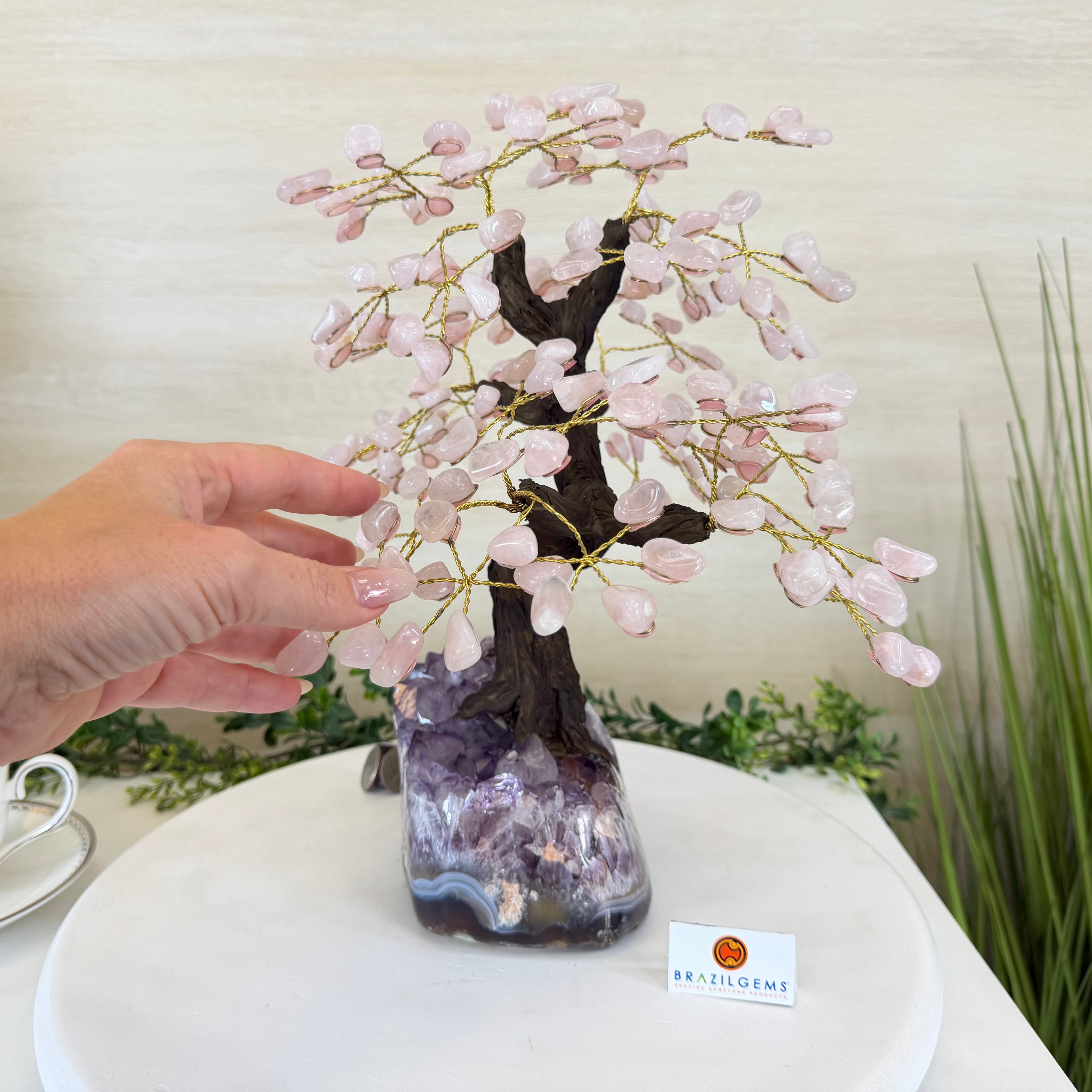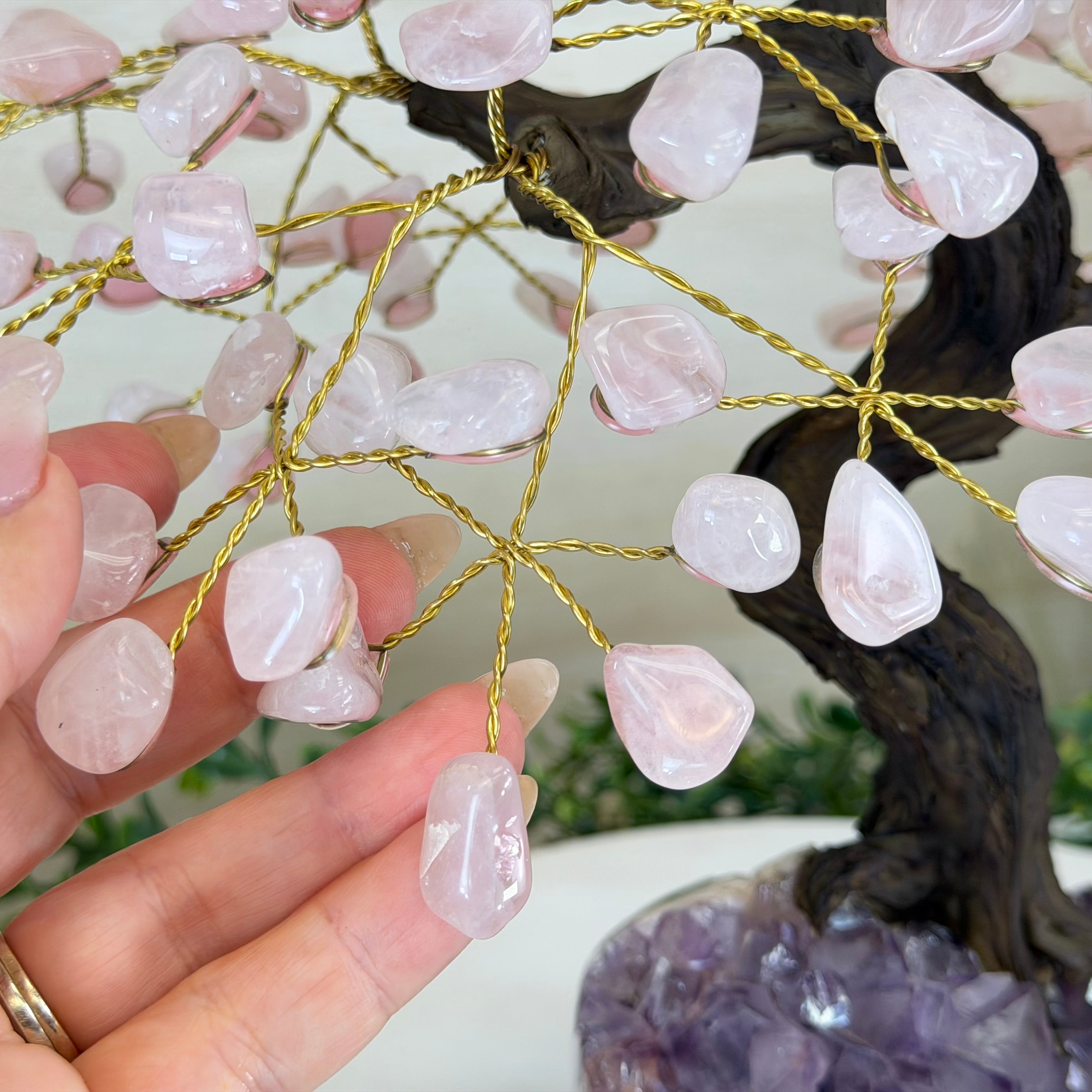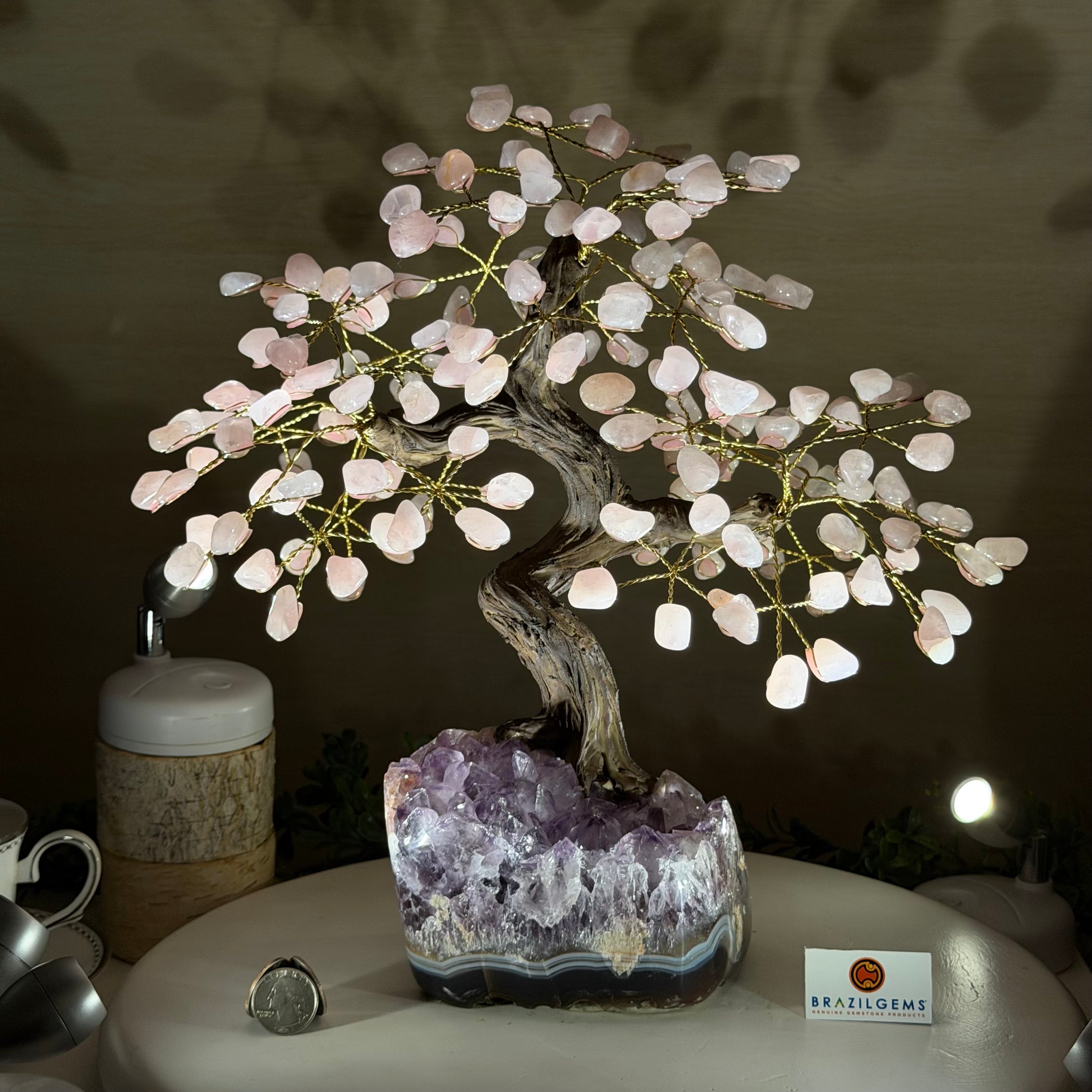 14" Tall Special Rose Quartz Gemstone Tree, Amethyst base, 180 Gems #5404XRQ-001