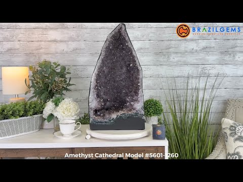 Elevate your space to new heights with this Standard Plus Quality Brazilian Amethyst Cathedral by Brazil Gems®. With violet colors throughout and nicely shaped crystal points, this piece elevate the decor of your favorite space with its natural beauty.