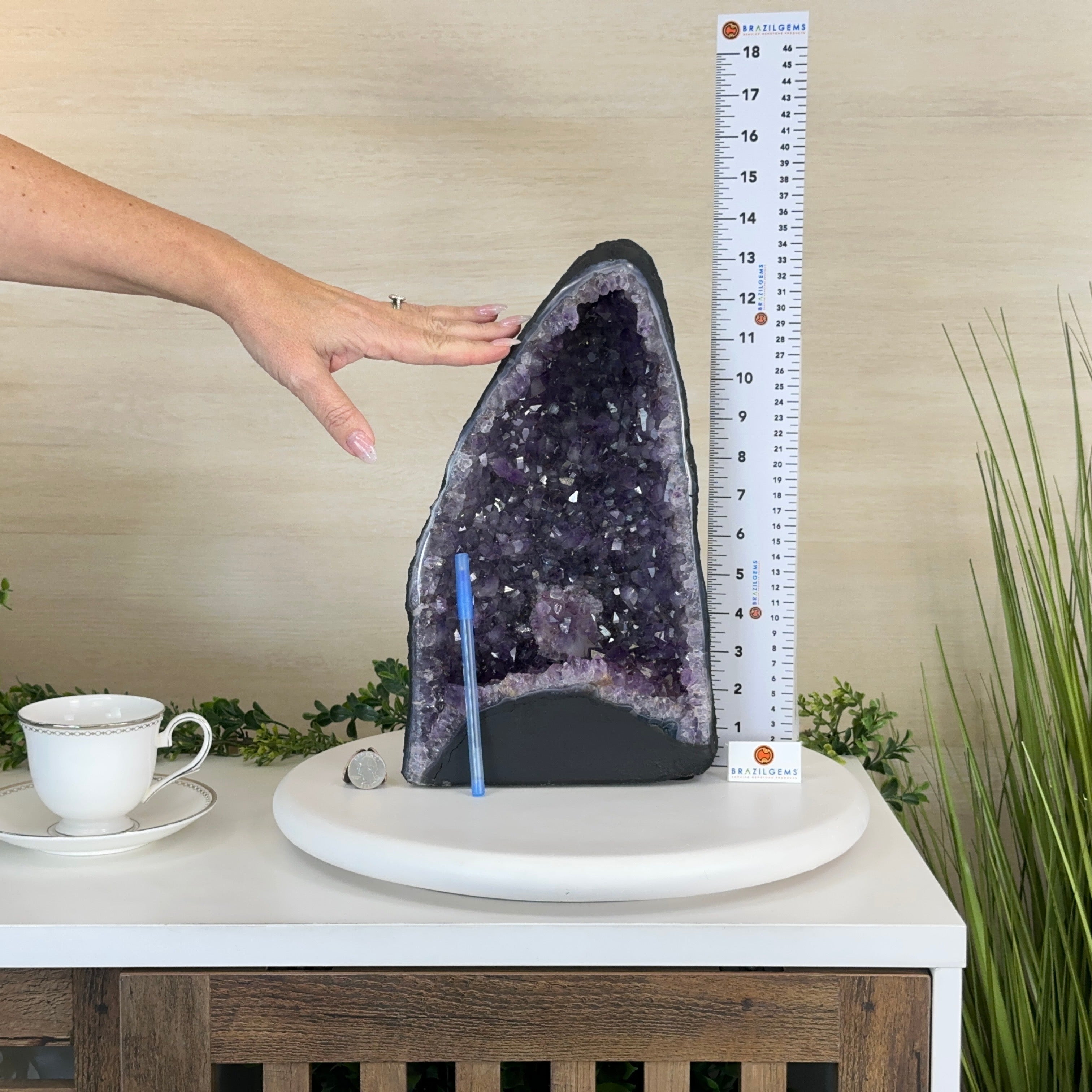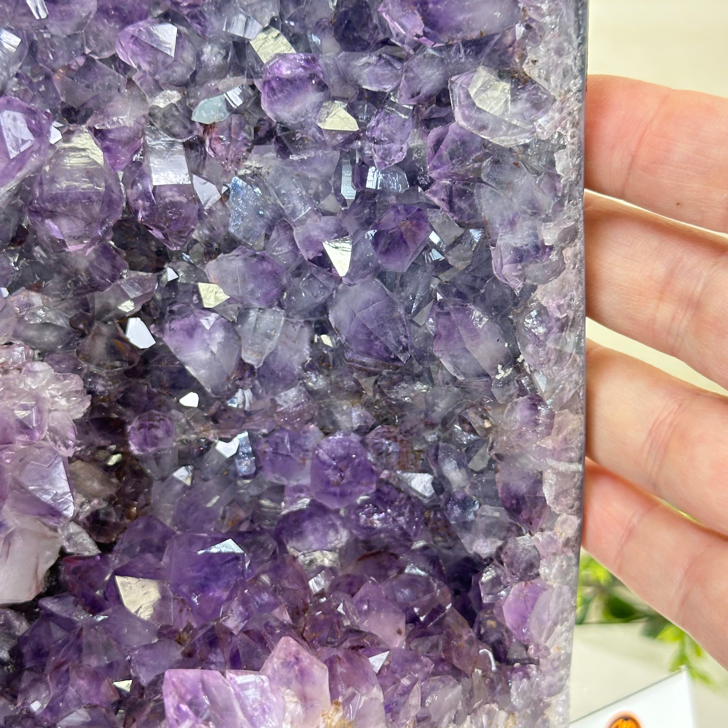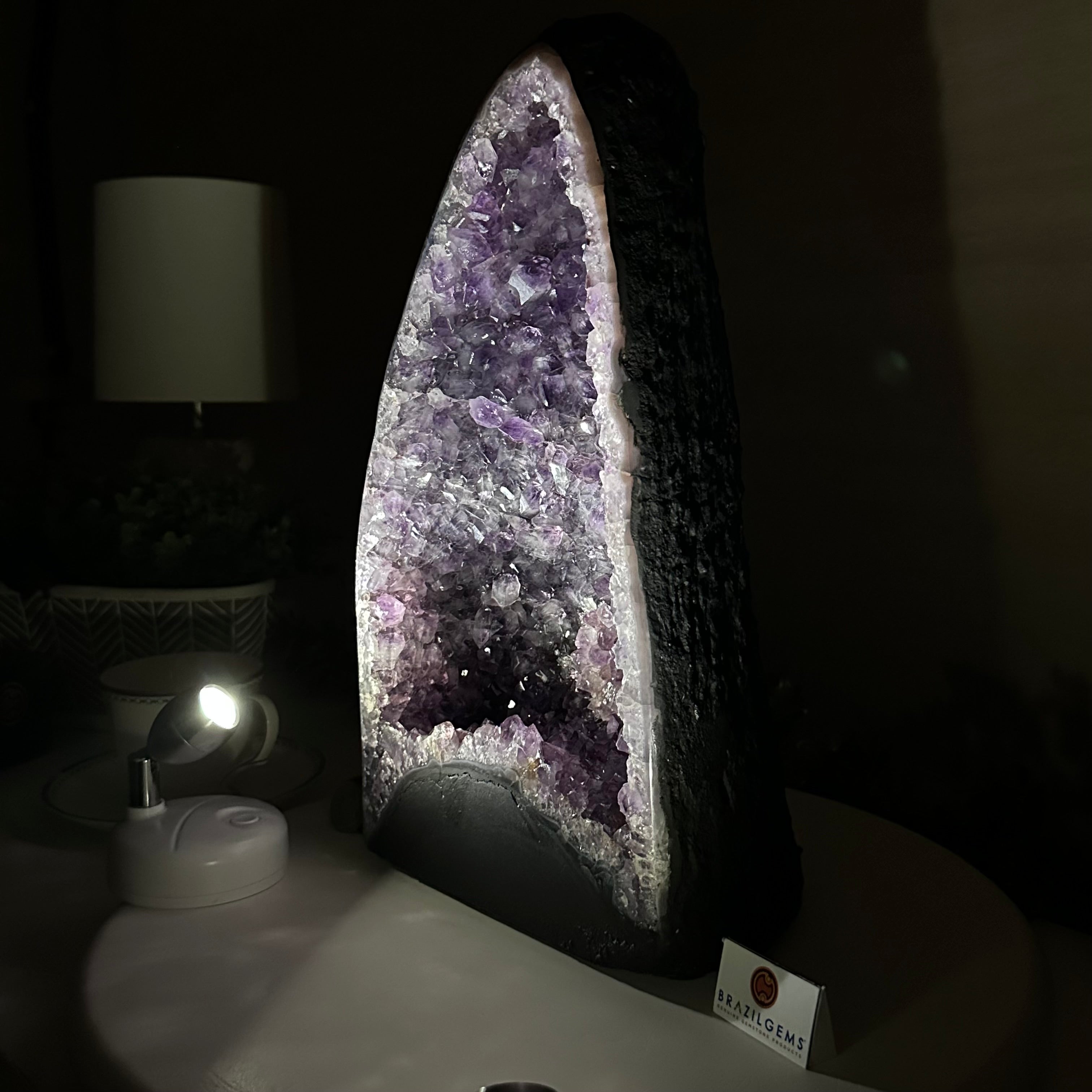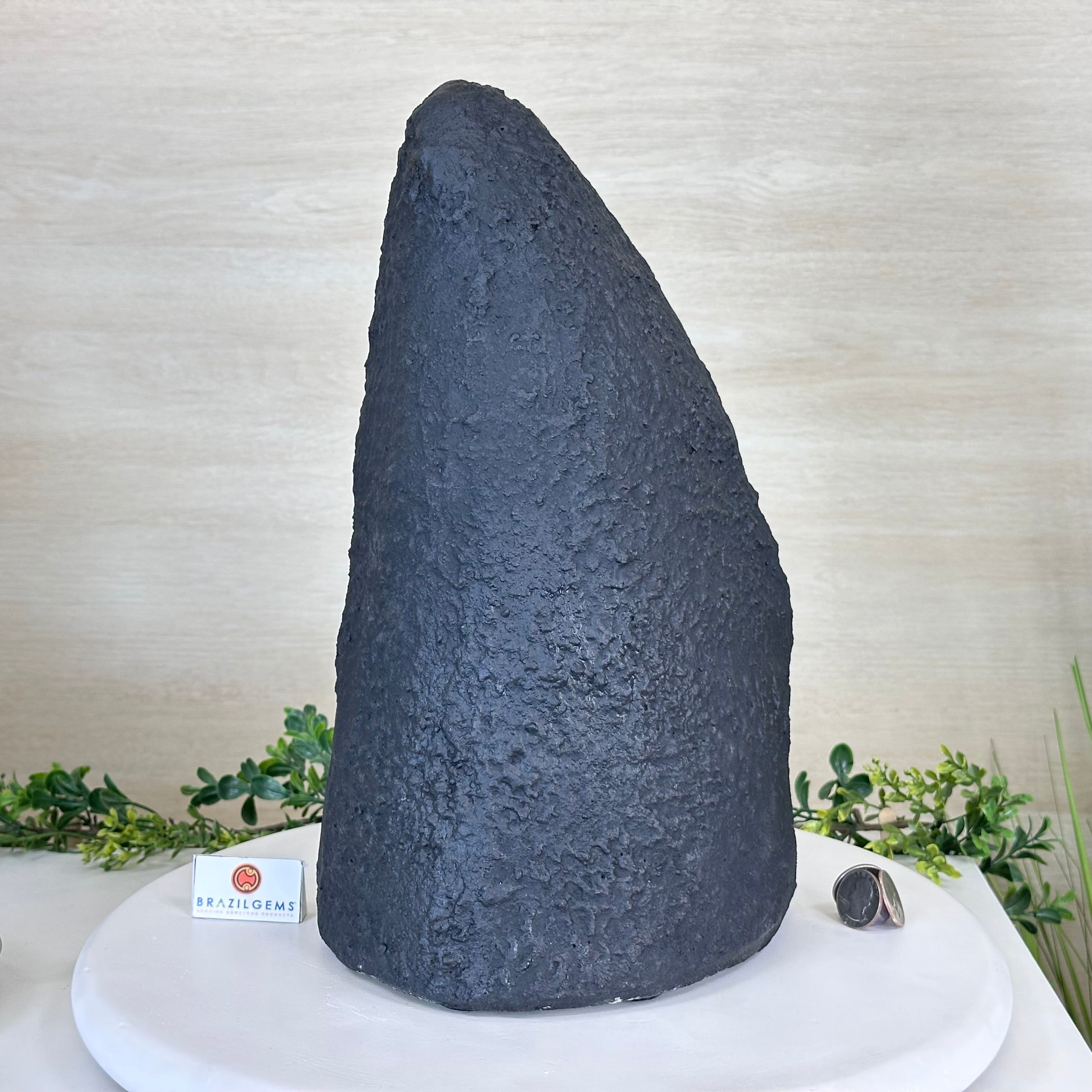 Disclaimer: This is a natural gemstone crystal sold by Brazil Gems® as is and as you see it in its images and video. It is the exact one you will receive. It may contain natural imperfections as well as imperfections, broken edges and repairs from the extraction, polishing and prepping processes. In order for it to stand on its own, the back and bottom have been reinforced with a small amount of cement then painted black. At Brazil Gems® we make every effort to get measurements as exact as possible but they are done by human hands and eyes and therefore may have minor discrepancies.