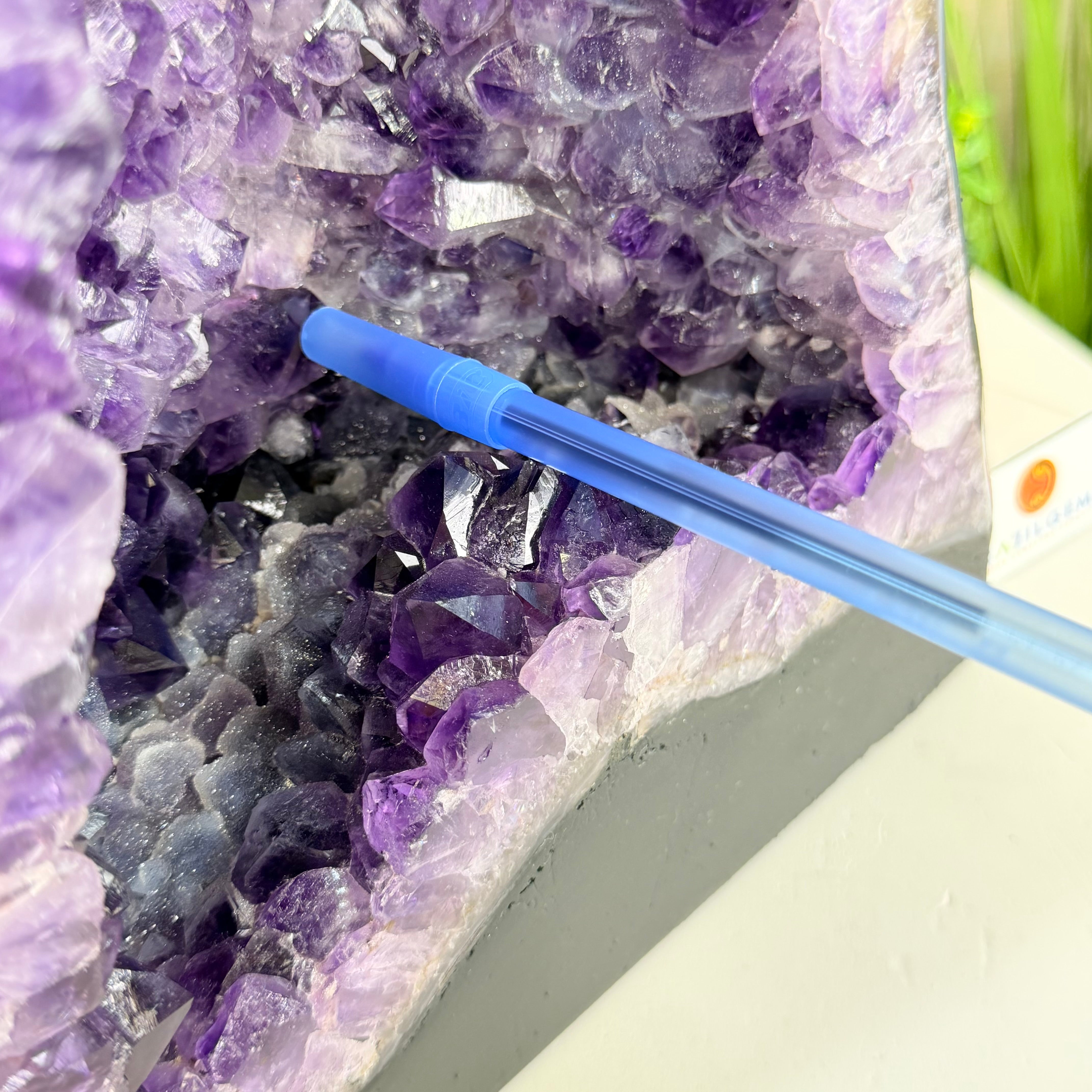 Disclaimer: This is a natural gemstone crystal sold by Brazil Gems® as is and as you see it in its images and video. It is the exact one you will receive. It may contain natural imperfections as well as imperfections, broken edges and repairs from the extraction, polishing and prepping processes. In order for it to stand on its own, the back and bottom have been reinforced with a small amount of cement then painted black. At Brazil Gems® we make every effort to get measurements as exact as possible but they are done by human hands and eyes and therefore may have minor discrepancies.