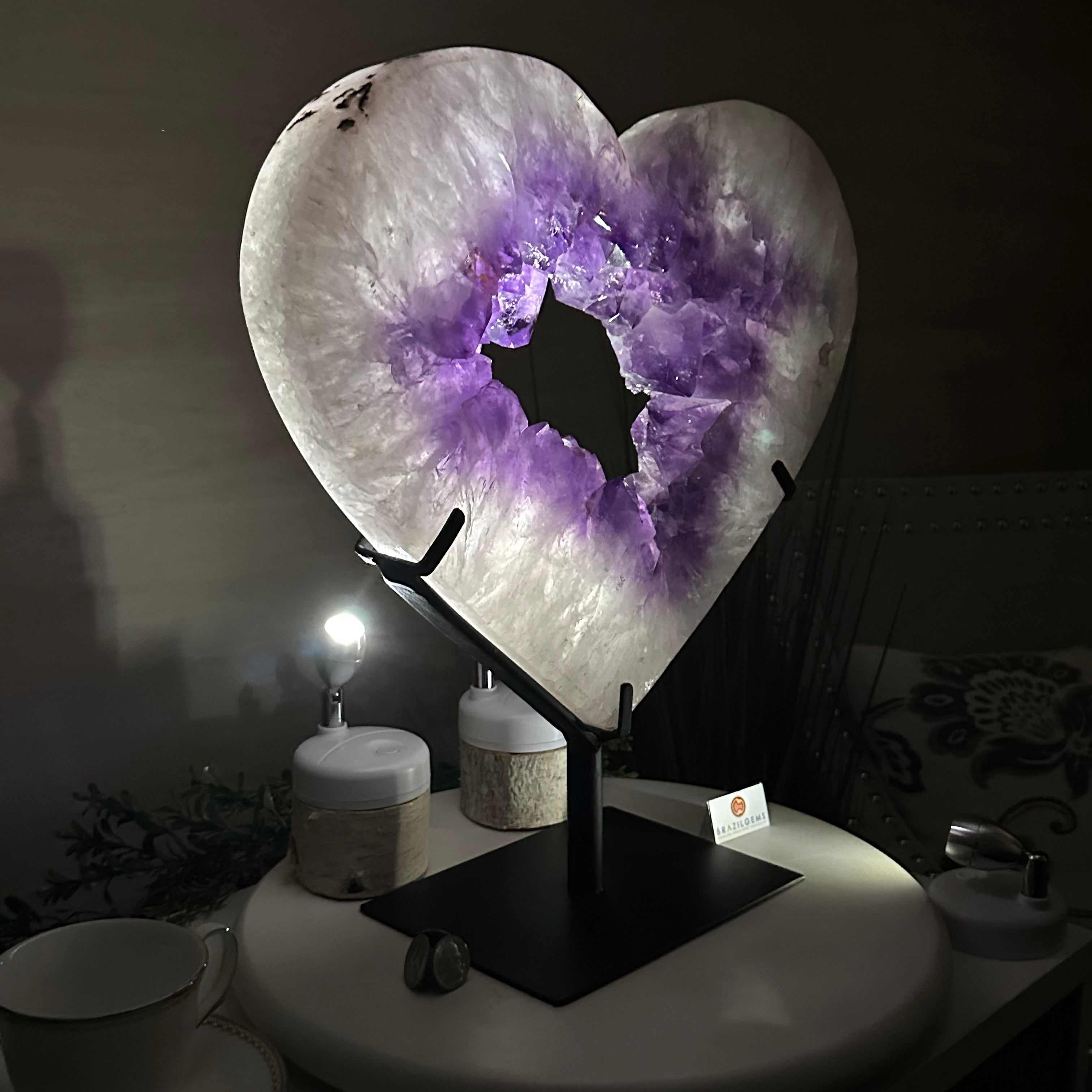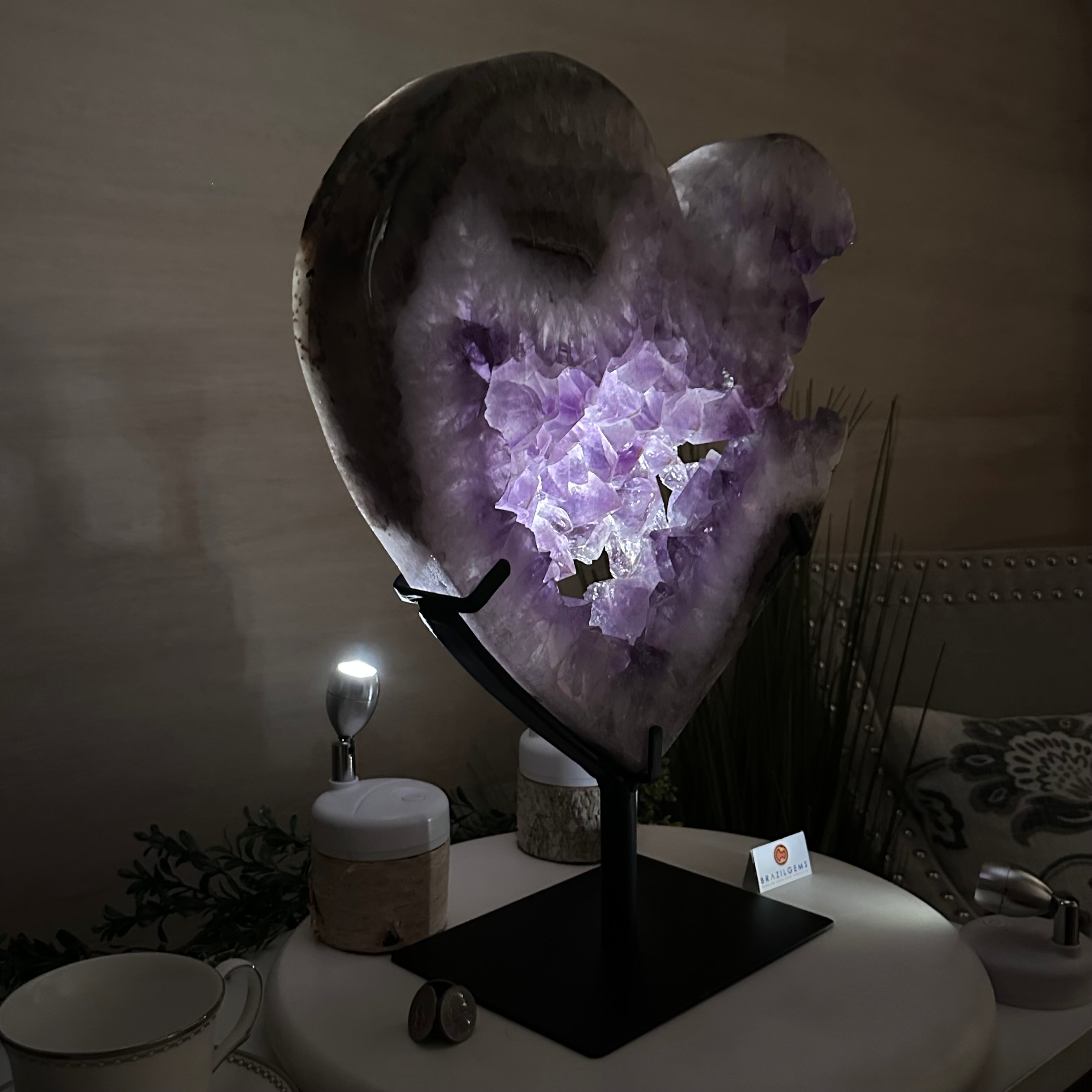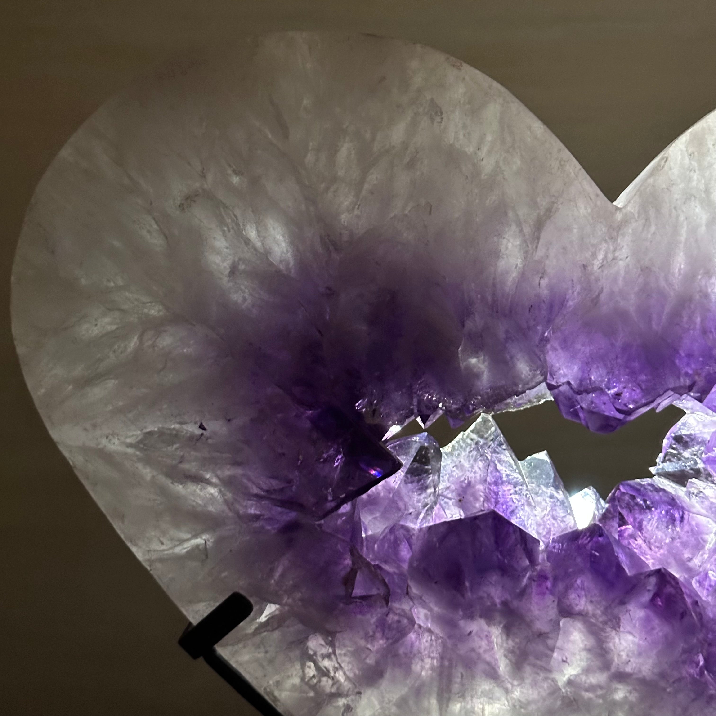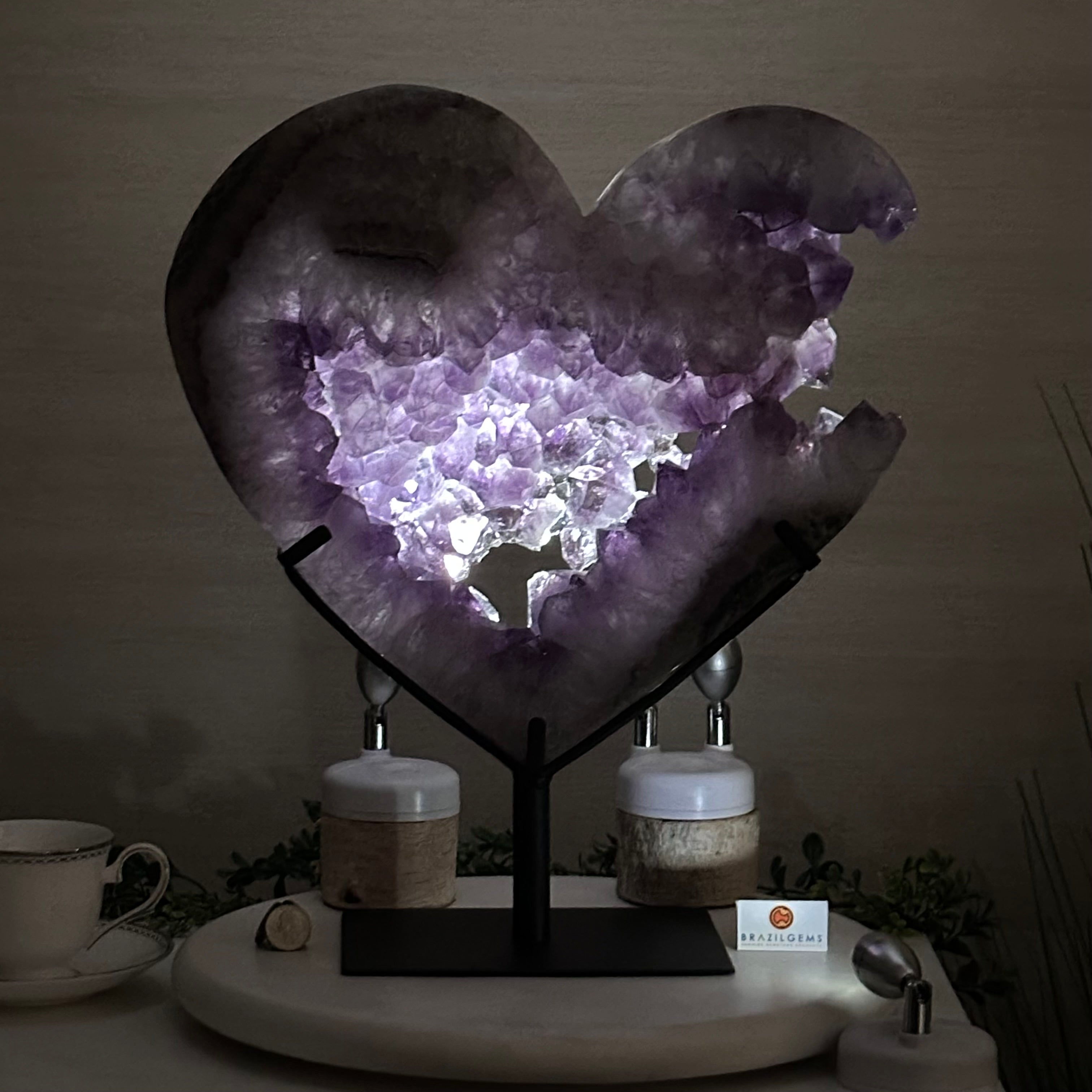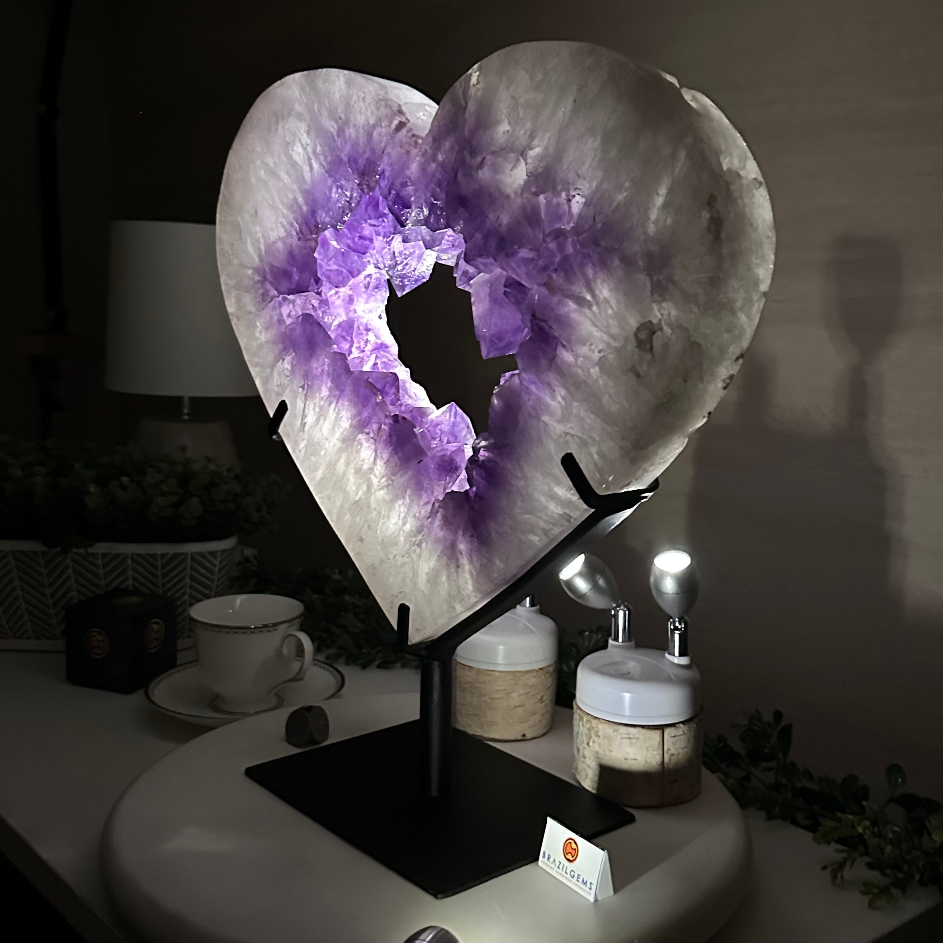 Quality Heart-Shaped Amethyst Geode on a black metal stand. Beautiful gemstones with polished edges and natural rough stone on its backside.