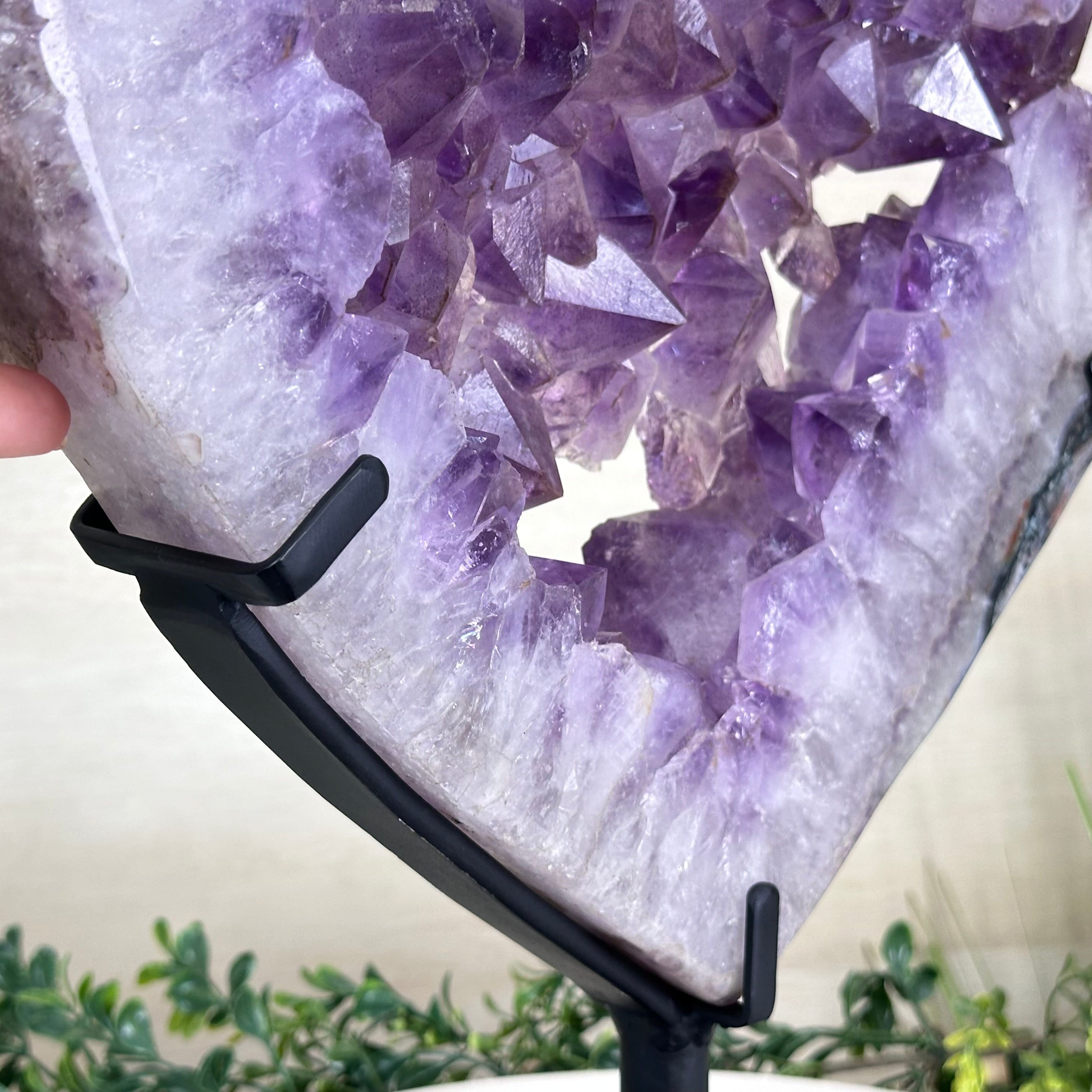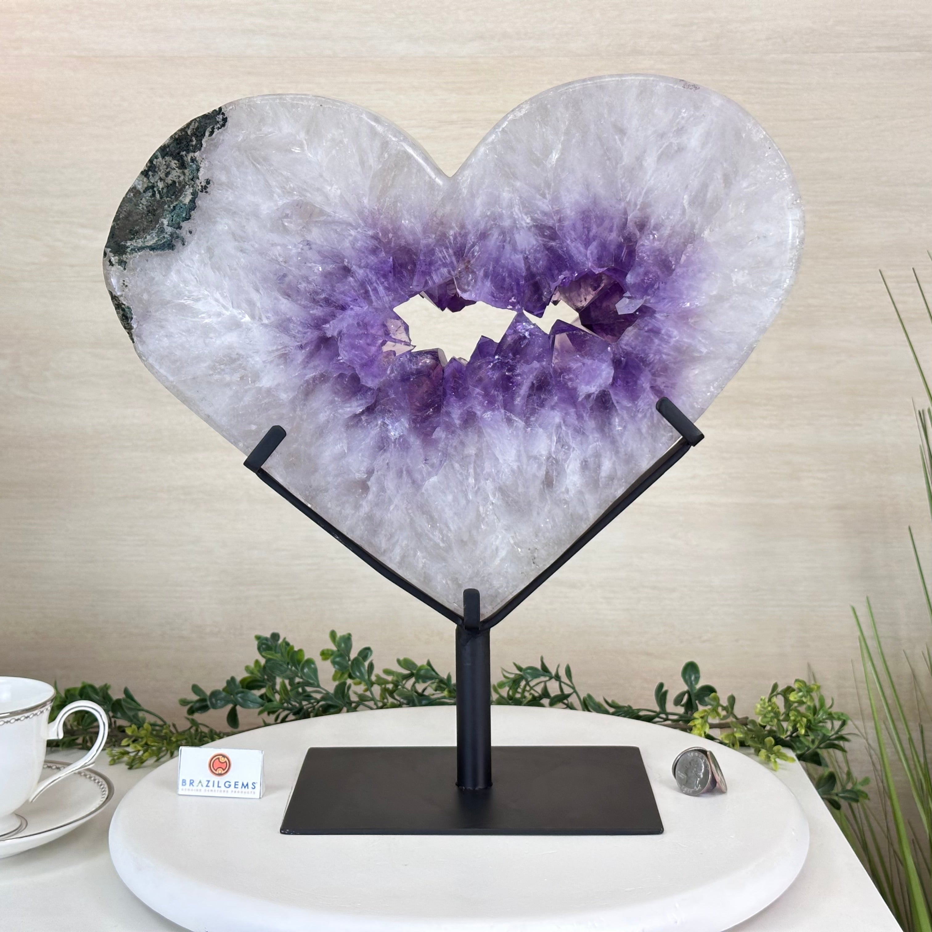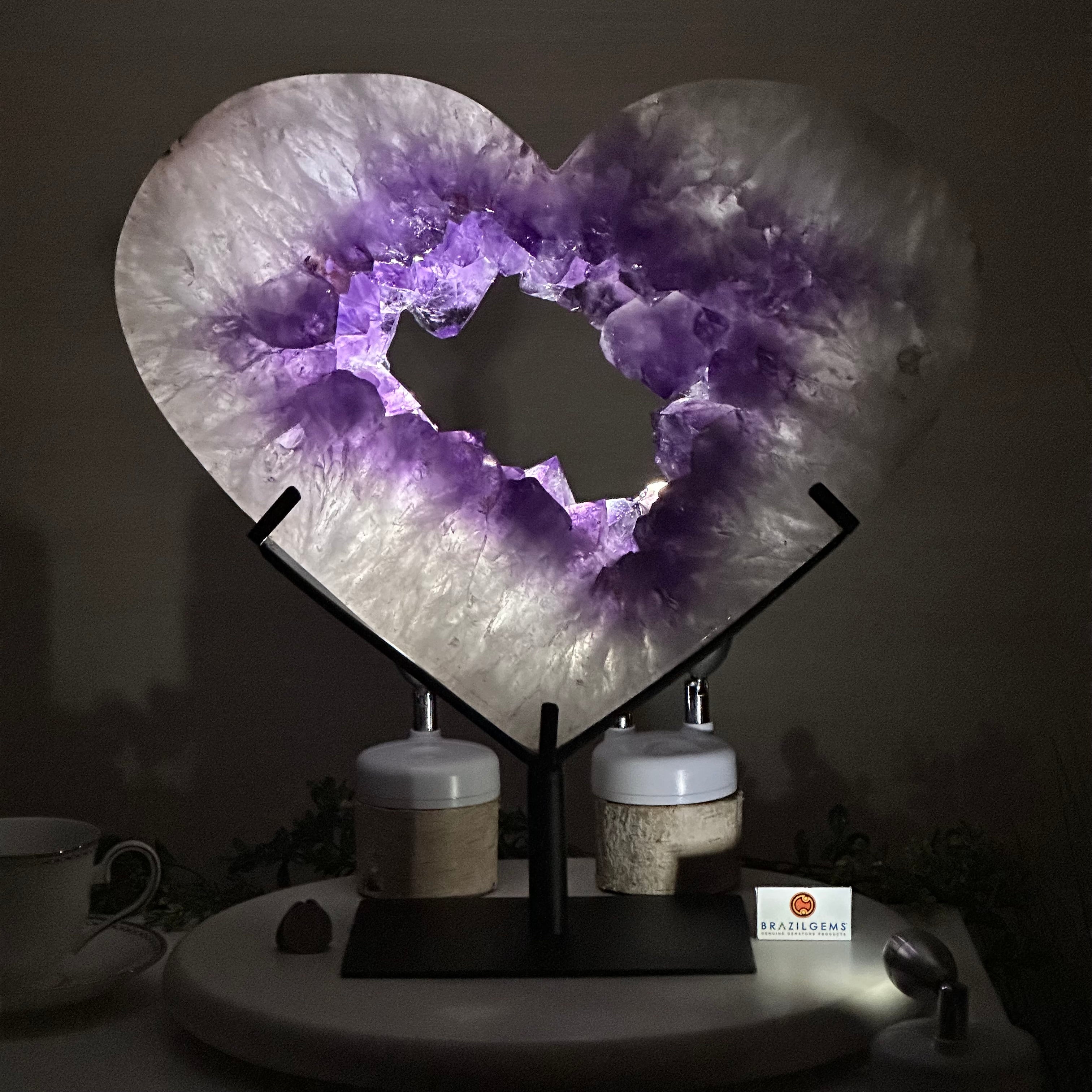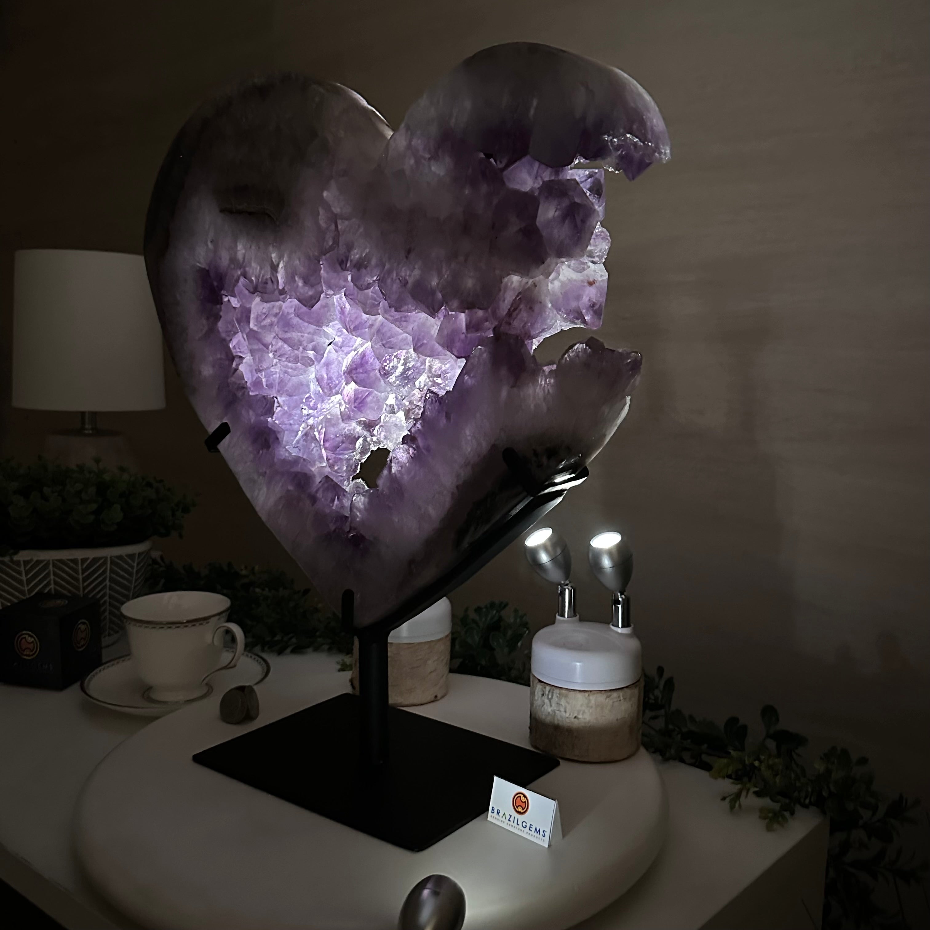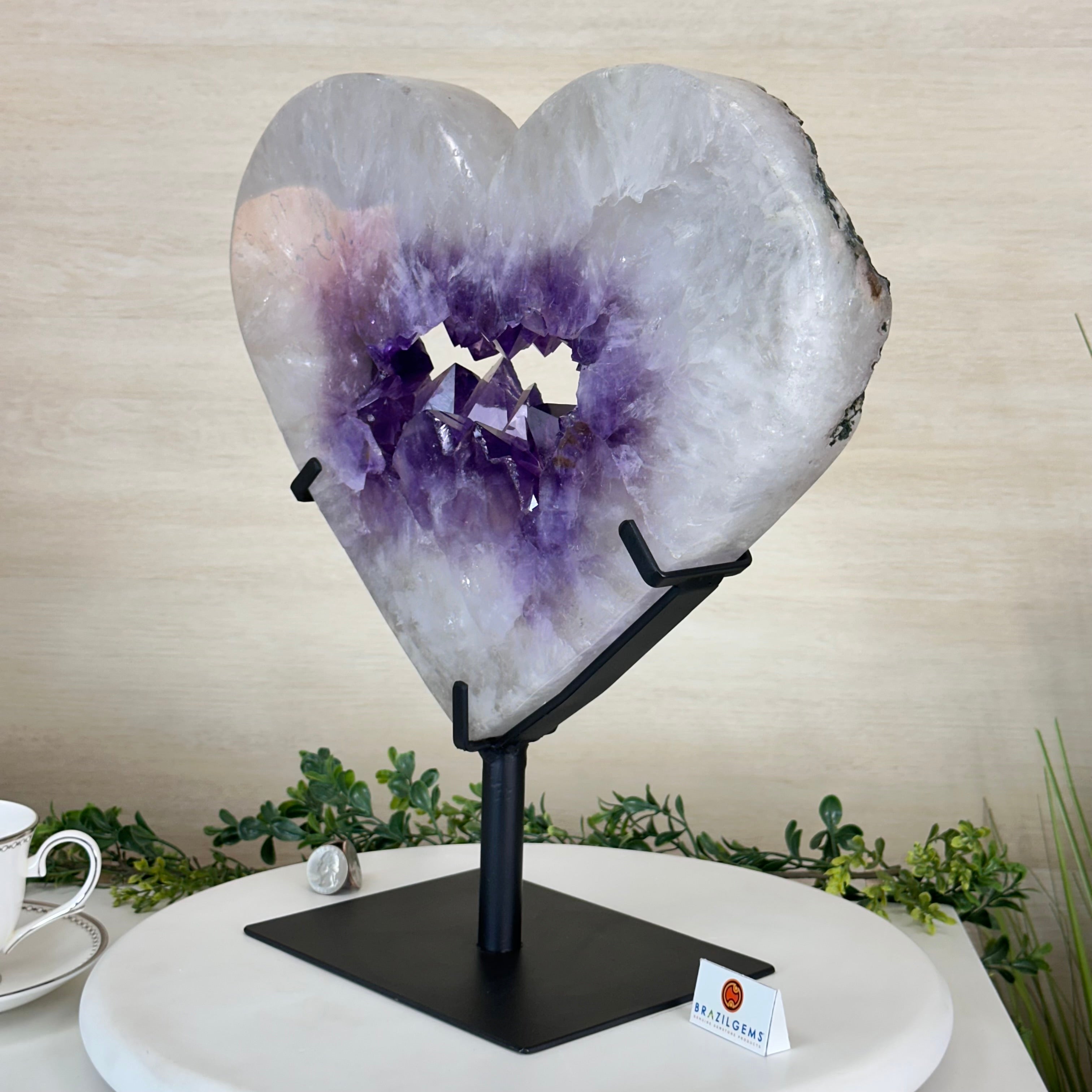 Quality Heart-Shaped Amethyst Geode on a black metal stand. Beautiful gemstones with polished edges and natural rough stone on its backside.