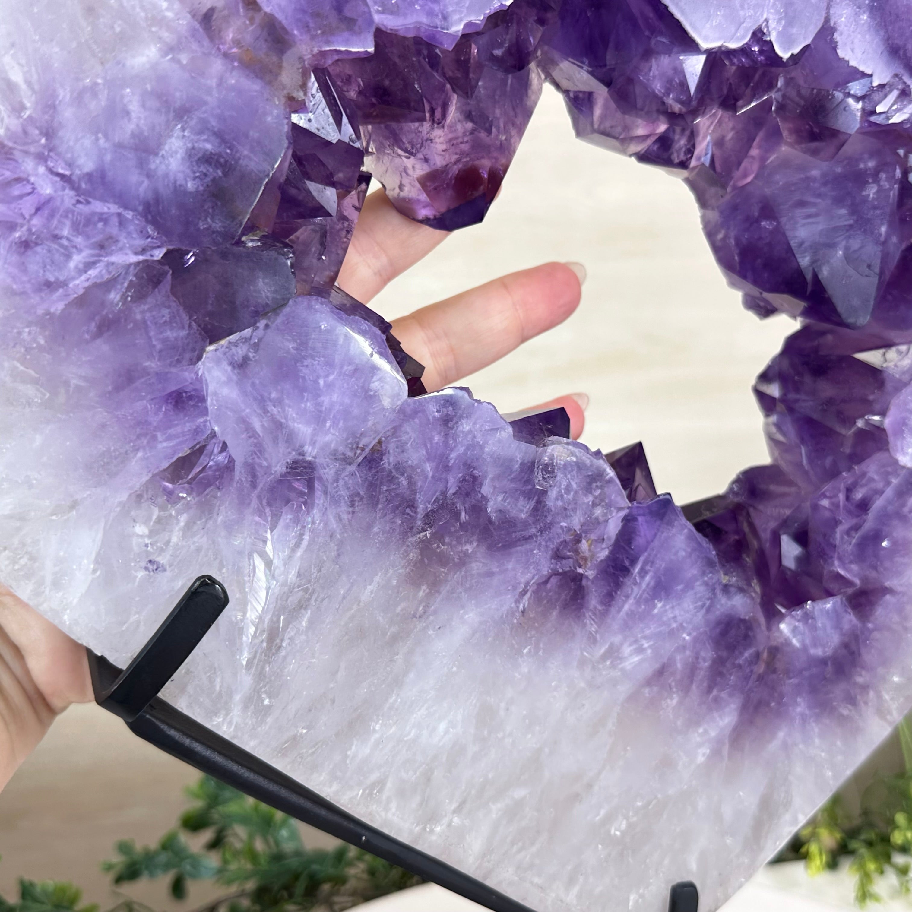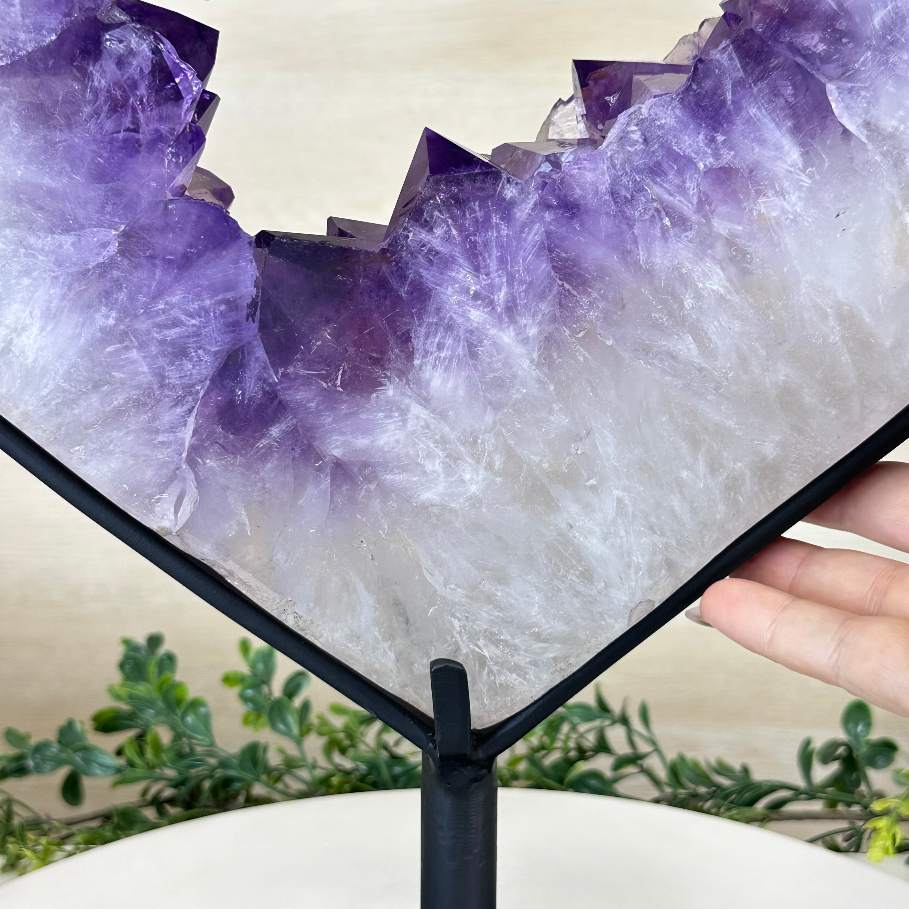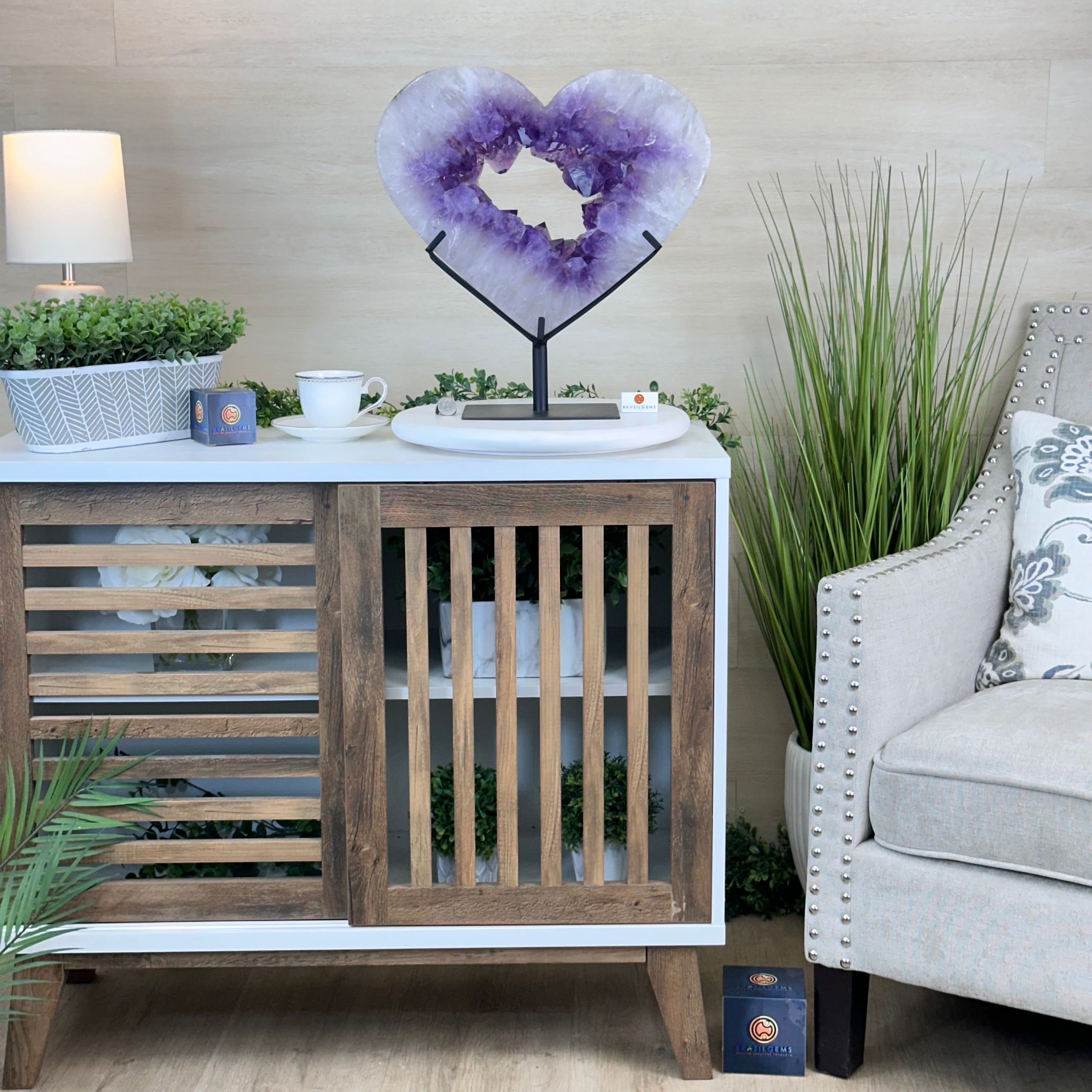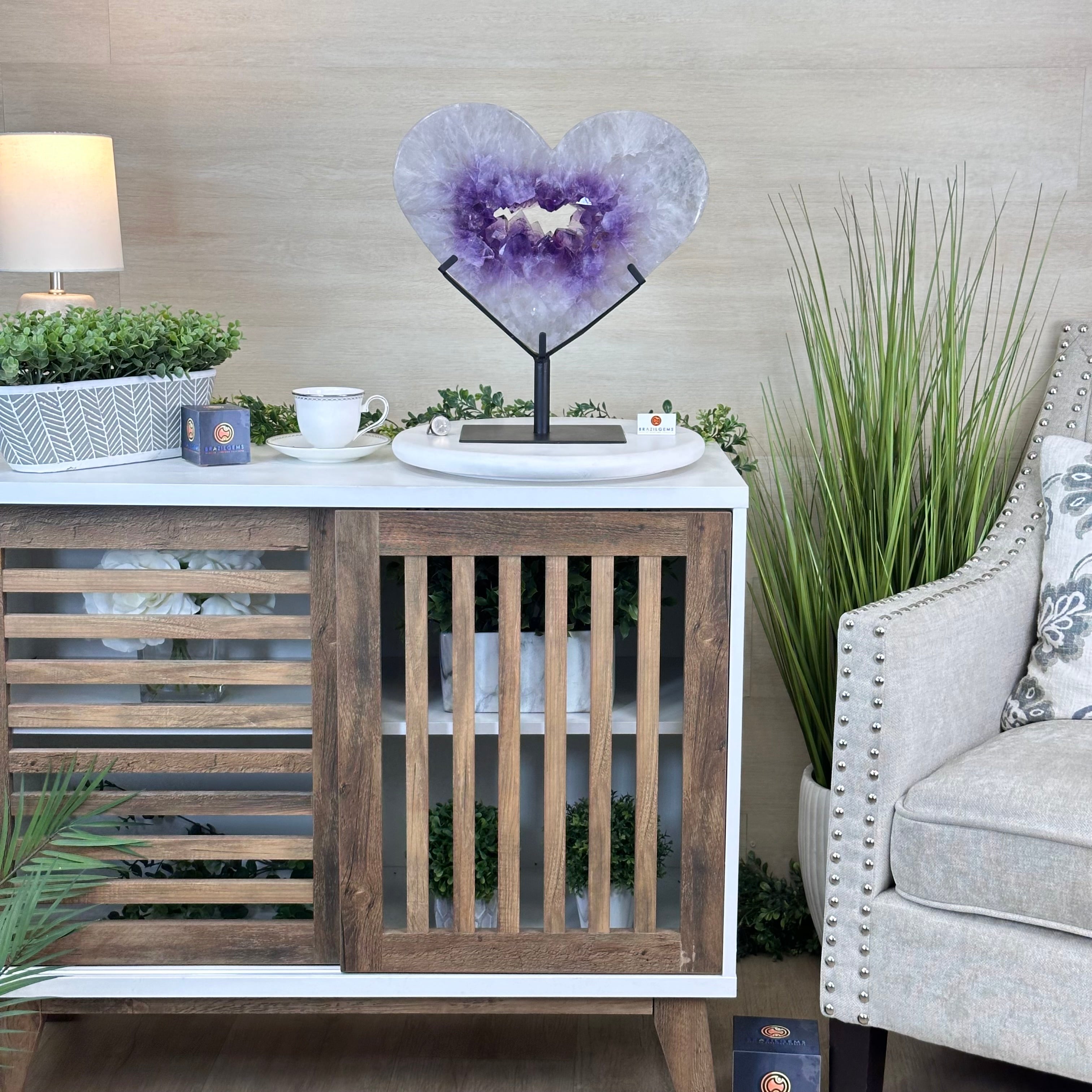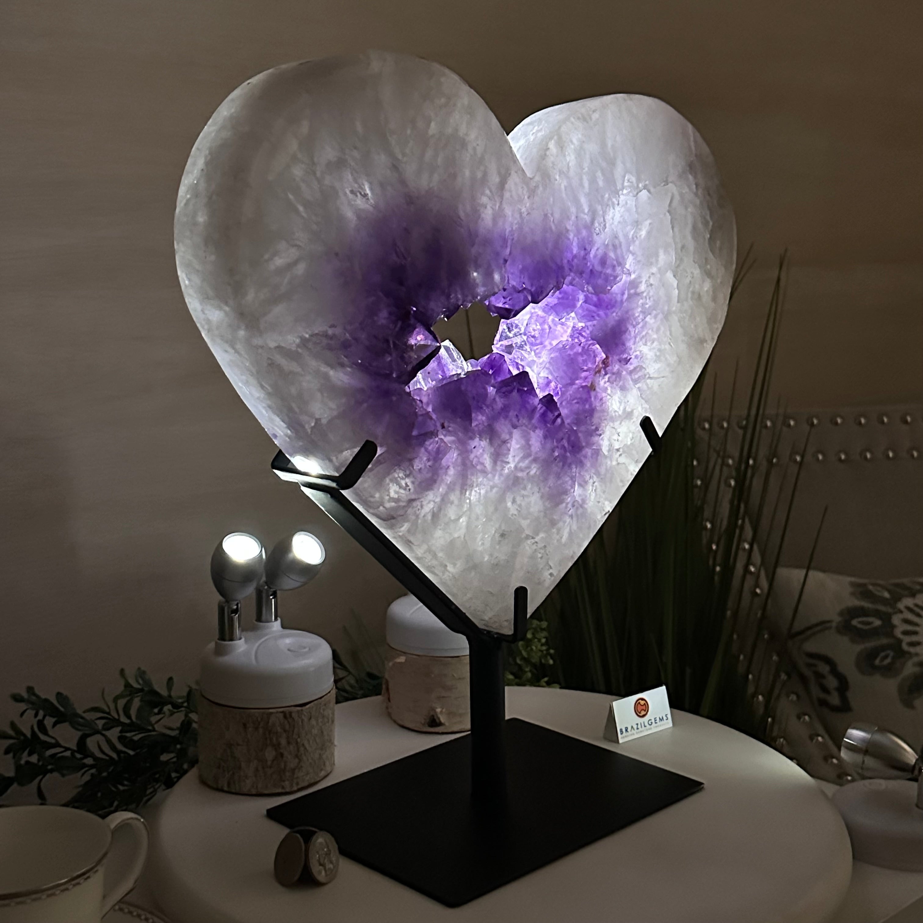 Quality Heart-Shaped Amethyst Geode on a black metal stand. Beautiful gemstones with polished edges and natural rough stone on its backside.
