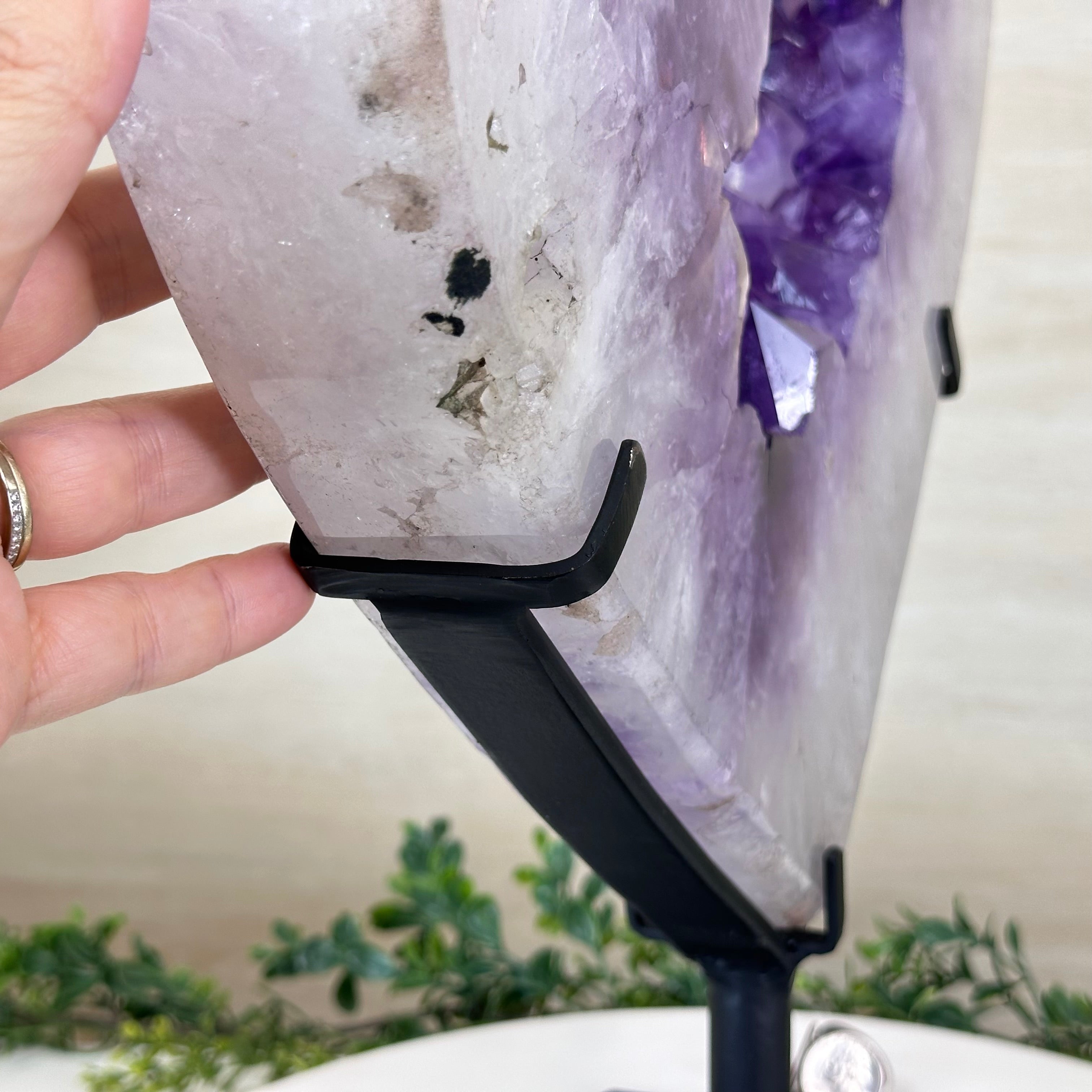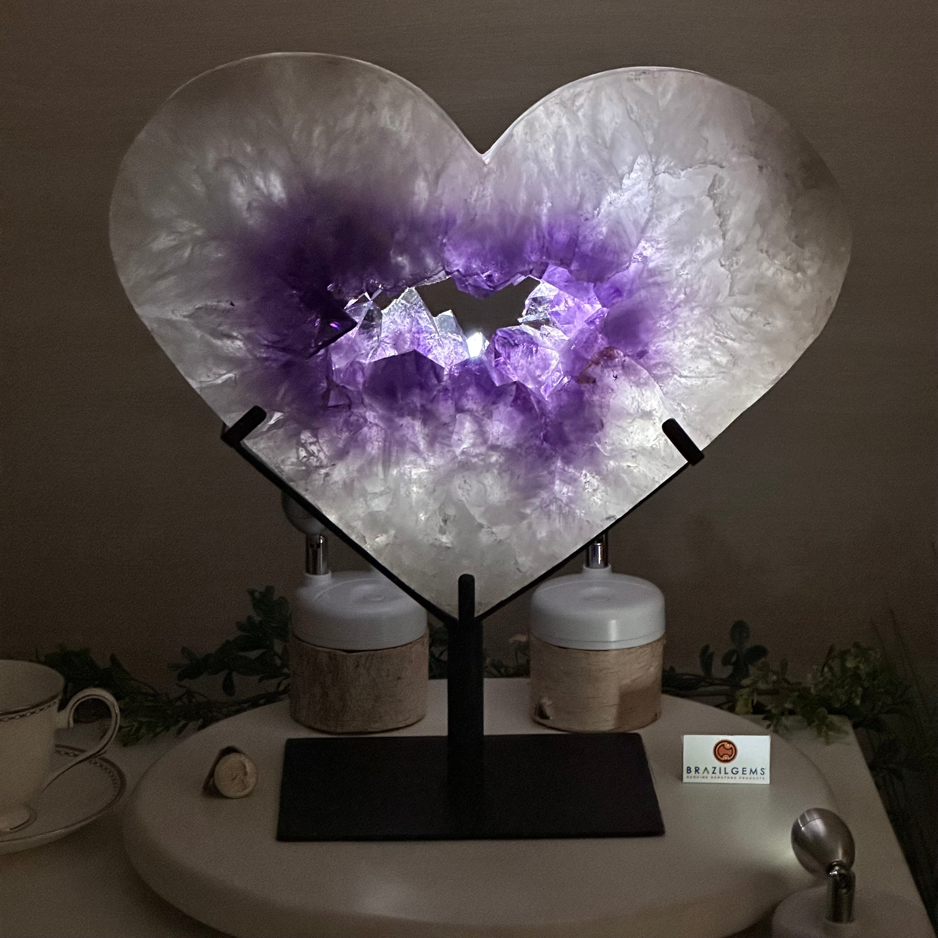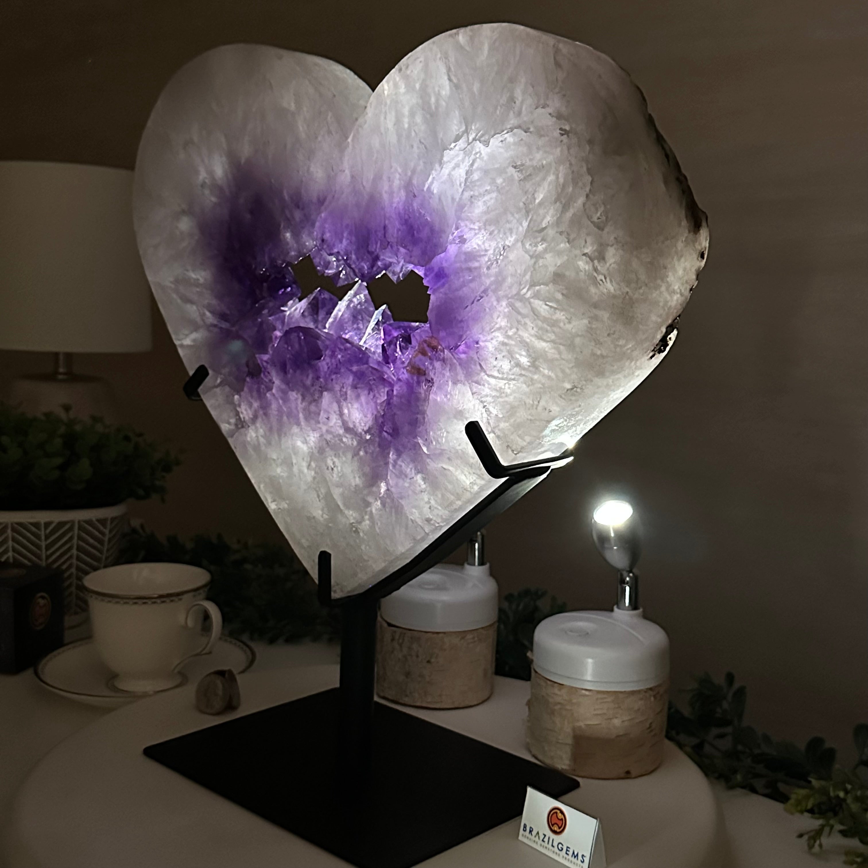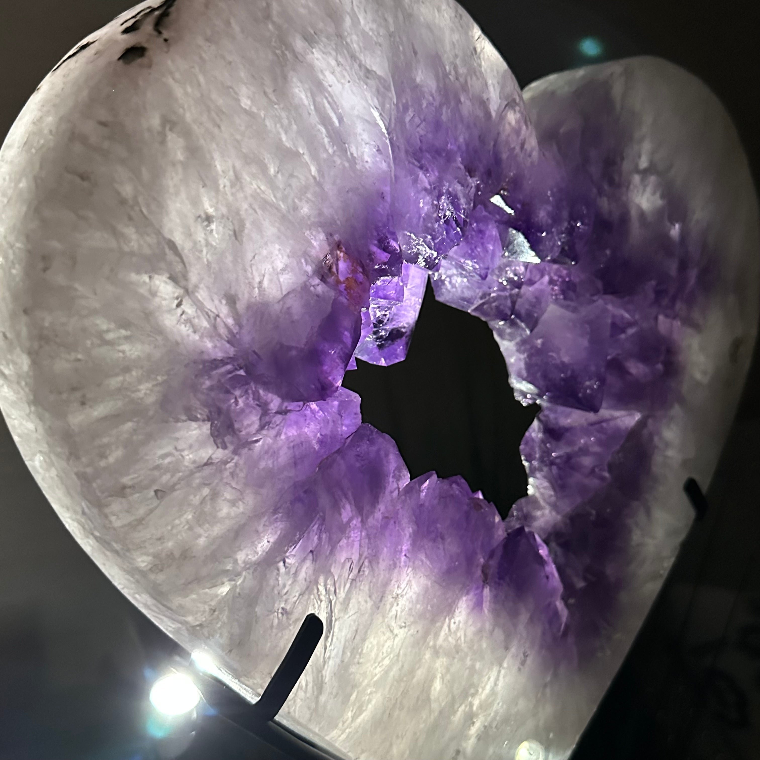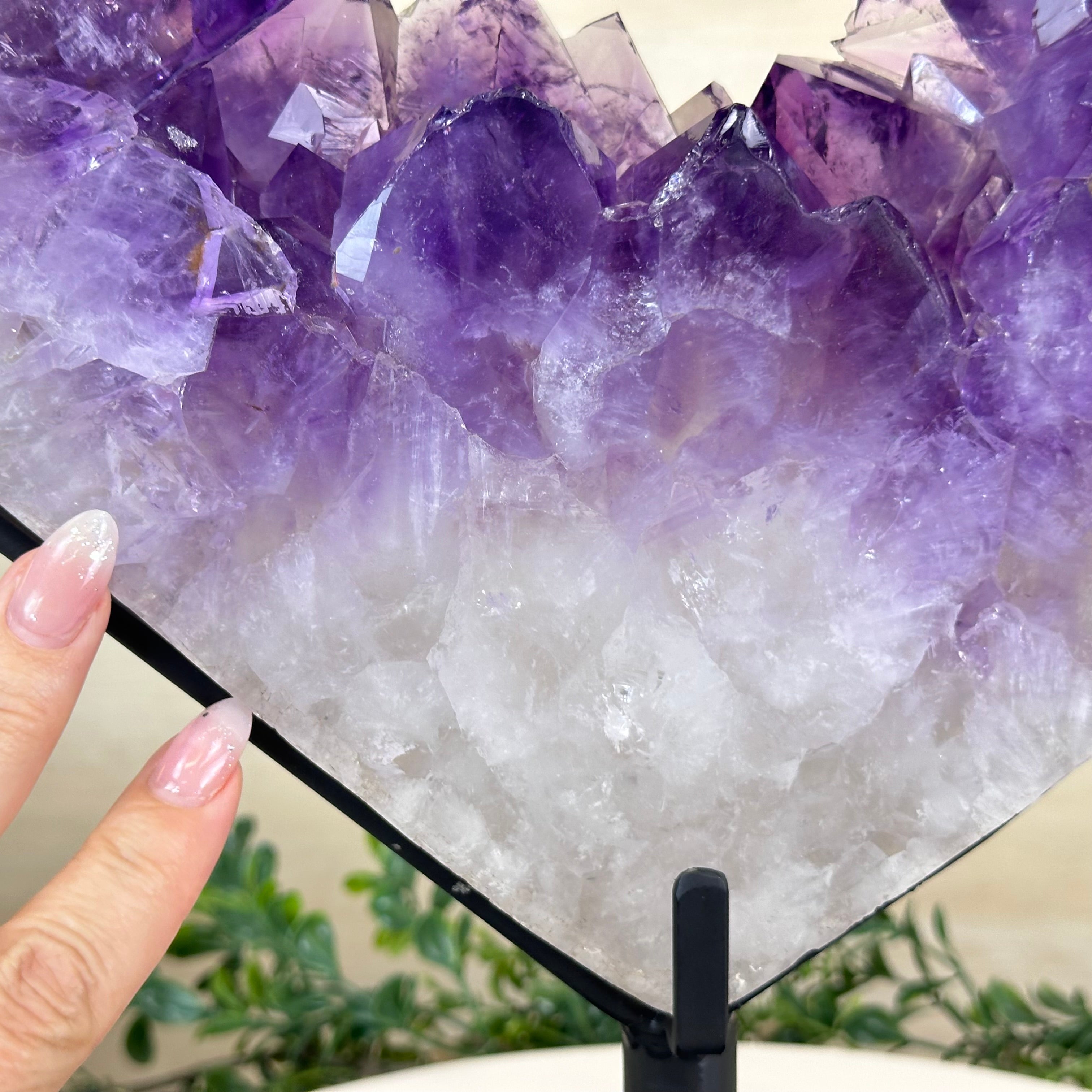 Quality Heart-Shaped Amethyst Geode on a black metal stand. Beautiful gemstones with polished edges and natural rough stone on its backside.