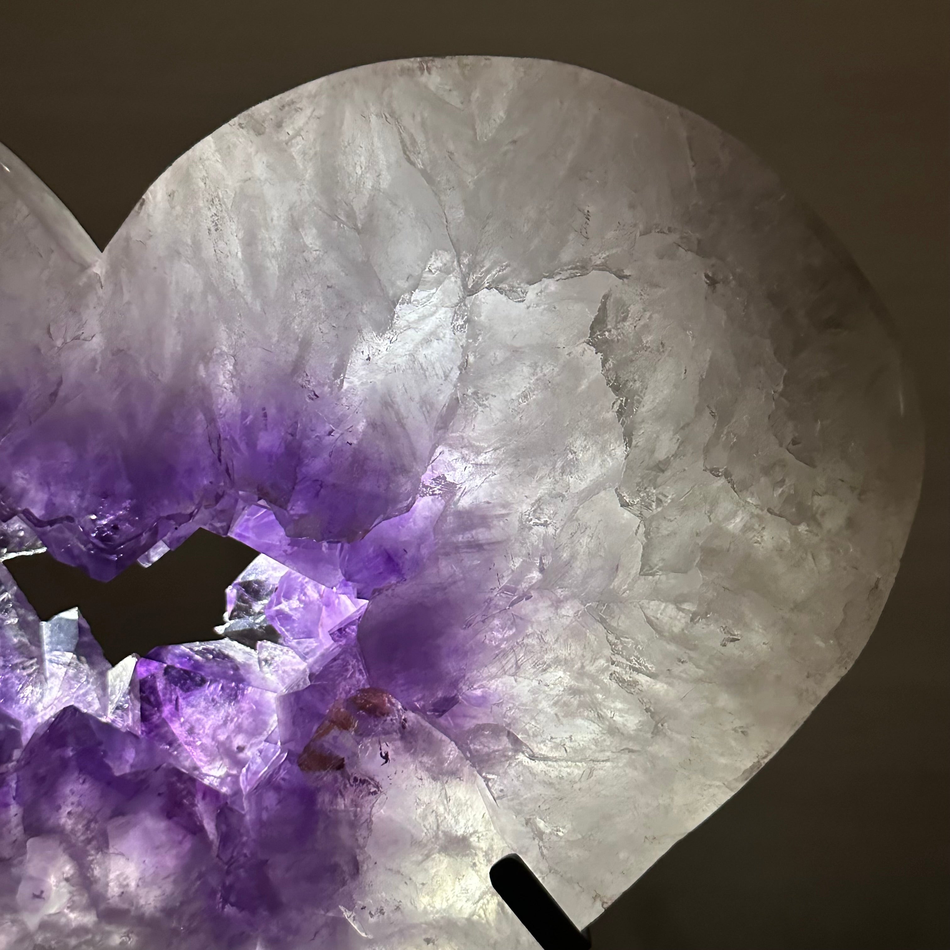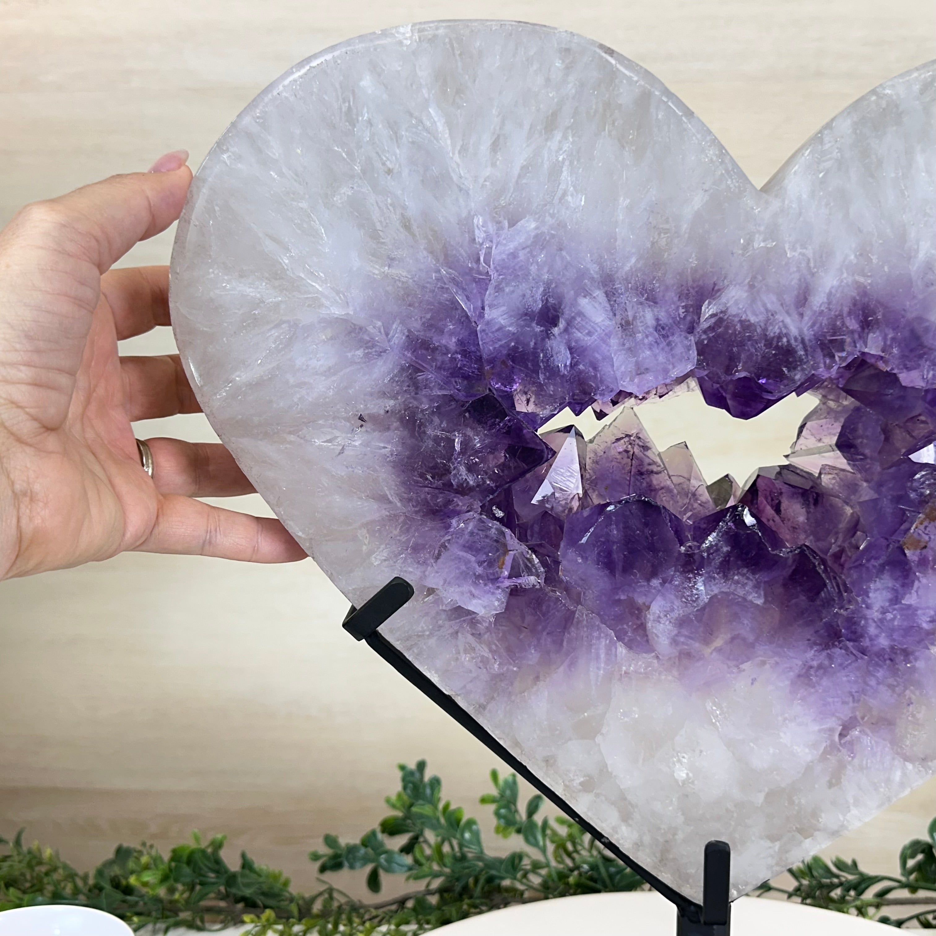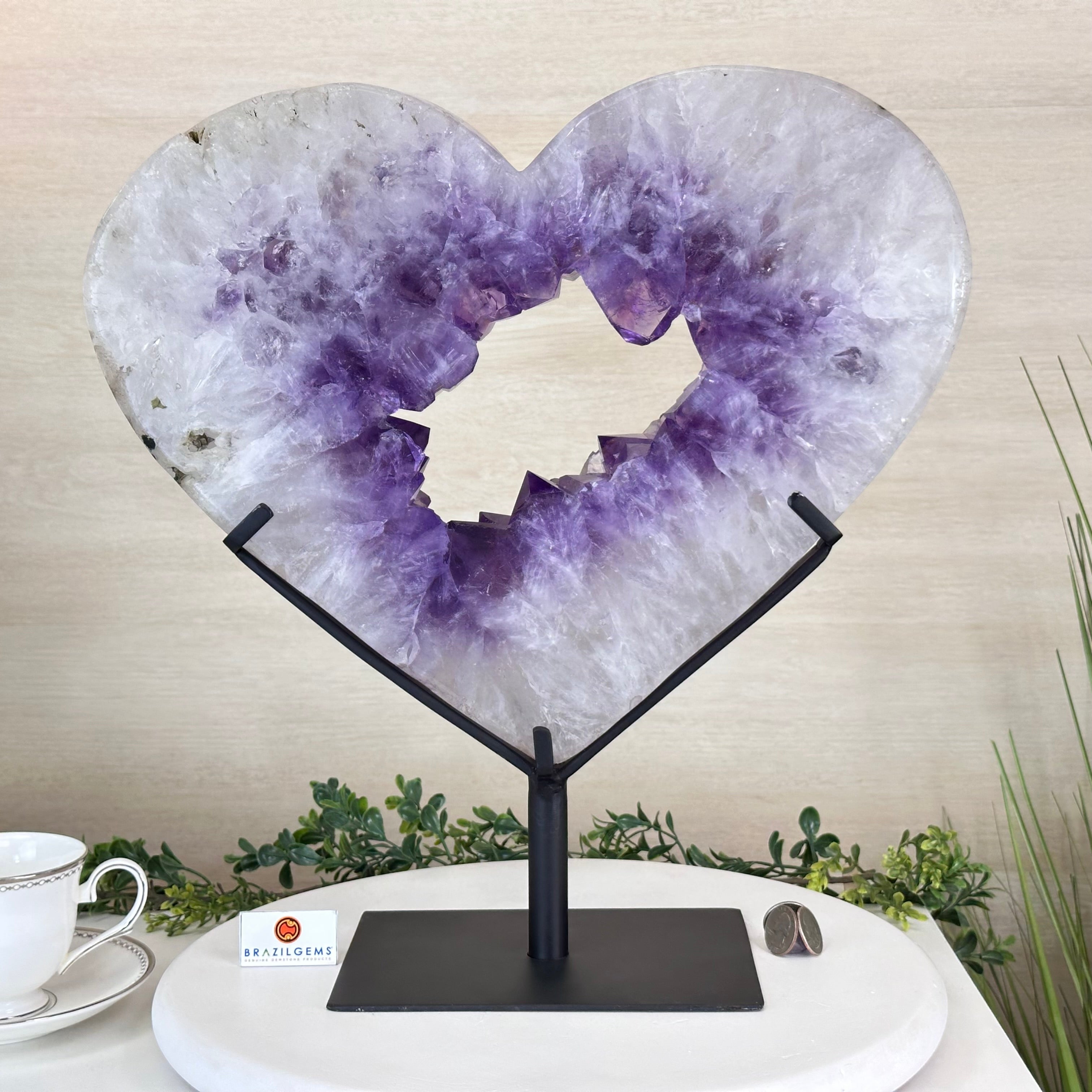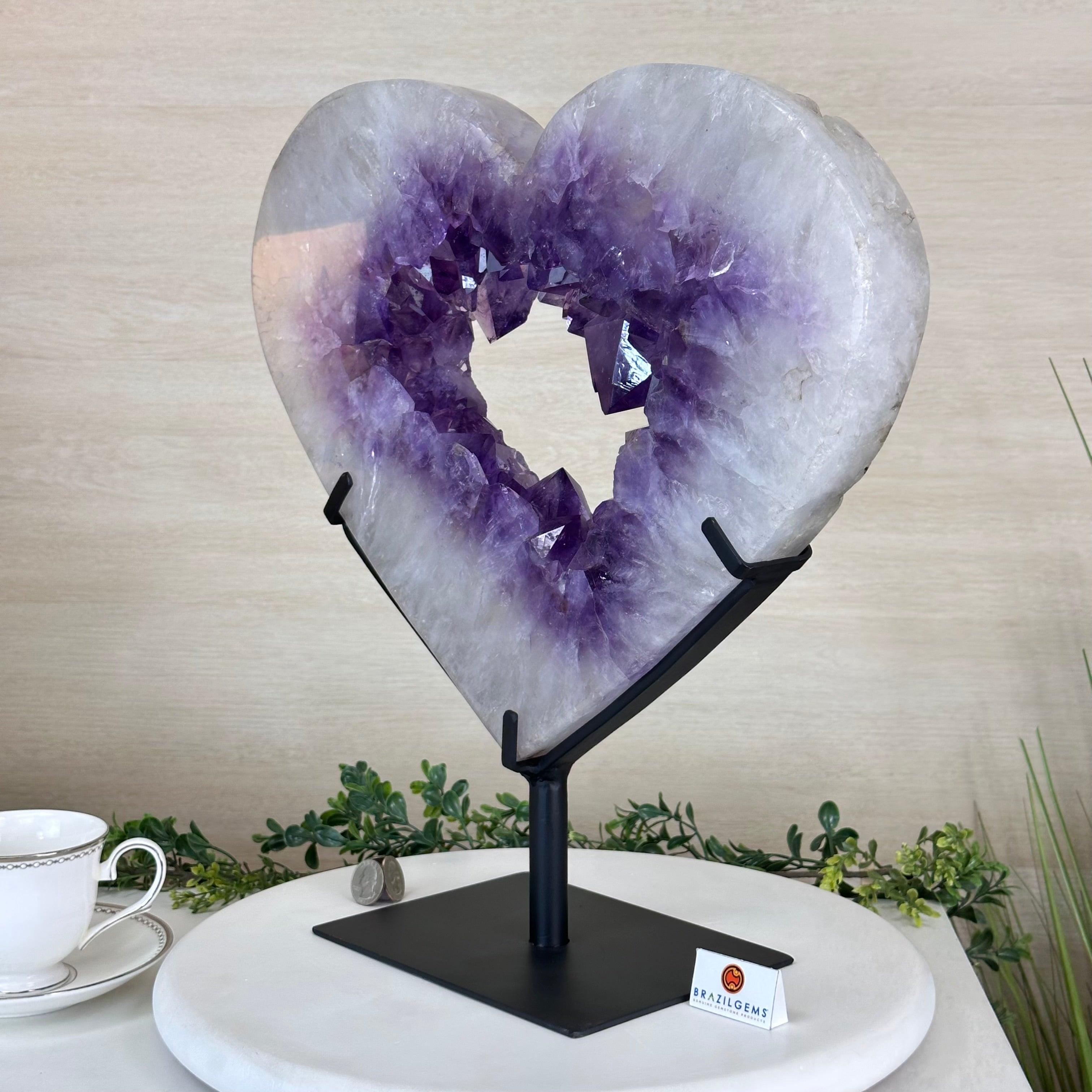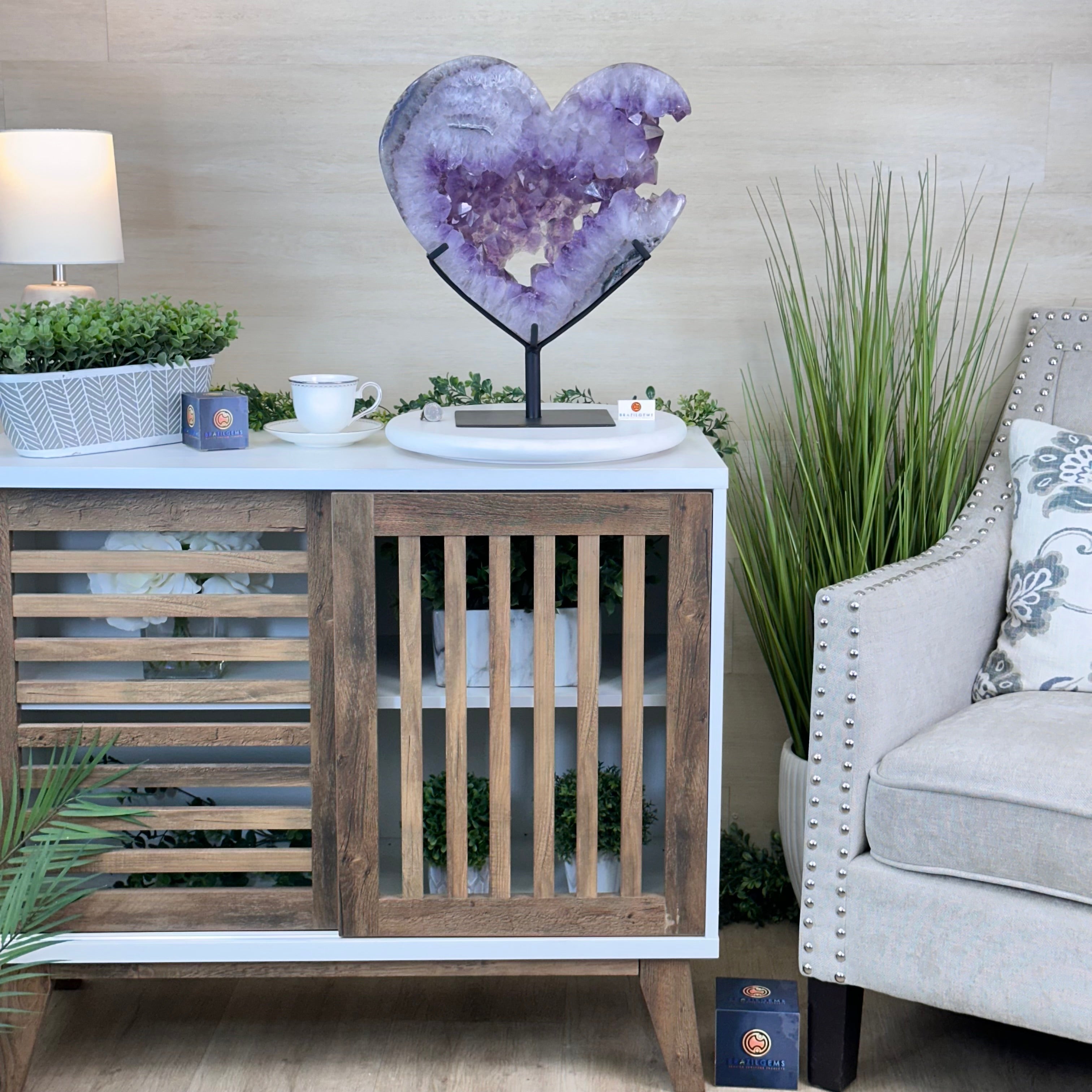 Quality Heart-Shaped Amethyst Geode on a black metal stand. Beautiful gemstones with polished edges and natural rough stone on its backside.
