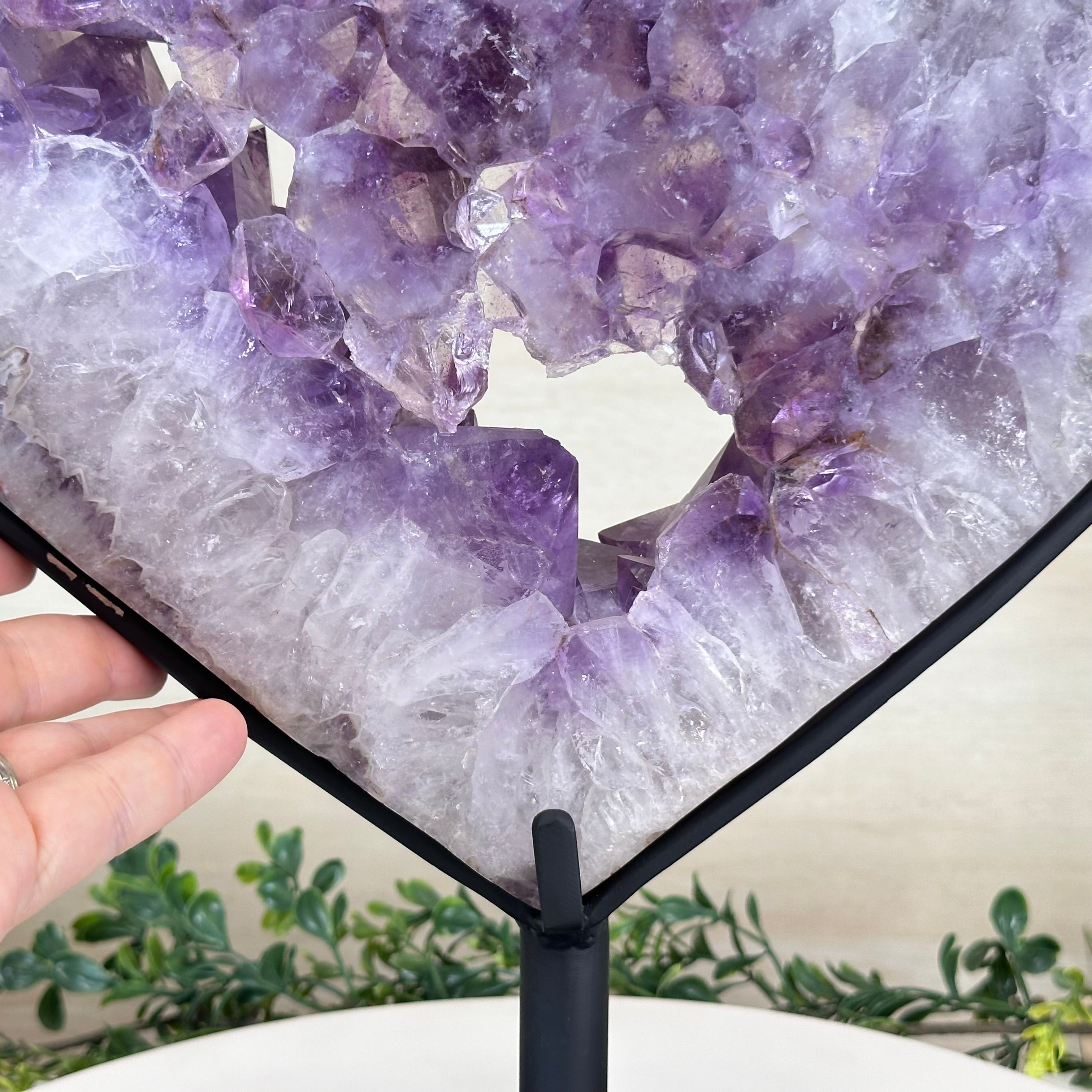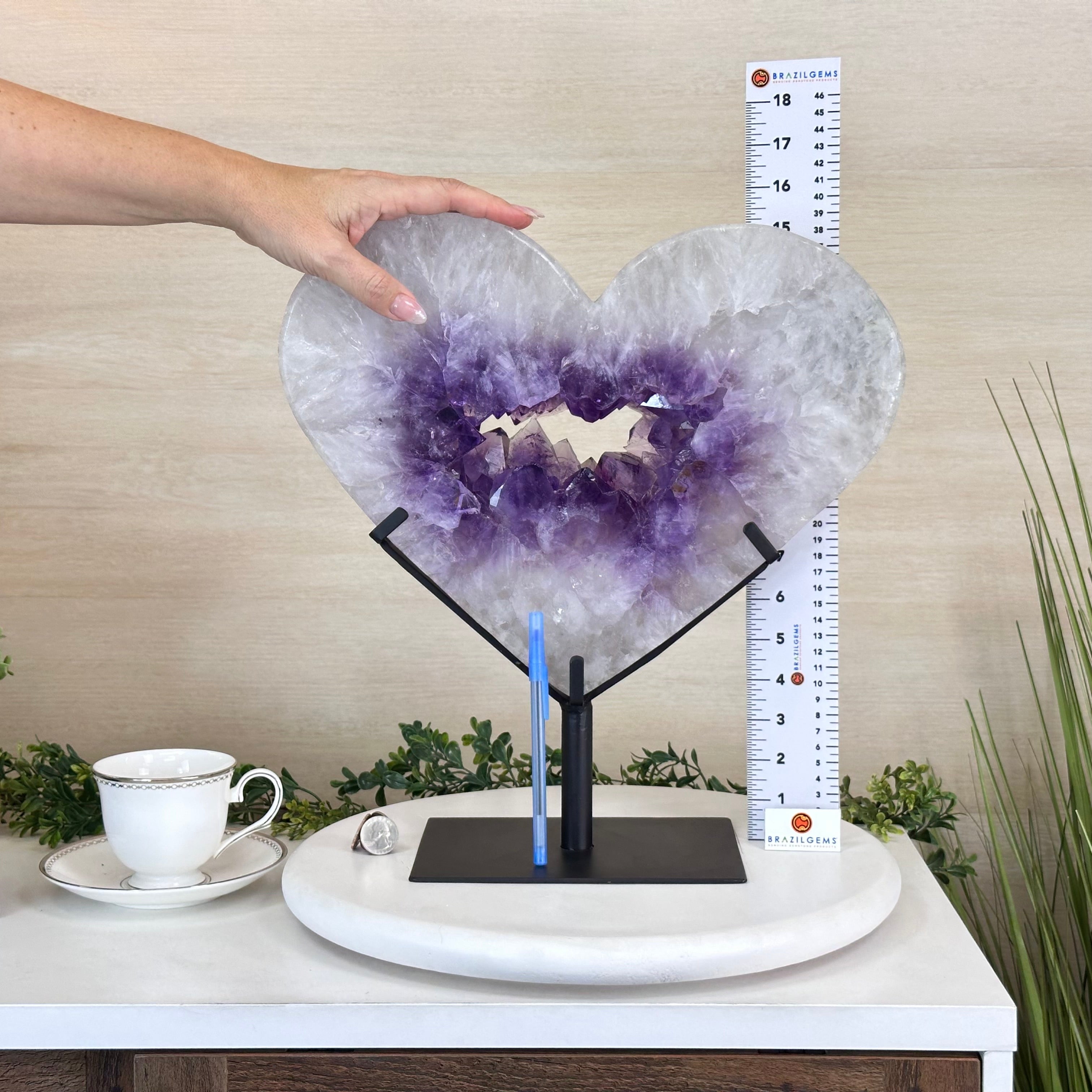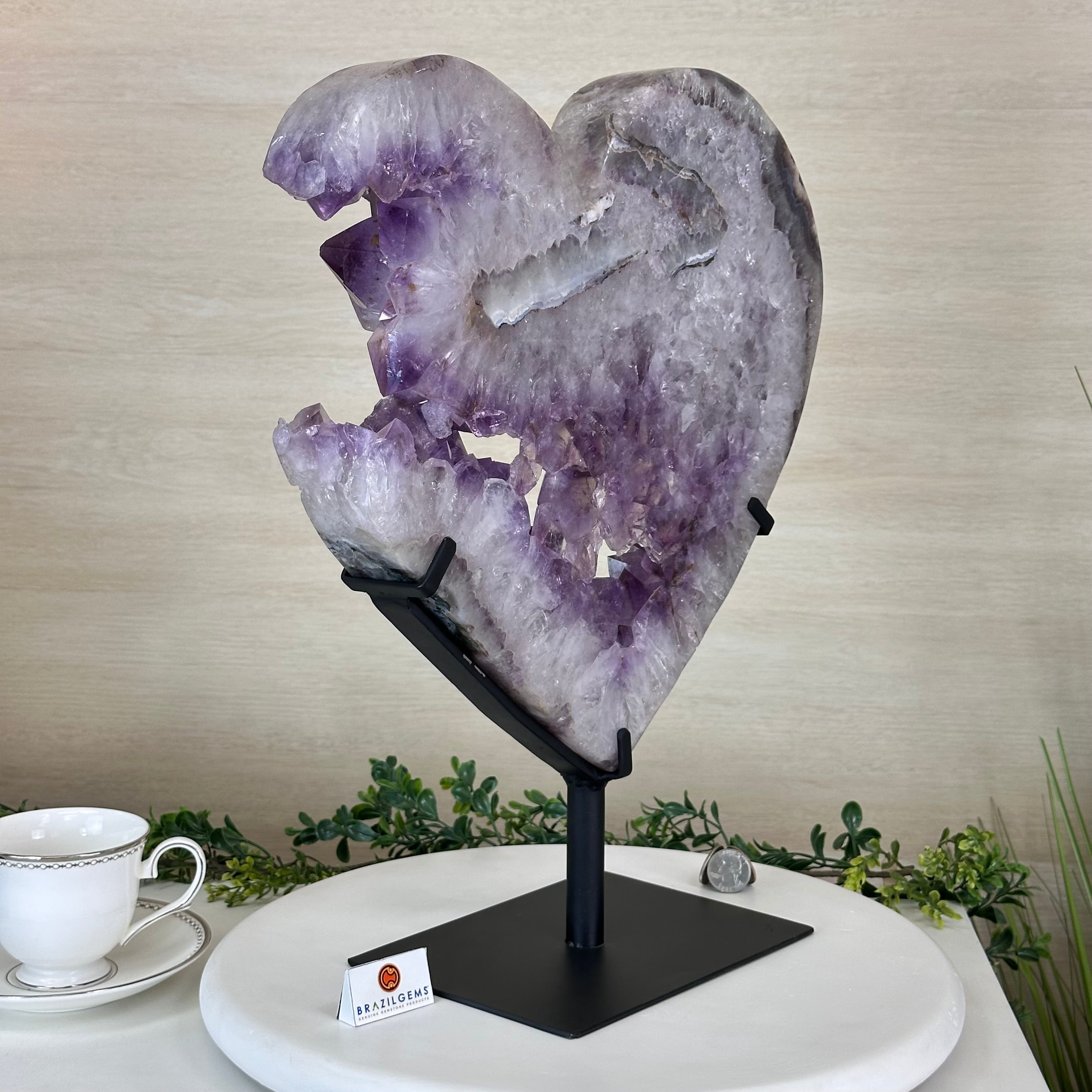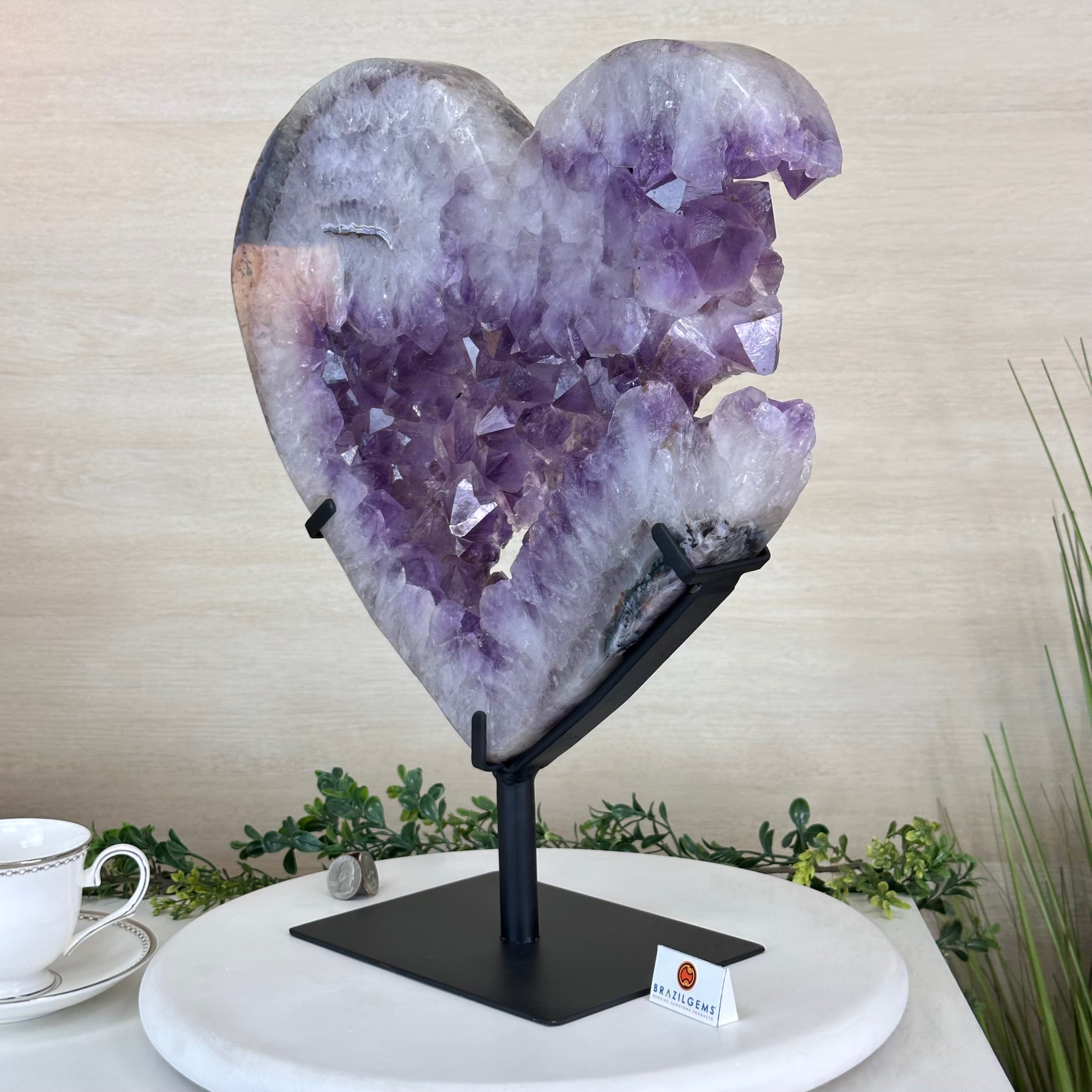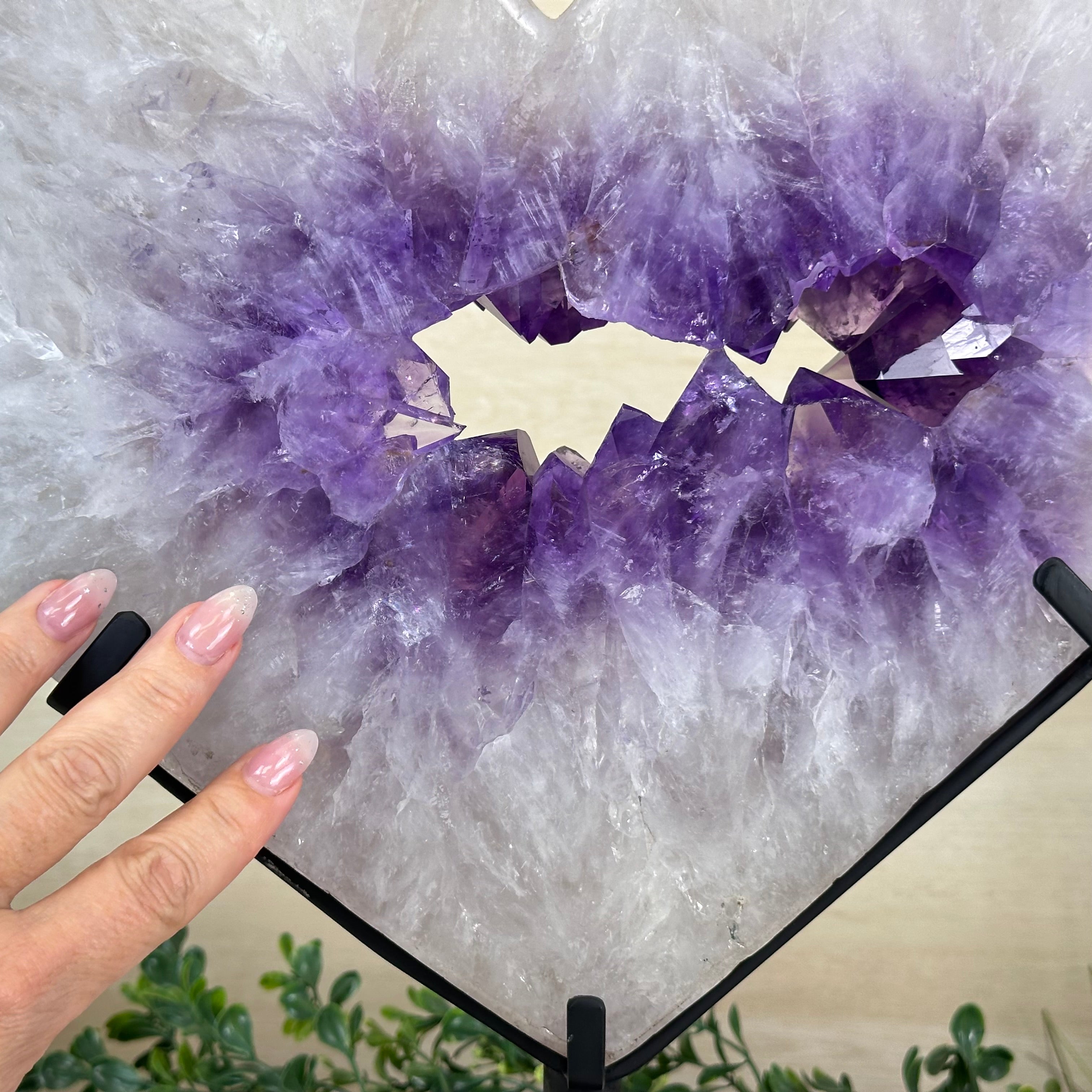 Quality Heart-Shaped Amethyst Geode on a black metal stand. Beautiful gemstones with polished edges and natural rough stone on its backside.