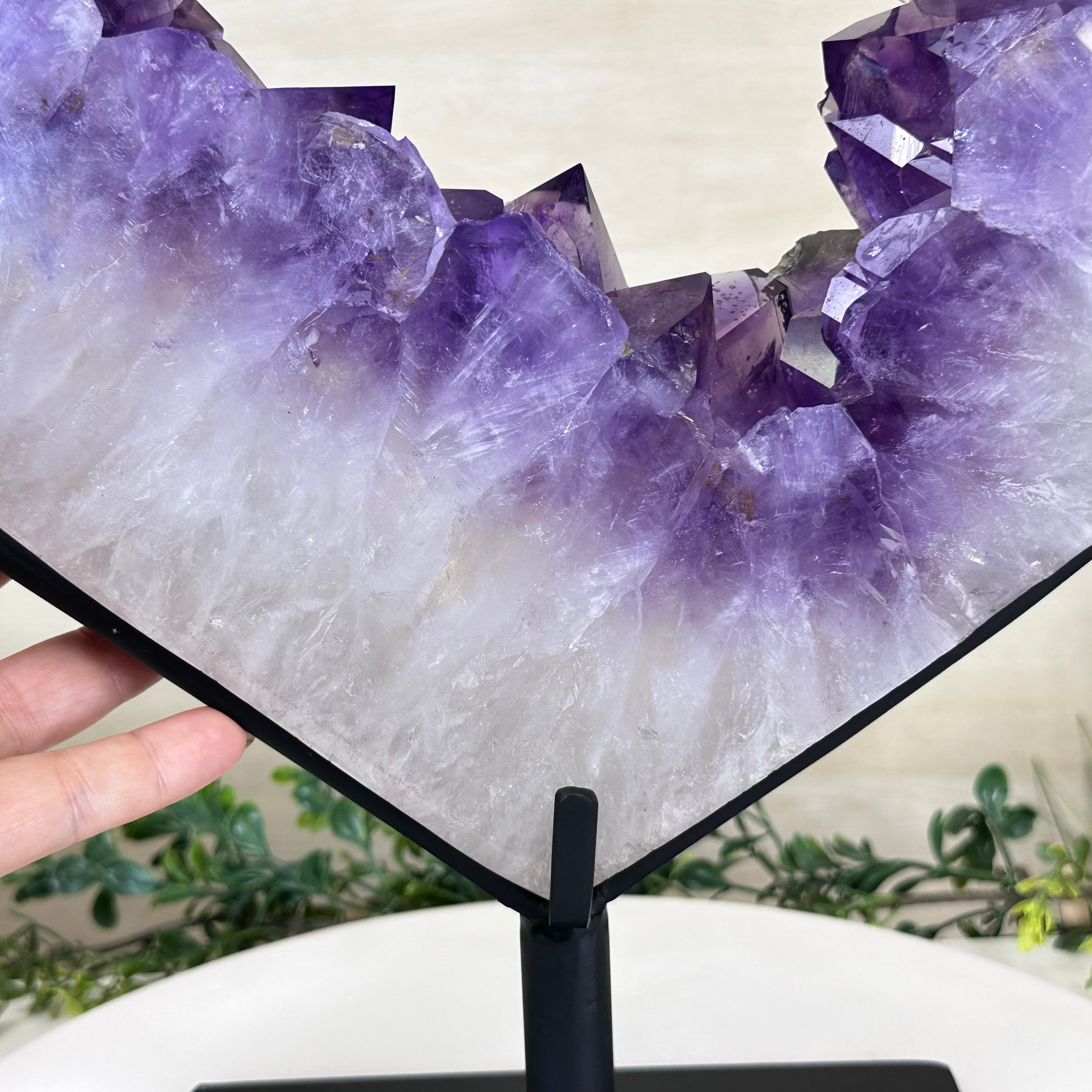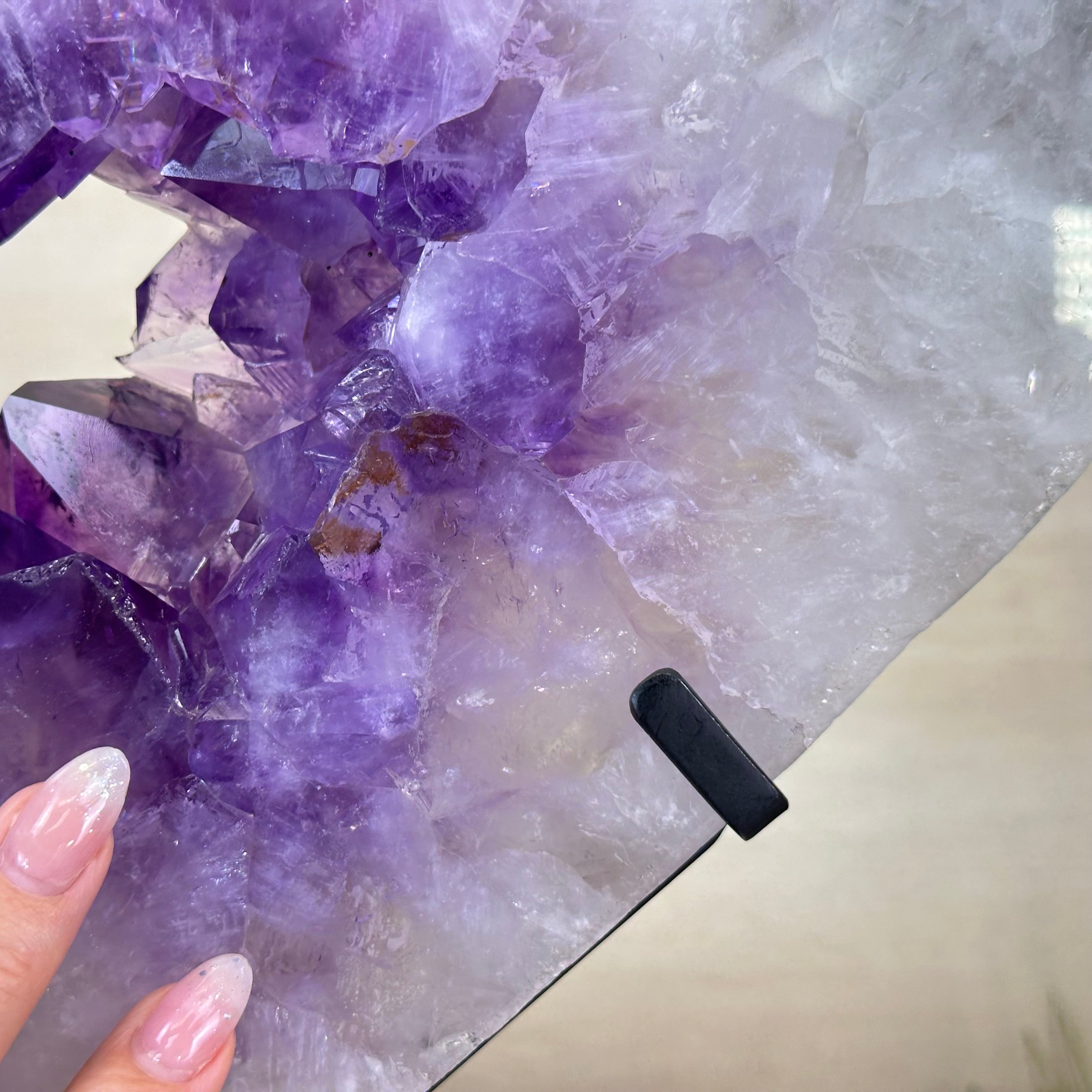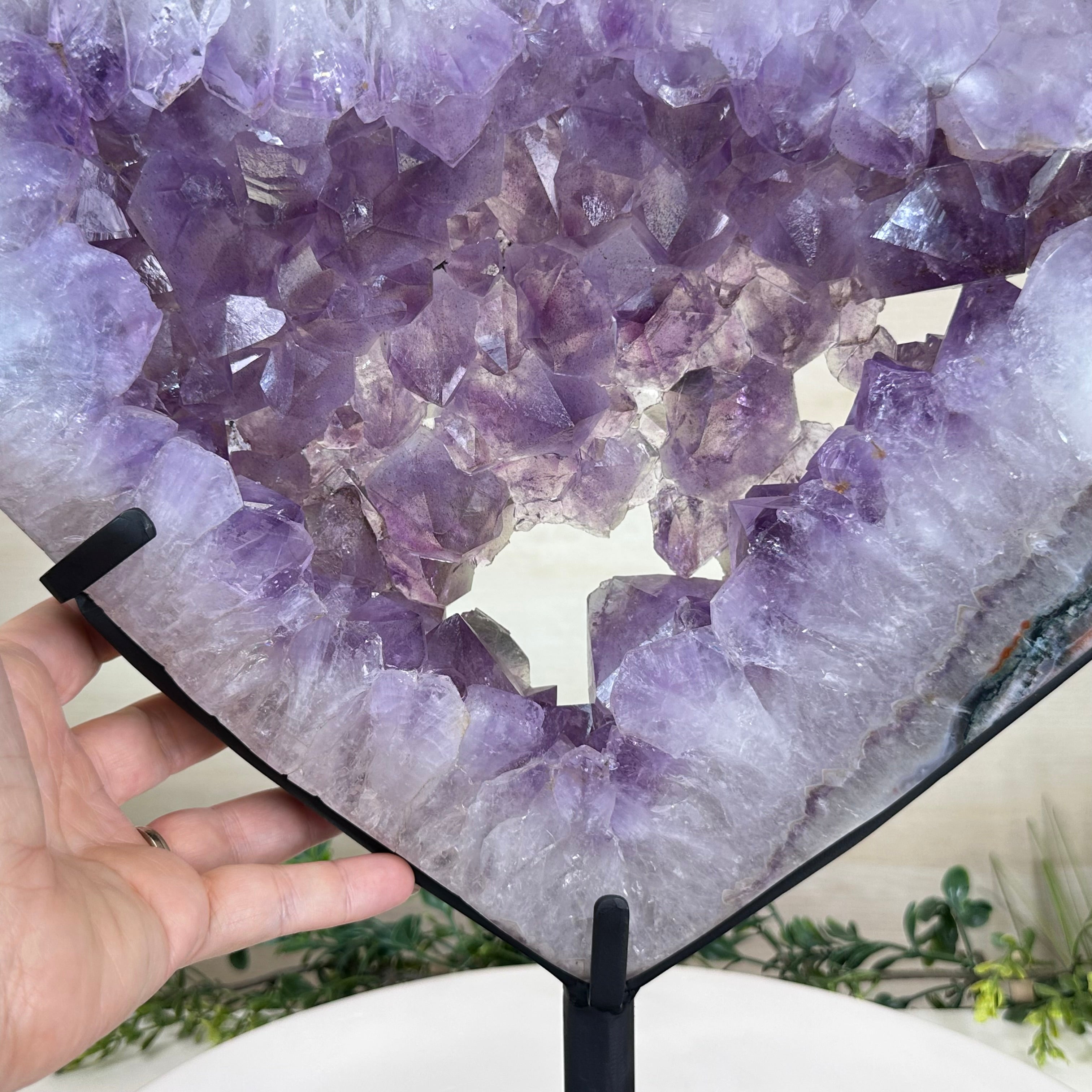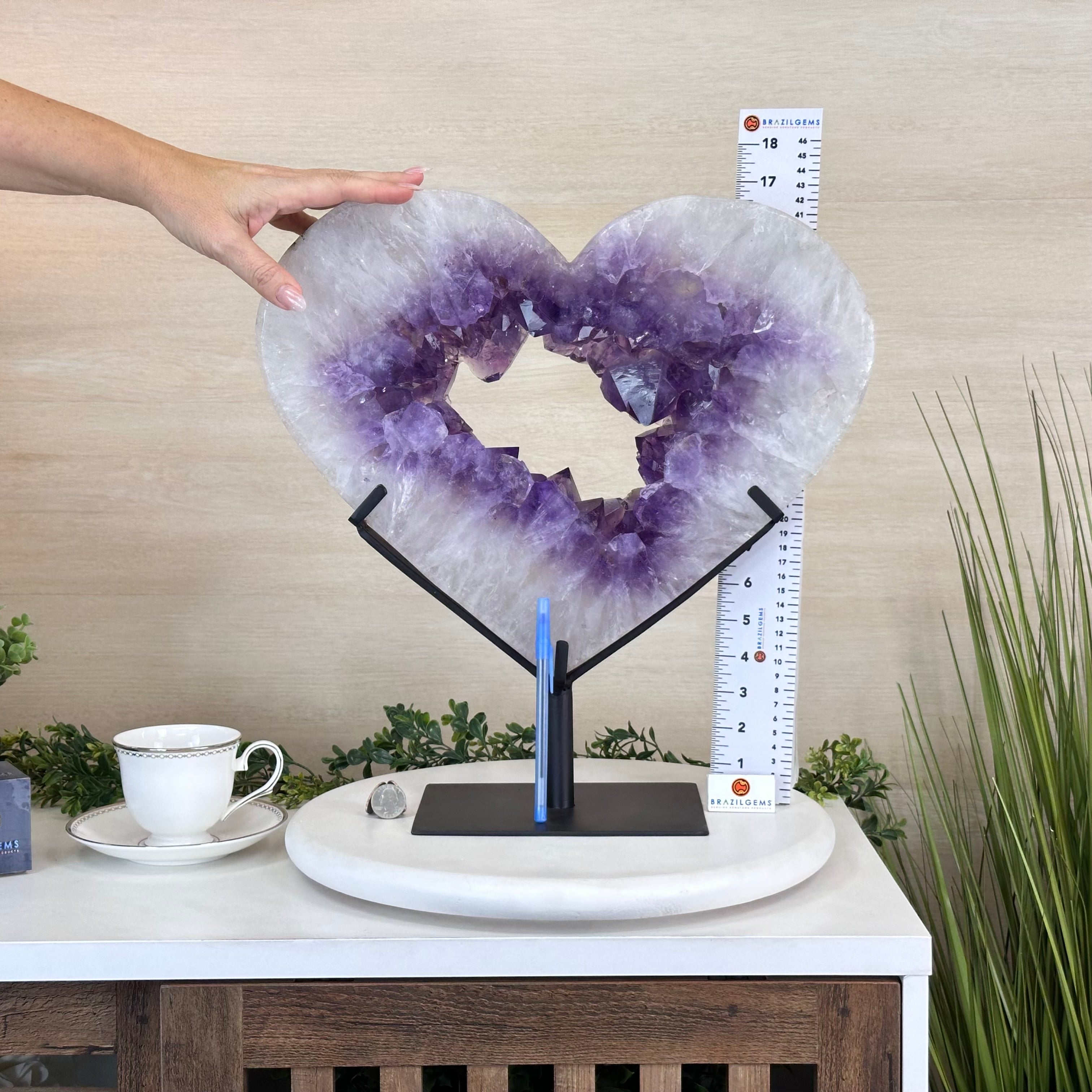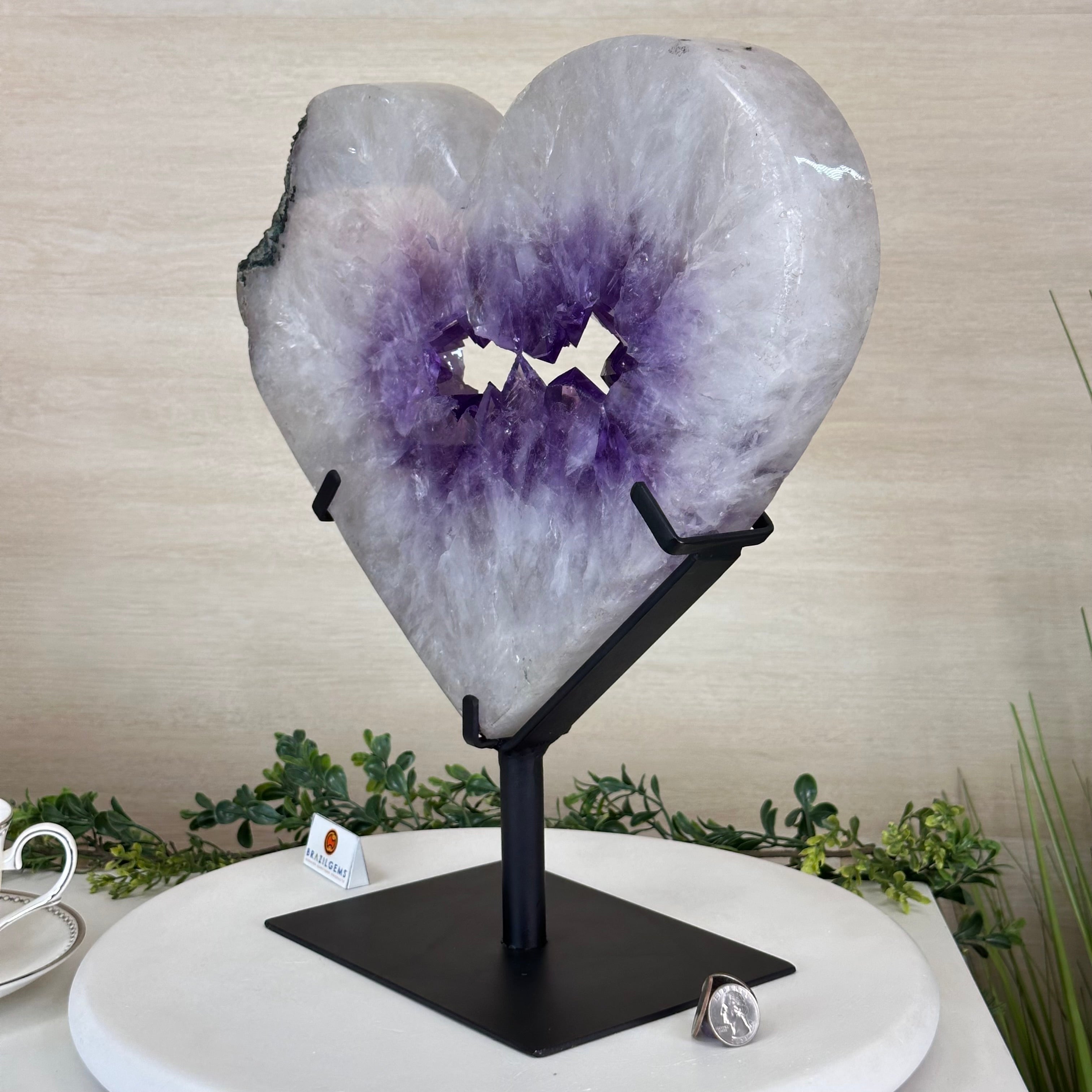 Quality Heart-Shaped Amethyst Geode on a black metal stand. Beautiful gemstones with polished edges and natural rough stone on its backside.