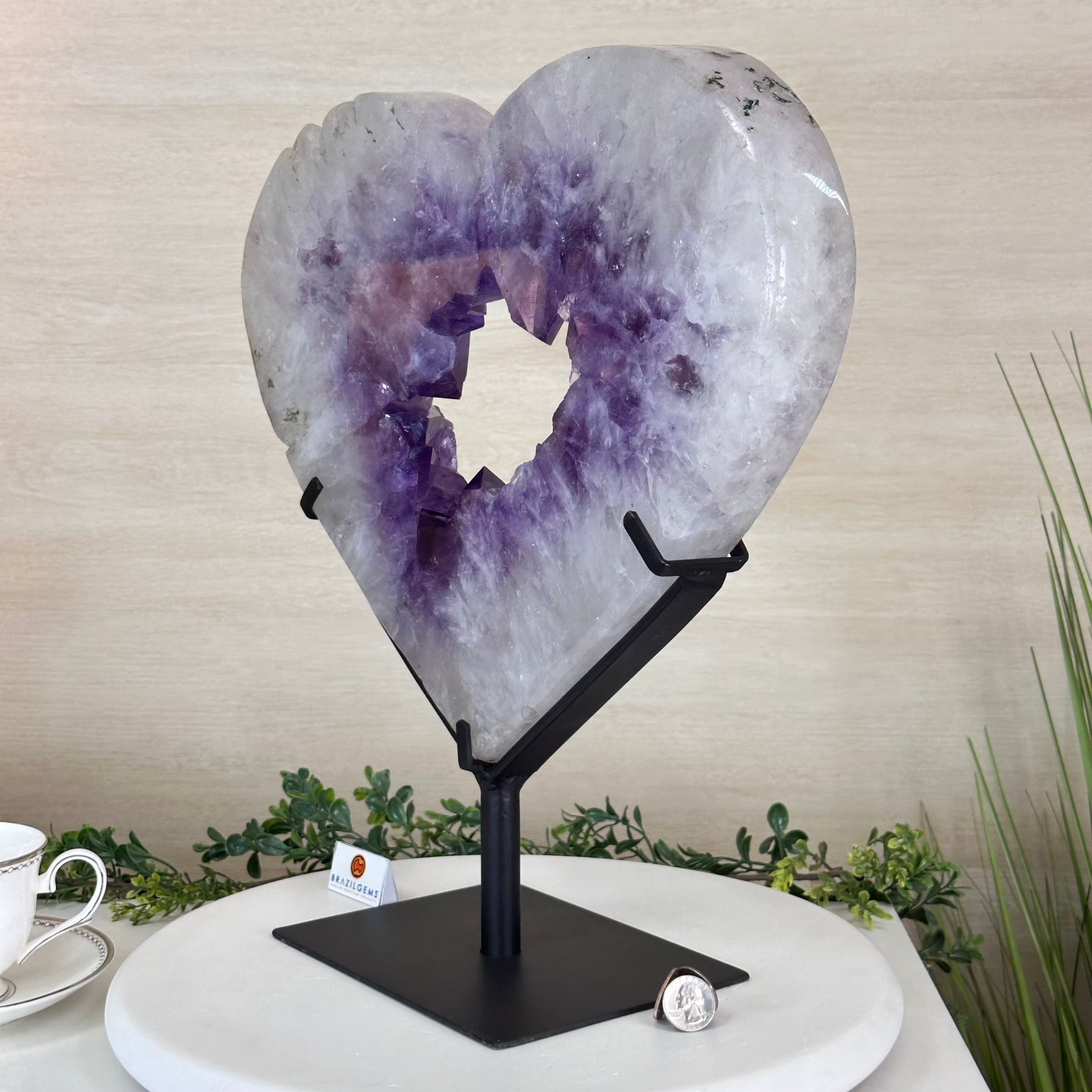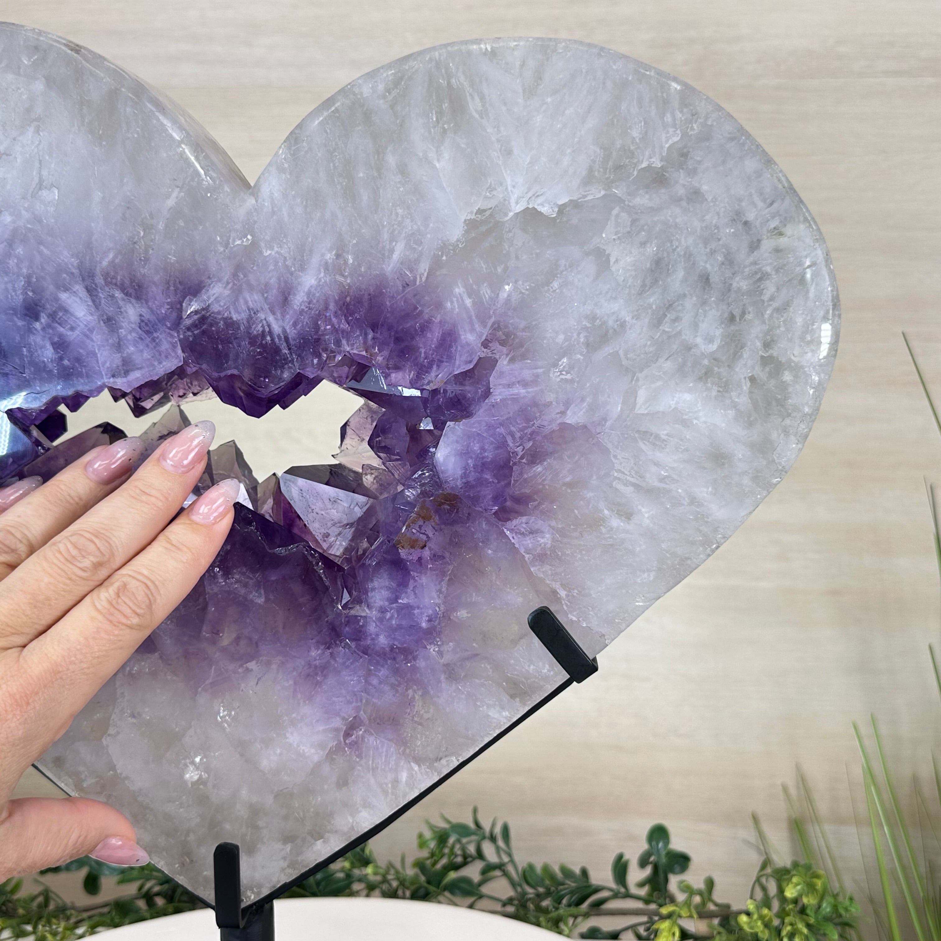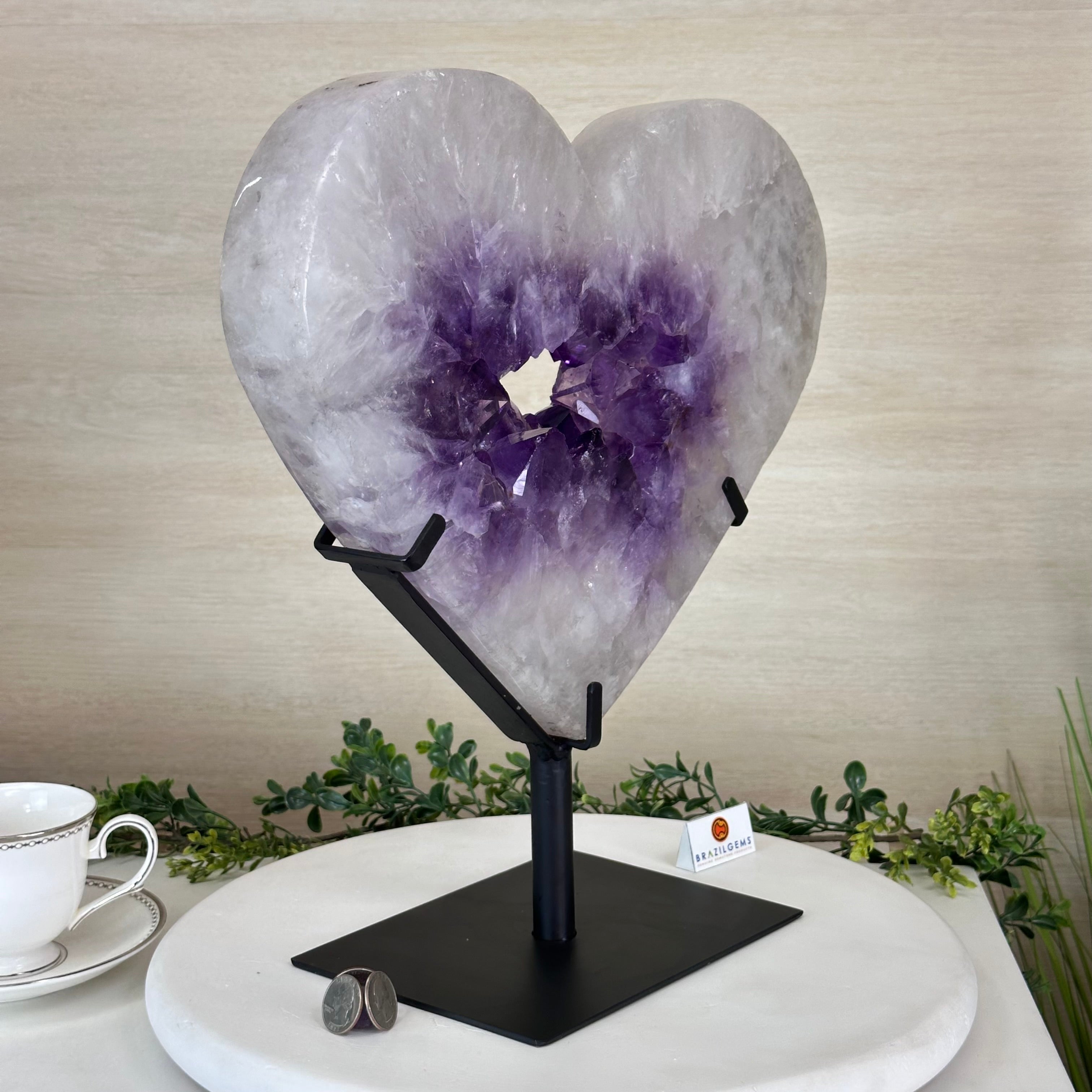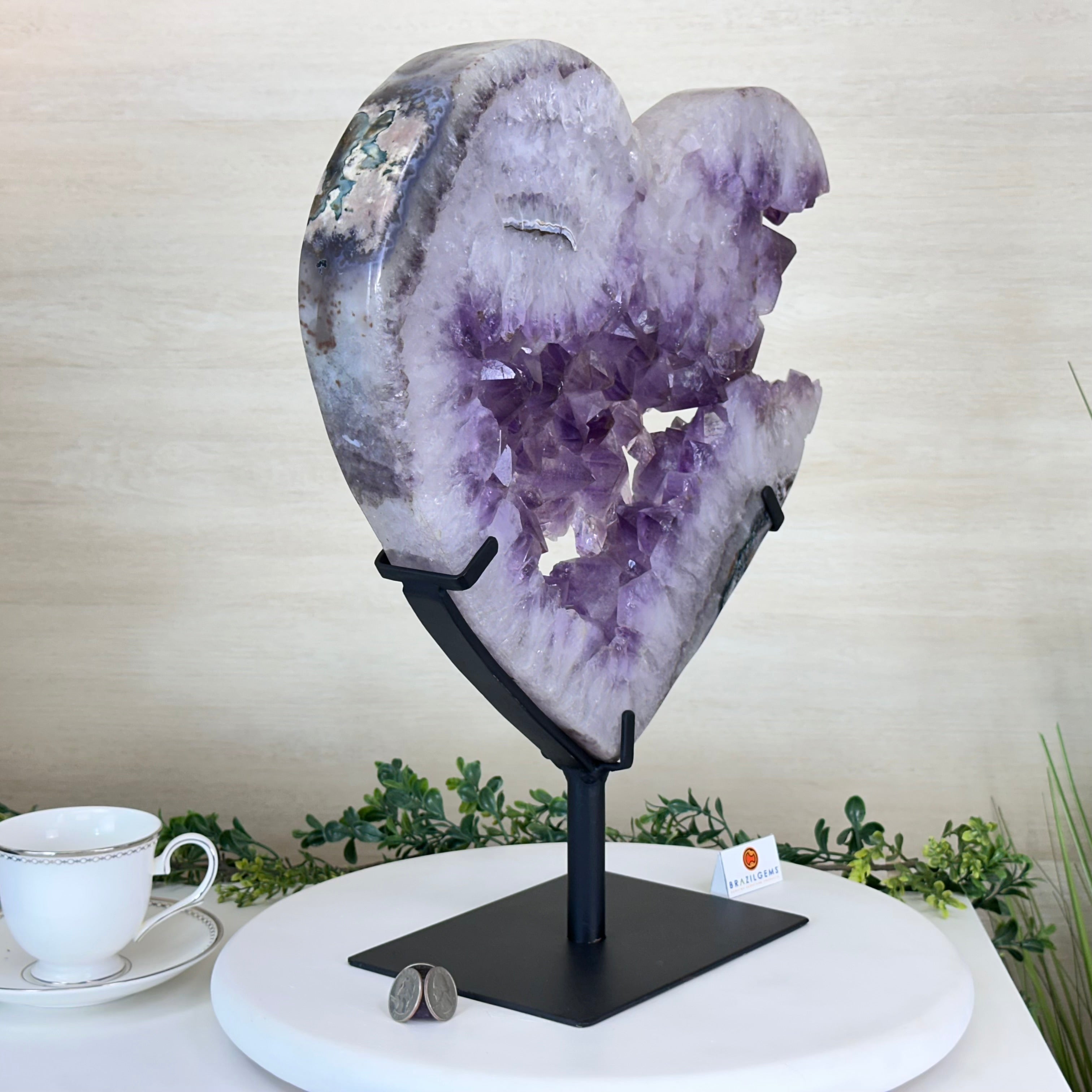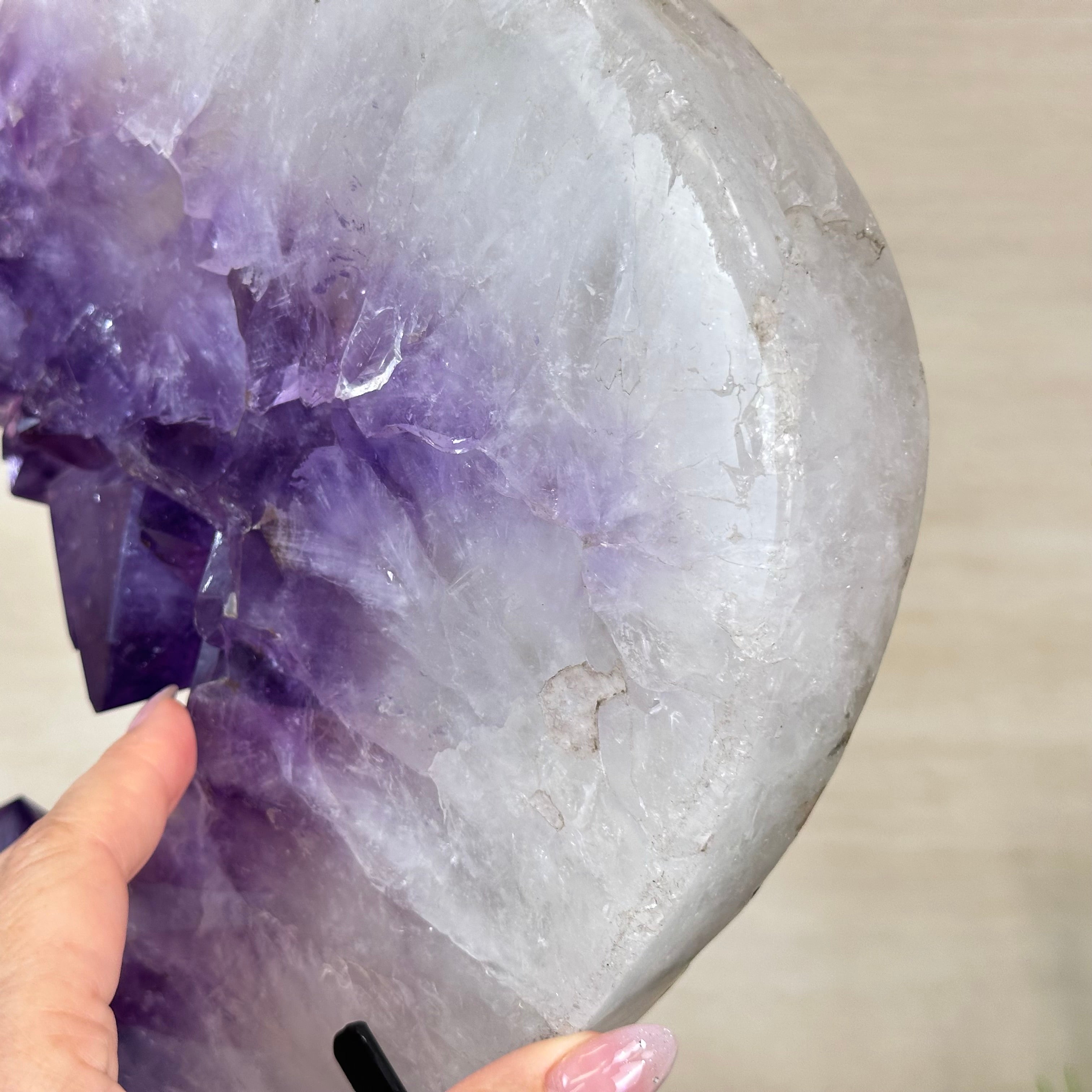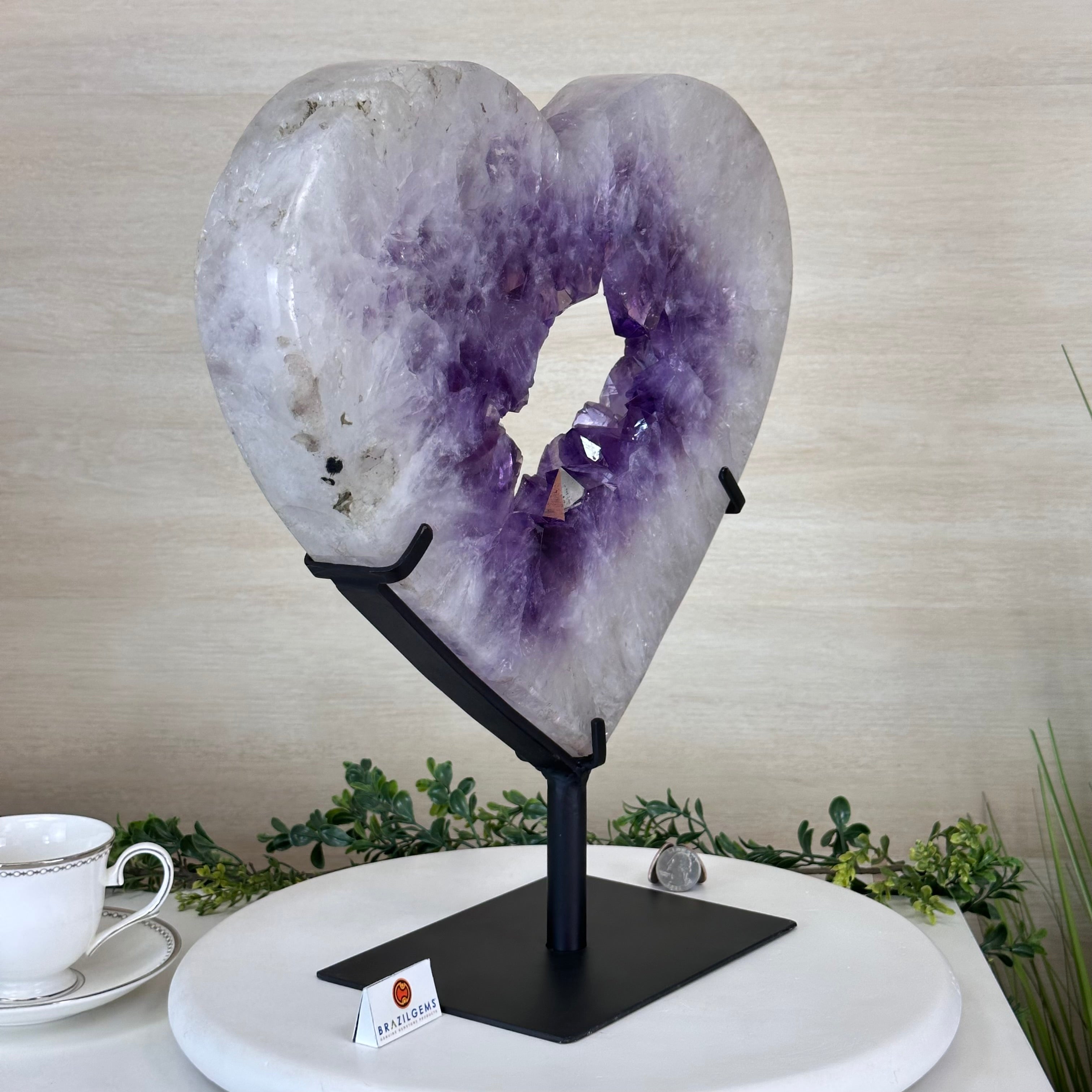 Quality Heart-Shaped Amethyst Geode on a black metal stand. Beautiful gemstones with polished edges and natural rough stone on its backside.