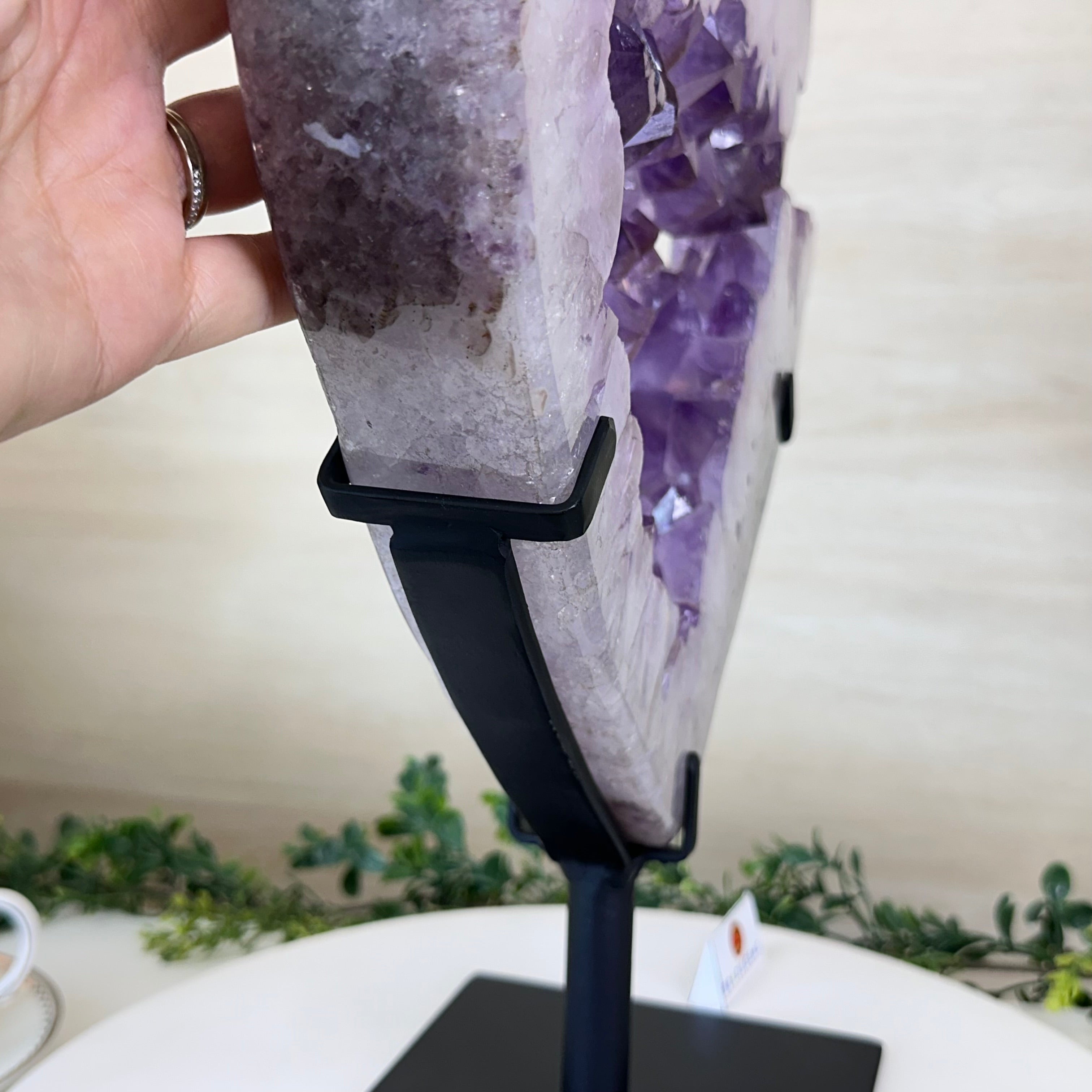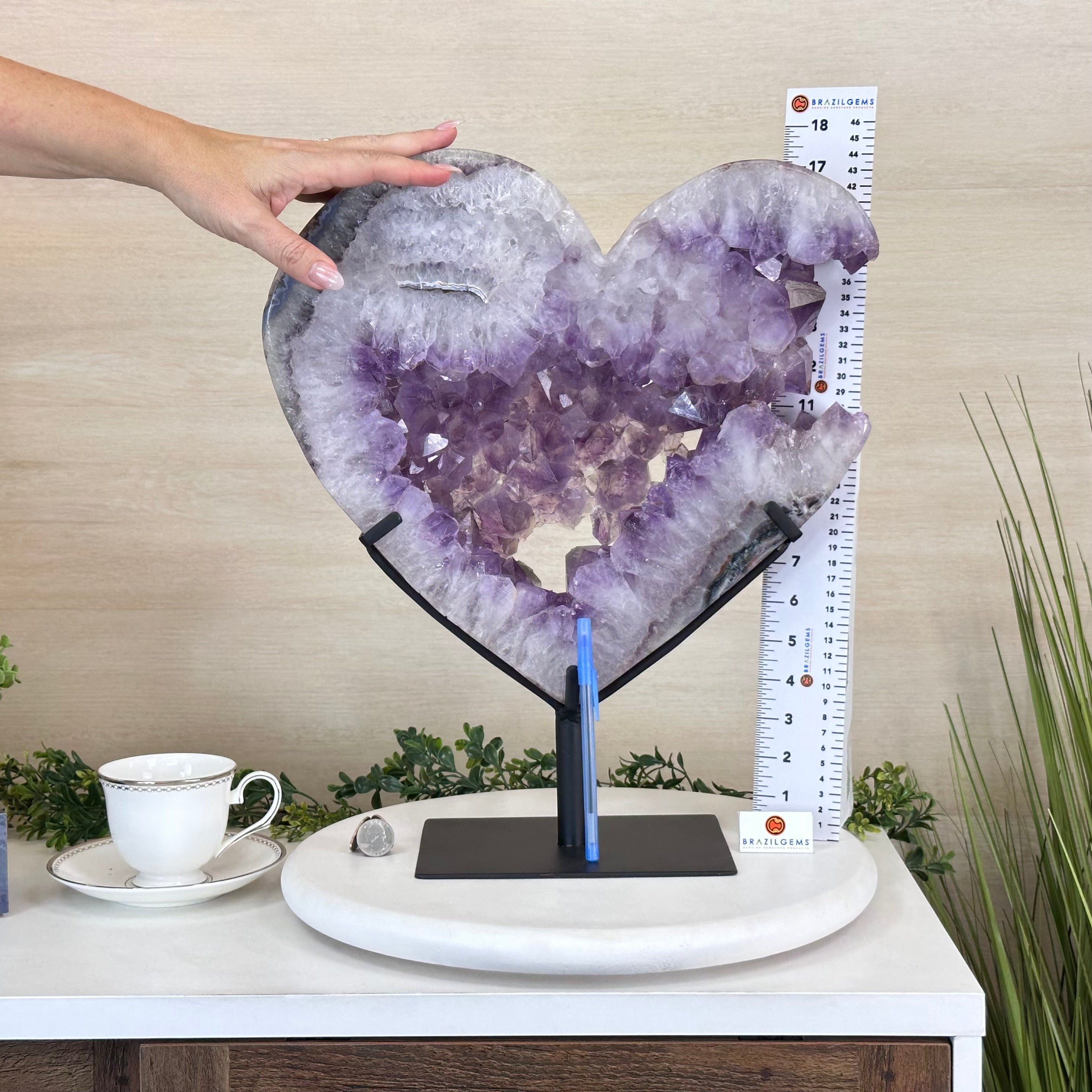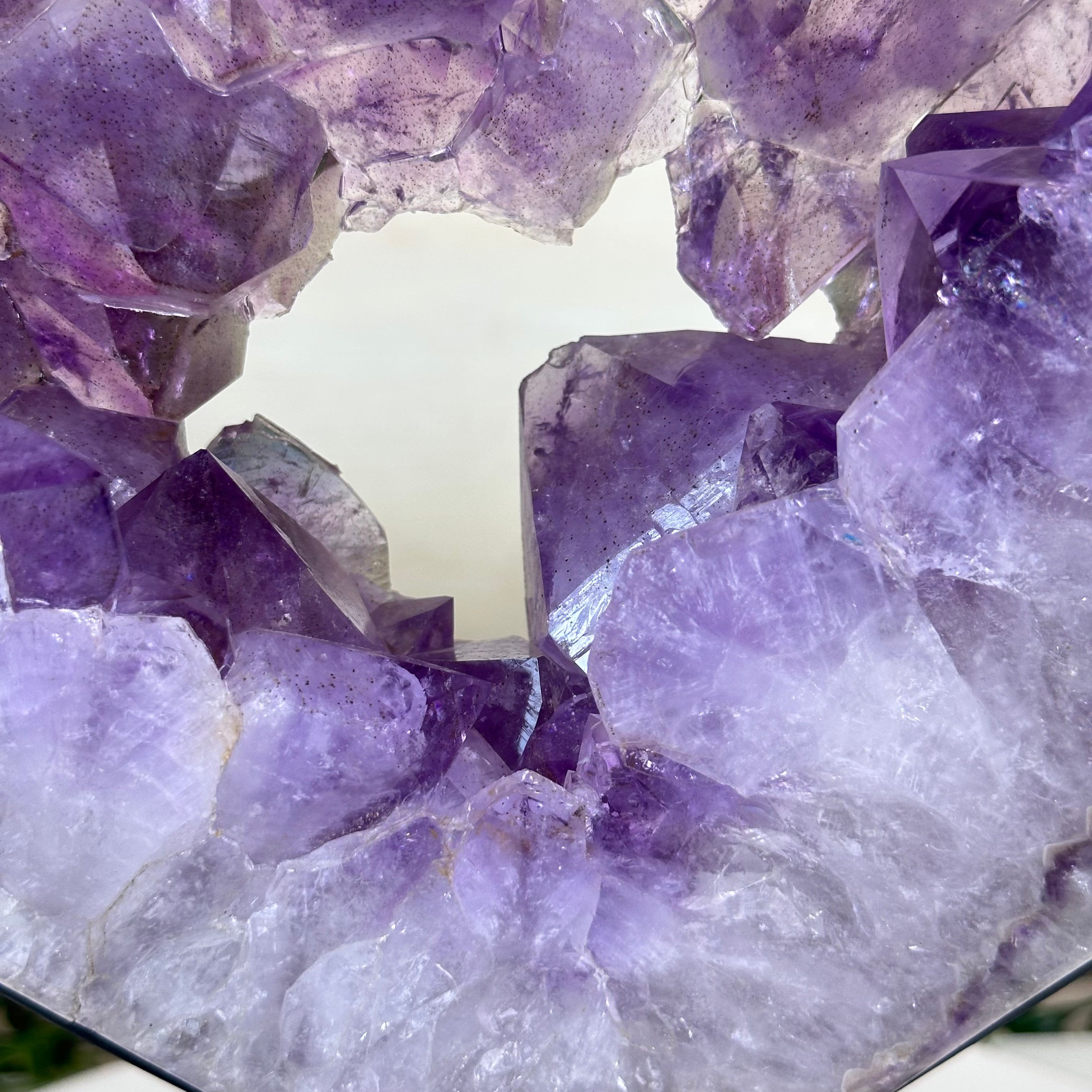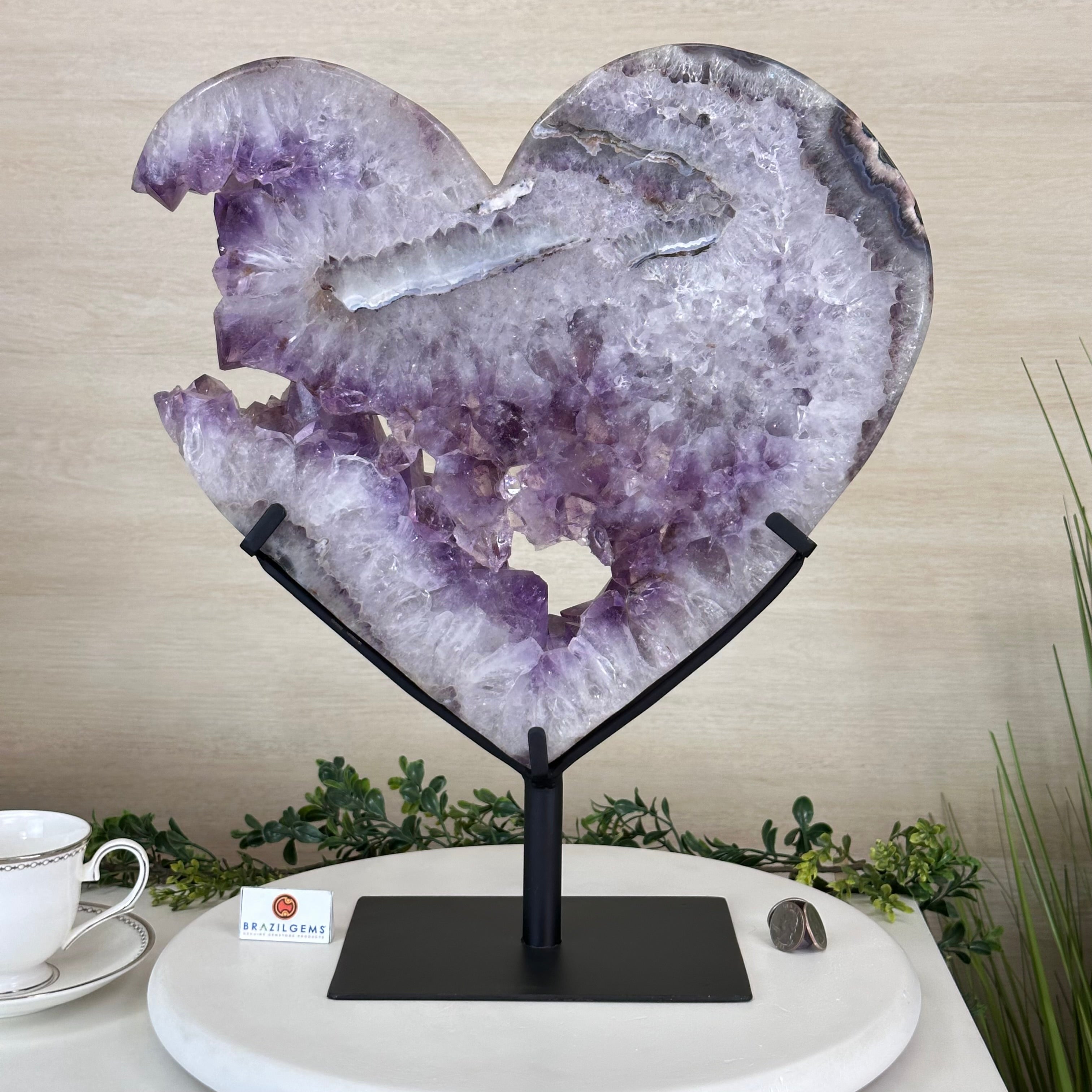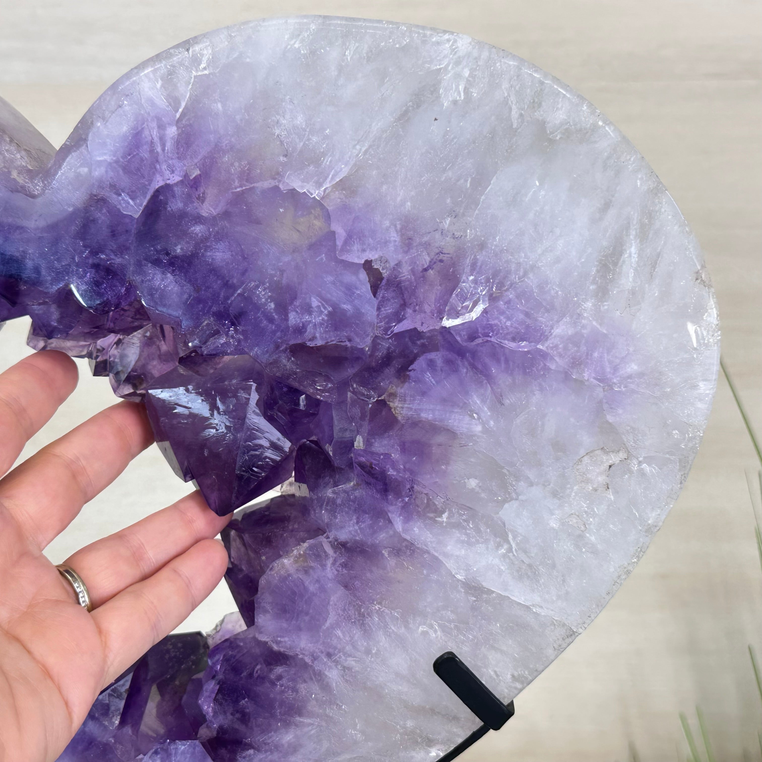 Quality Heart-Shaped Amethyst Geode on a black metal stand. Beautiful gemstones with polished edges and natural rough stone on its backside.