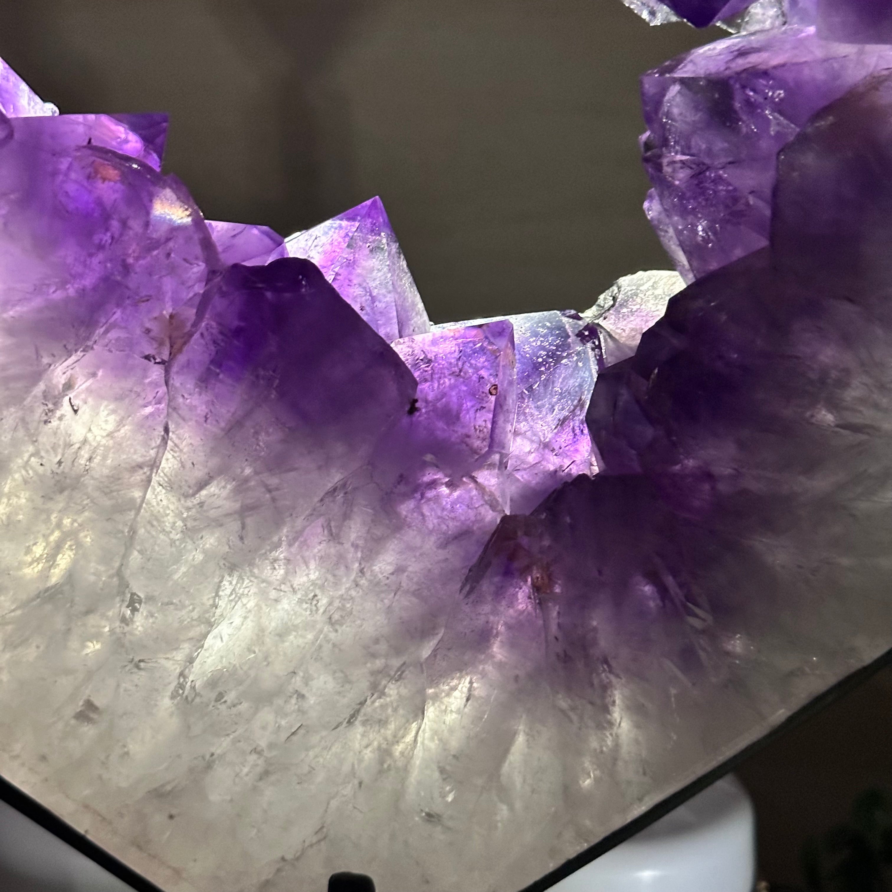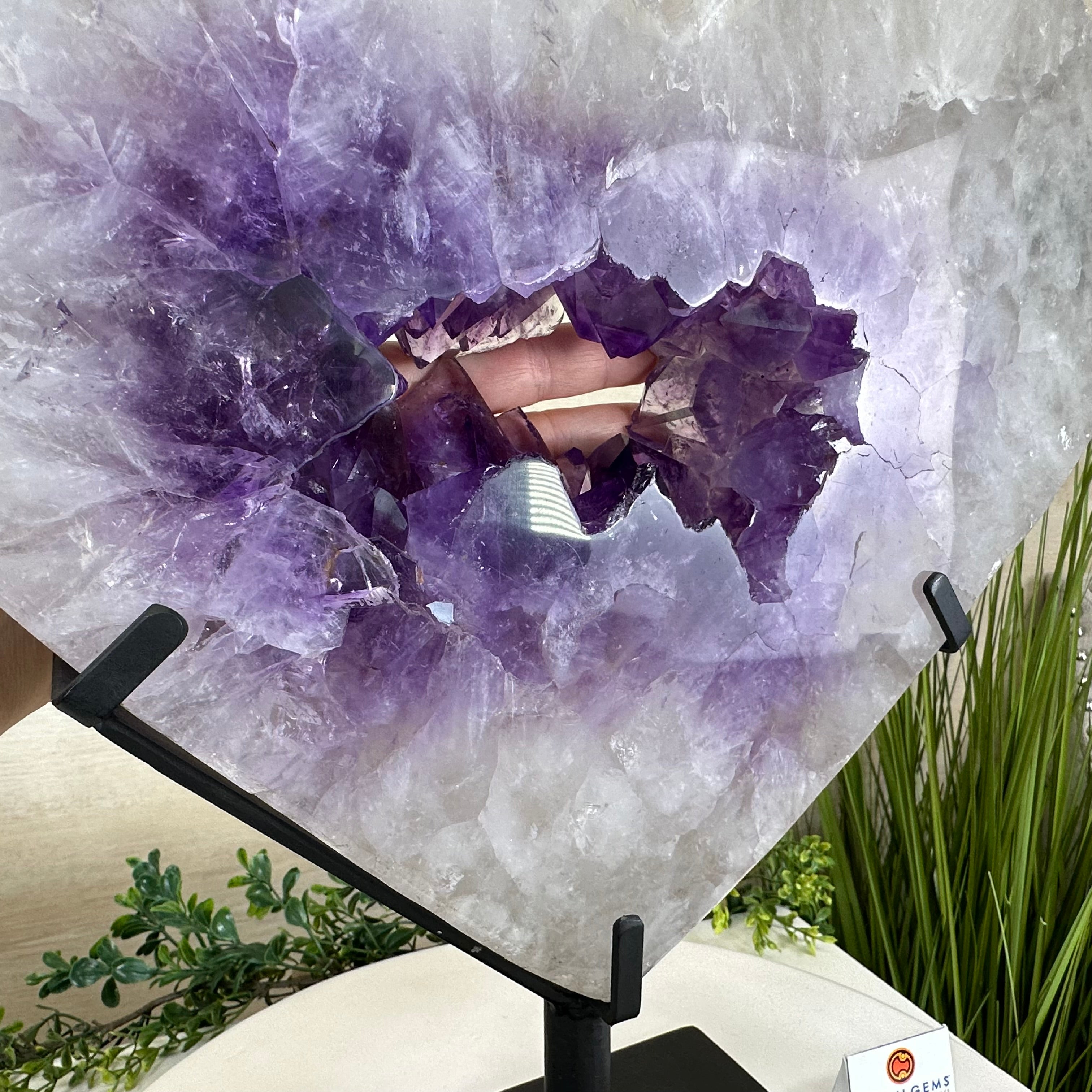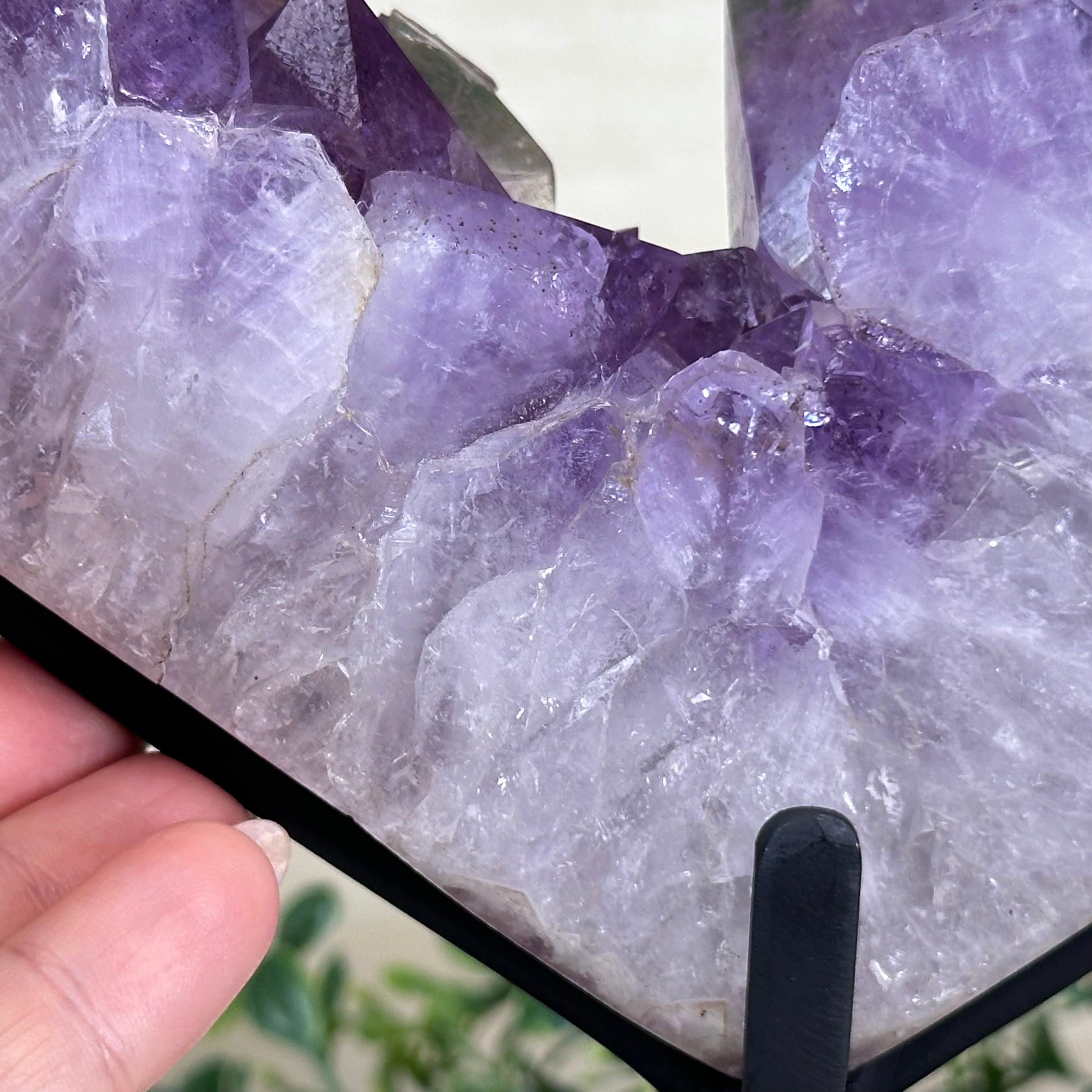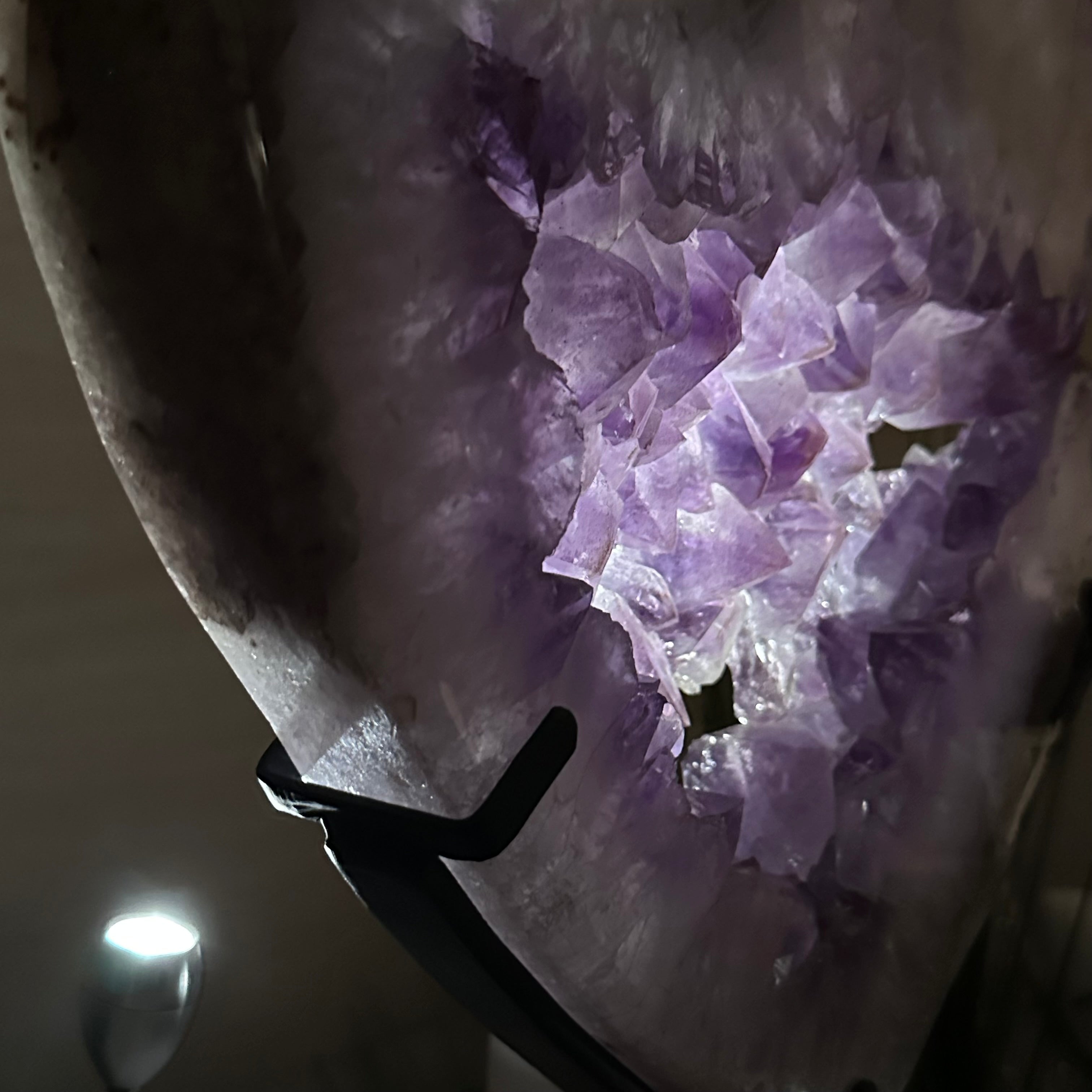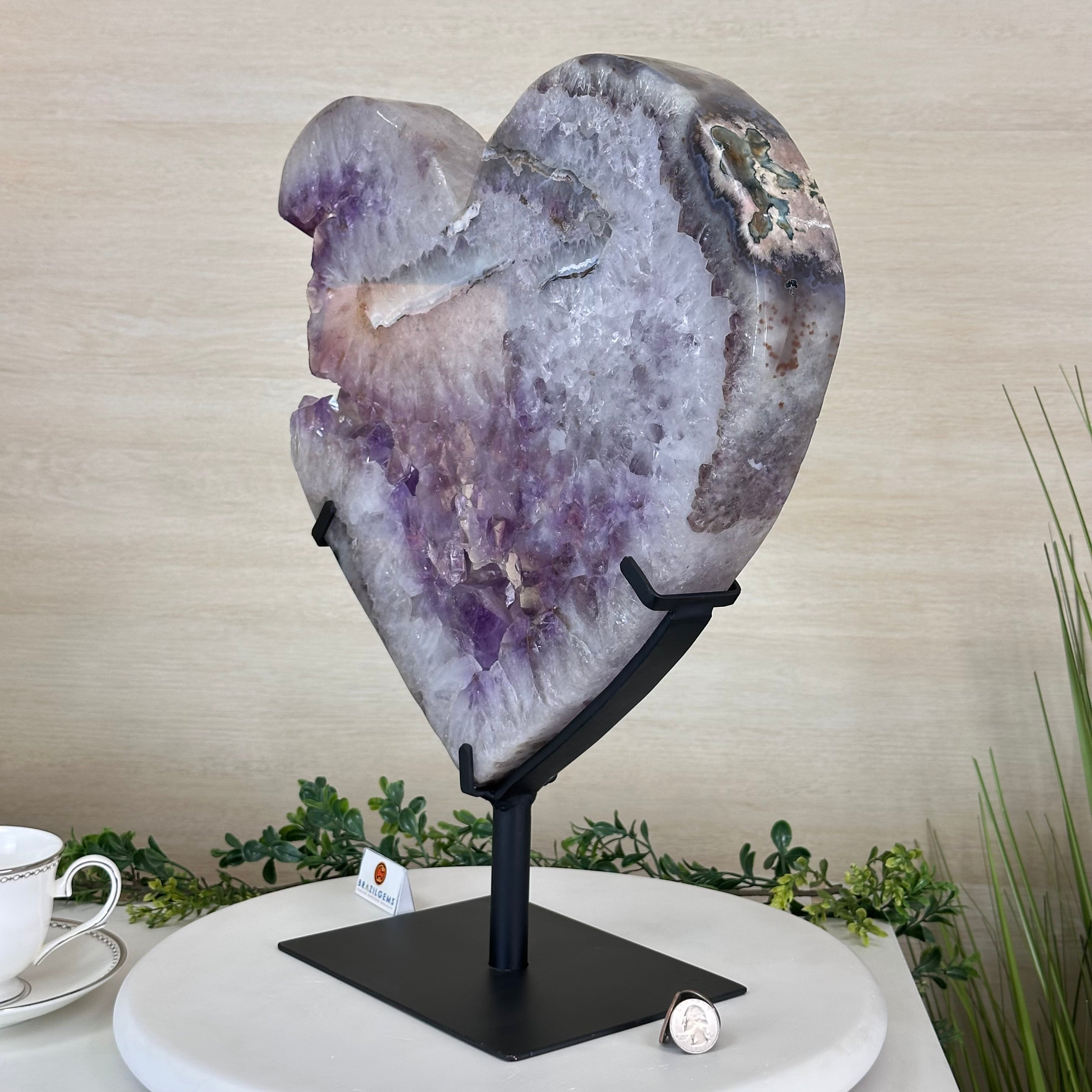 Quality Heart-Shaped Amethyst Geode on a black metal stand. Beautiful gemstones with polished edges and natural rough stone on its backside.