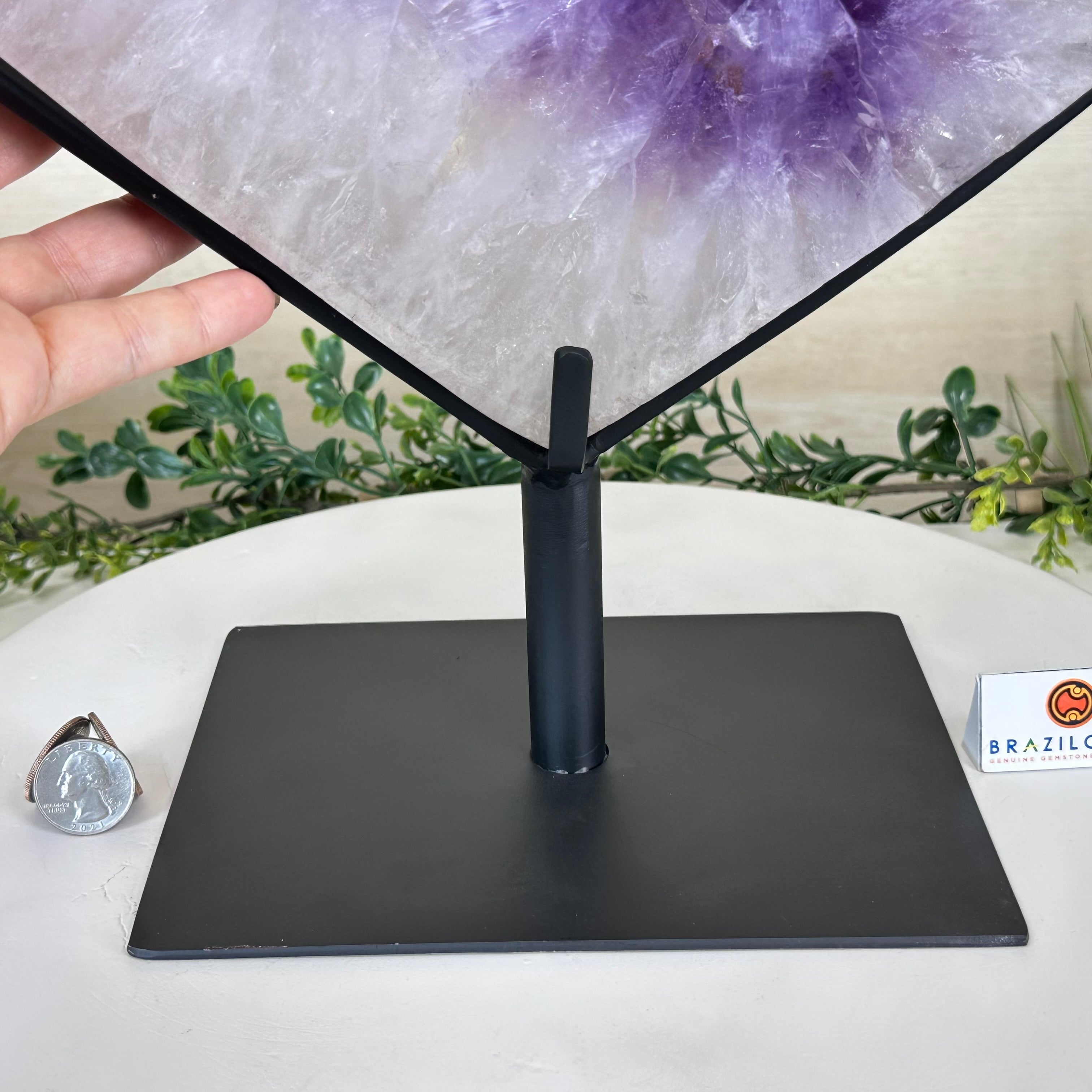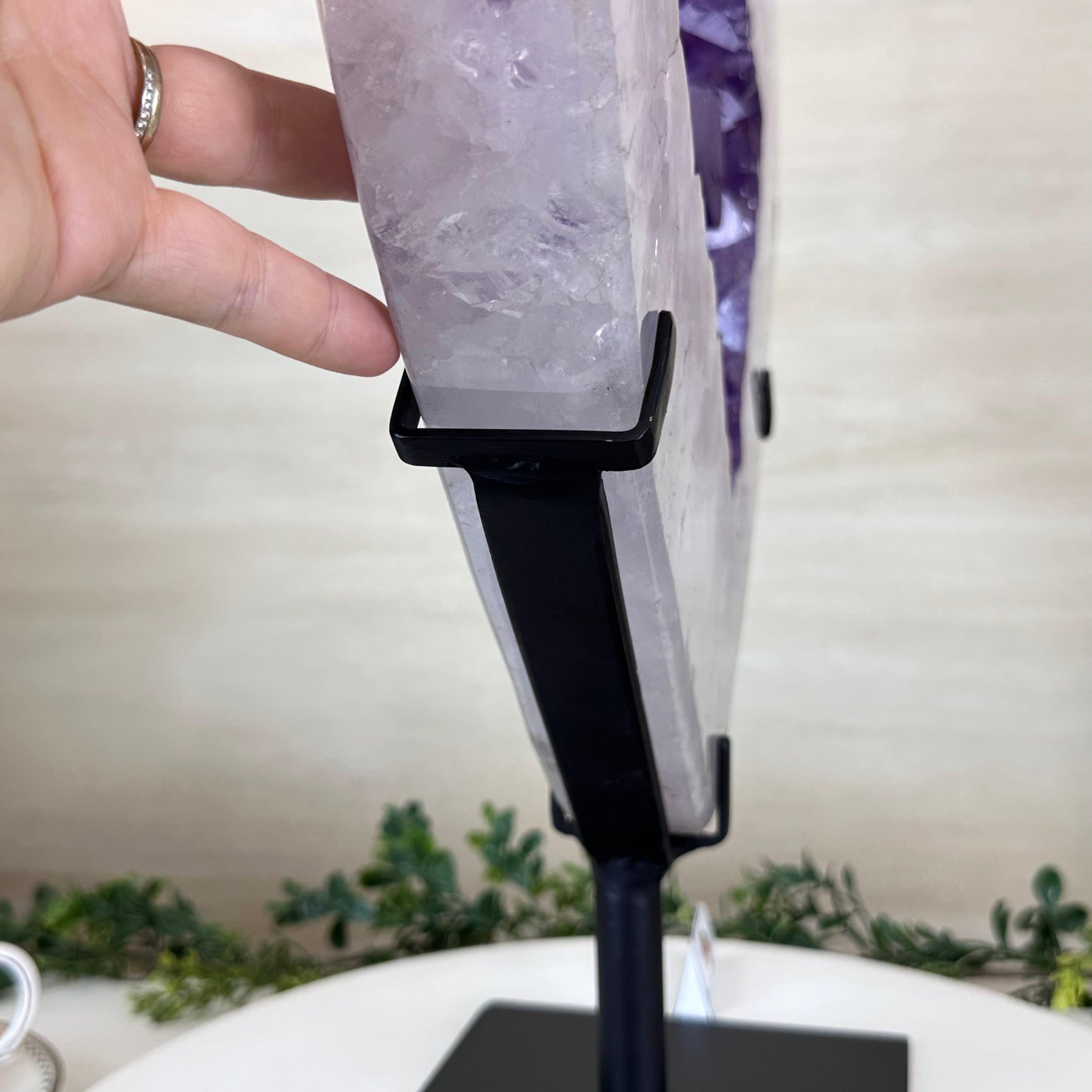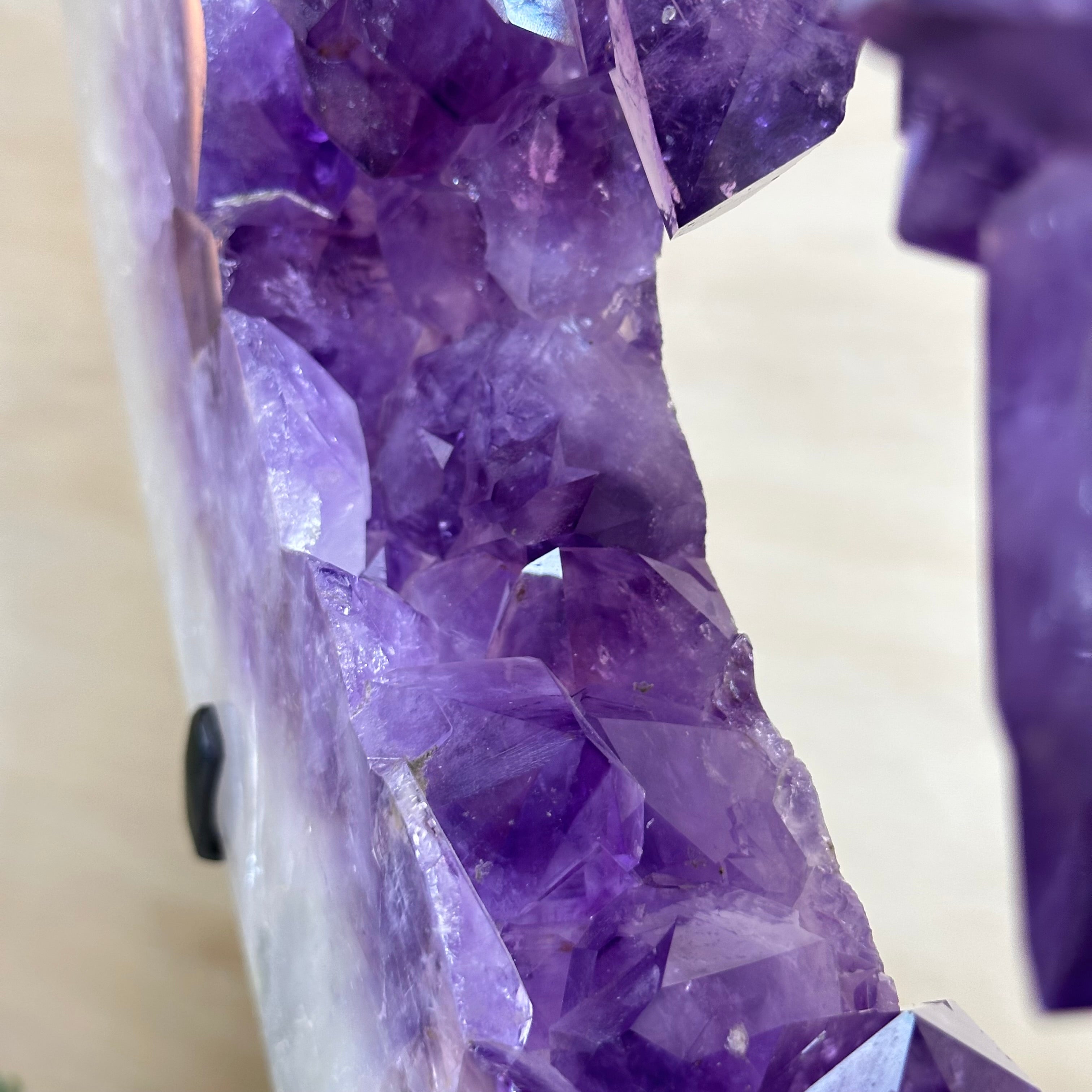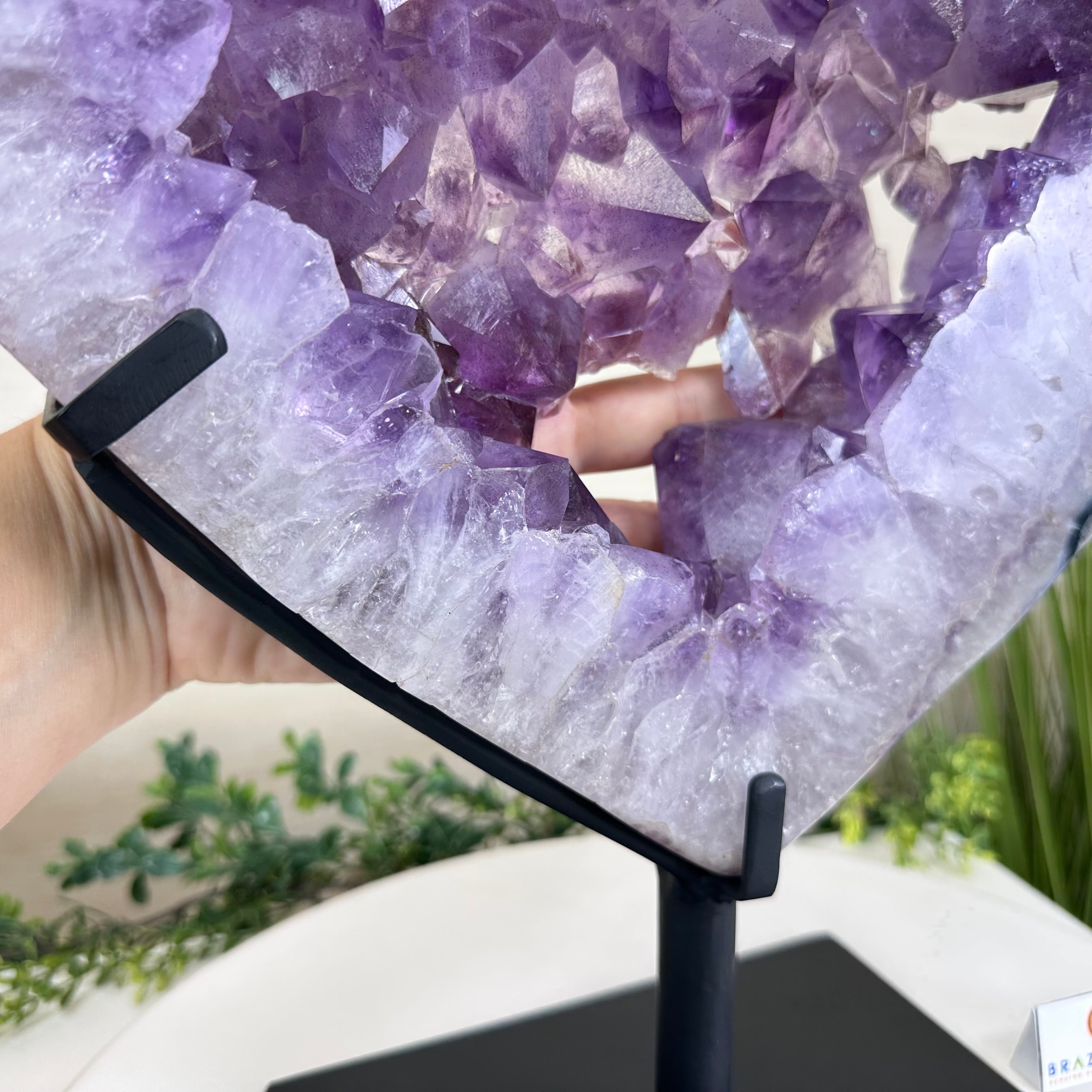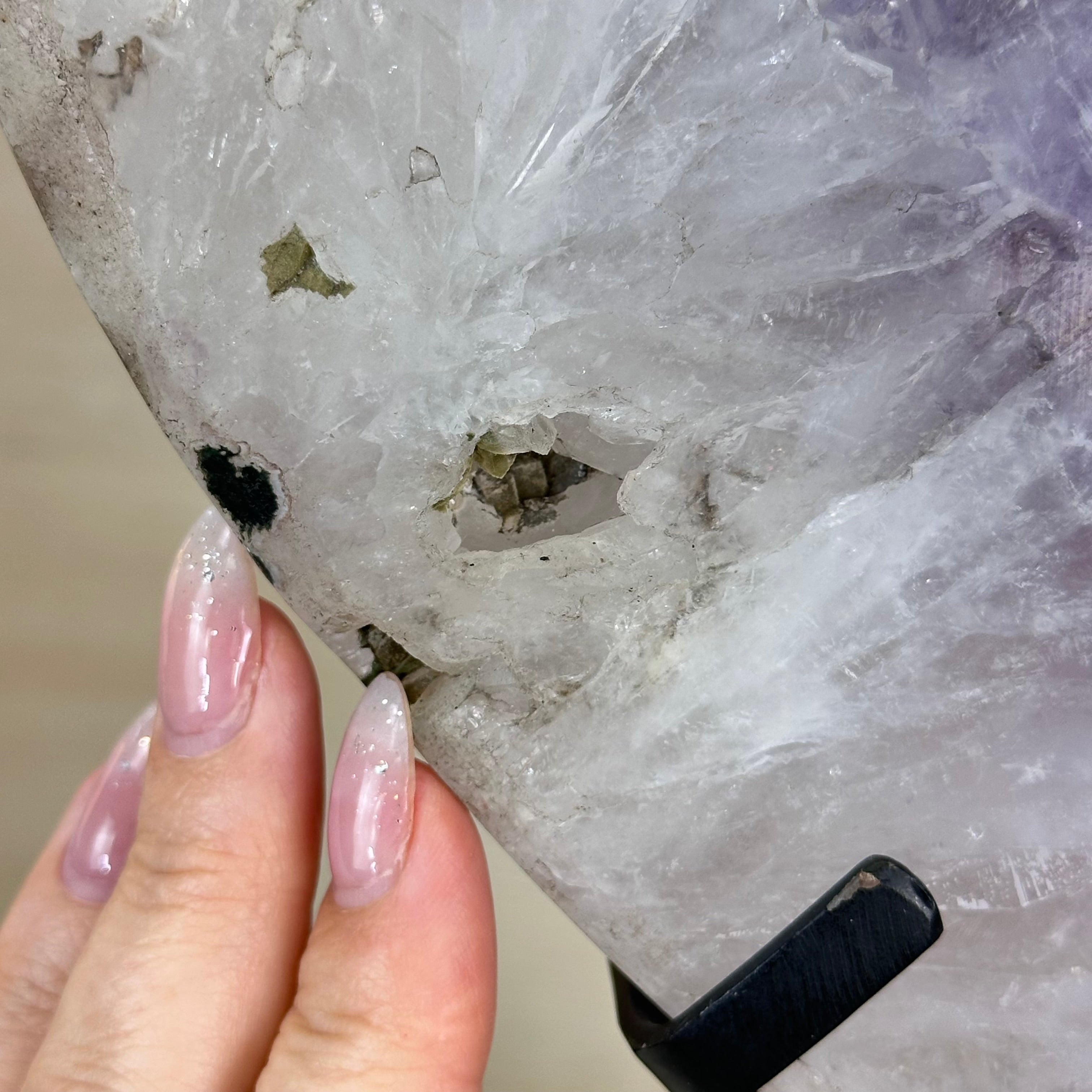 Quality Heart-Shaped Amethyst Geode on a black metal stand. Beautiful gemstones with polished edges and natural rough stone on its backside.