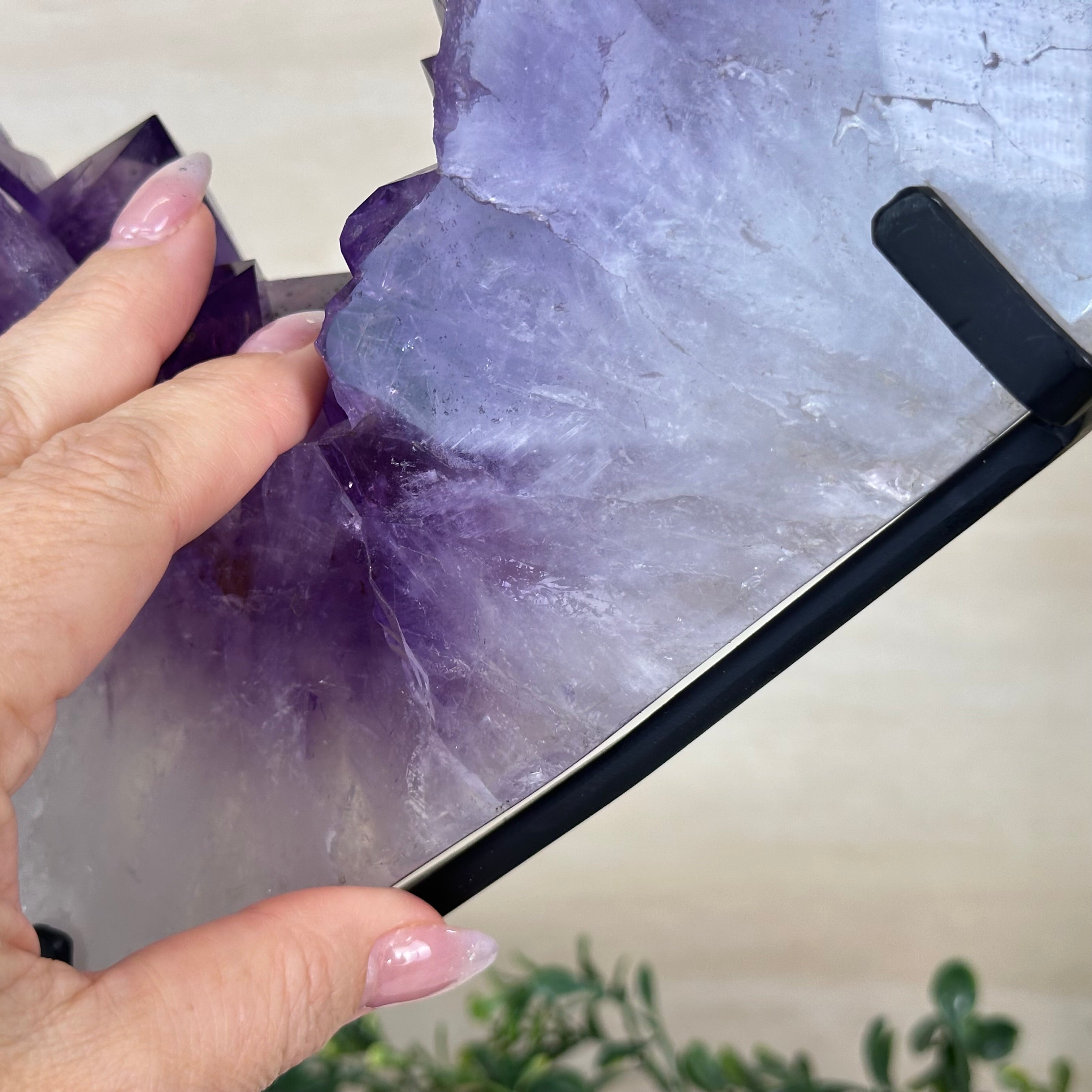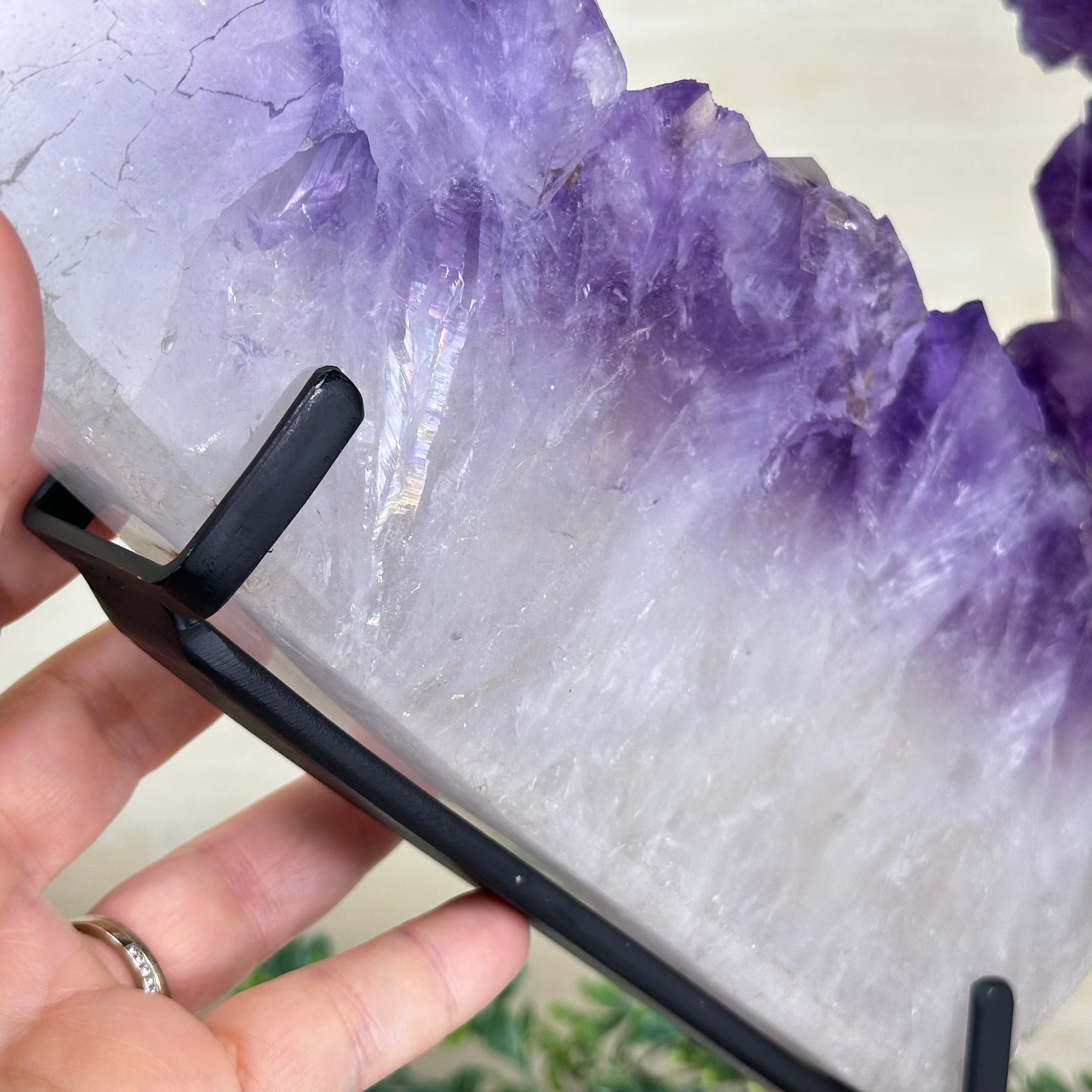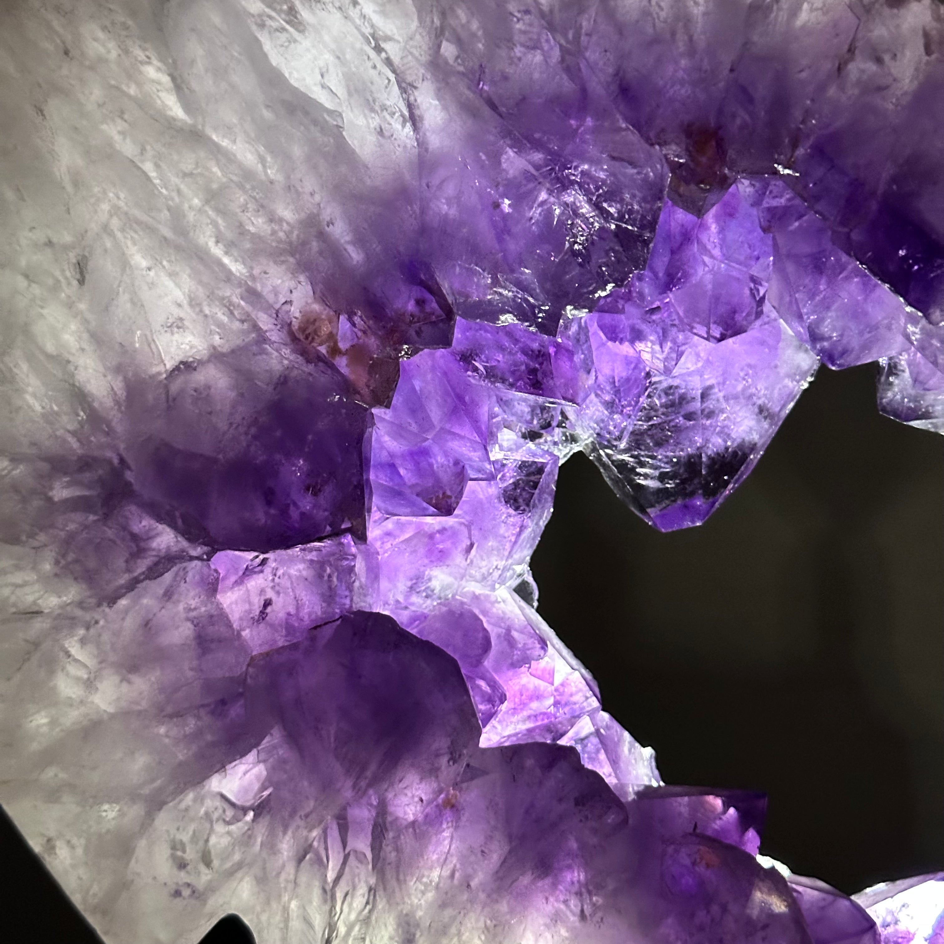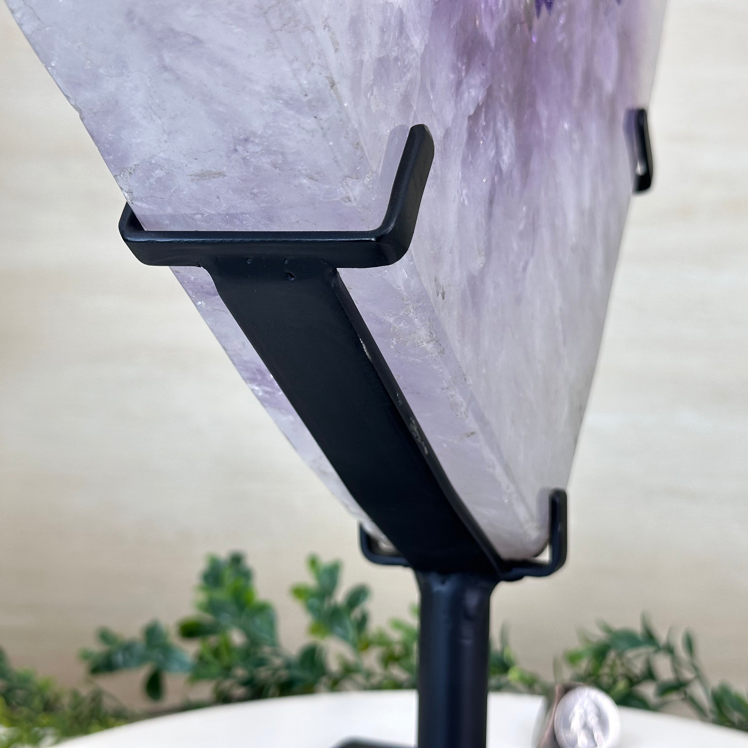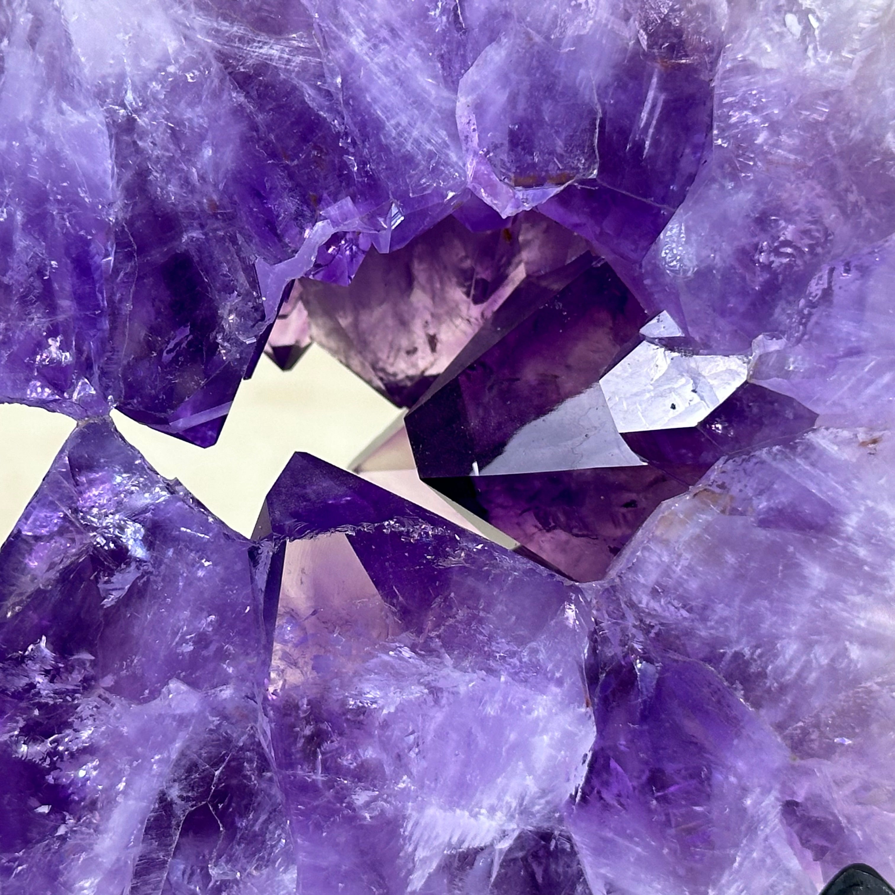 Quality Heart-Shaped Amethyst Geode on a black metal stand. Beautiful gemstones with polished edges and natural rough stone on its backside.