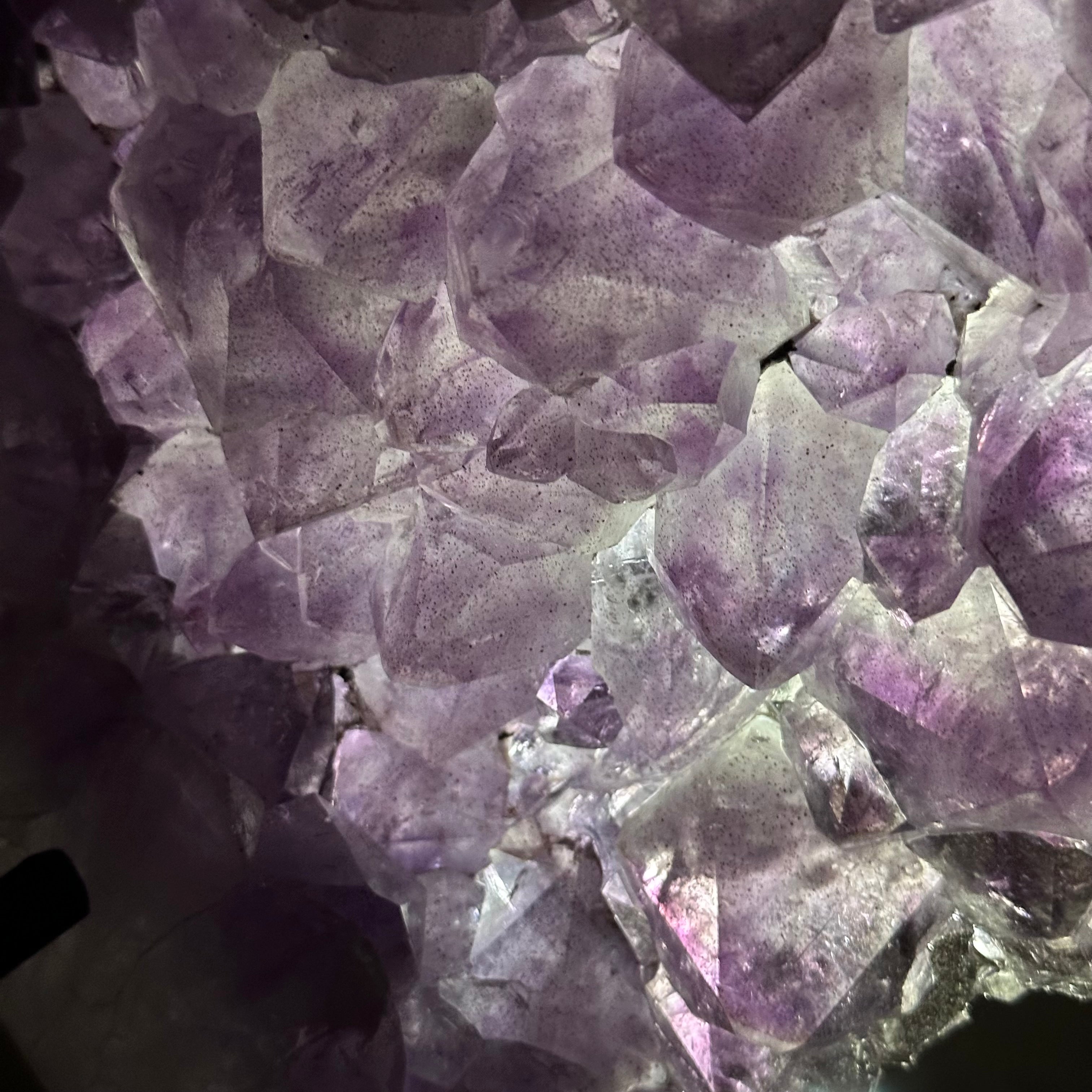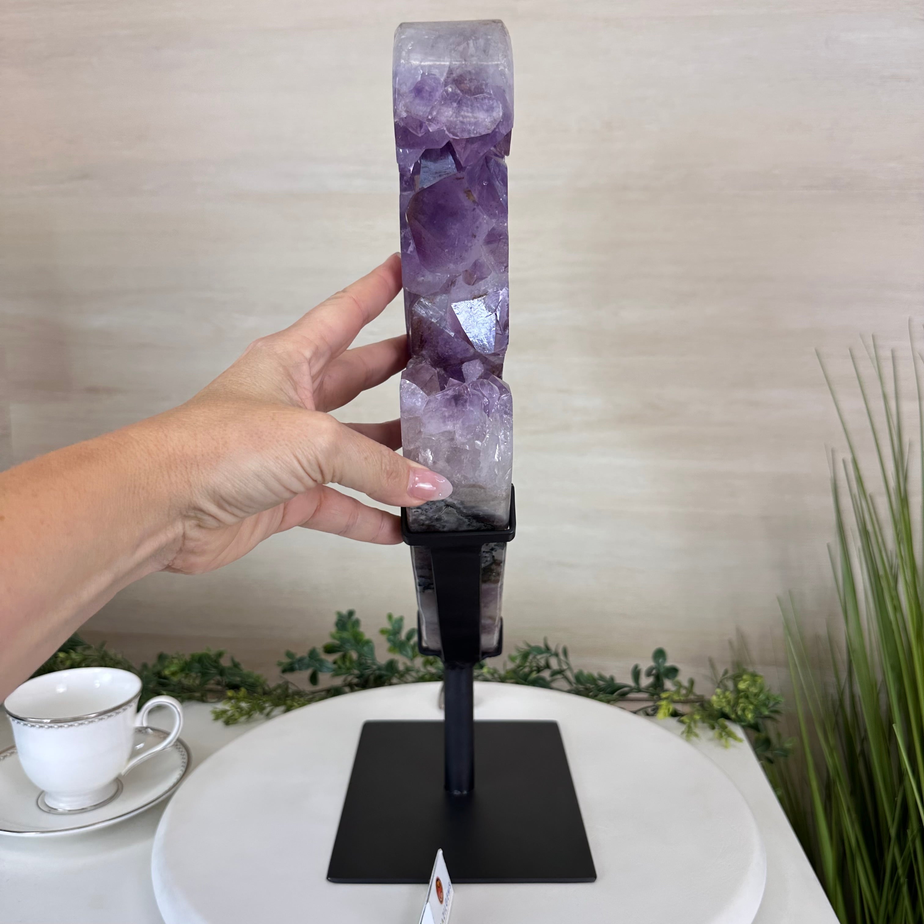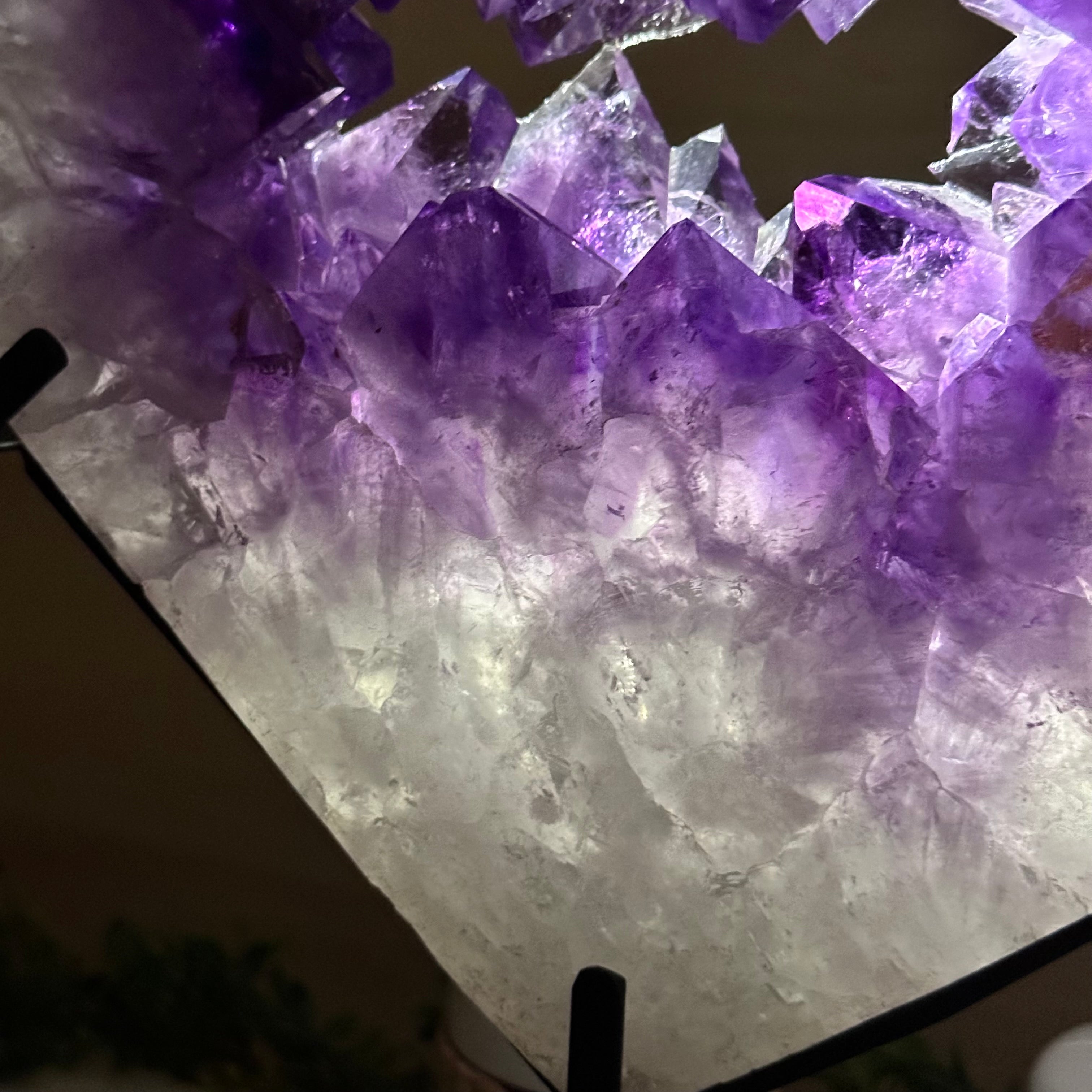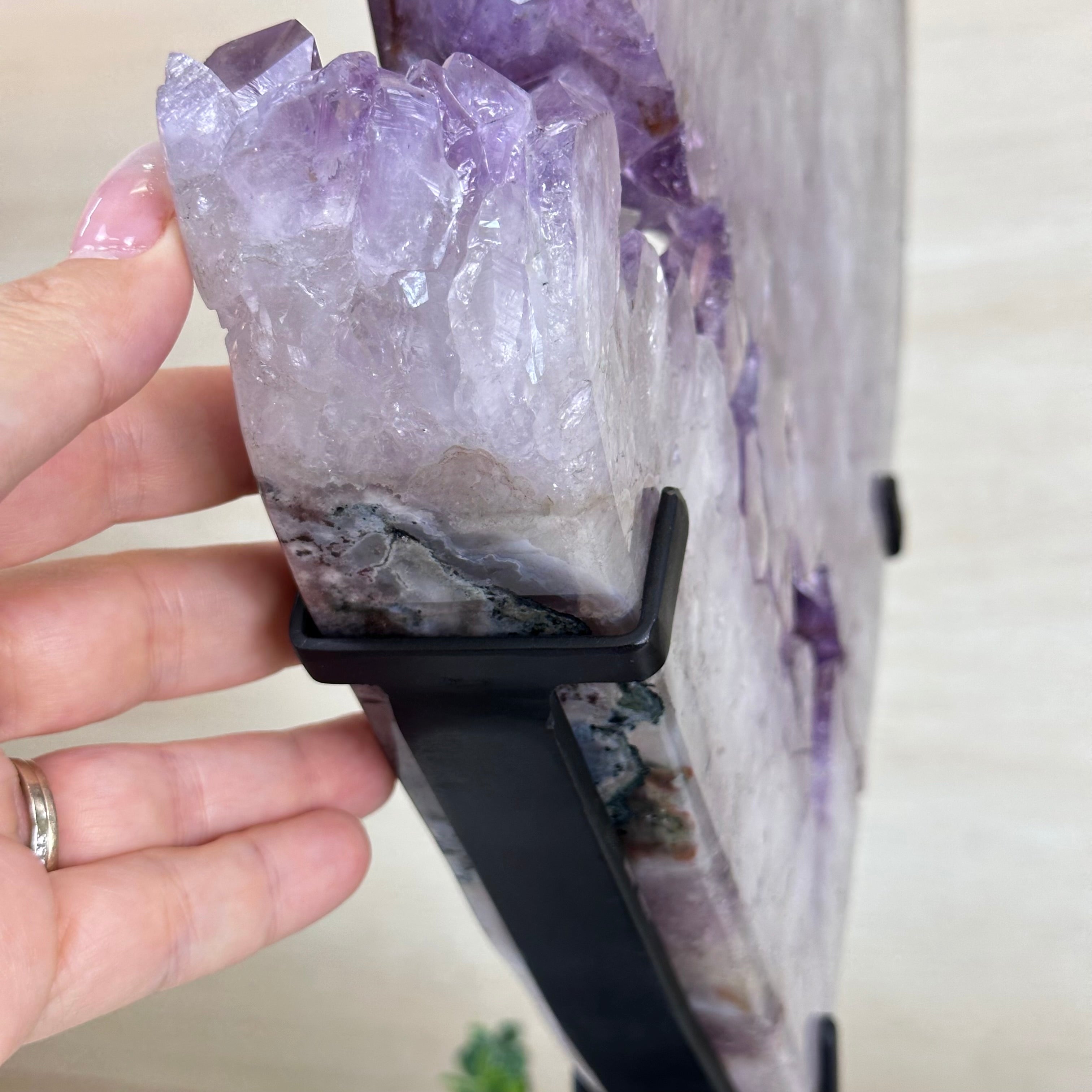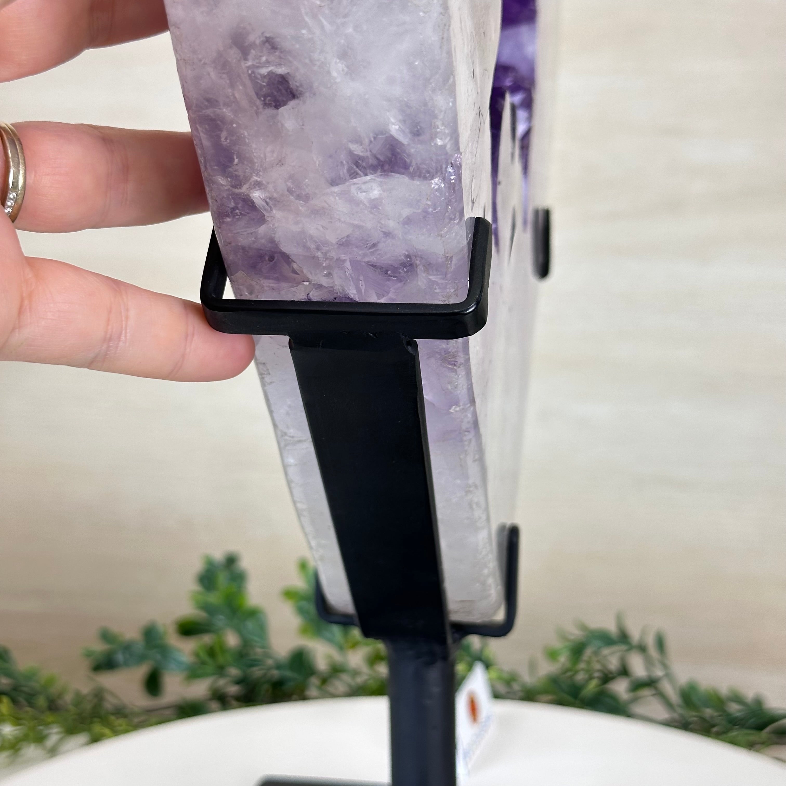 Quality Heart-Shaped Amethyst Geode on a black metal stand. Beautiful gemstones with polished edges and natural rough stone on its backside.