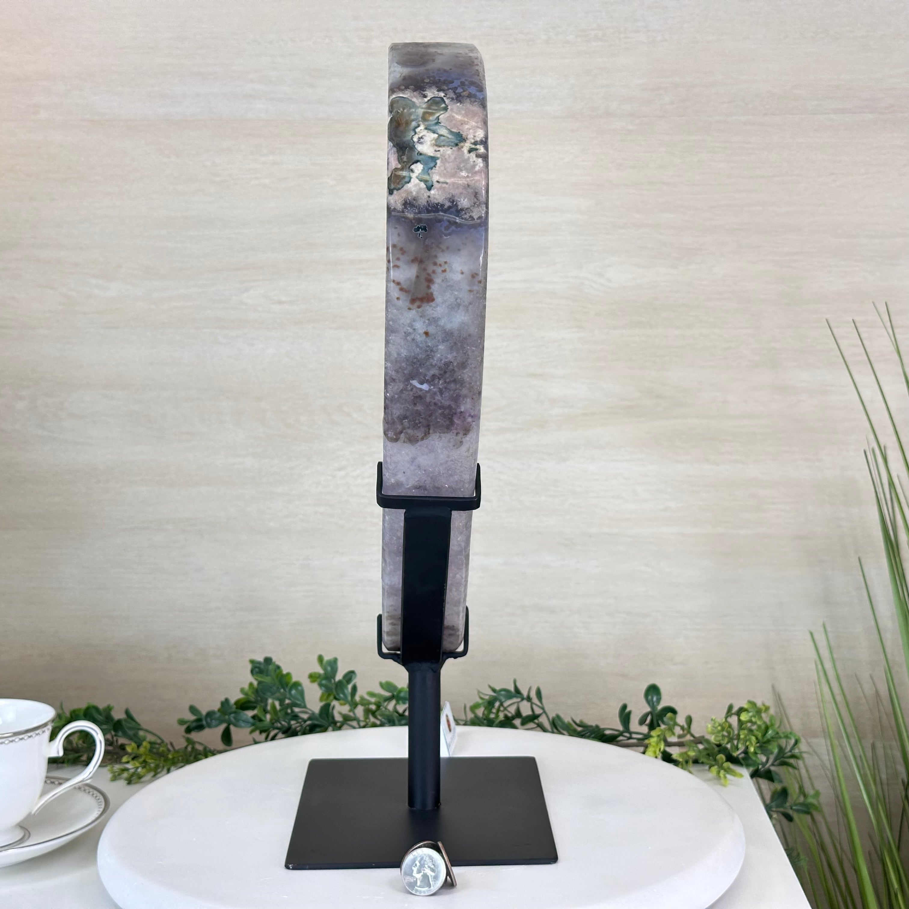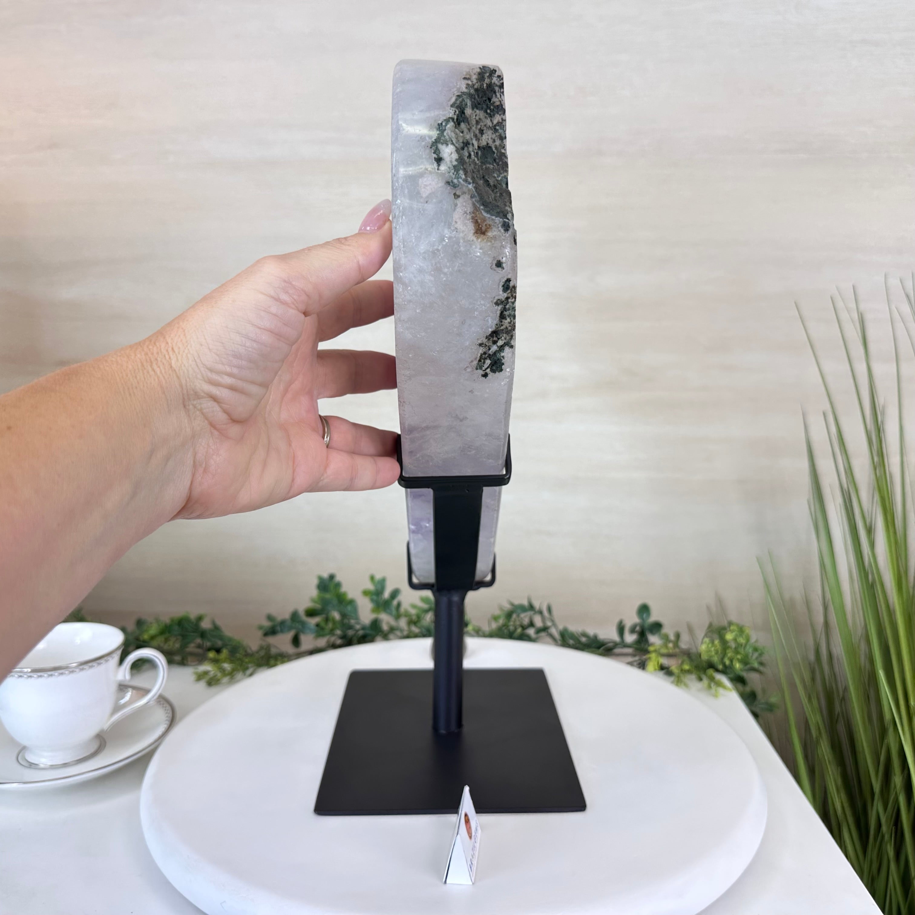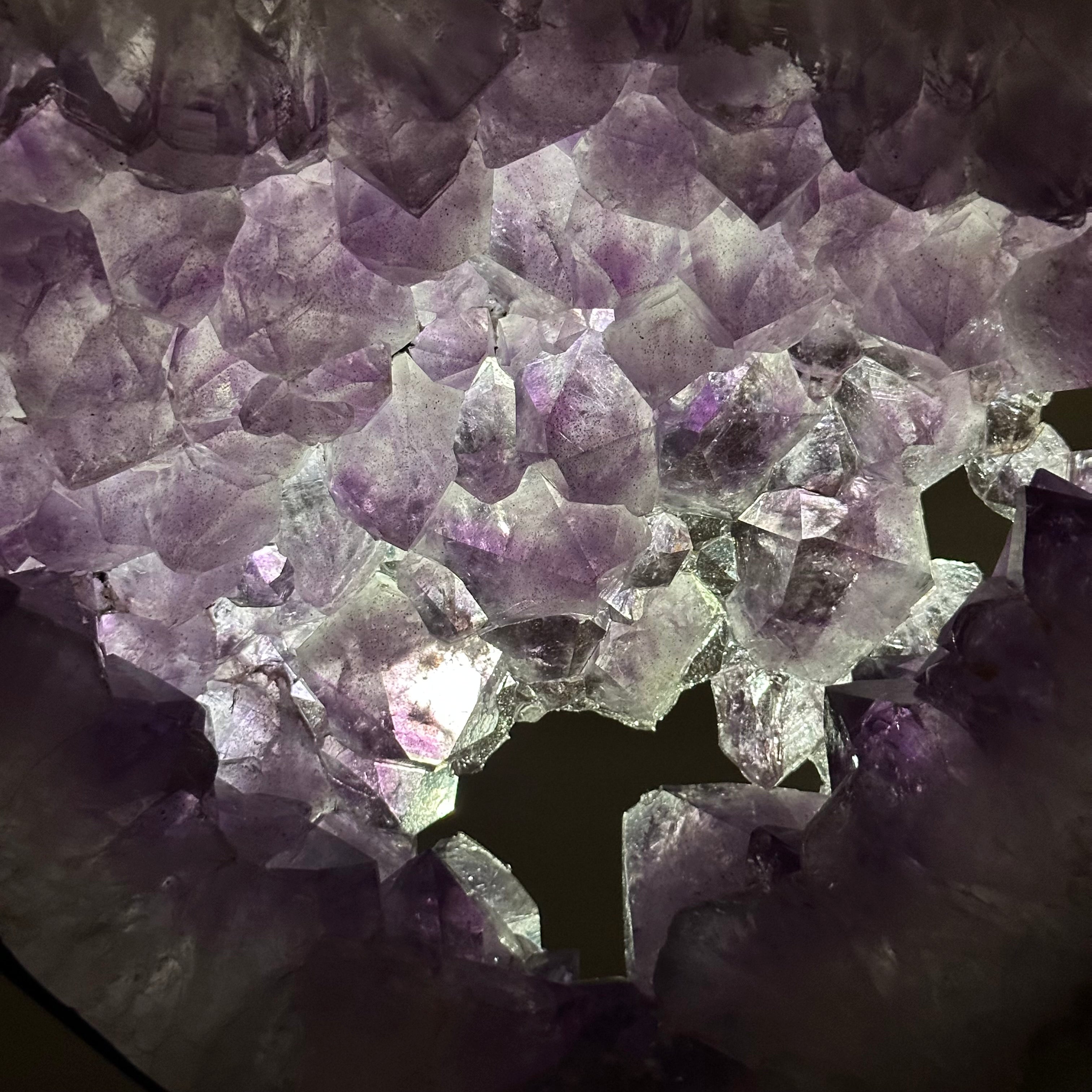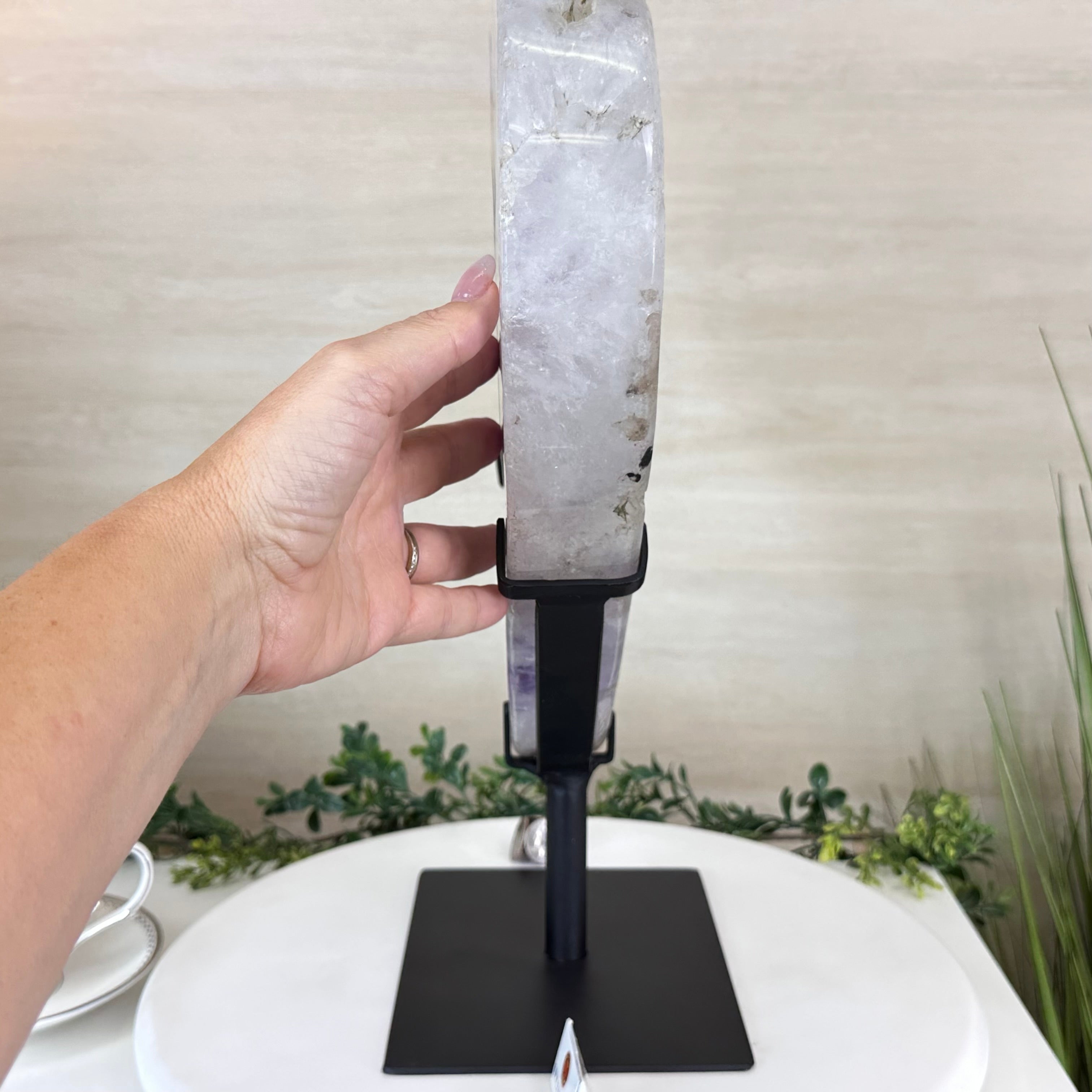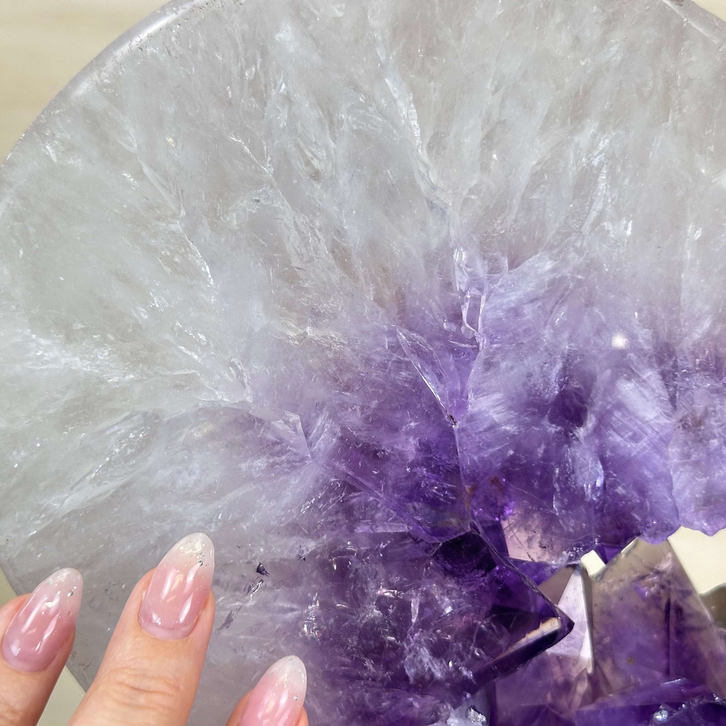 Quality Heart-Shaped Amethyst Geode on a black metal stand. Beautiful gemstones with polished edges and natural rough stone on its backside.