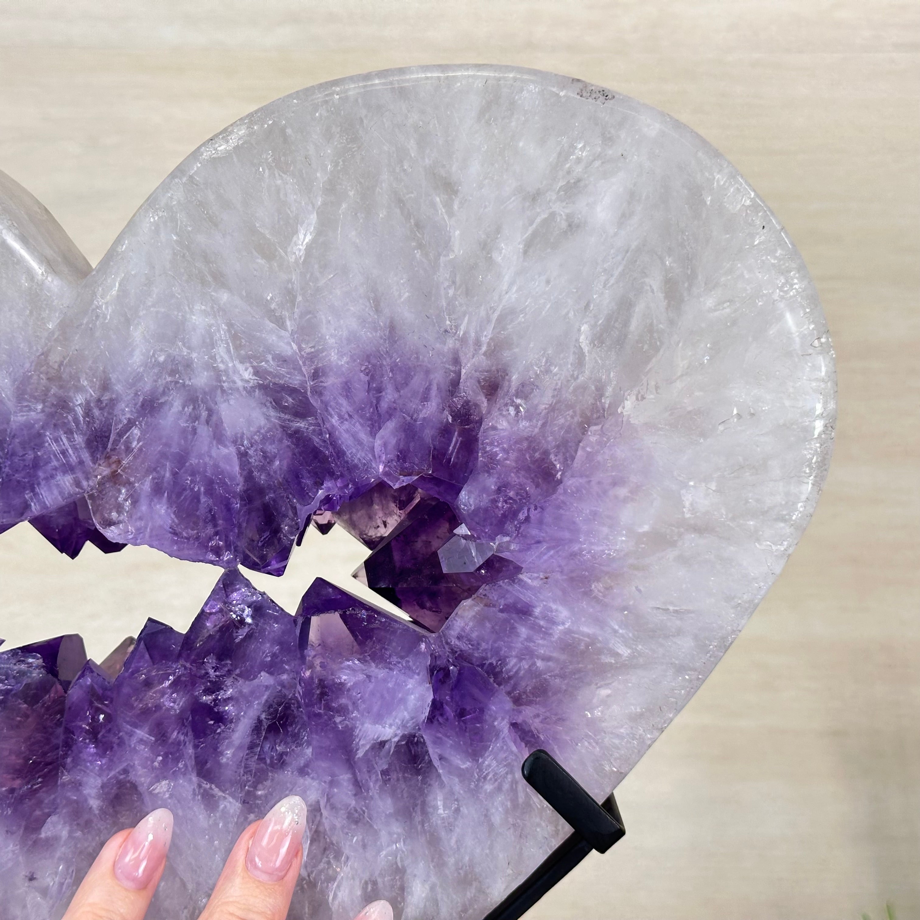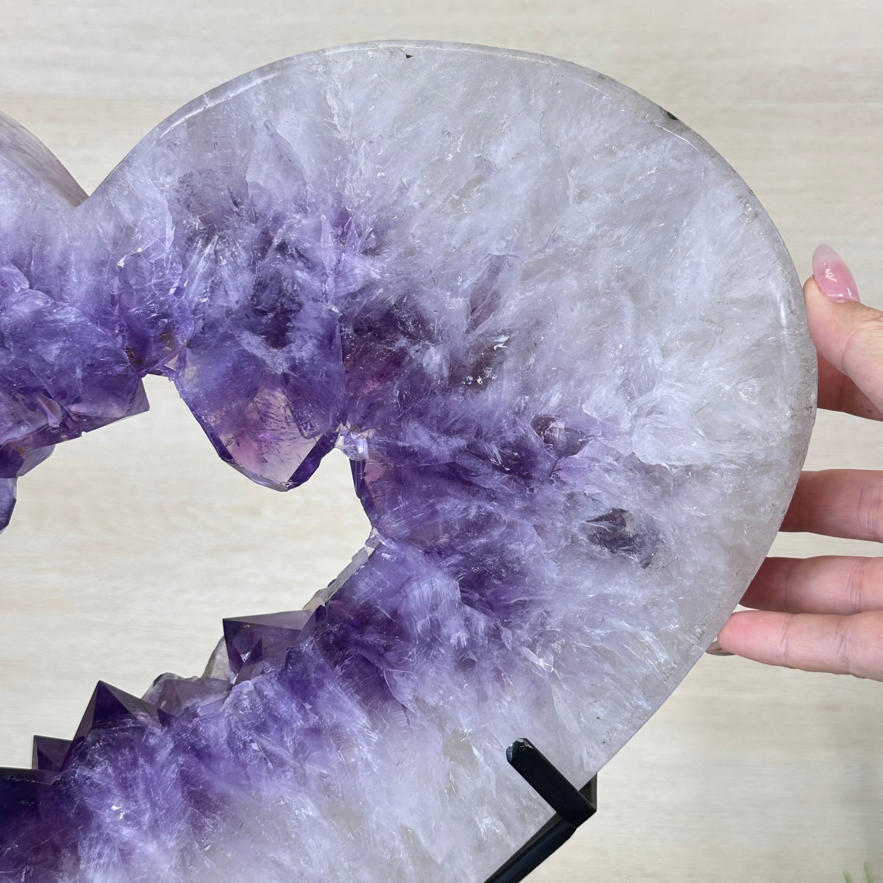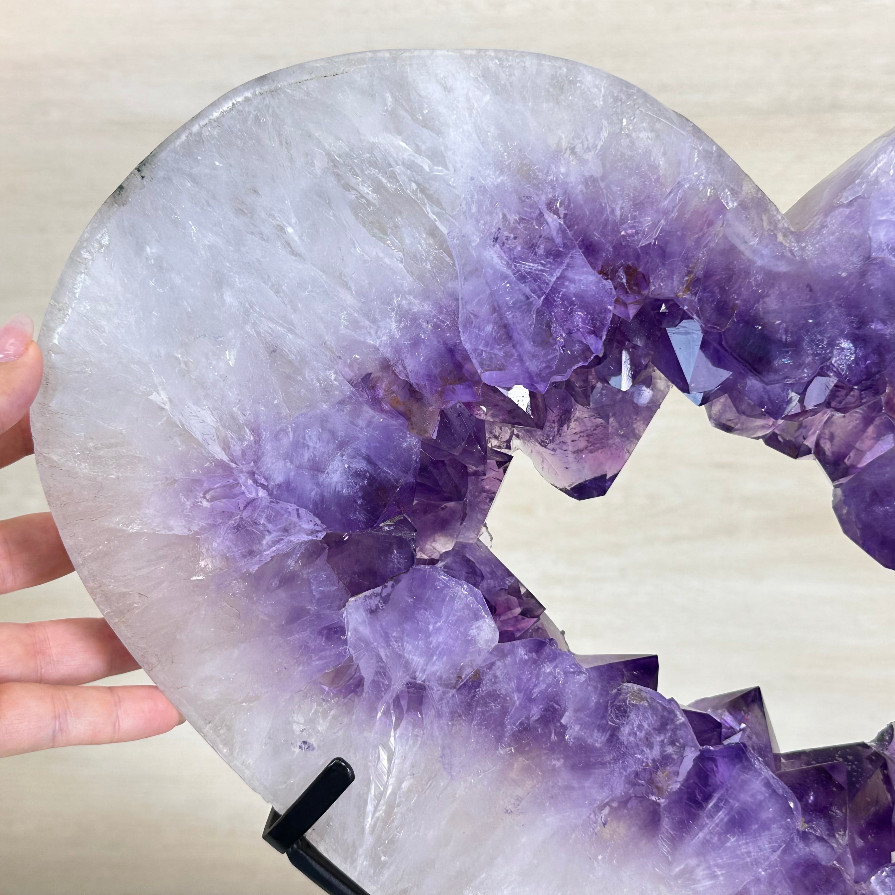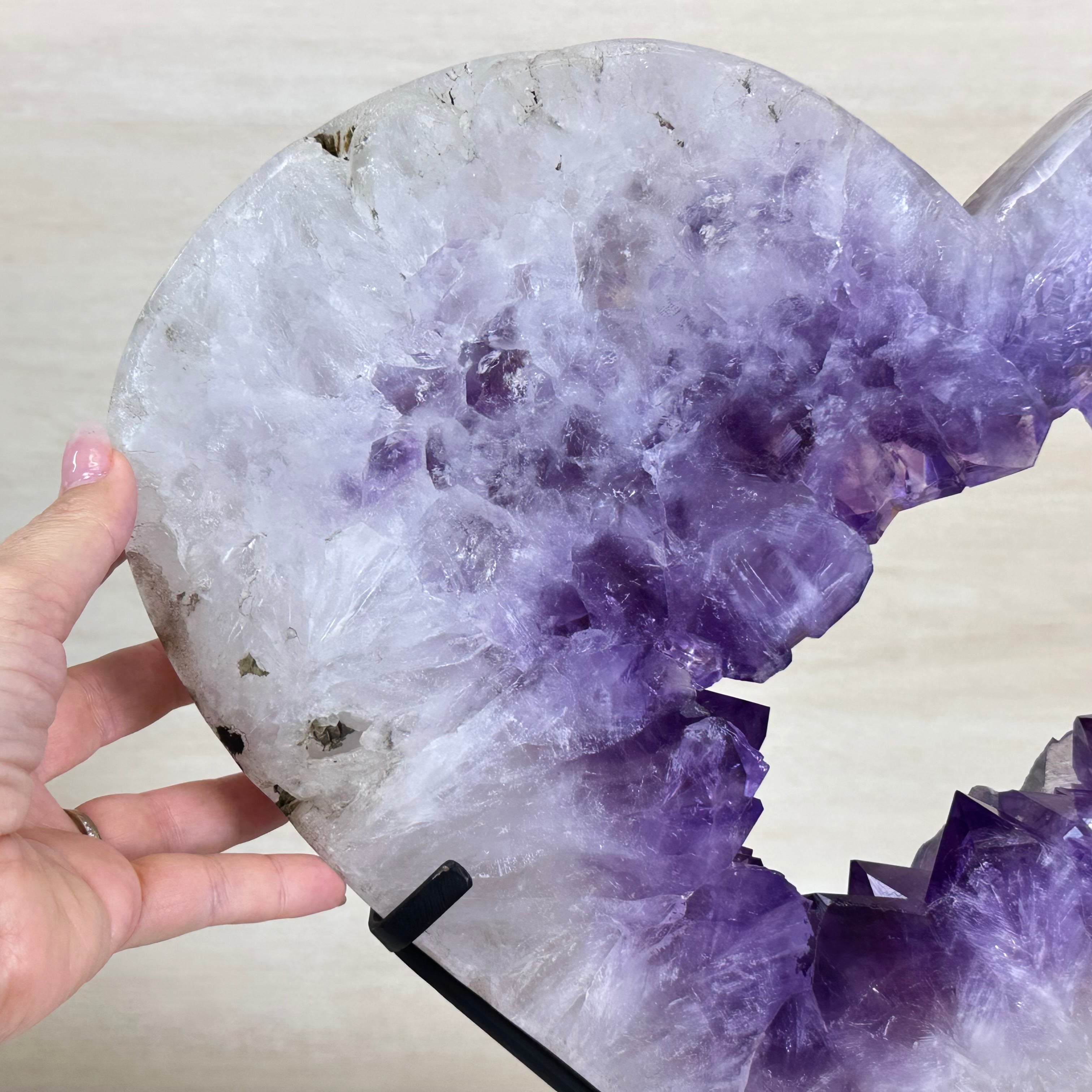 Quality Heart-Shaped Amethyst Geodes on a metal or acrylic stands. Beautiful gemstones with polished edges and natural rough stone on its backside.