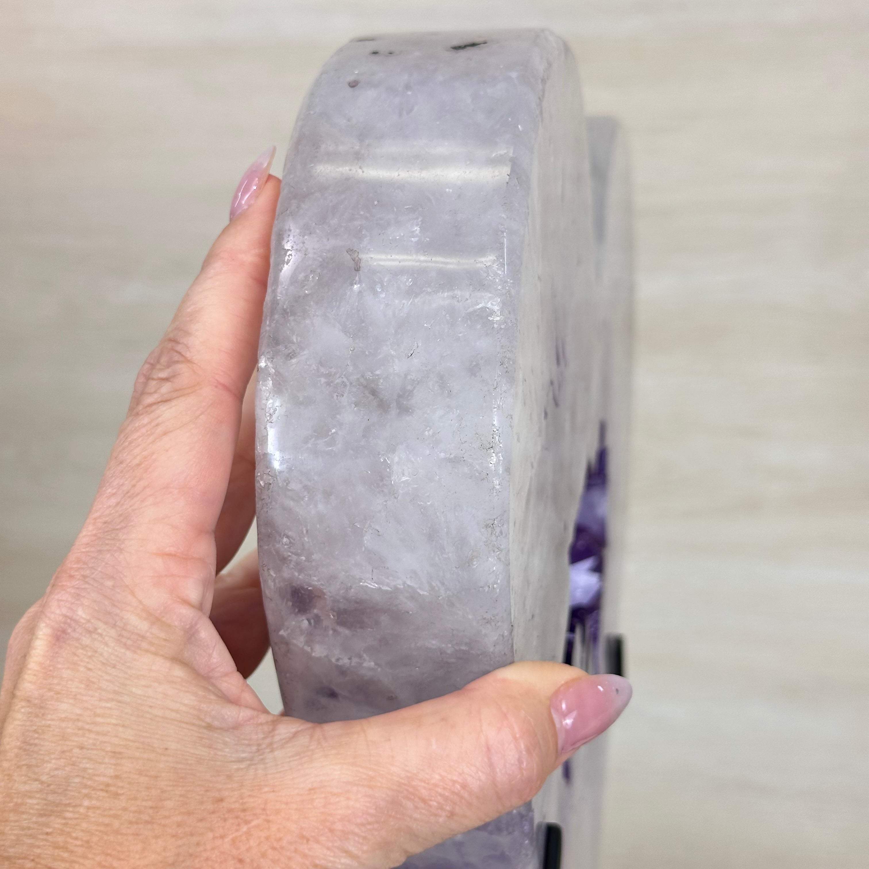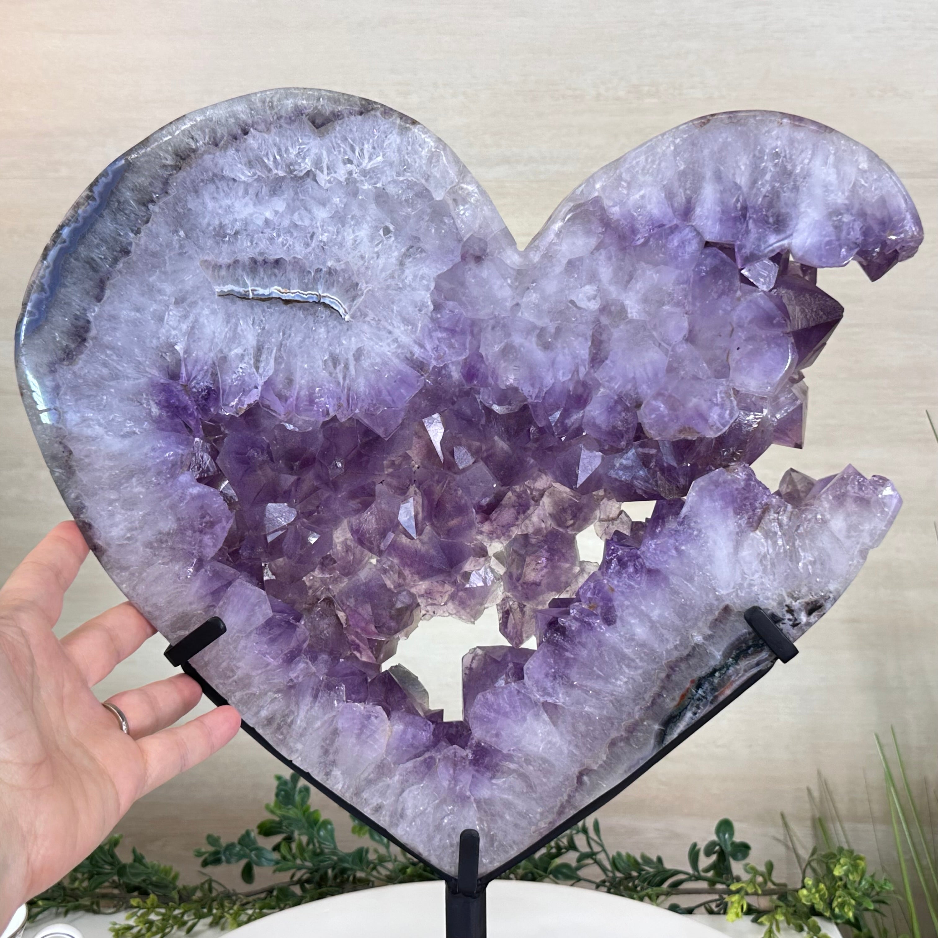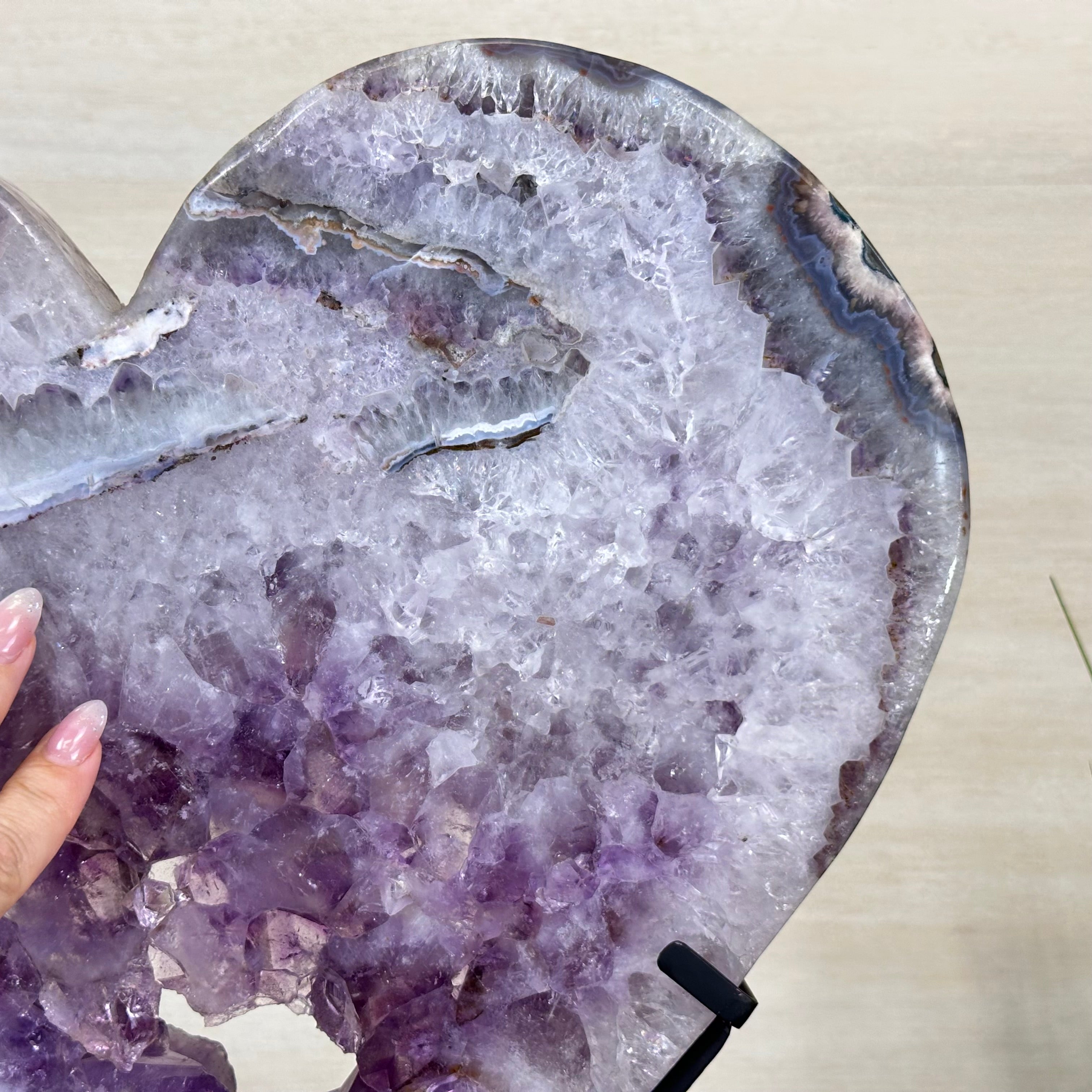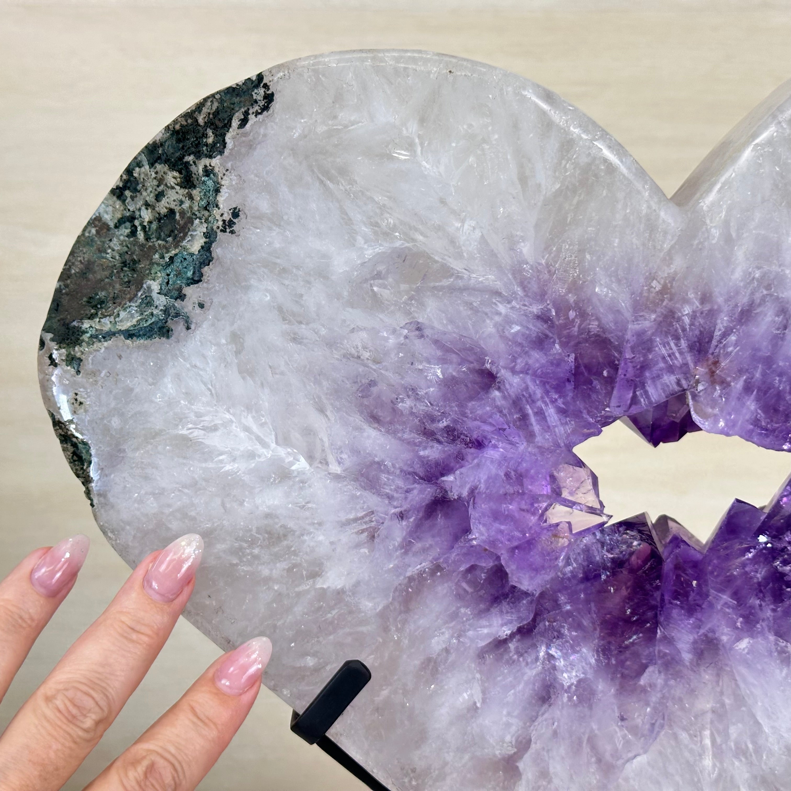 Quality Heart-Shaped Amethyst Geodes on a metal or acrylic stands. Beautiful gemstones with polished edges and natural rough stone on its backside.