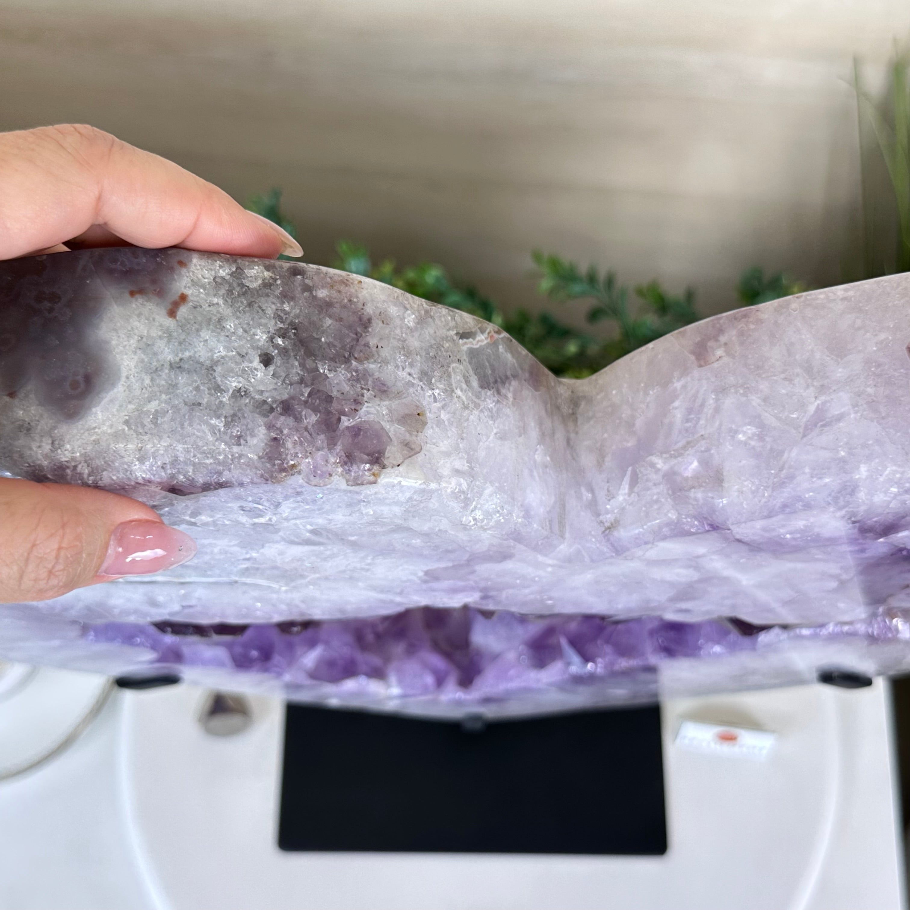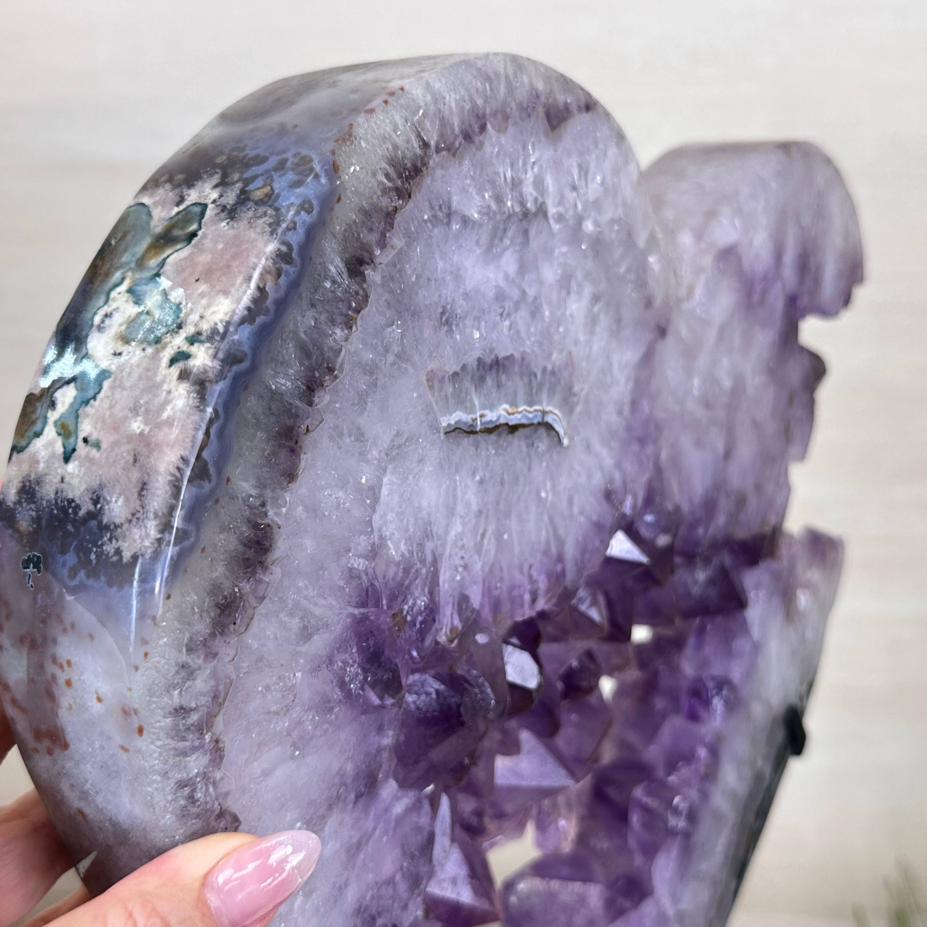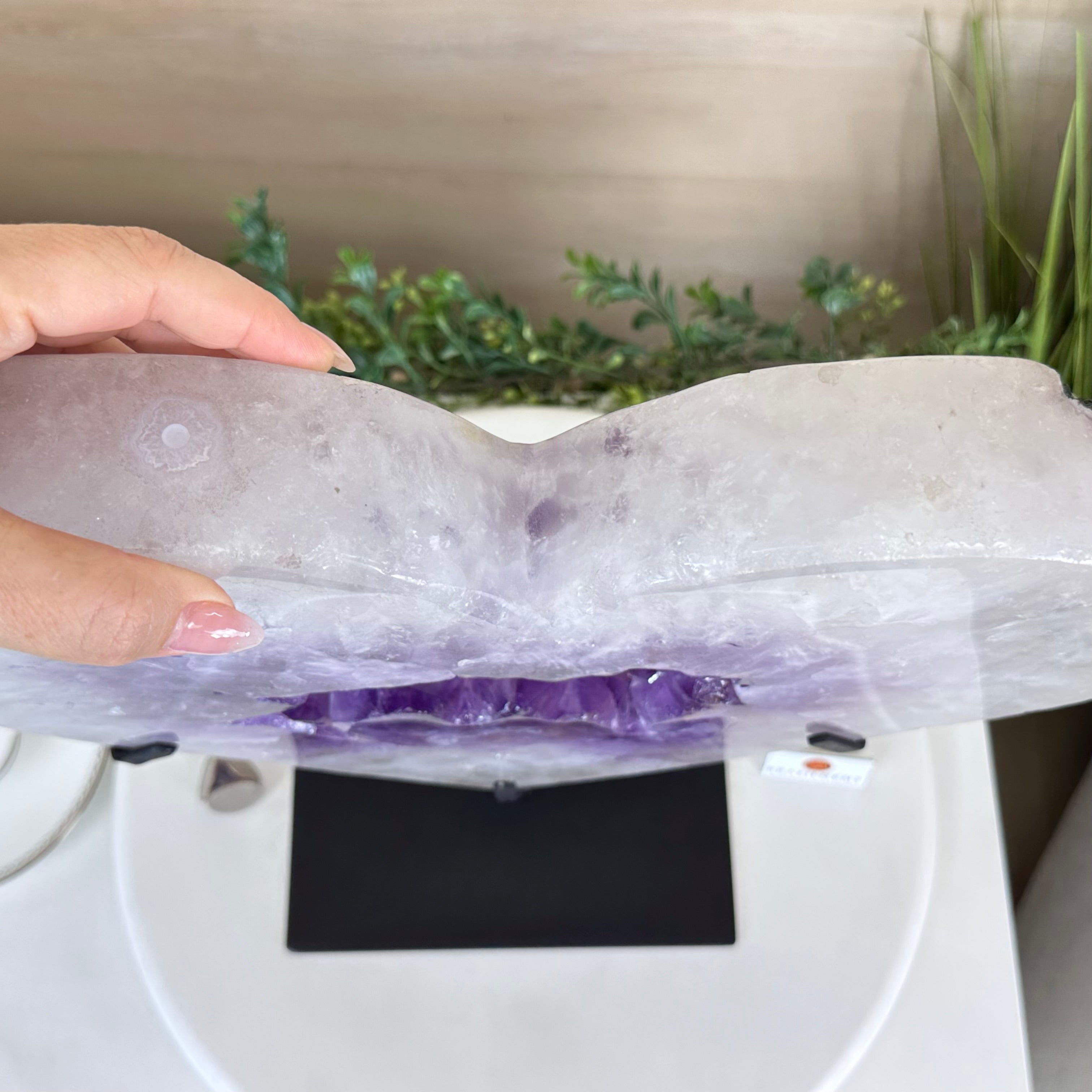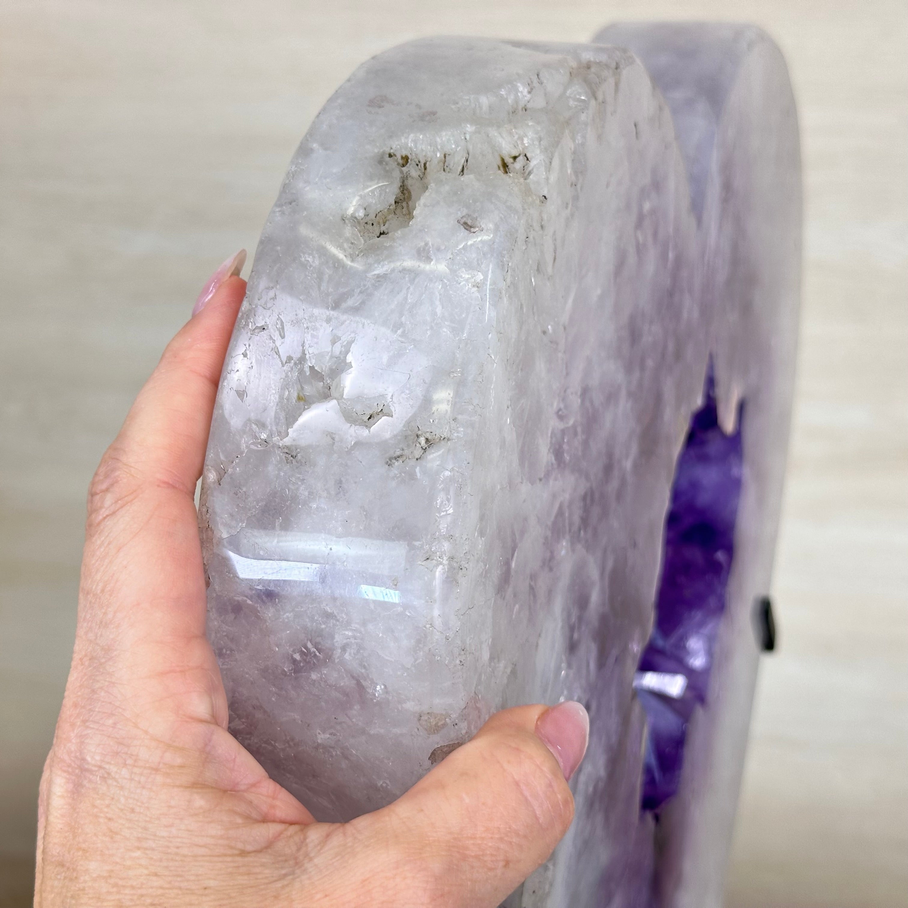 Quality Heart-Shaped Amethyst Geodes on a metal or acrylic stands. Beautiful gemstones with polished edges and natural rough stone on its backside.