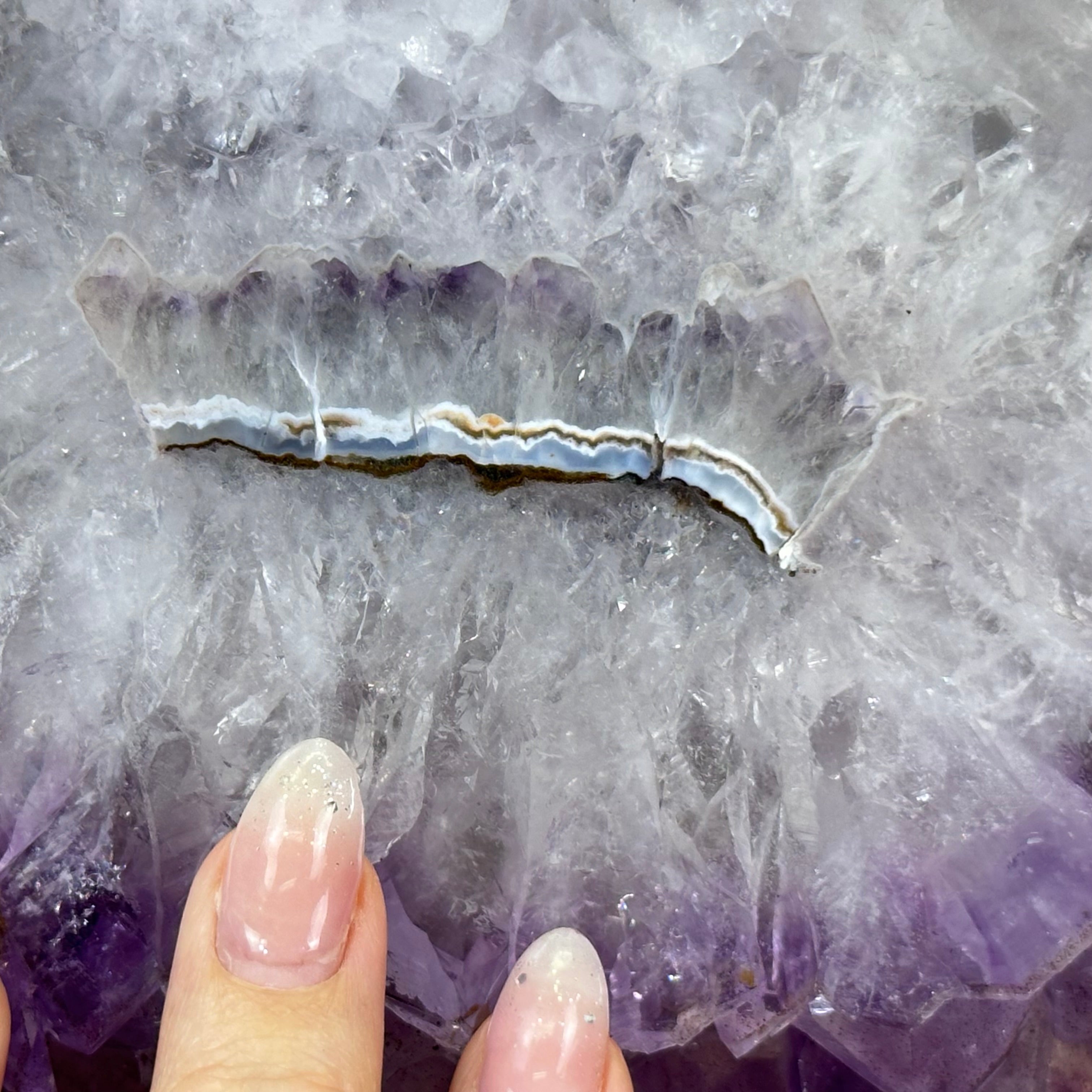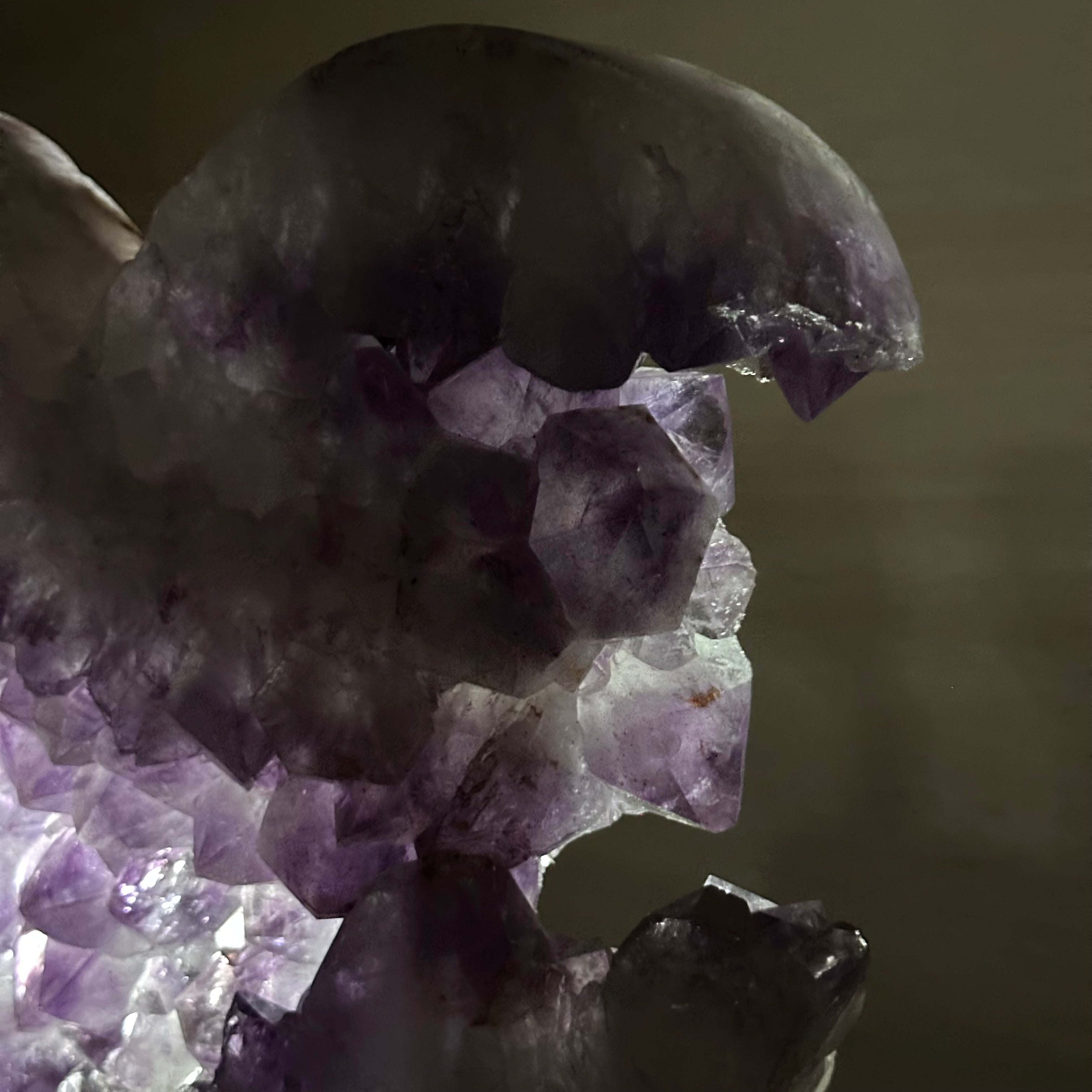 The formation of amethyst is a story of icy beauty crystallizing from a legacy of fire. Basaltic lava can cool with porous cavities that range in size up to 15 feet long. Silica-rich waters run through these cavities. Traces of silica leave the seeds of crystalline growth. The purple color of amethyst is traced to iron in the water. Placement of amethyst in your environment is an invitation to let healing energy and the timelessness of the Earth take your journey to a higher plane. Protect your stones from direct sunlight to preserve their vibrancy.