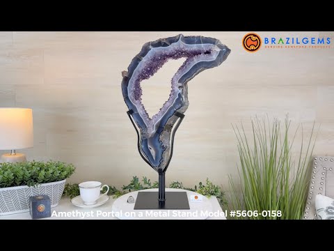 Unveil the charm of this natural Extra Quality Brazilian Amethyst Crystal "Portal" on a black metal fixed stand. Smoothly polished on both sides, this piece has a natural and rough outer shell. The large Agate bands make along the edges make this piece special!