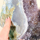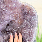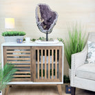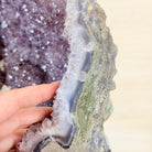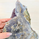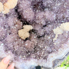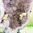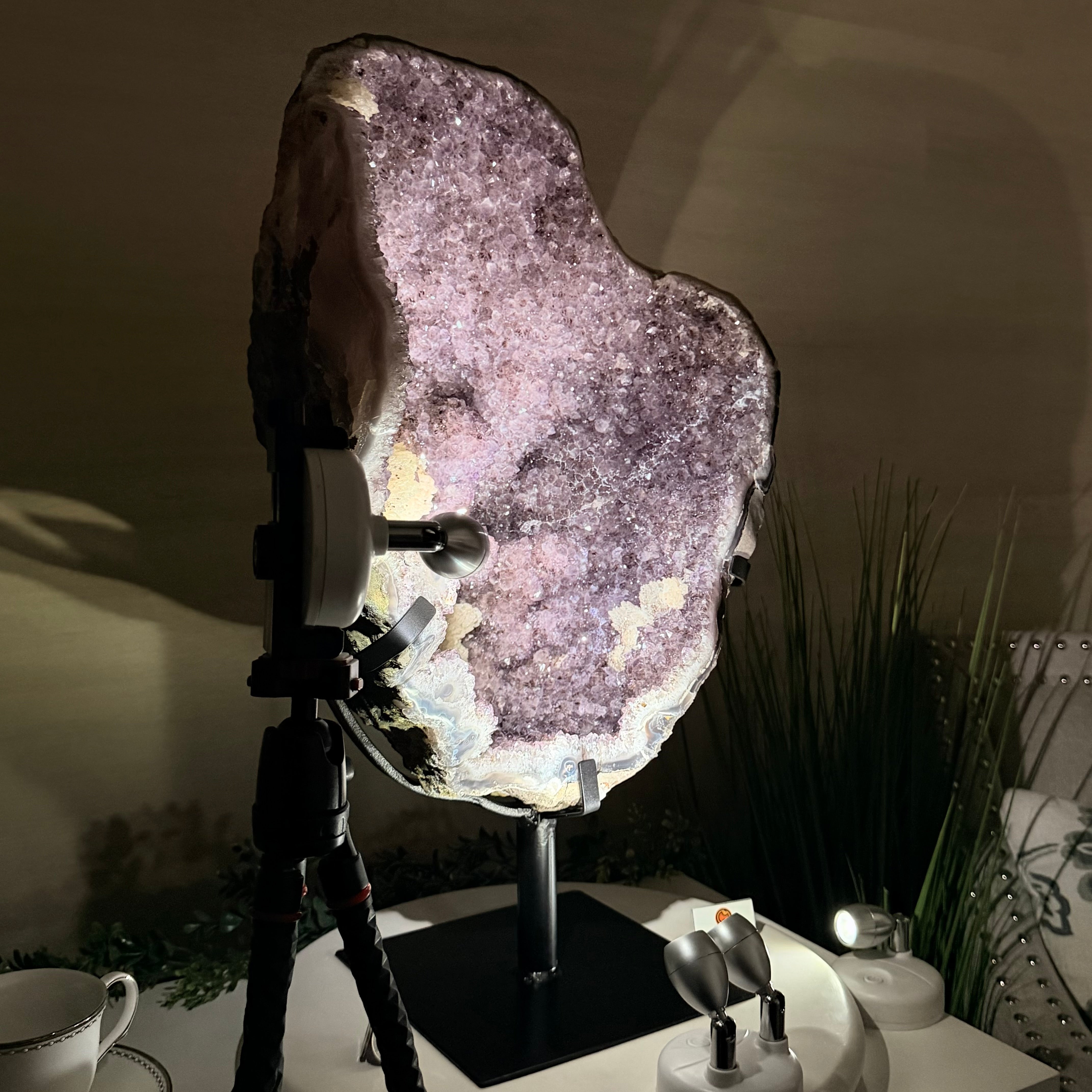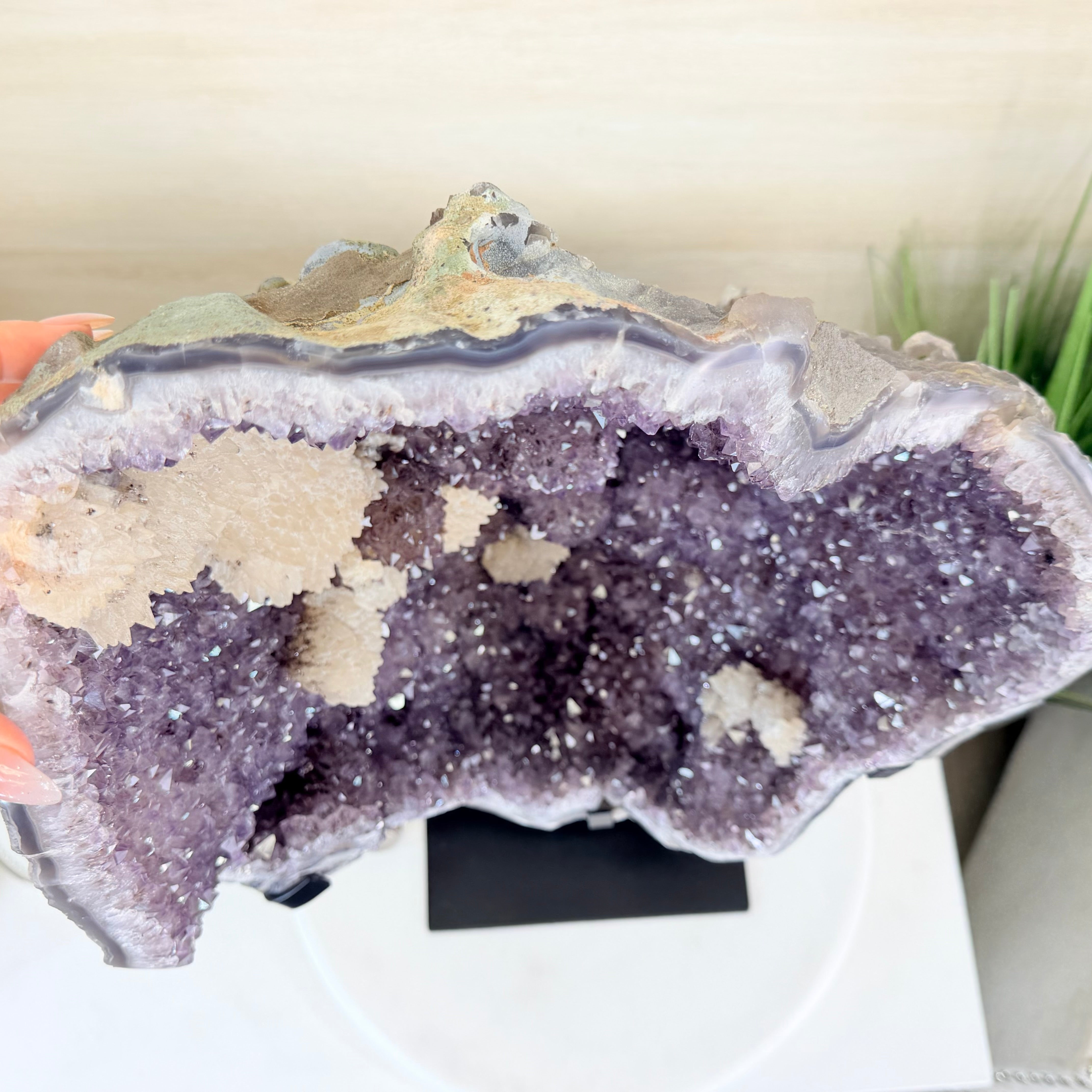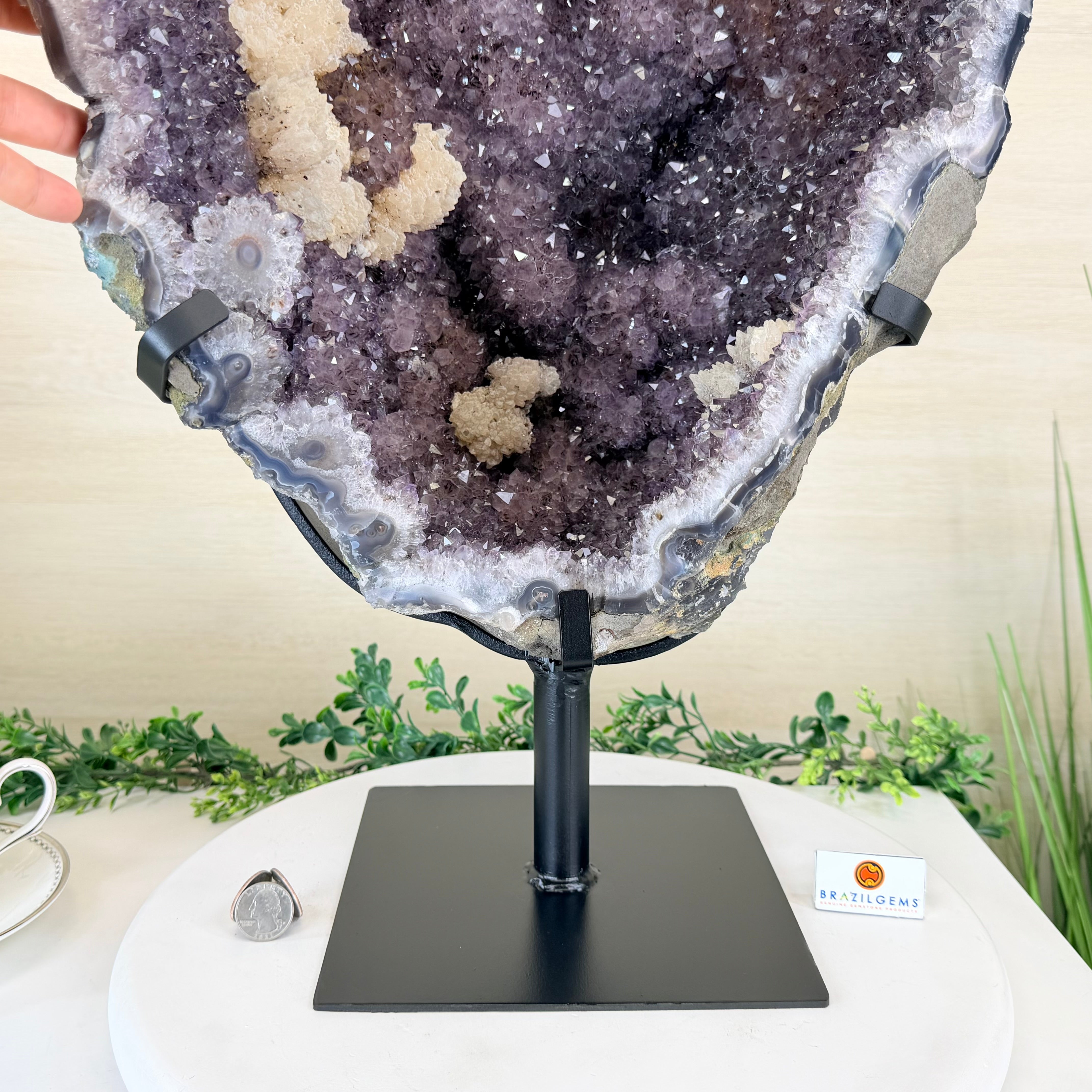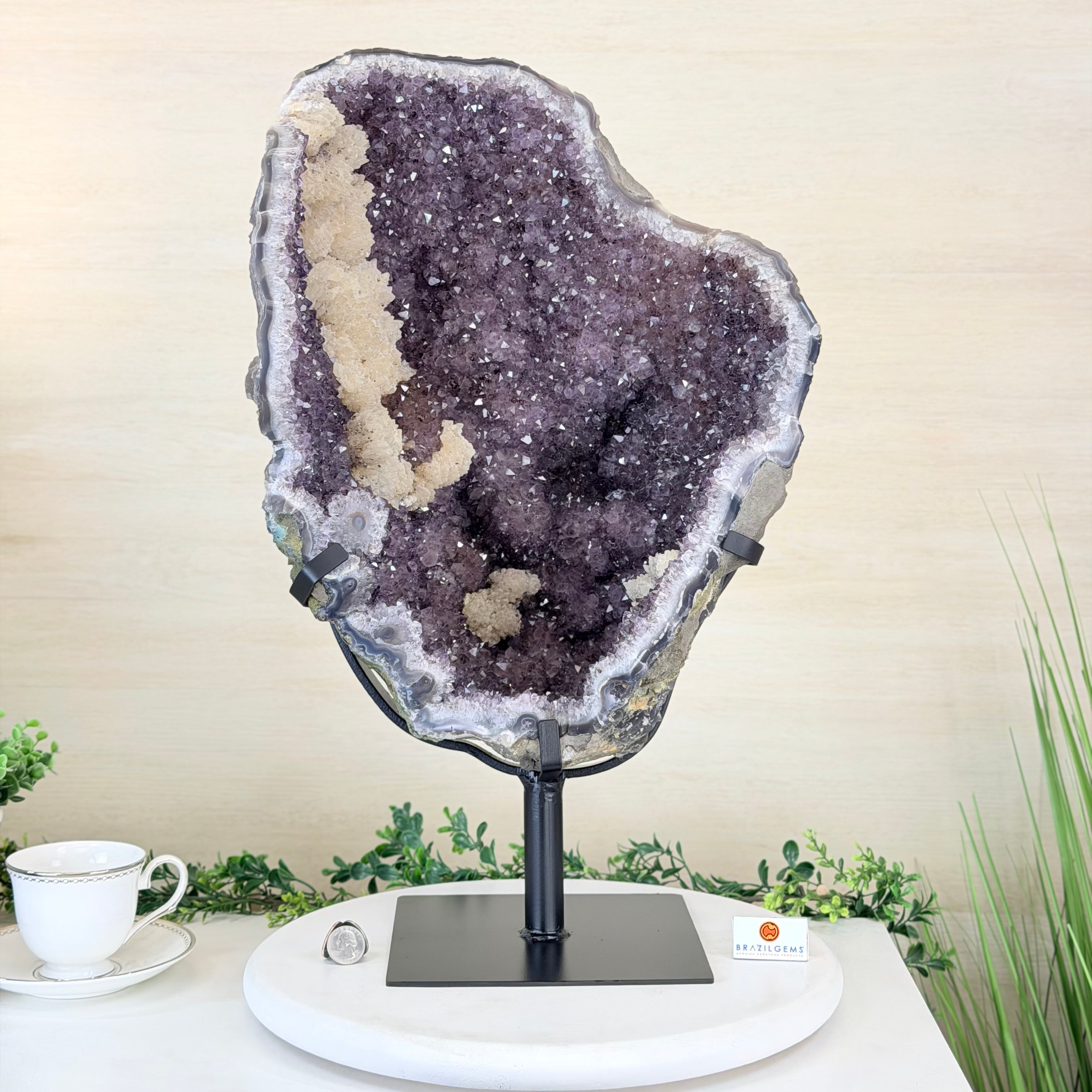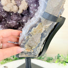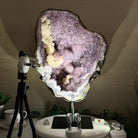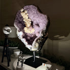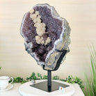 Infuse your room with the natural elegance of this Extra Quality Natural Brazilian Amethyst Cluster on a black metal stand from Brazil Gems®. This gemstone has purple amethyst points with large calcite formations adding character to the piece. It is polished in the front with a natural rough outer shell.