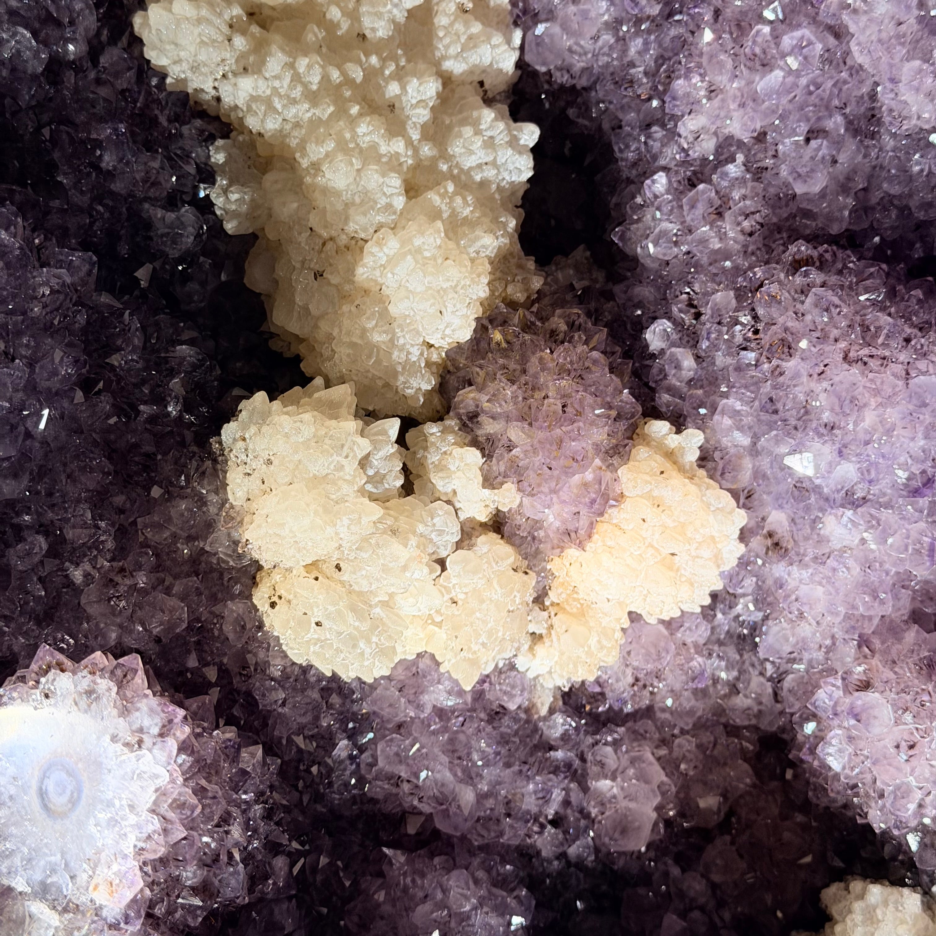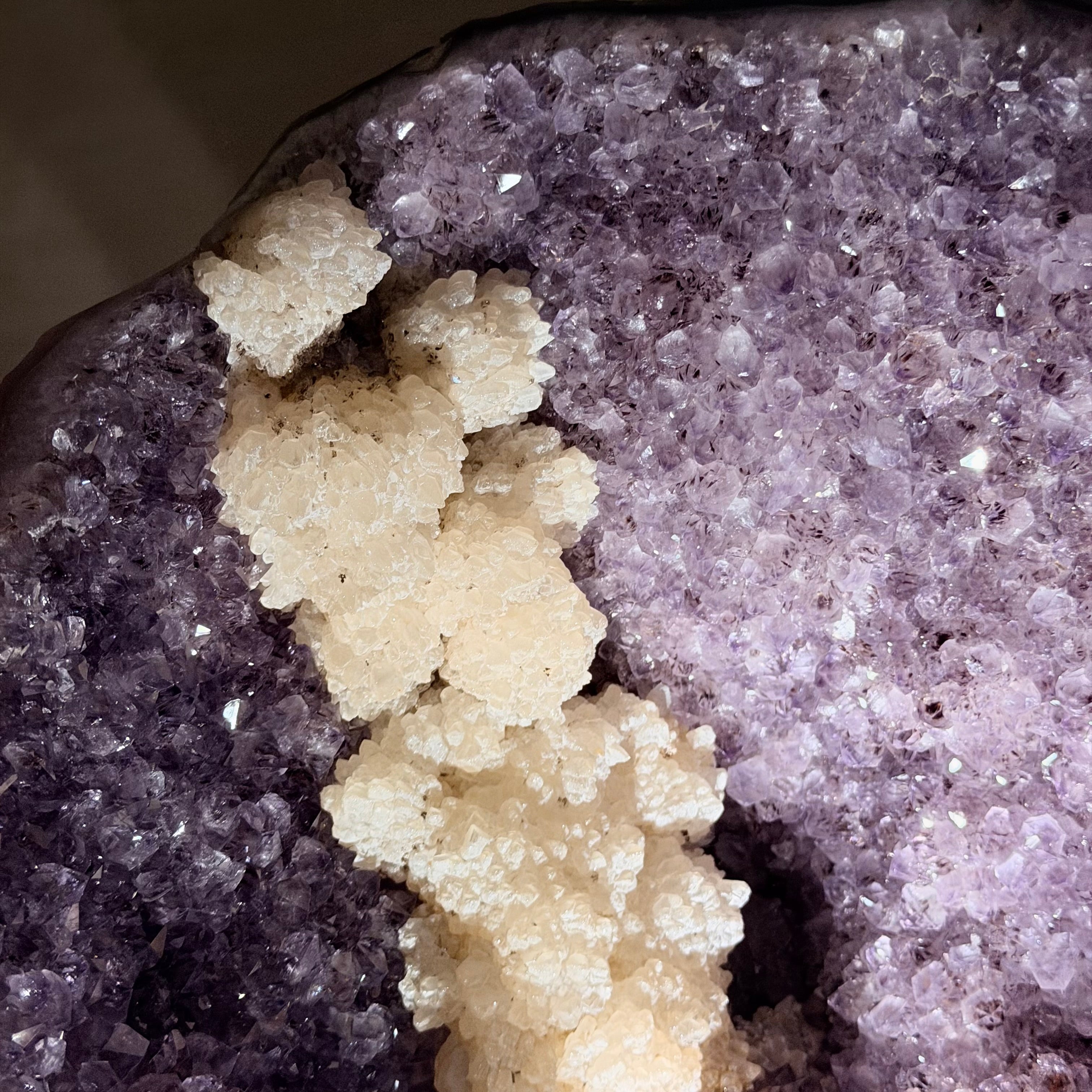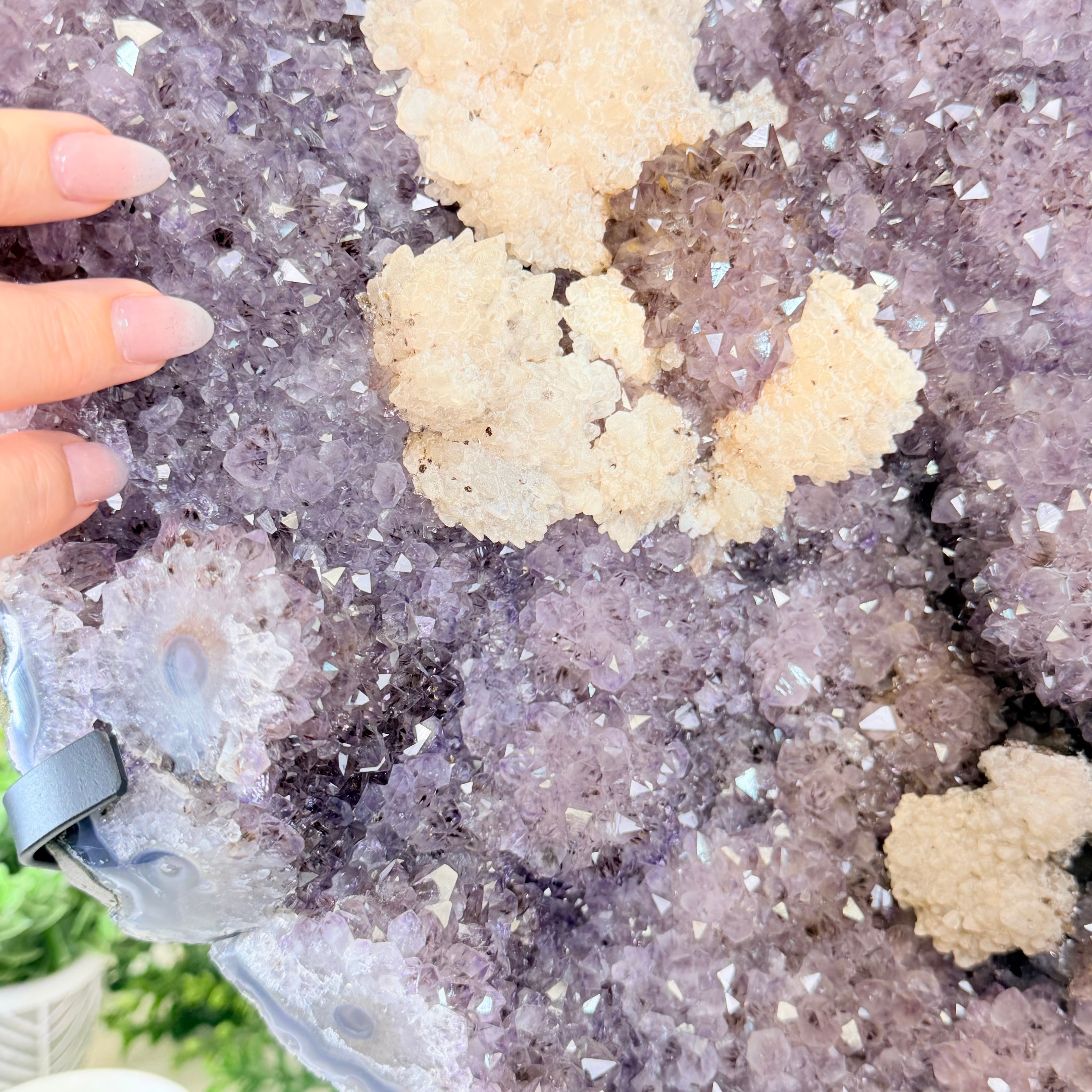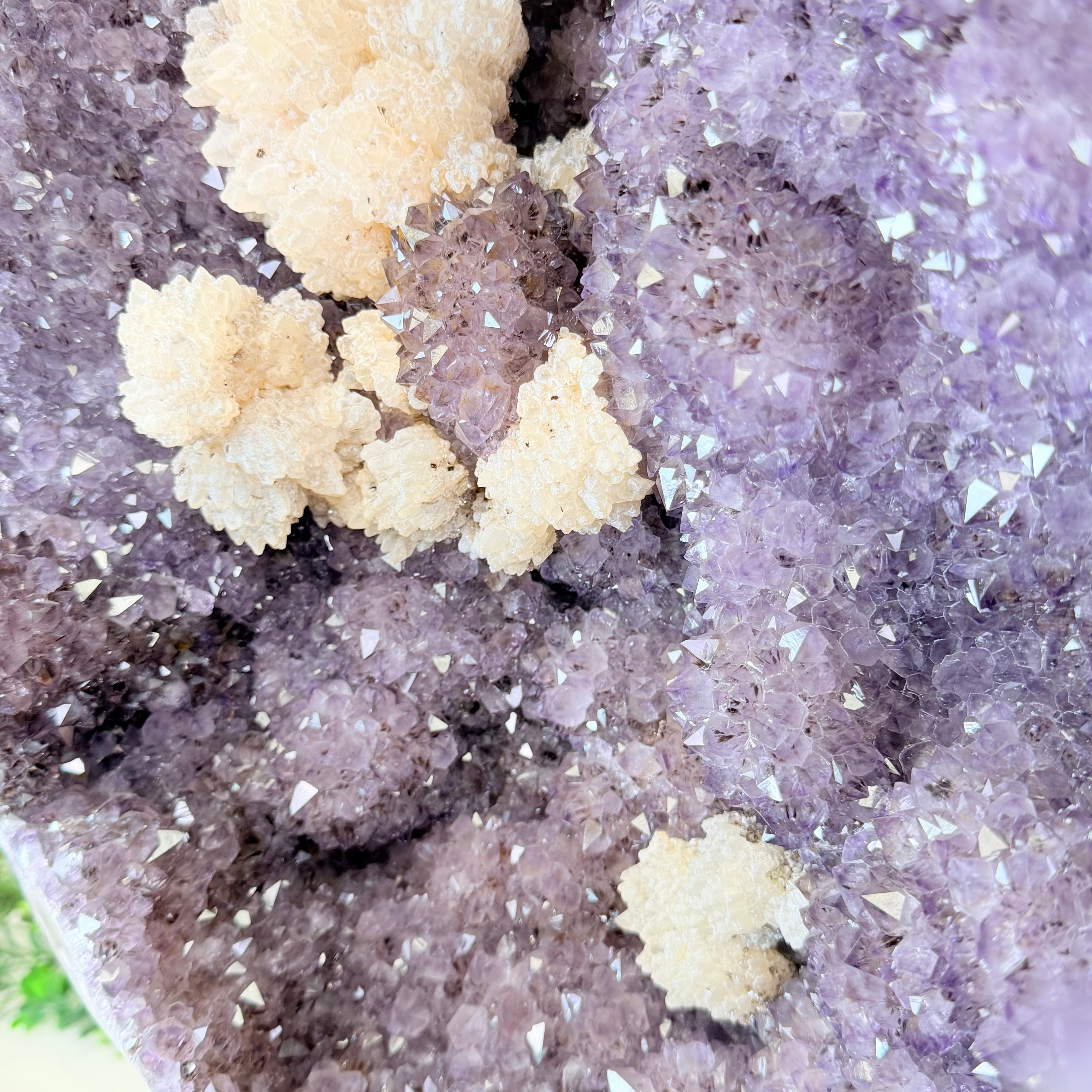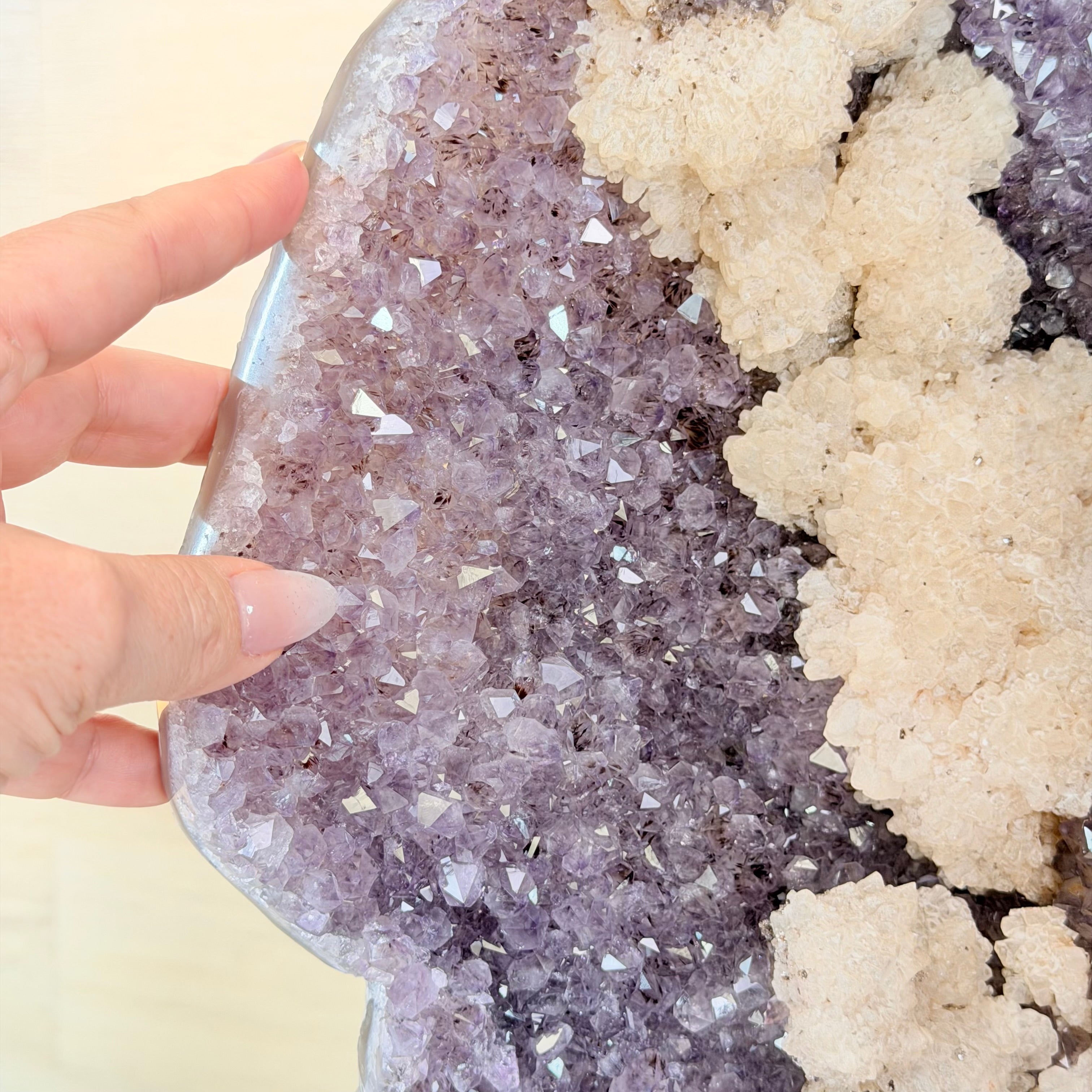 Infuse your room with the natural elegance of this Extra Quality Natural Brazilian Amethyst Cluster on a black metal stand from Brazil Gems®. This gemstone has purple amethyst points with large calcite formations adding character to the piece. It is polished in the front with a natural rough outer shell.