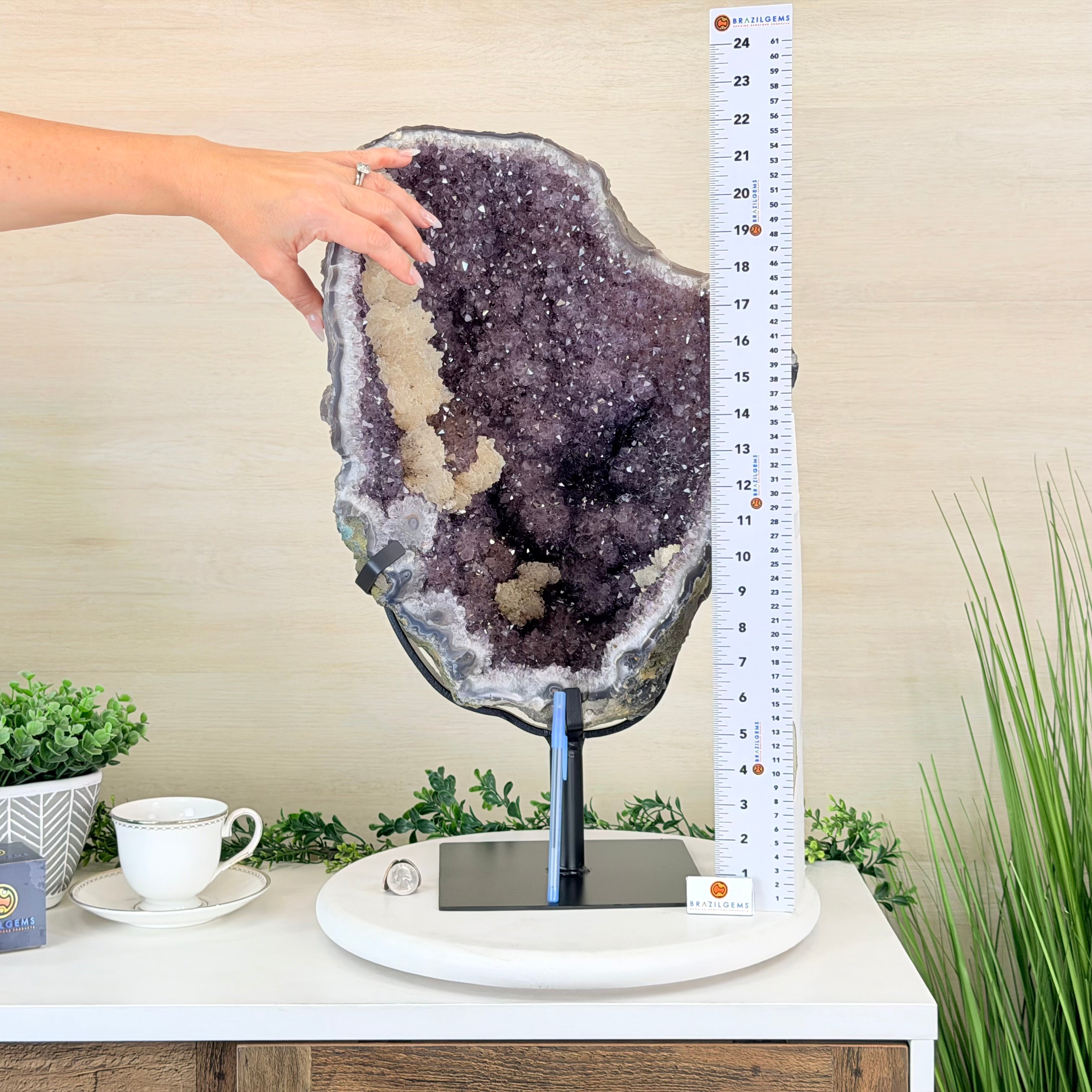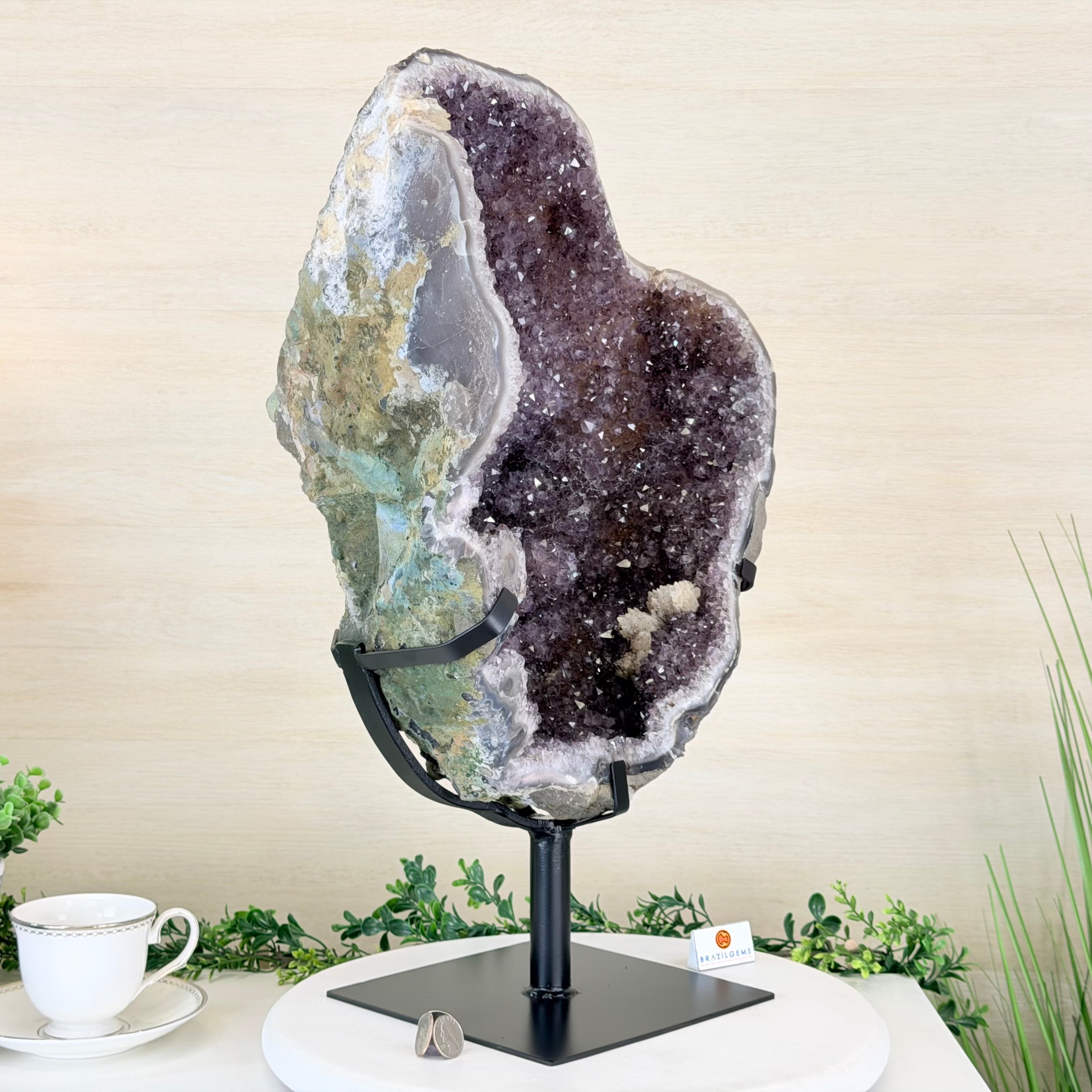 Disclaimer: This is a natural gemstone crystal sold by Brazil Gems® as is and as you see it in its images and video. It is the exact piece you will receive. It may contain natural imperfections as well as imperfections, repairs, scratches and/or broken edges from the extraction, polishing, mounting and prepping processes. The metal stand has been hand welded to fit this exact piece and then painted black. The crystal piece can be removed from its metal stand. At Brazil Gems®, we make every effort to get measurements as exact as possible but they are done by human hands and eyes and therefore may have minor discrepancies.