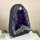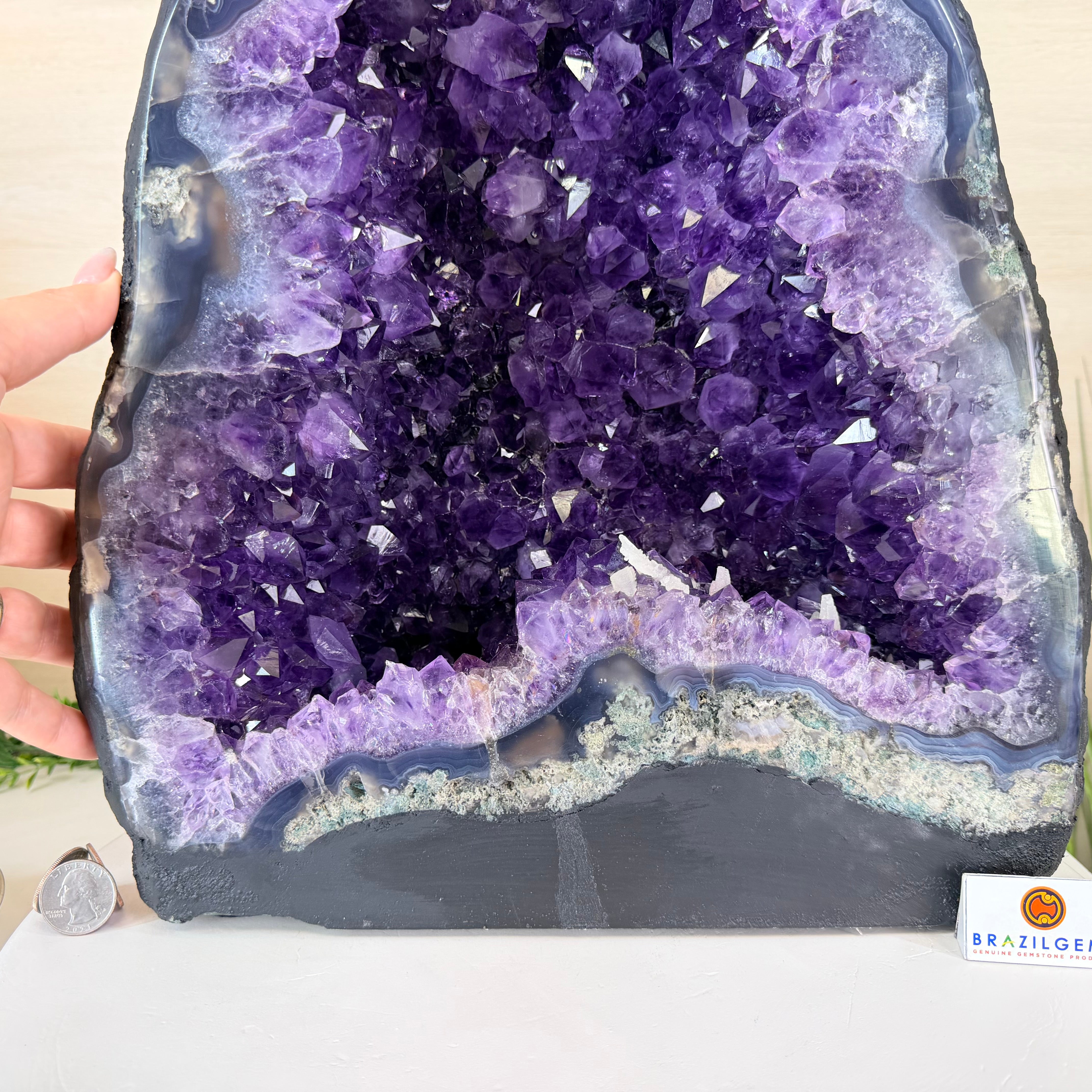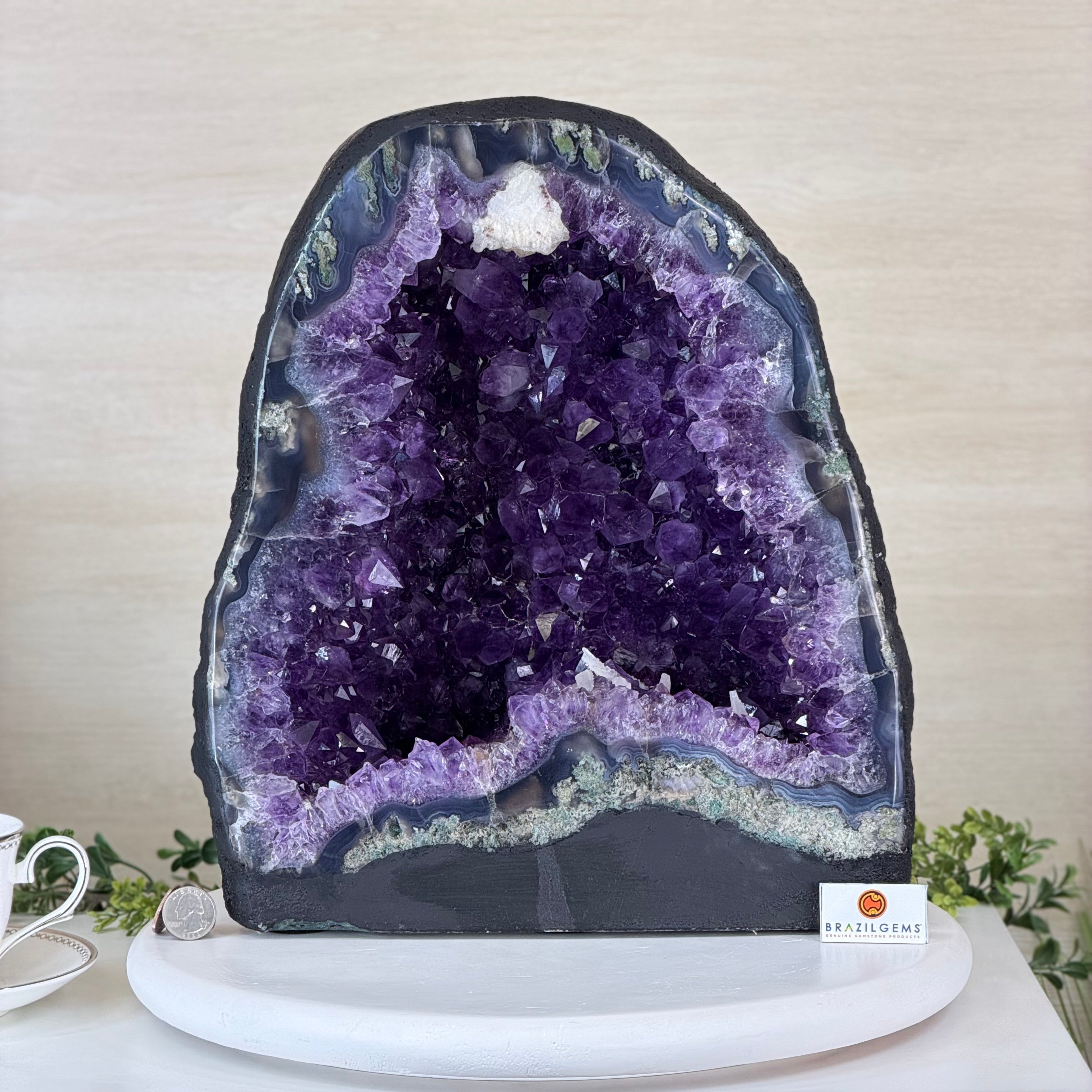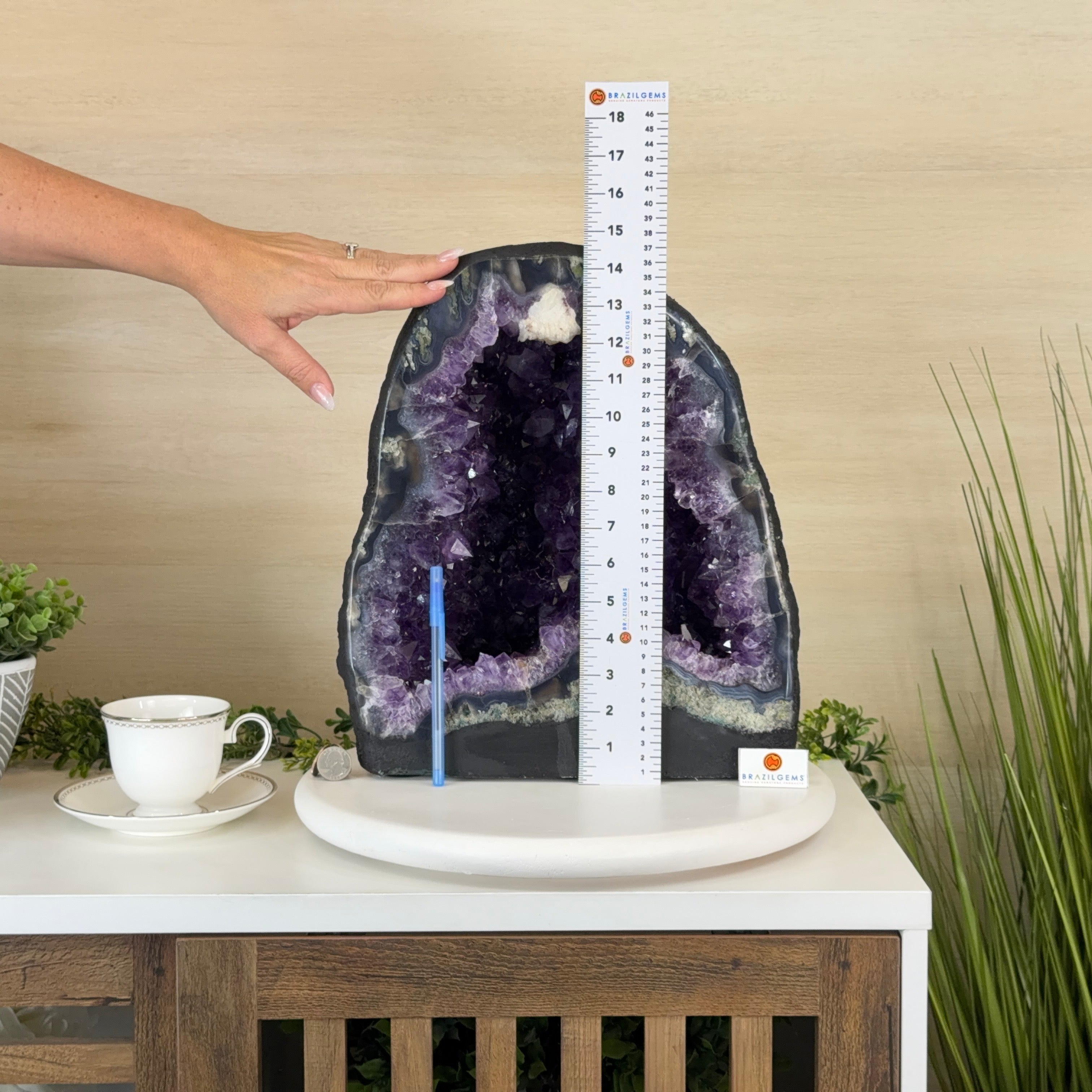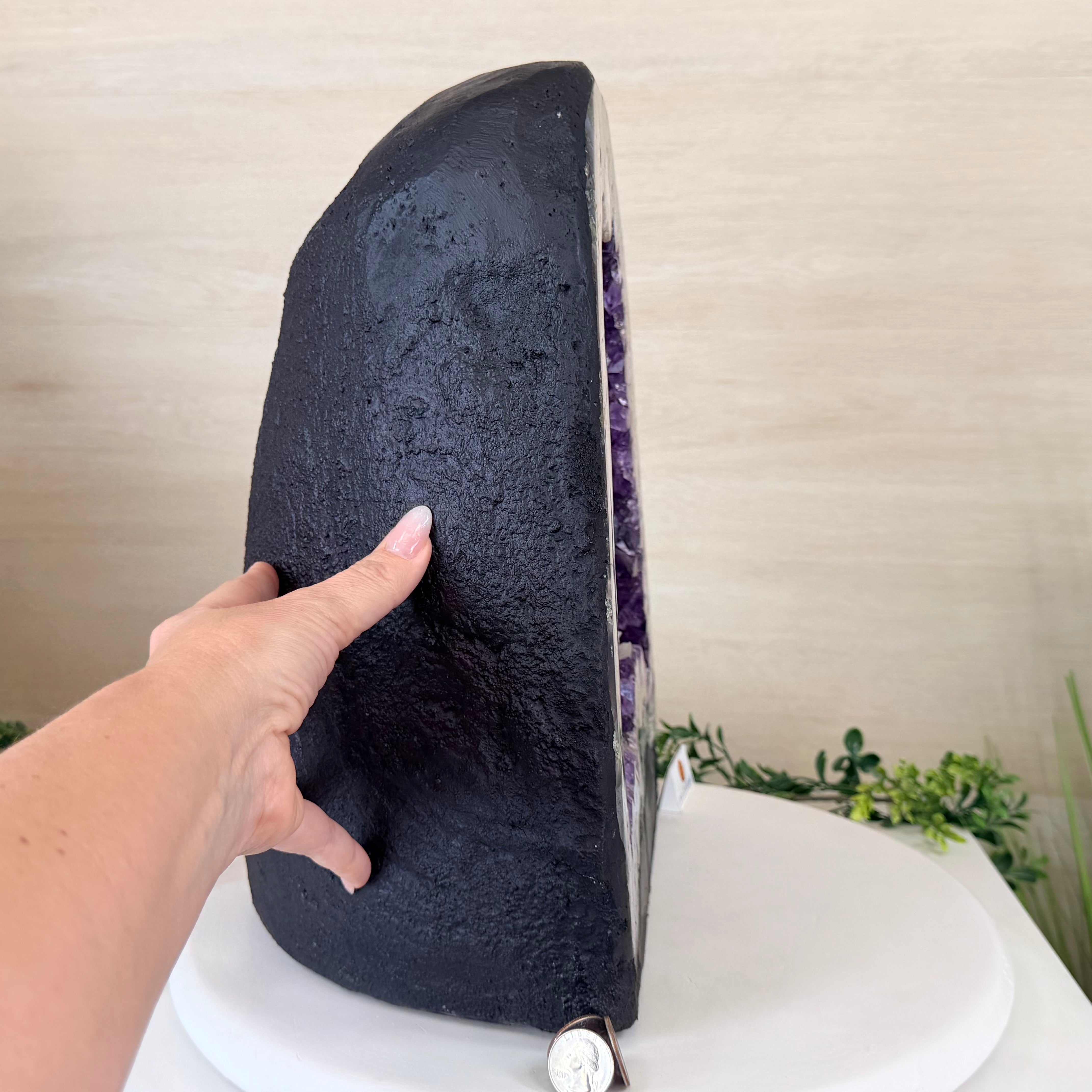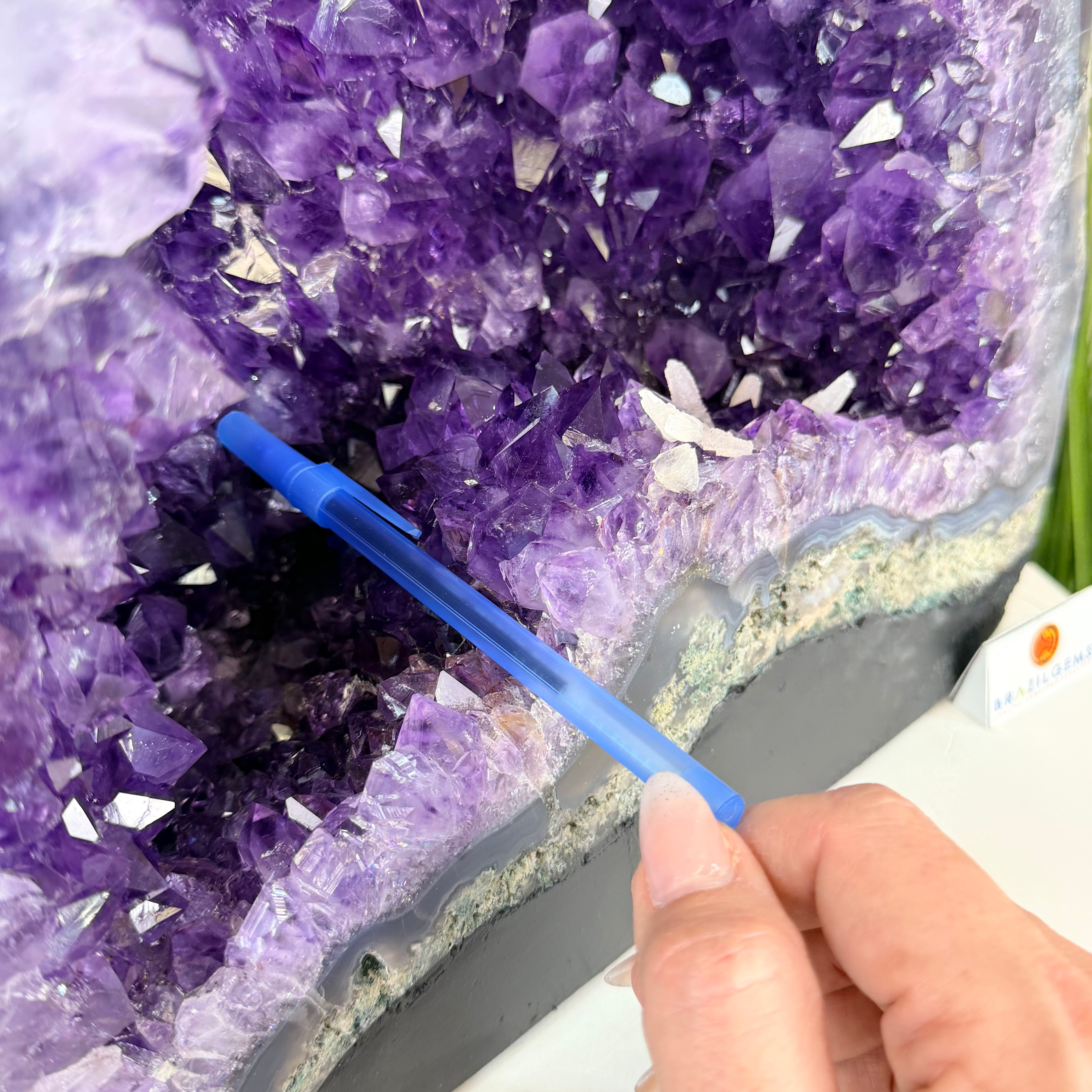 Disclaimer: This is a natural gemstone crystal sold by Brazil Gems® as is and as you see it in its images and video. It is the exact one you will receive. It may contain natural imperfections as well as imperfections, broken edges and repairs from the extraction, polishing and prepping processes. In order for it to stand on its own, the back and bottom have been reinforced with a small amount of cement then painted black. At Brazil Gems® we make every effort to get measurements as exact as possible but they are done by human hands and eyes and therefore may have minor discrepancies.