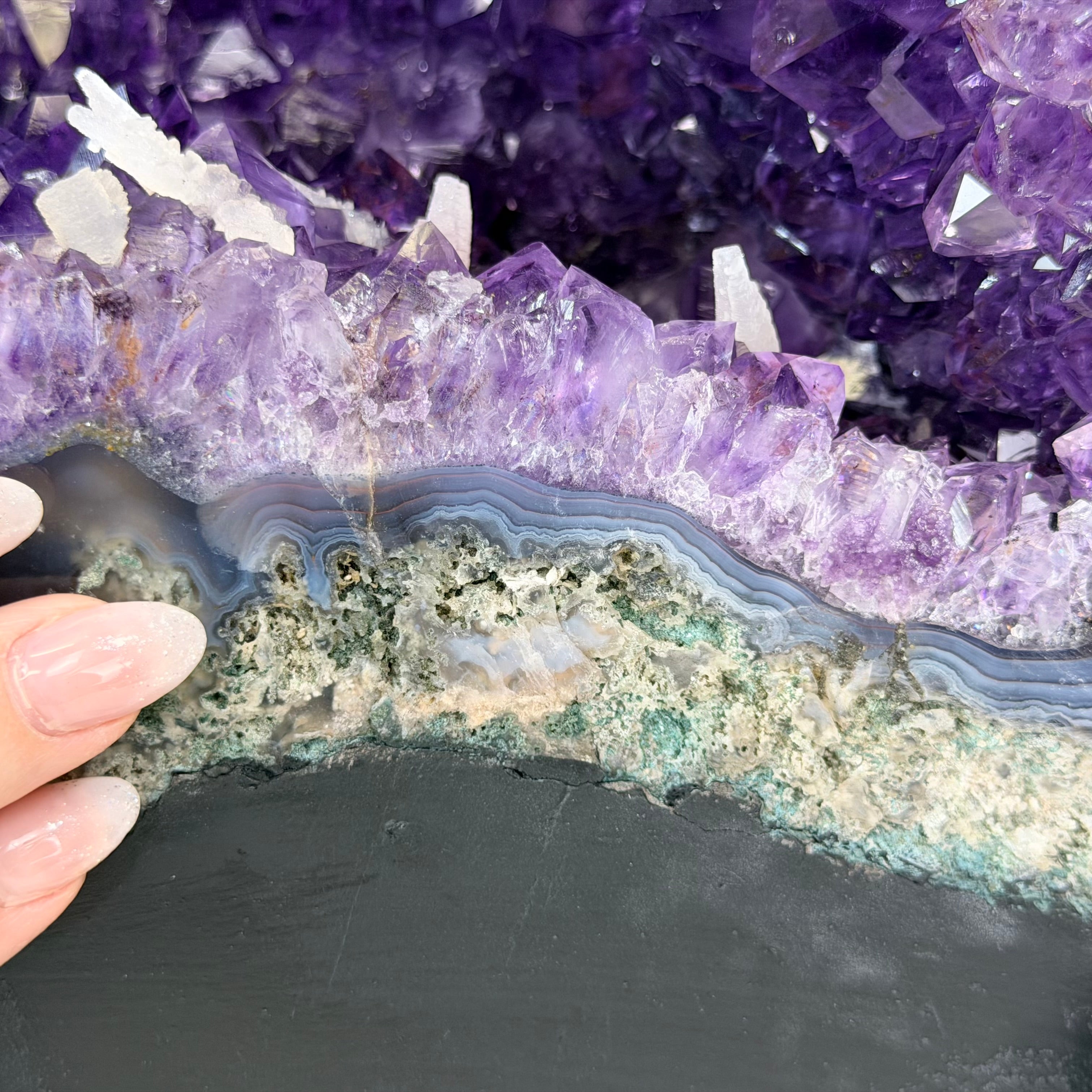 Agate bands with Moss Agate along the edges and several calcite formations add character to this specimen.