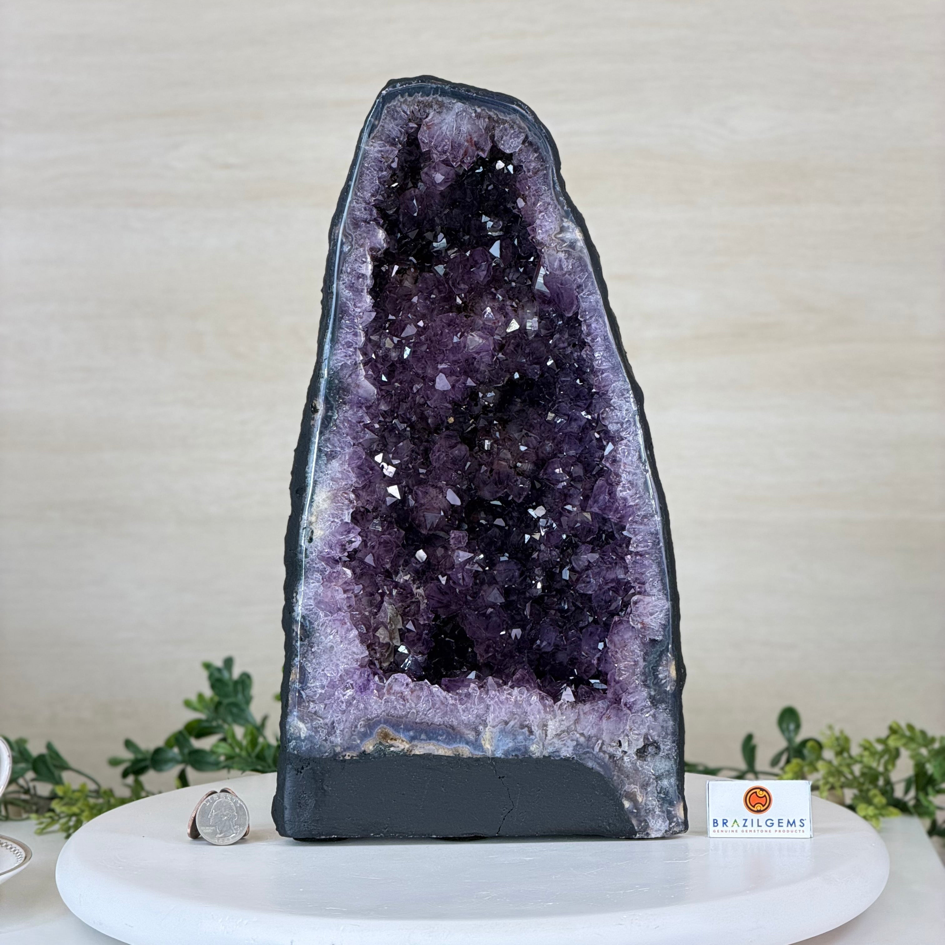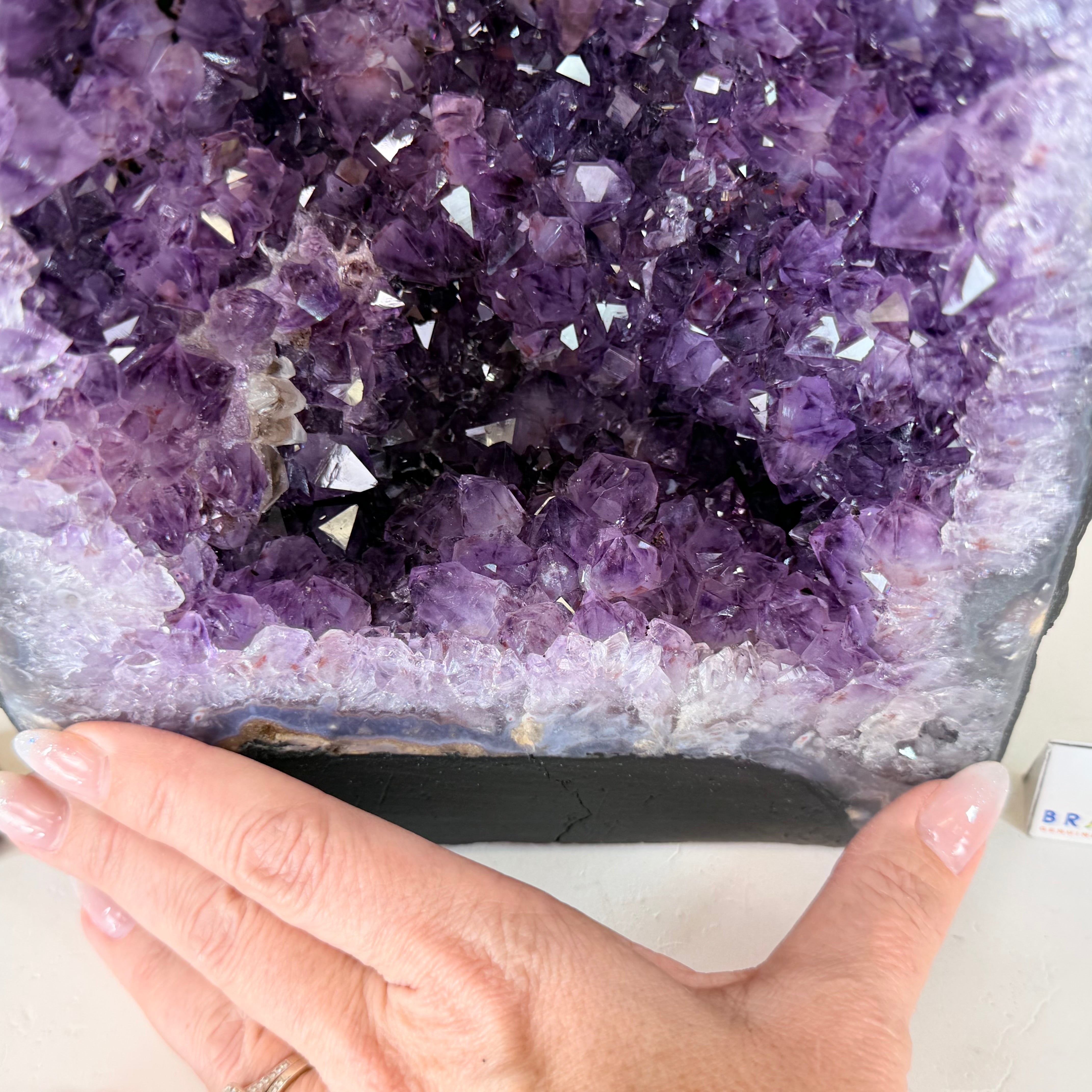 Disclaimer: This is a natural gemstone crystal sold by Brazil Gems® as is and as you see it in its images and video. It is the exact one you will receive. It may contain natural imperfections as well as imperfections, broken edges and repairs from the extraction, polishing and prepping processes. In order for it to stand on its own, the back and bottom have been reinforced with a small amount of cement then painted black. At Brazil Gems® we make every effort to get measurements as exact as possible but they are done by human hands and eyes and therefore may have minor discrepancies.