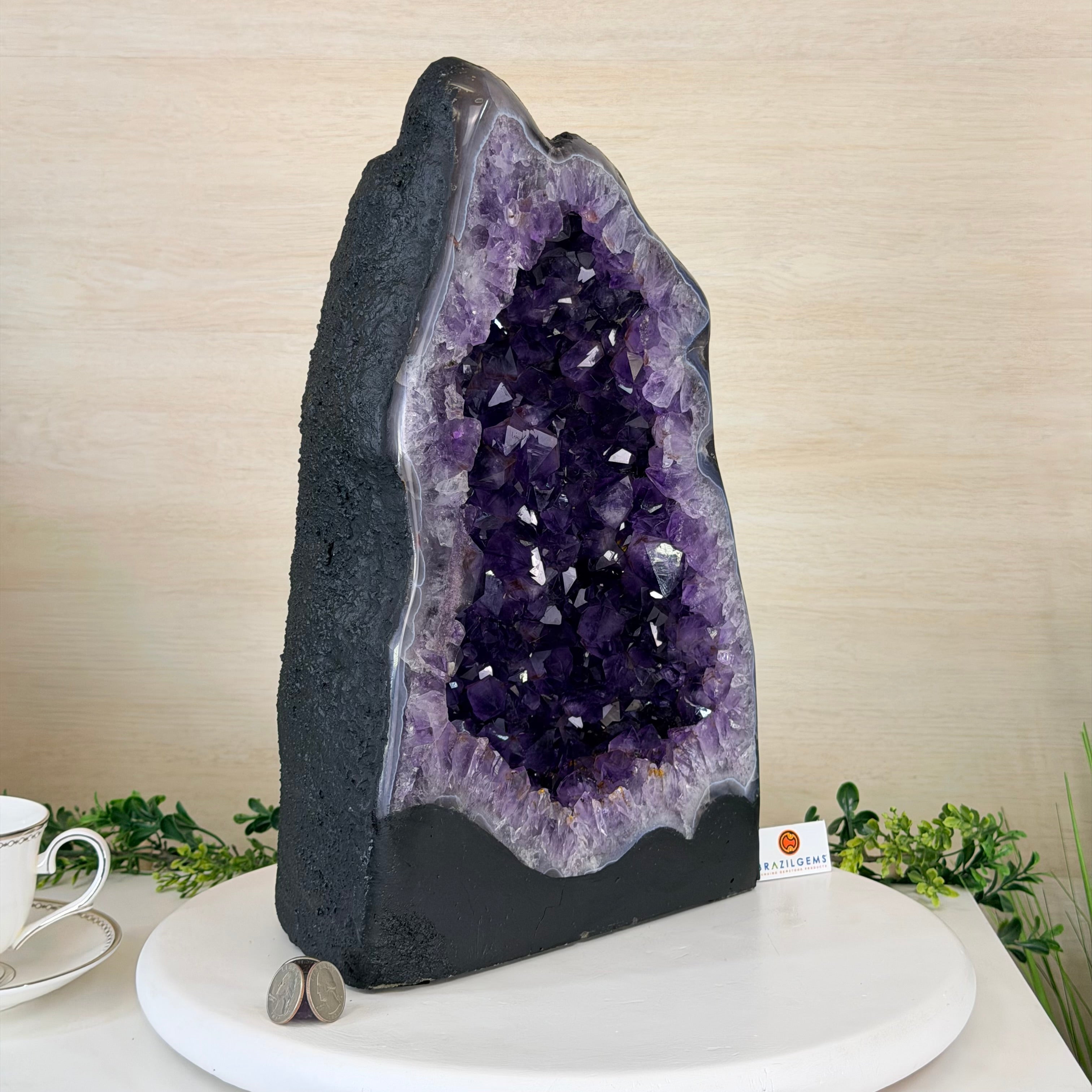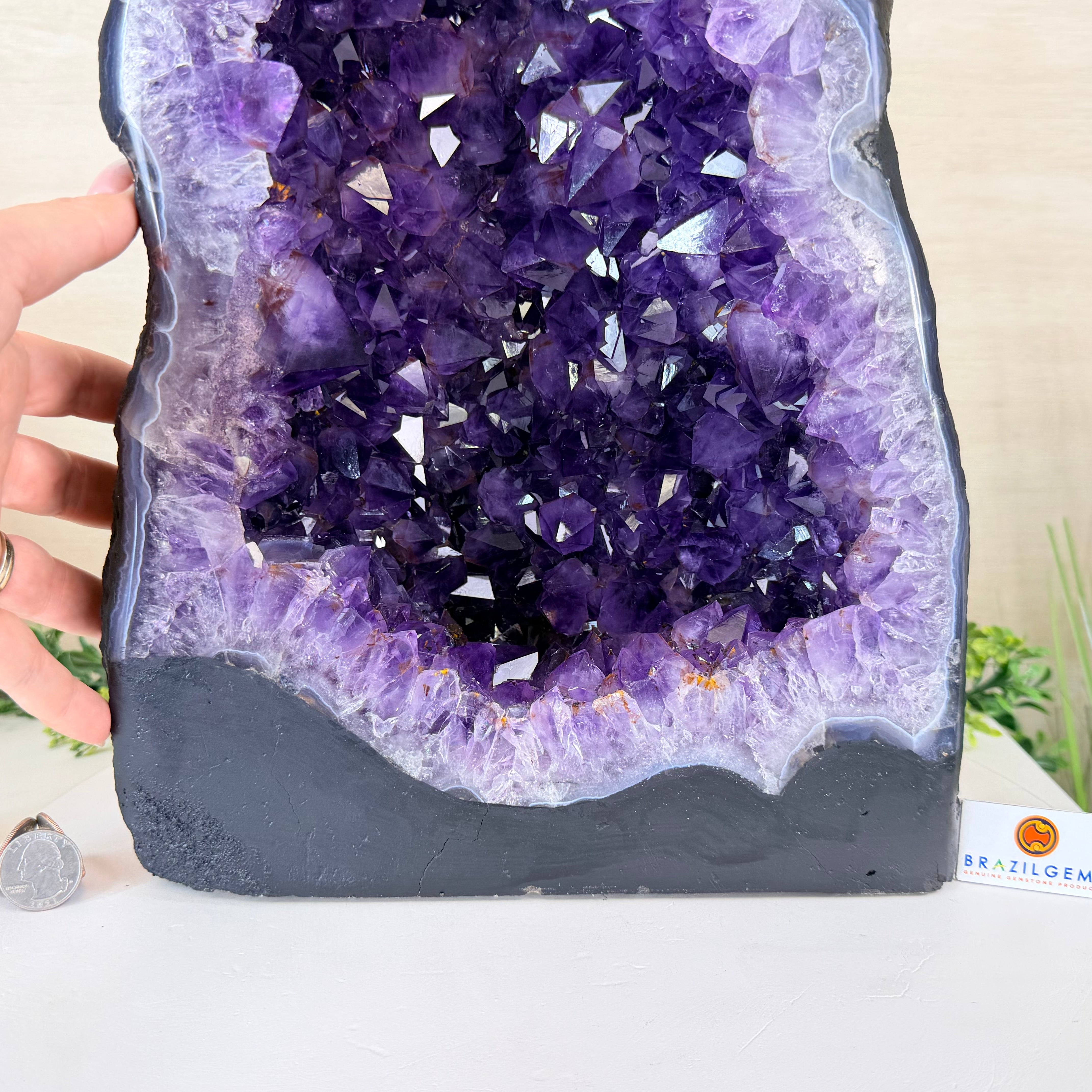 Disclaimer: This is a natural gemstone crystal sold by Brazil Gems® as is and as you see it in its images and video. It is the exact one you will receive. It may contain natural imperfections as well as imperfections, broken edges and repairs from the extraction, polishing and prepping processes. In order for it to stand on its own, the back and bottom have been reinforced with a small amount of cement then painted black. At Brazil Gems® we make every effort to get measurements as exact as possible but they are done by human hands and eyes and therefore may have minor discrepancies.