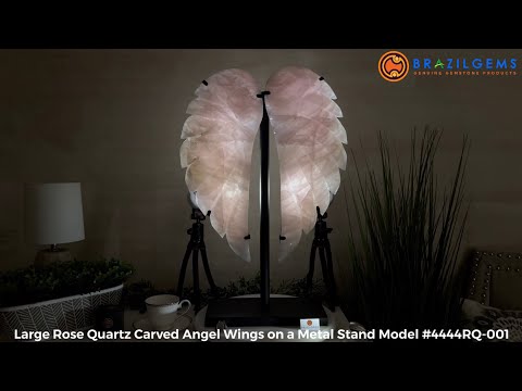 Experience the stunning harmony of natural beauty and refined craftsmanship with this Super Quality Brazilian Rose Quartz Carved Angel Wings, gracefully displayed on a sleek black metal stand. Formed over millions of years and expertly sculpted by skilled artisans, this gemstone piece is a true testament to nature’s artistry.