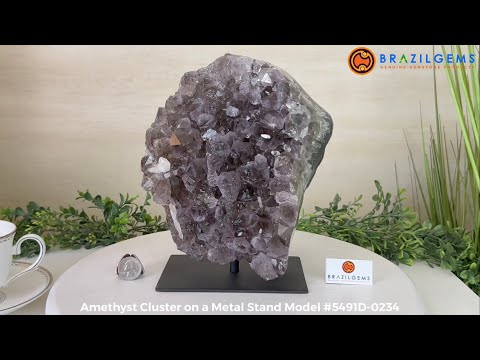 Infuse your room with the natural elegance of this Extra Quality Natural Brazilian Amethyst Cluster on a black metal base from Brazil Gems®. This gemstone has purple amethyst points with polished edges and a natural rough outer shell.