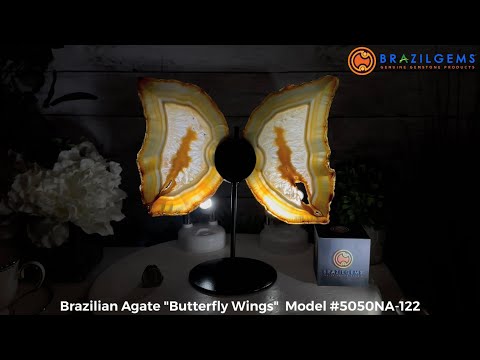 Brazil Gems® brings you this Natural Brazilian Agate Slices beautifully displayed as Butterfly Wings on a black metal stand. These are delicate and elegant pieces that will accent any décor and make for great gifts to a loved one. They are translucent and will look amazing with light behind or placed by a window.